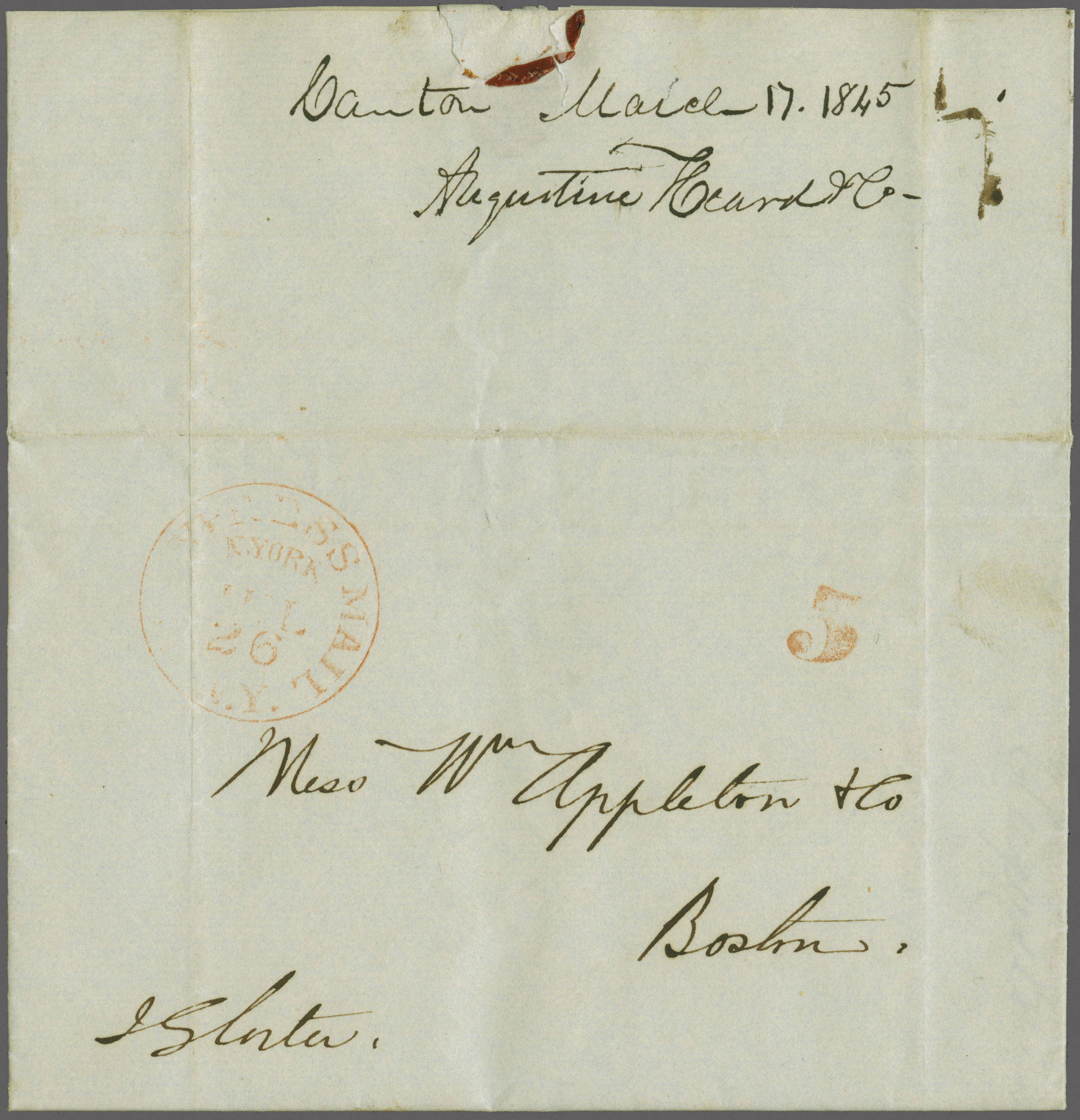 1845 (March 17): Entire letter from Augustine Heard & Co. in Canton endorsed "pr. Gloster", carried outside the Mails and posted on arrival in New York to Boston with rate mark "5" and "EXPRESS MAIL / NEW YORK/ NY" both