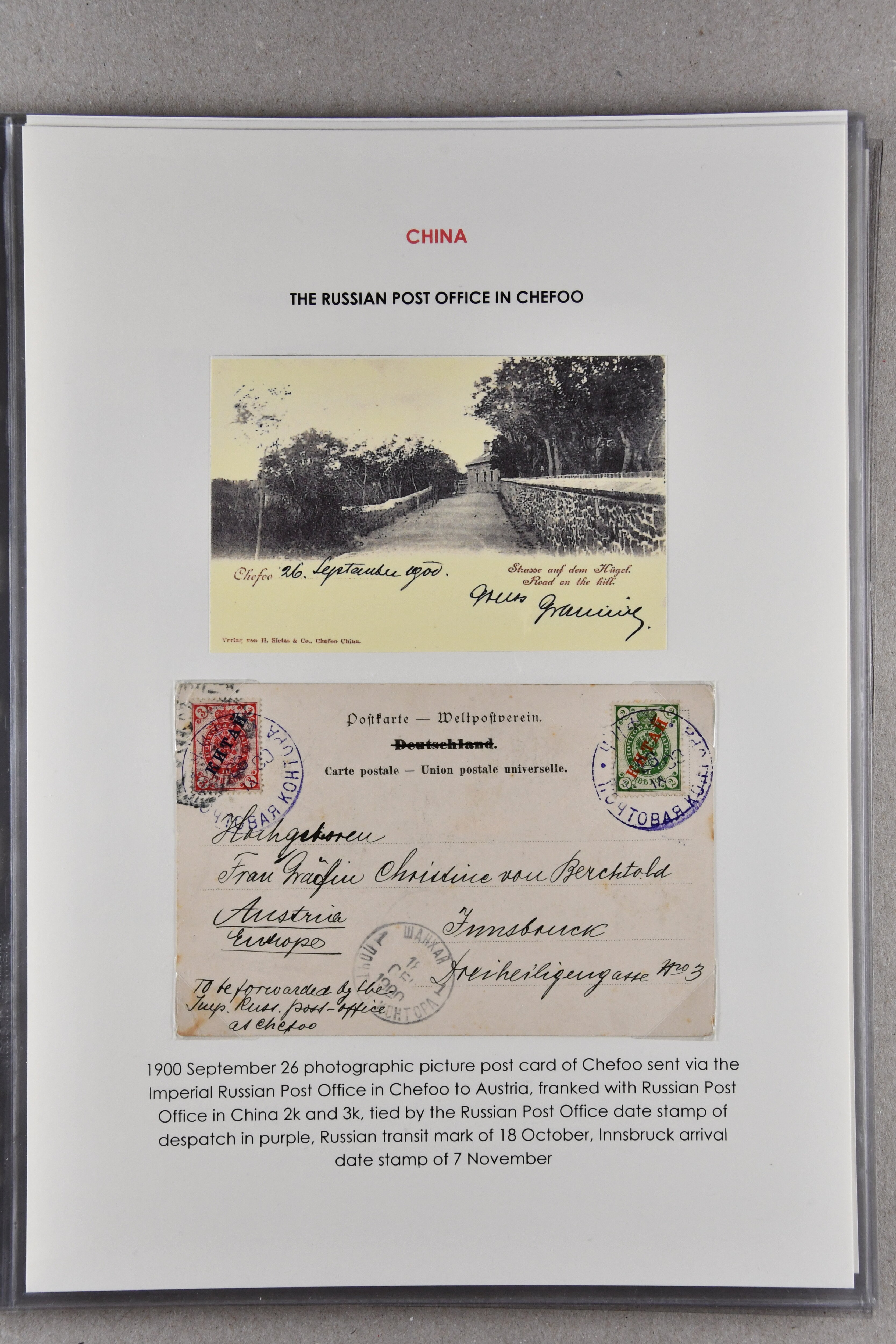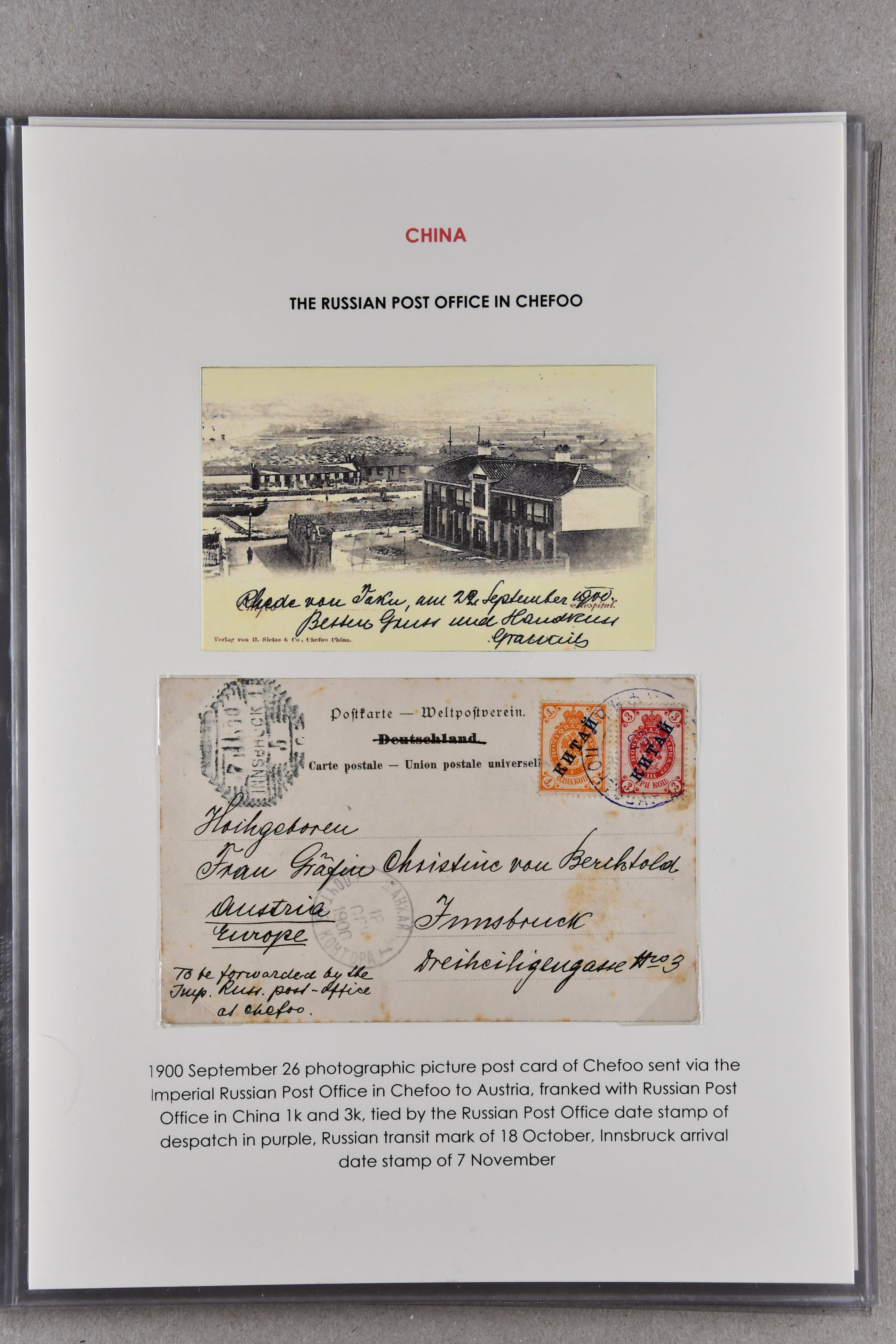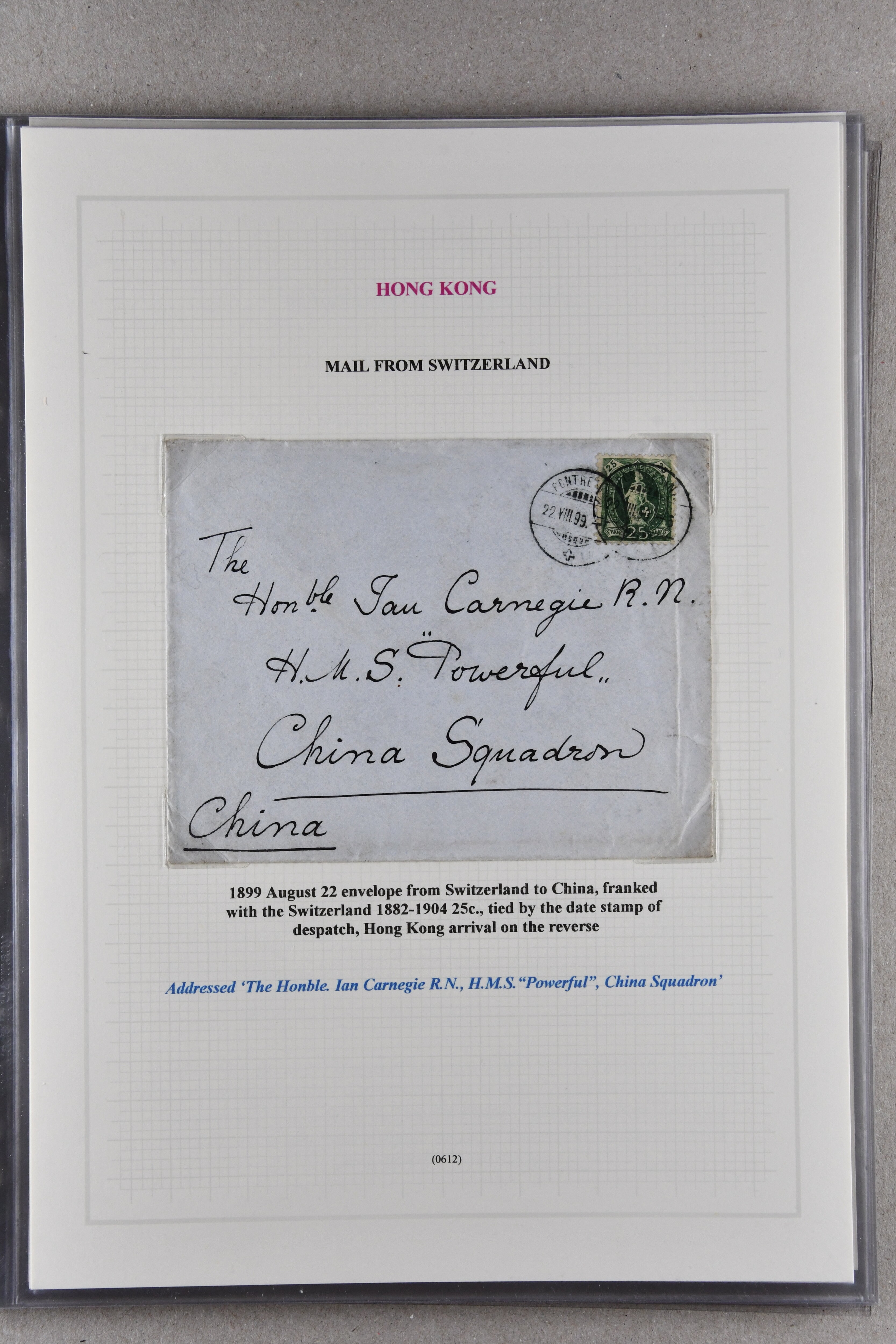 card used to Hong Kong, 1899 Switzerland 25 c. green used to HMS Powerful of the China Squadron; 1900 Russian "Kitai" frankings used on postcards (2) ex Chefoo, 1901 Hong Kong 4 c. grey on cover, 1901 German card to China with two line "Marine /