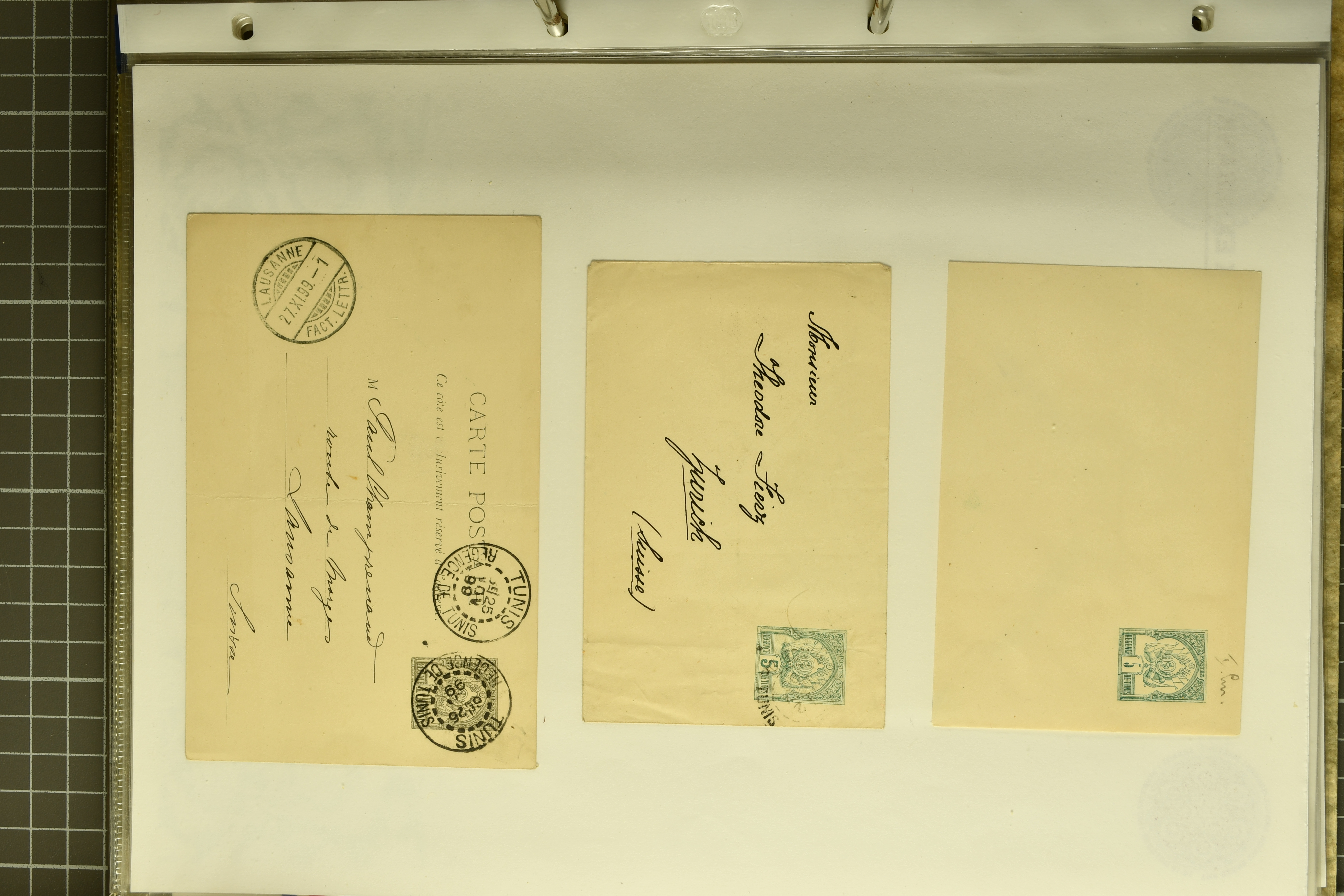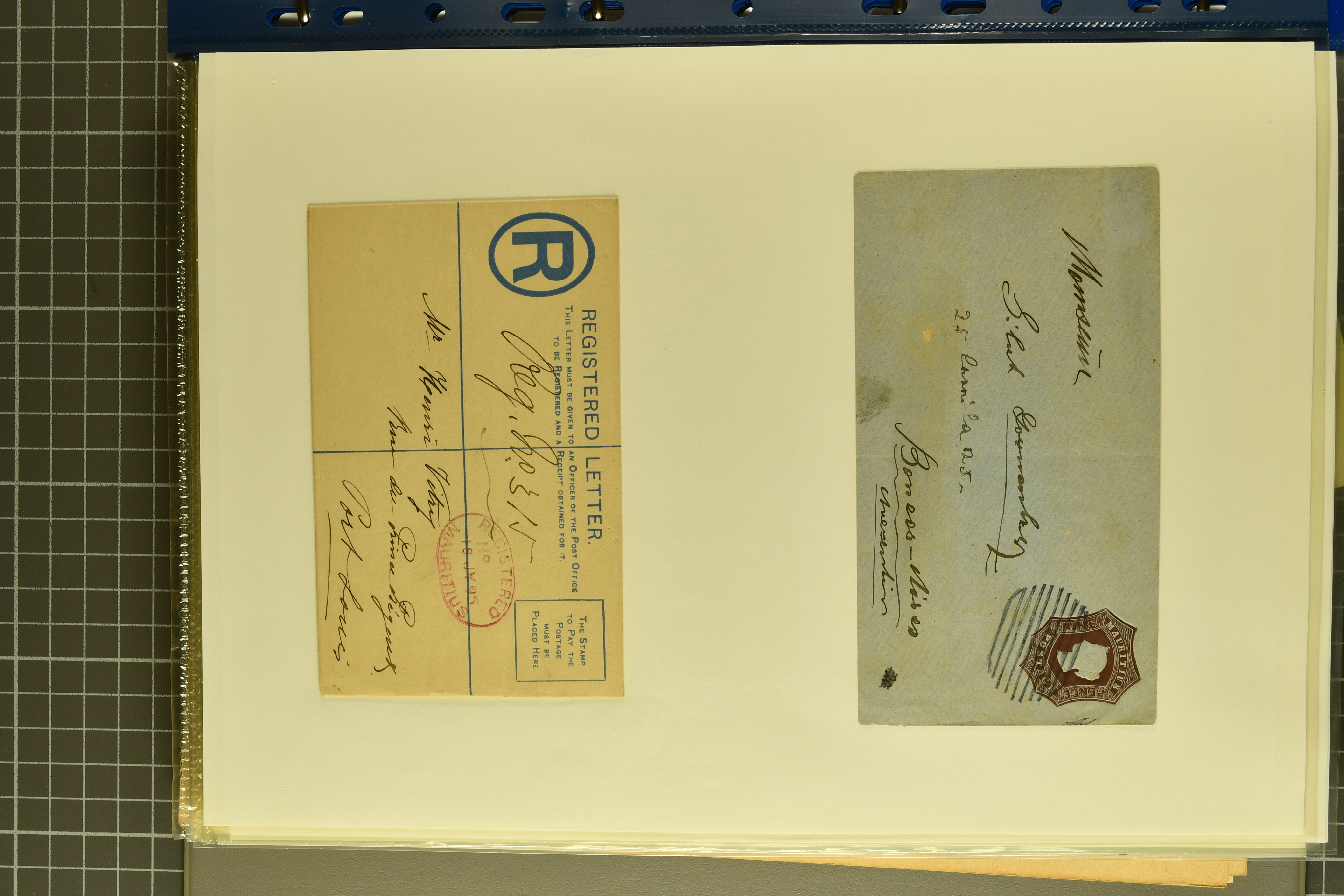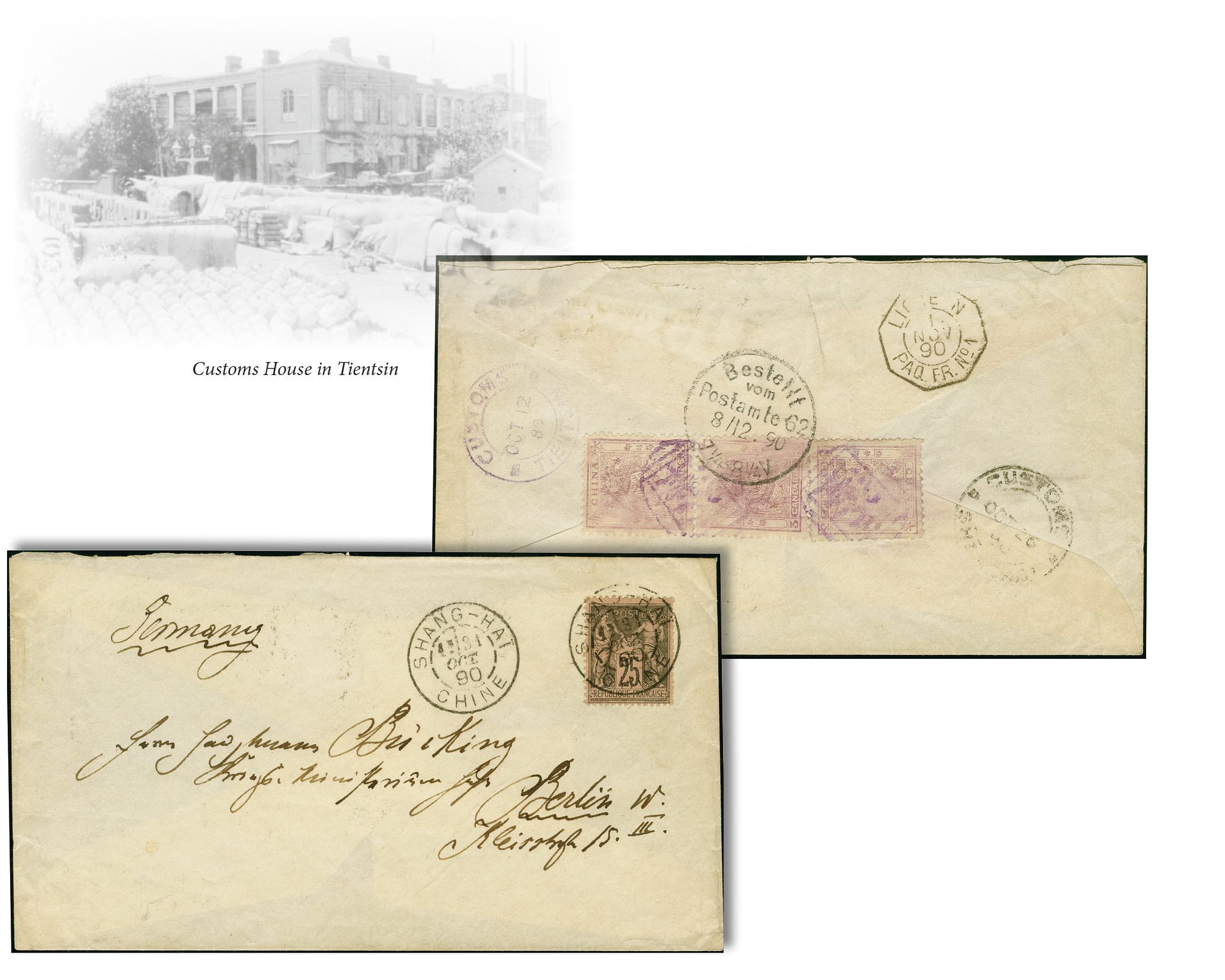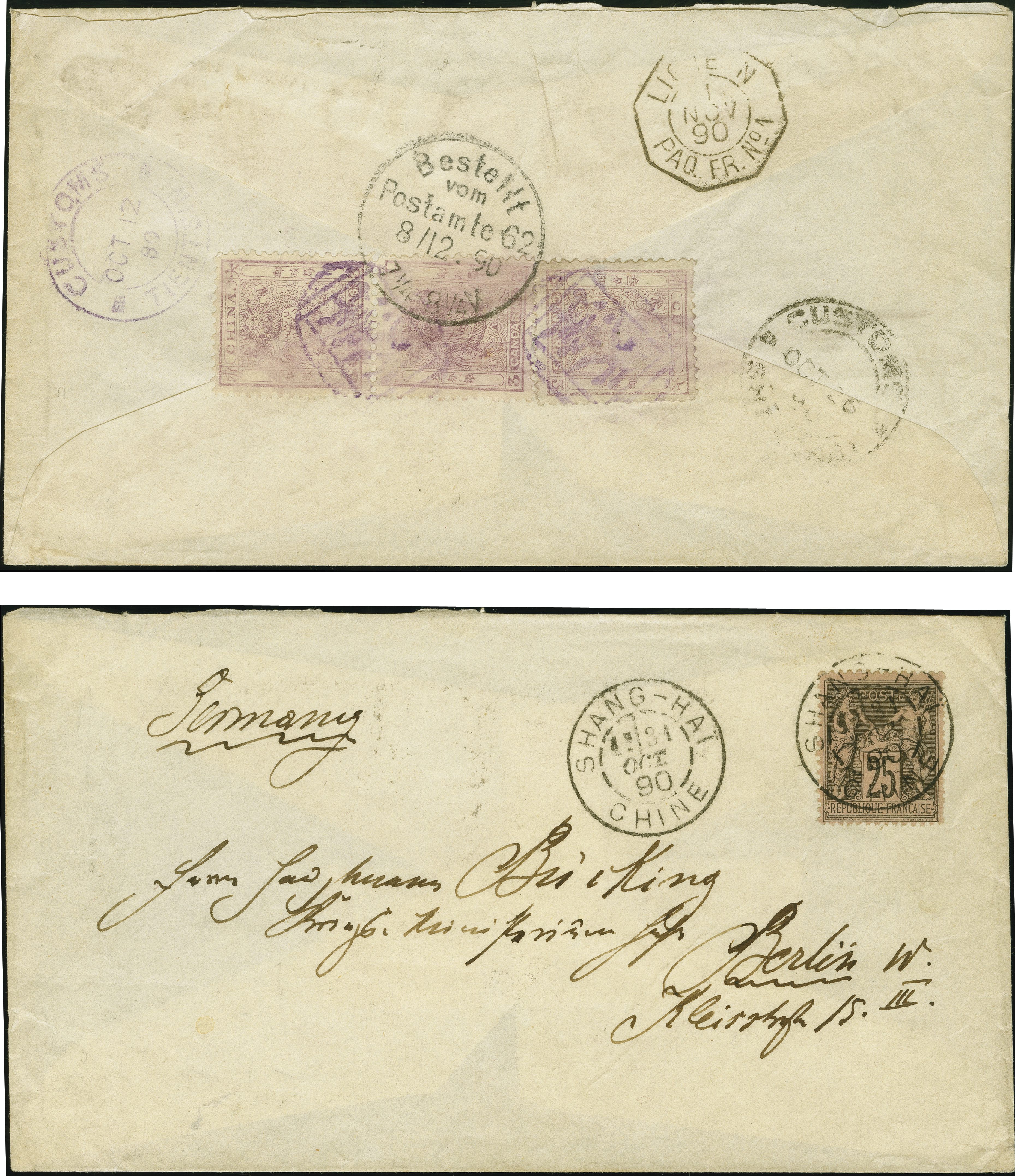 90264 cover image1885: Small Dragon, 3 candarins lilac, vertical pair and single (partly weak, watery print), used on reverse of envelope with customs chop and adjacent “CUSTOMS TIENTSIN OCT 12 90”, sent to Berlin, Germany and tied on arrival by “Bestellt Postamte 8/12.90" in black, transit ”CUSTOMS SHANGHAI OCT 26 90" in black alongside a French transit “1 NOV 90 PAQ.FR. No. 1”. Front, bearing French Sage type 25 centimes black on salmon, fresh colour and fine perforations, tied by black cds “SHANG-HAI CHINE 31 OCT 90” with additional strike alongside. Fine and rare (Image 1) (Image 2)