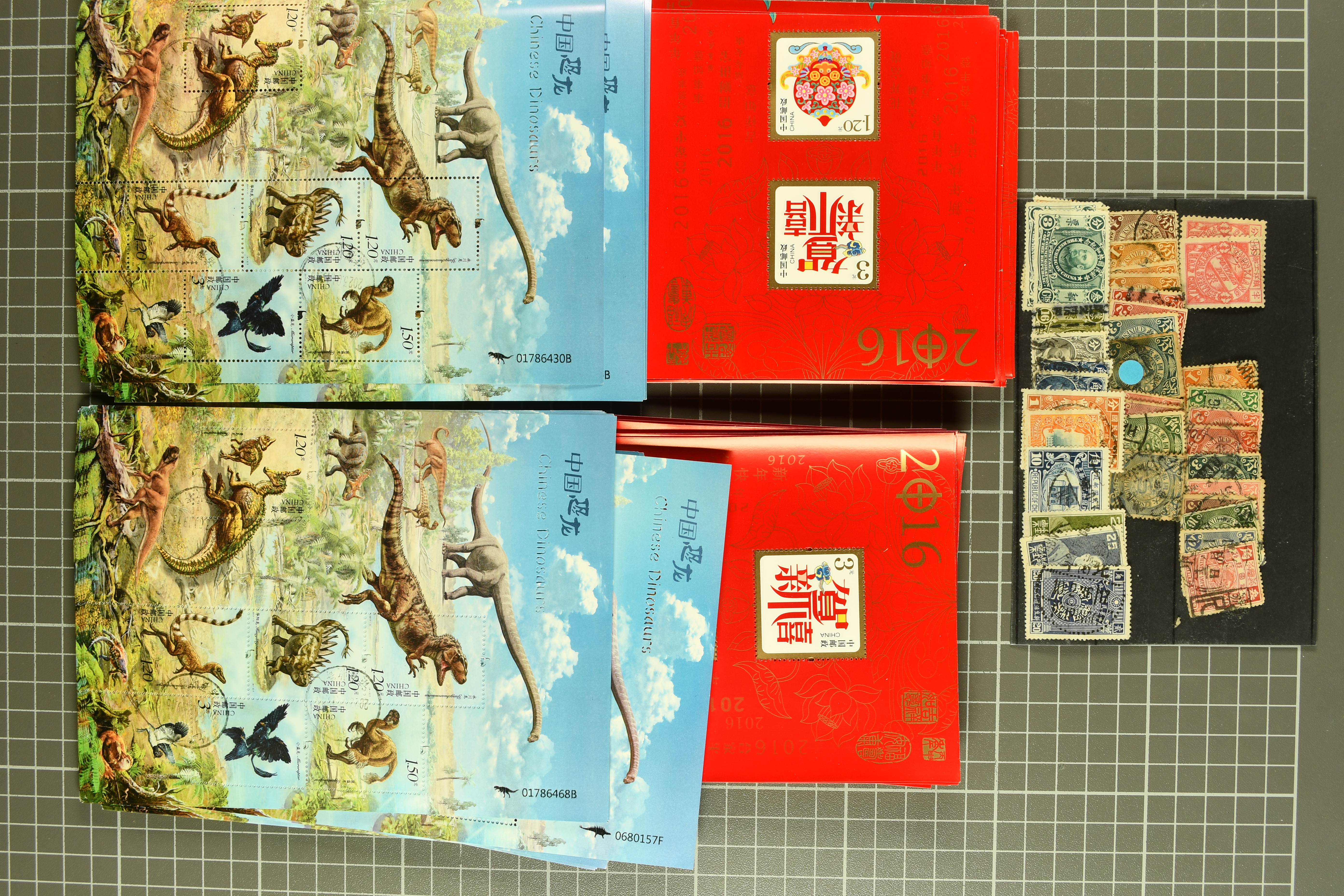 953 1900/89: Six 'Year Collections', 1986, 1987, 1988 (2), 1989 (2), A Century of China Postal History' Folder, 'World of the Sea'; '22ND Univeral Postal Congress'; two small stock books and stock cards with mostly older used stamps including Hong Kong; glassines in old cigarette box from old Taiwan and Thailand