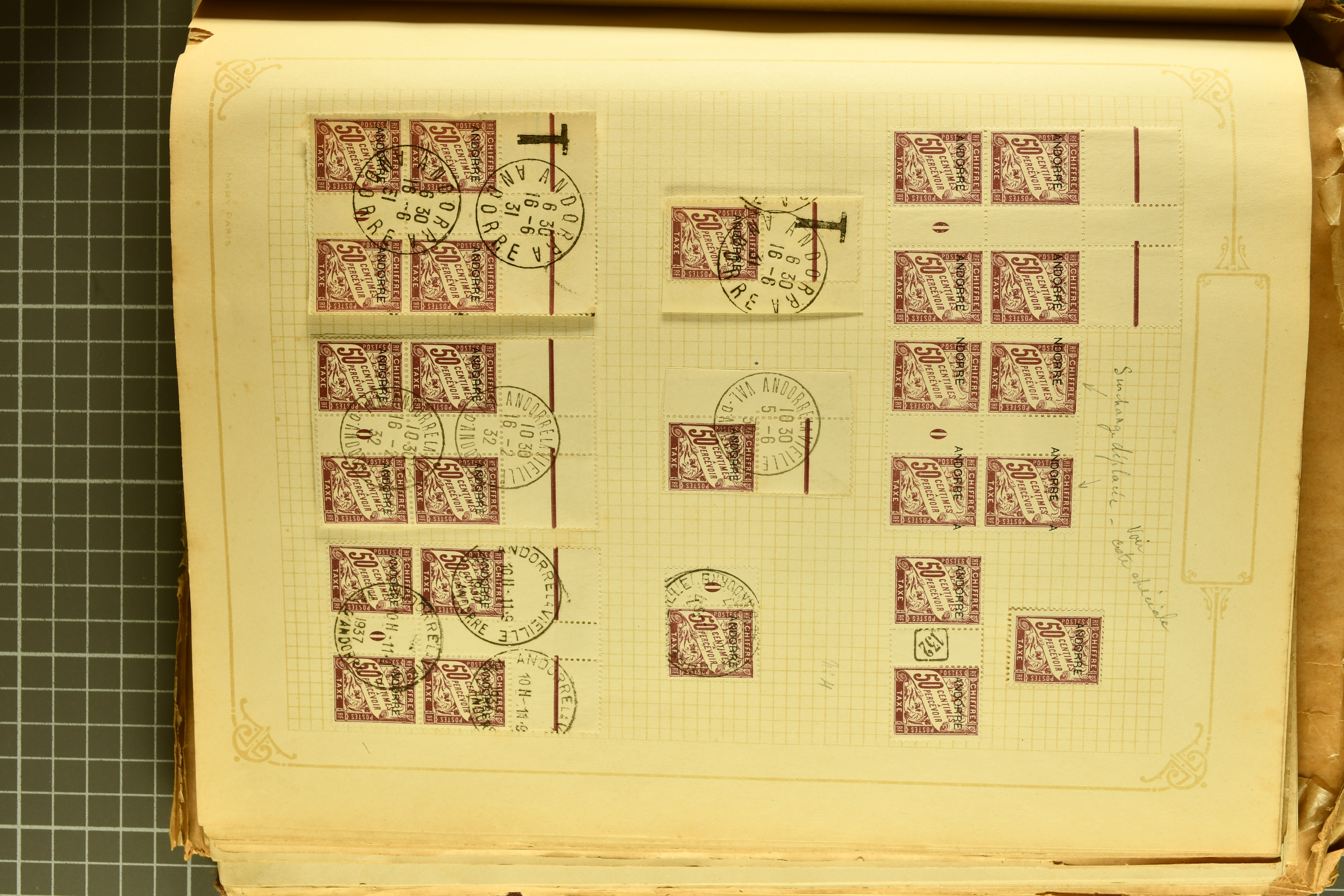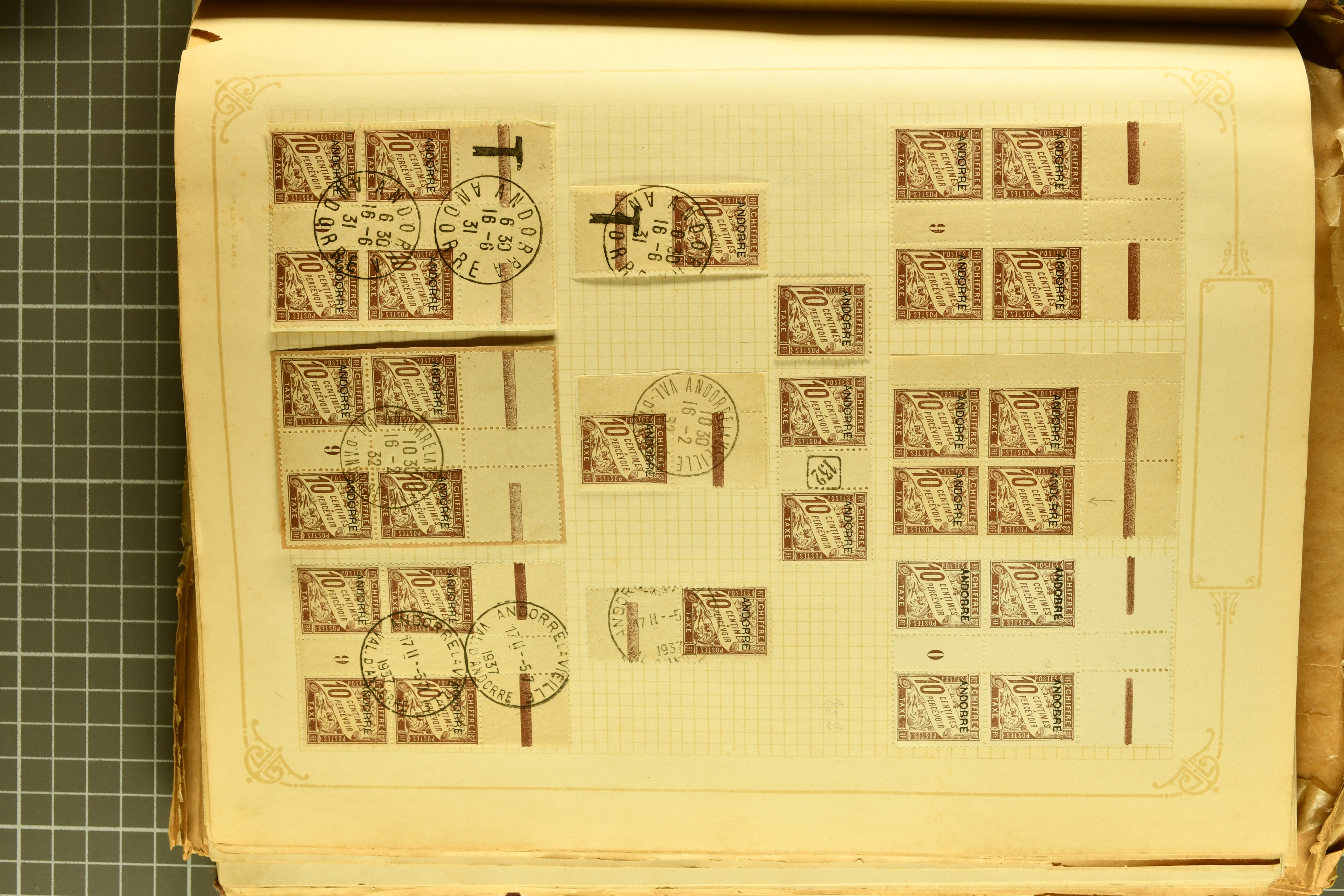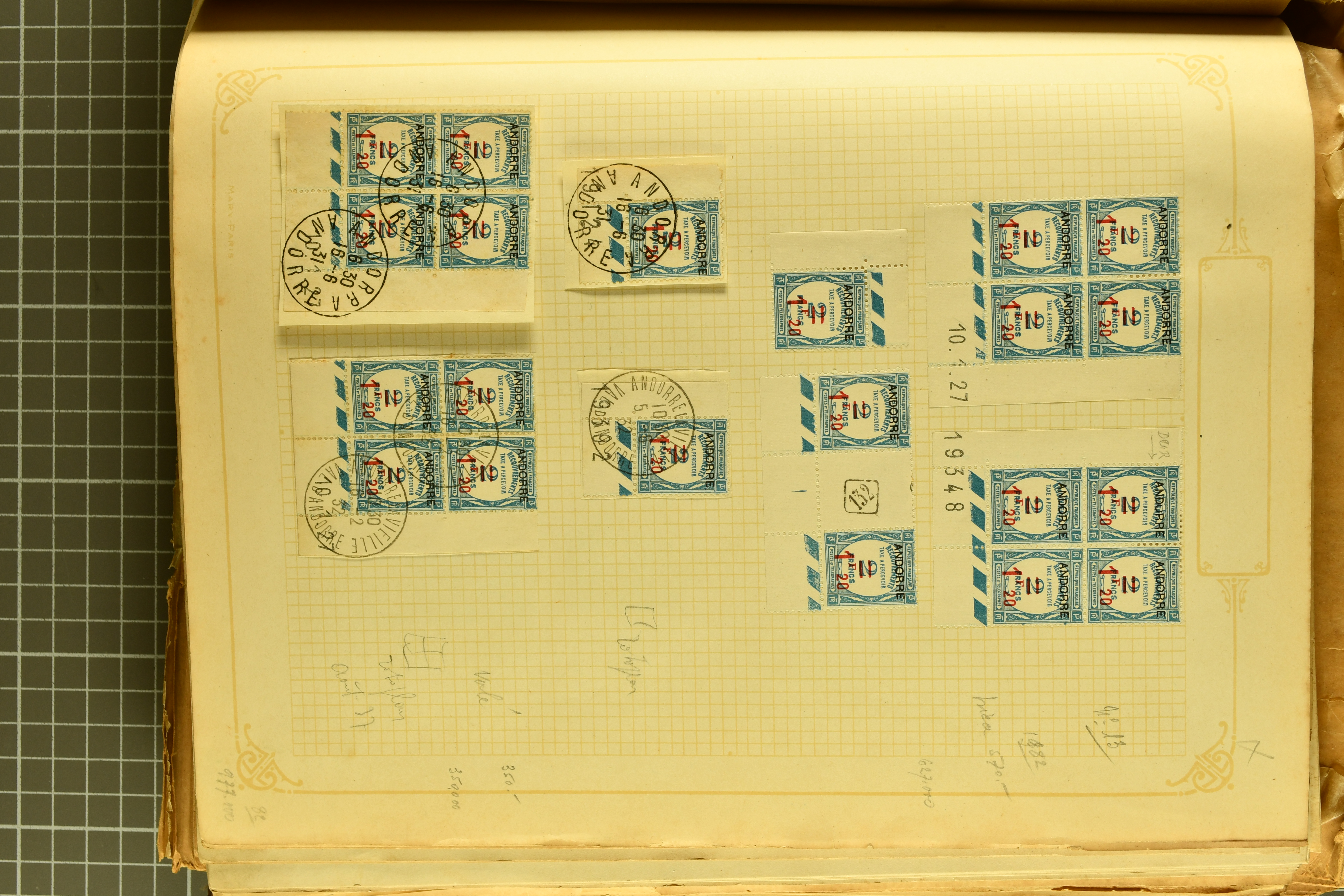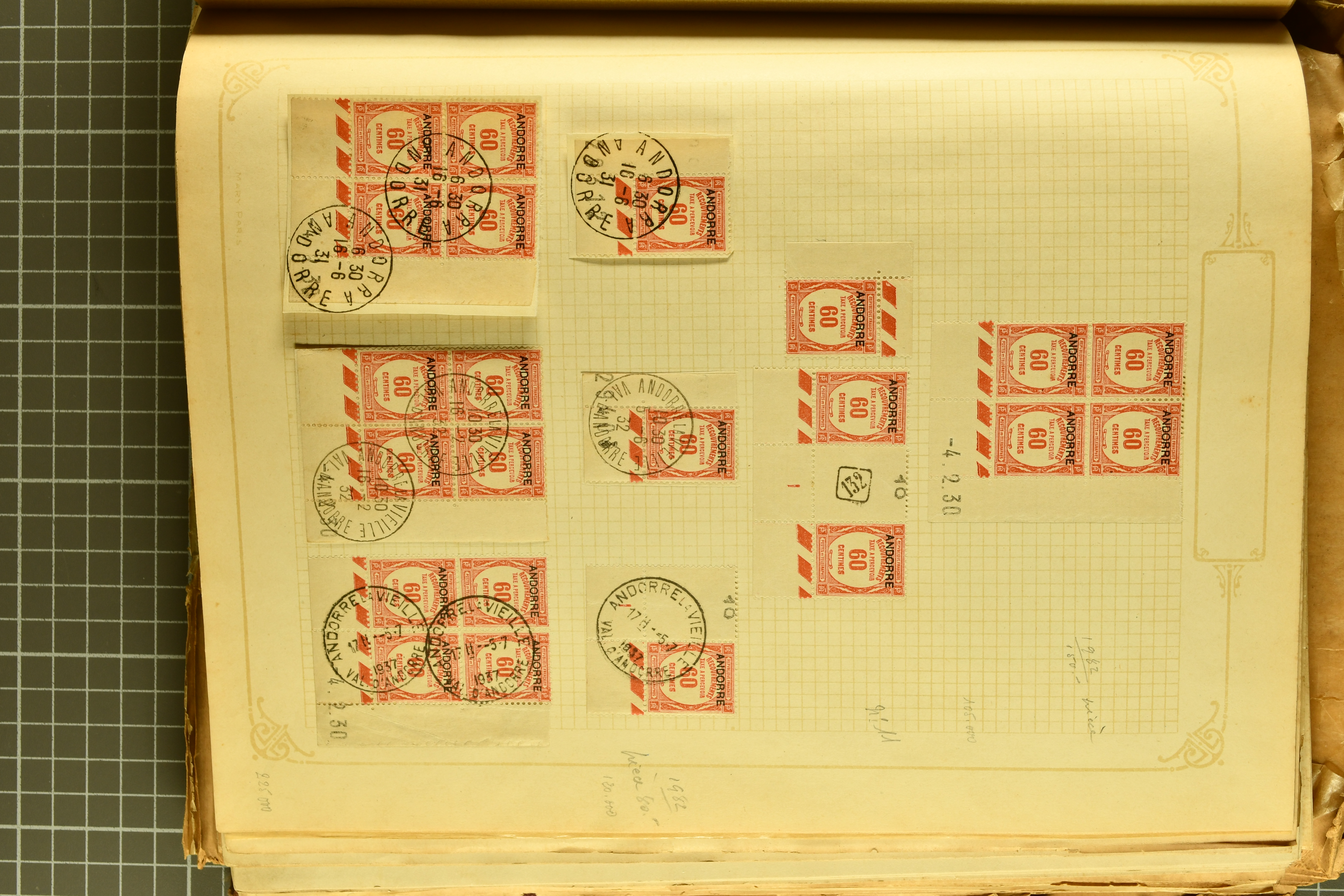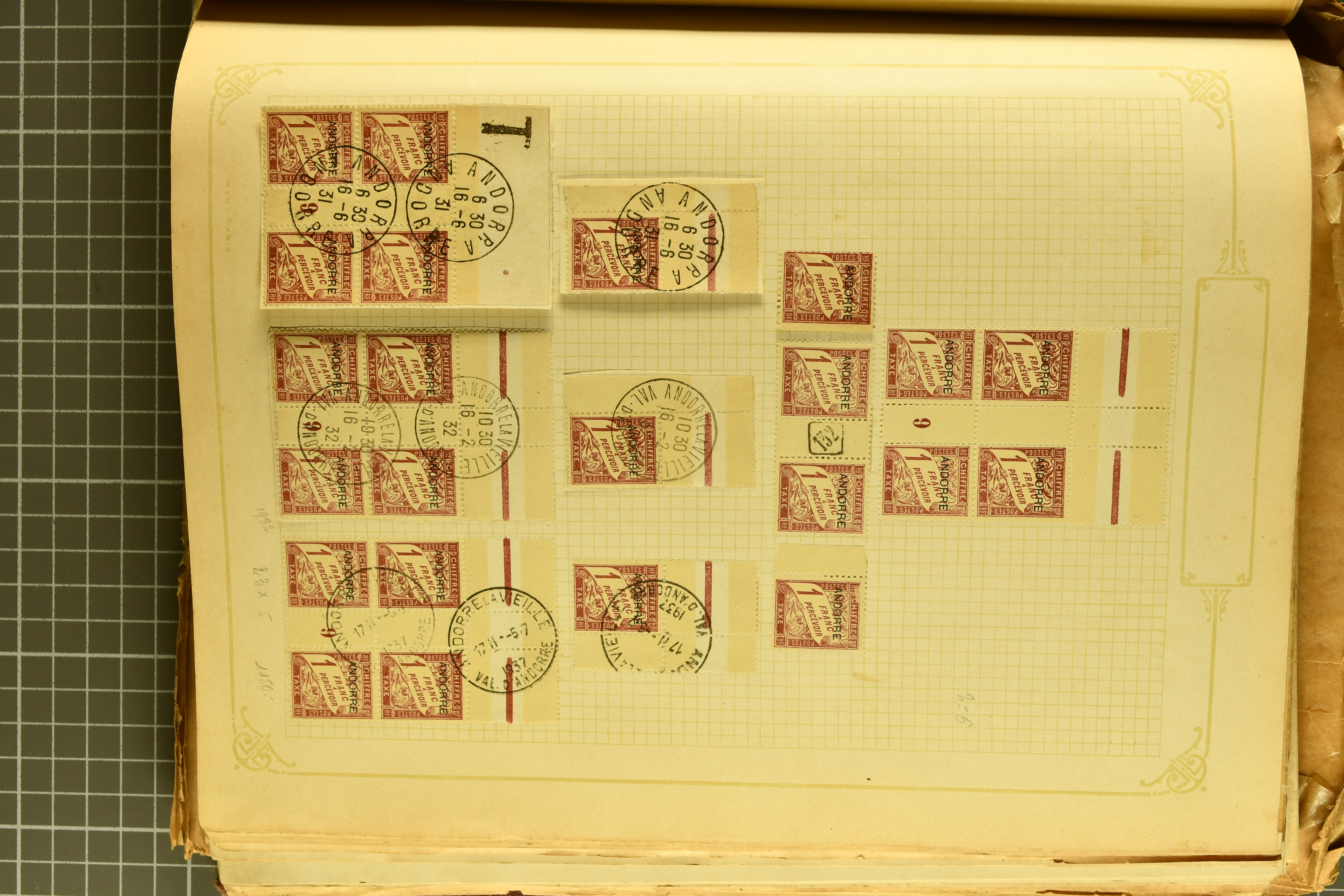 1966 imageAndorra 1929/38: Age-old collection, somewhat moisture-affected, nevertheless of considerable substance. Includes the first set of French Andorra, present 10 times: arranged as 2 blocks of four and 2 singles, all on piece and all cancelled with first day postmarks. The same applies to the first two issues of postage due stamps but 15 per times. The second set of unoverprinted definitives is largely complete (a few low values missing), also present in multiples totalling 10 stamps in the same manner as the first set. The third set is contained unused; the stamps are affixed to the album pages and therefore not counted. Likewise, the unused postage due stamps and some surplus quantities have not been included in the total. Still, the catalogue value reaches € 24'800. Towards the end of the album are further postage dues and covers franked with postage dues (all covers from France), catalogue € 3'930 (prices only for used applied). Also present: the first issue of Spanish Andorra, in used pairs, and the following sets as singles on a paper leaf, catalogue €1'900. The unused Spanish issues are partly stuck and have not been counted; the 4 P. and 10 P. exist in blocks of four, with two stamps mounted and two unmounted each. In total, the collection reaches a catalogue value of €29'830++. Noteworthy are various specialities, e.g. blocks of four frequently from the lower sheet corners (Image 1) (Image 2) (Image 3) (Image 4) (Image 5) (Image 6) (Image 7) (Image 8) (Image 9) (Image 10) (Image 11) (Image 12) (Image 13) (Image 14) (Image 15) (Image 16) (Image 17) (Image 18) (Image 19) (Image 20) (Image 21) (Image 22) (Image 23) (Image 24) (Image 25) (Image 26) (Image 27) (Image 28) (Image 29) (Image 30) (Image 31) (Image 32) (Image 33) (Image 34) (Image 35) (Image 36) (Image 37) (Image 38) (Image 39) (Image 40) (Image 41) (Image 42) (Image 43) (Image 44) (Image 45) (Image 46) (Image 47) (Image 48) (Image 49) (Image 50)