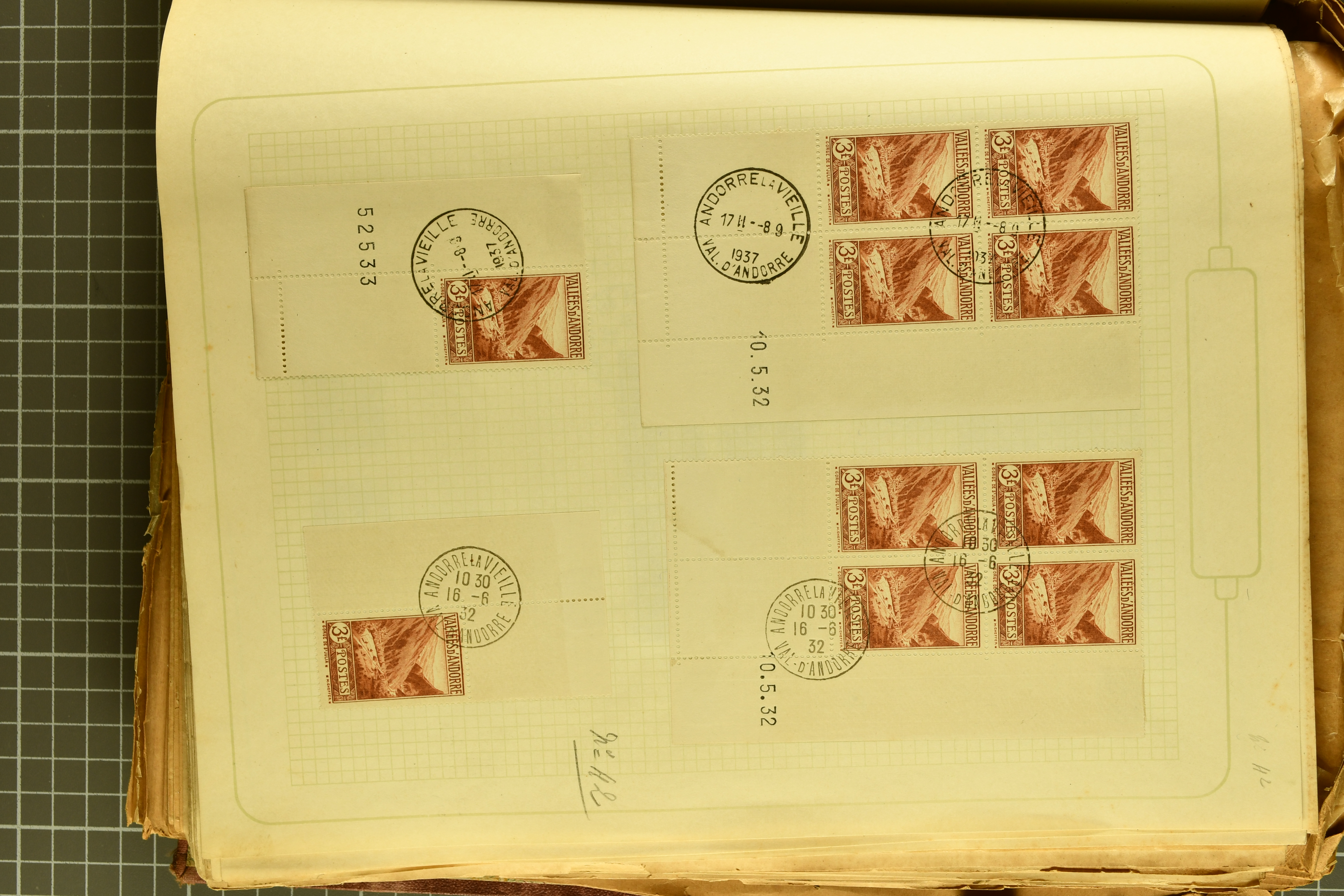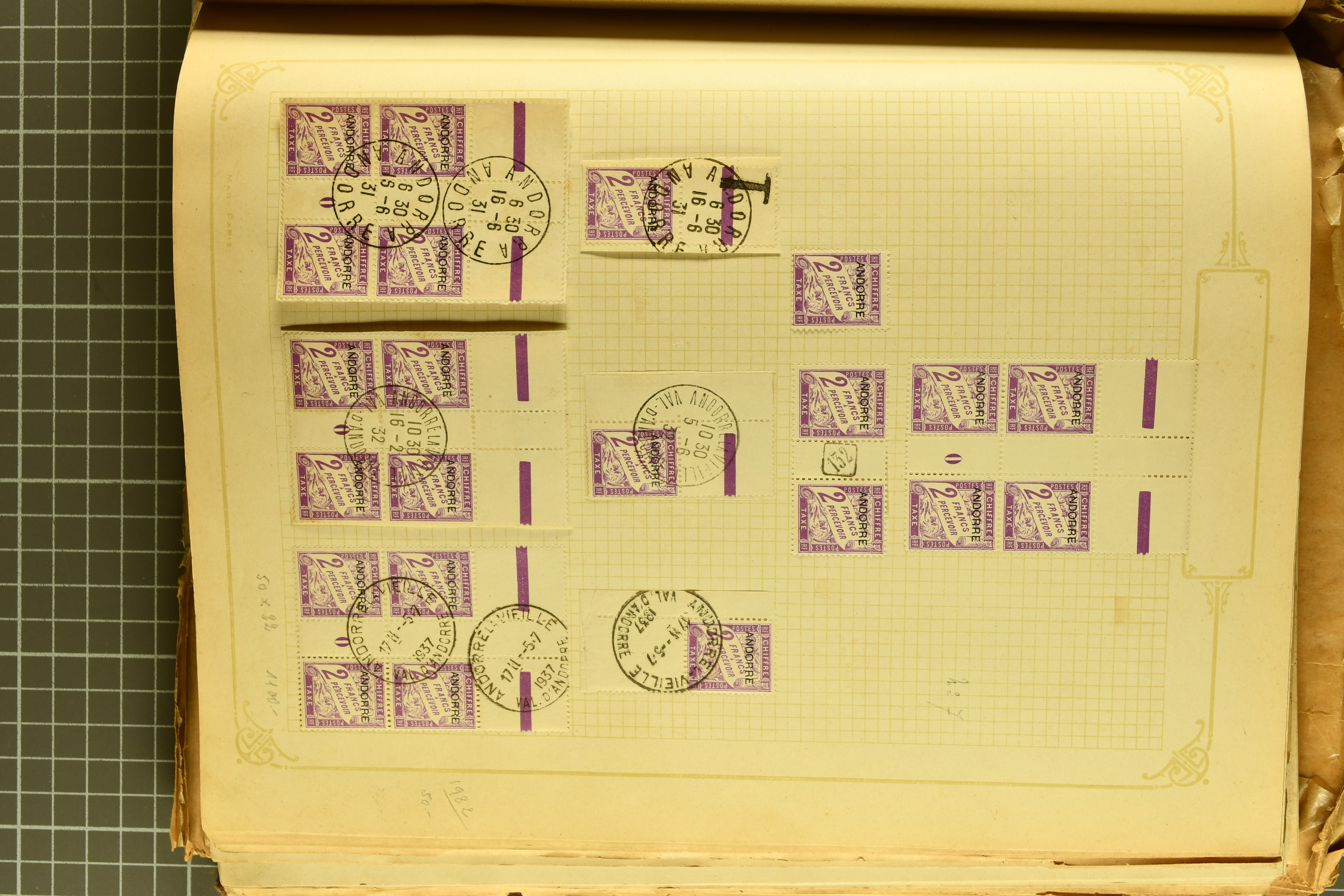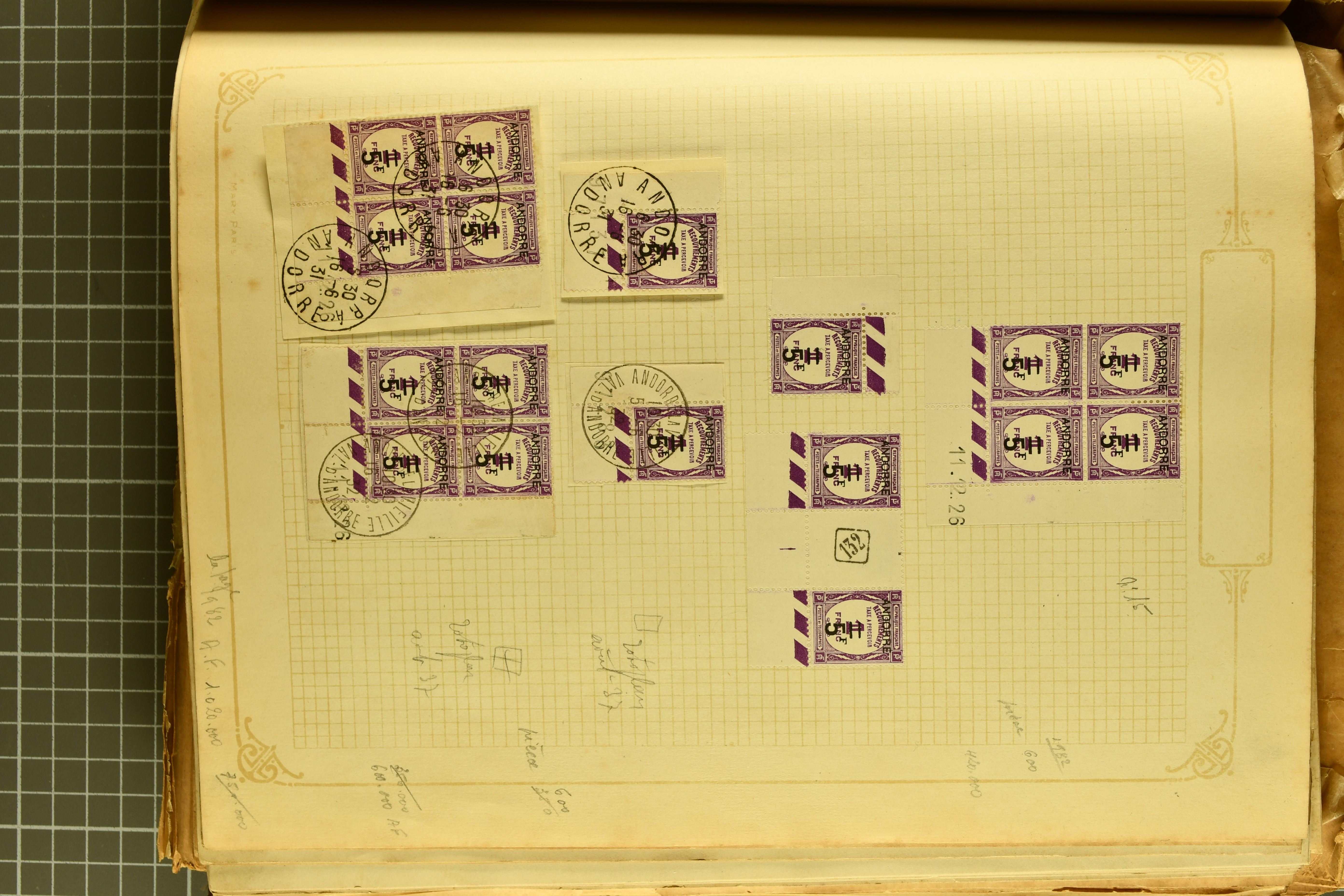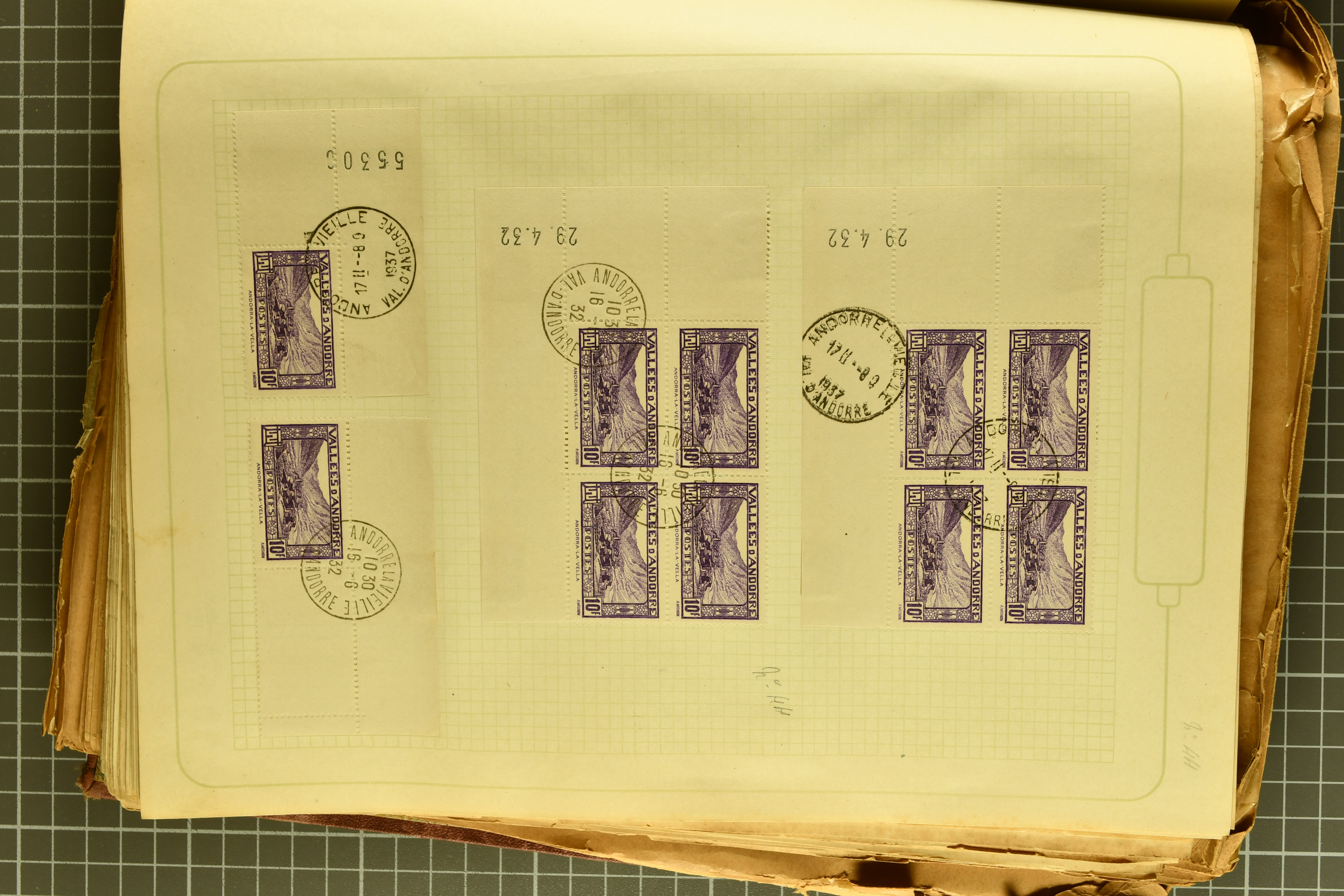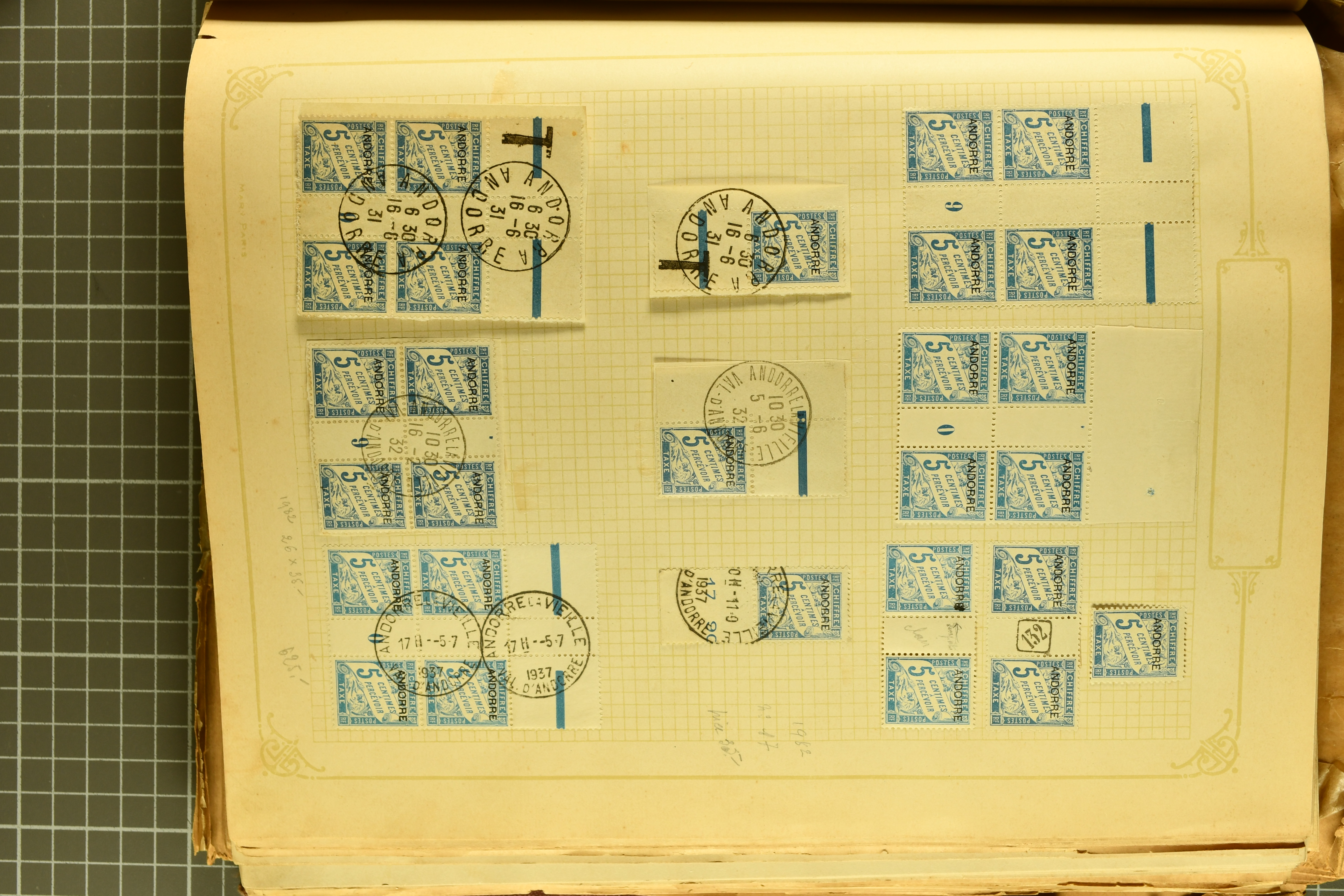 1966 imageAndorra 1929/38: Age-old collection, somewhat moisture-affected, nevertheless of considerable substance. Includes the first set of French Andorra, present 10 times: arranged as 2 blocks of four and 2 singles, all on piece and all cancelled with first day postmarks. The same applies to the first two issues of postage due stamps but 15 per times. The second set of unoverprinted definitives is largely complete (a few low values missing), also present in multiples totalling 10 stamps in the same manner as the first set. The third set is contained unused; the stamps are affixed to the album pages and therefore not counted. Likewise, the unused postage due stamps and some surplus quantities have not been included in the total. Still, the catalogue value reaches € 24'800. Towards the end of the album are further postage dues and covers franked with postage dues (all covers from France), catalogue € 3'930 (prices only for used applied). Also present: the first issue of Spanish Andorra, in used pairs, and the following sets as singles on a paper leaf, catalogue €1'900. The unused Spanish issues are partly stuck and have not been counted; the 4 P. and 10 P. exist in blocks of four, with two stamps mounted and two unmounted each. In total, the collection reaches a catalogue value of €29'830++. Noteworthy are various specialities, e.g. blocks of four frequently from the lower sheet corners (Image 1) (Image 2) (Image 3) (Image 4) (Image 5) (Image 6) (Image 7) (Image 8) (Image 9) (Image 10) (Image 11) (Image 12) (Image 13) (Image 14) (Image 15) (Image 16) (Image 17) (Image 18) (Image 19) (Image 20) (Image 21) (Image 22) (Image 23) (Image 24) (Image 25) (Image 26) (Image 27) (Image 28) (Image 29) (Image 30) (Image 31) (Image 32) (Image 33) (Image 34) (Image 35) (Image 36) (Image 37) (Image 38) (Image 39) (Image 40) (Image 41) (Image 42) (Image 43) (Image 44) (Image 45) (Image 46) (Image 47) (Image 48) (Image 49) (Image 50)