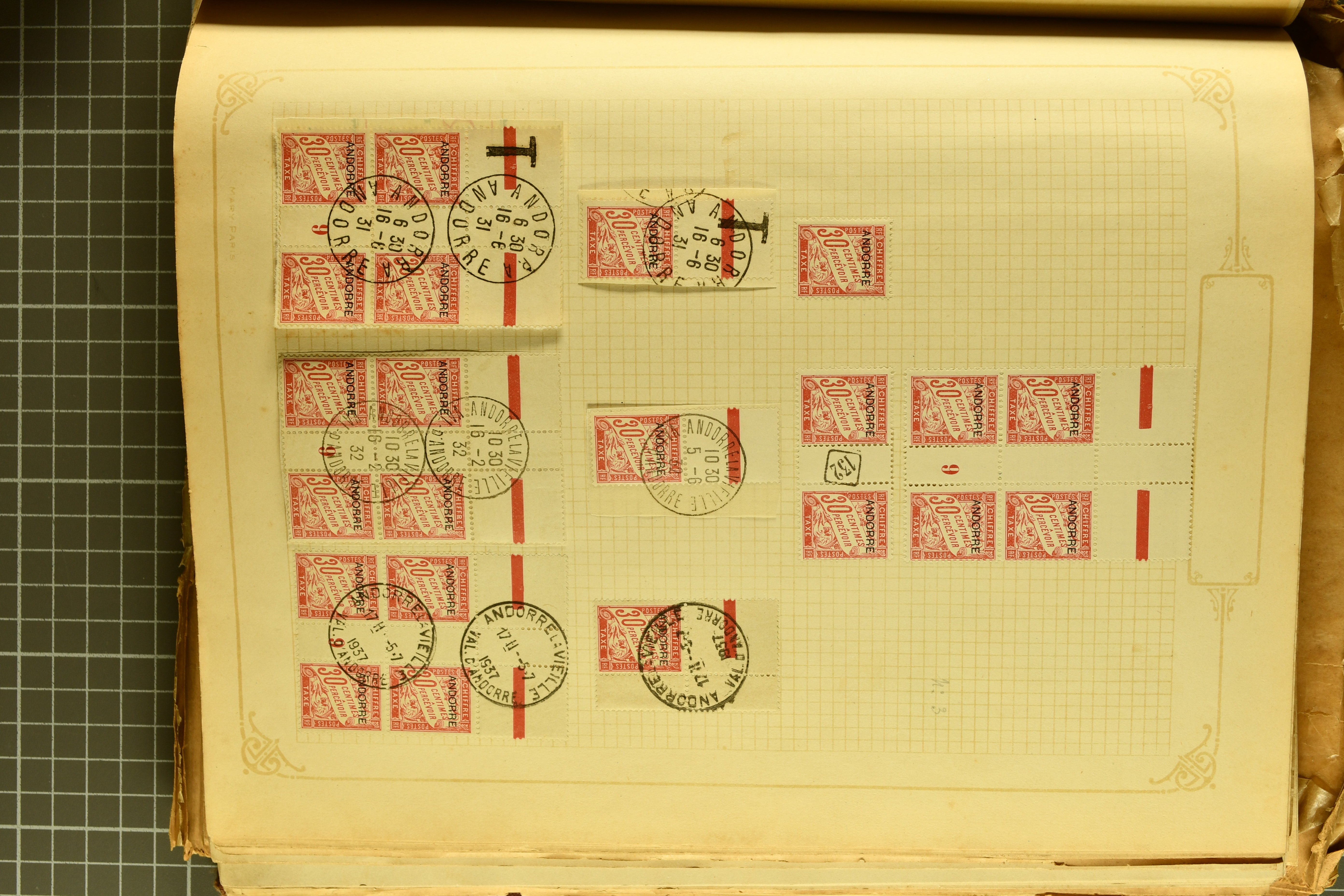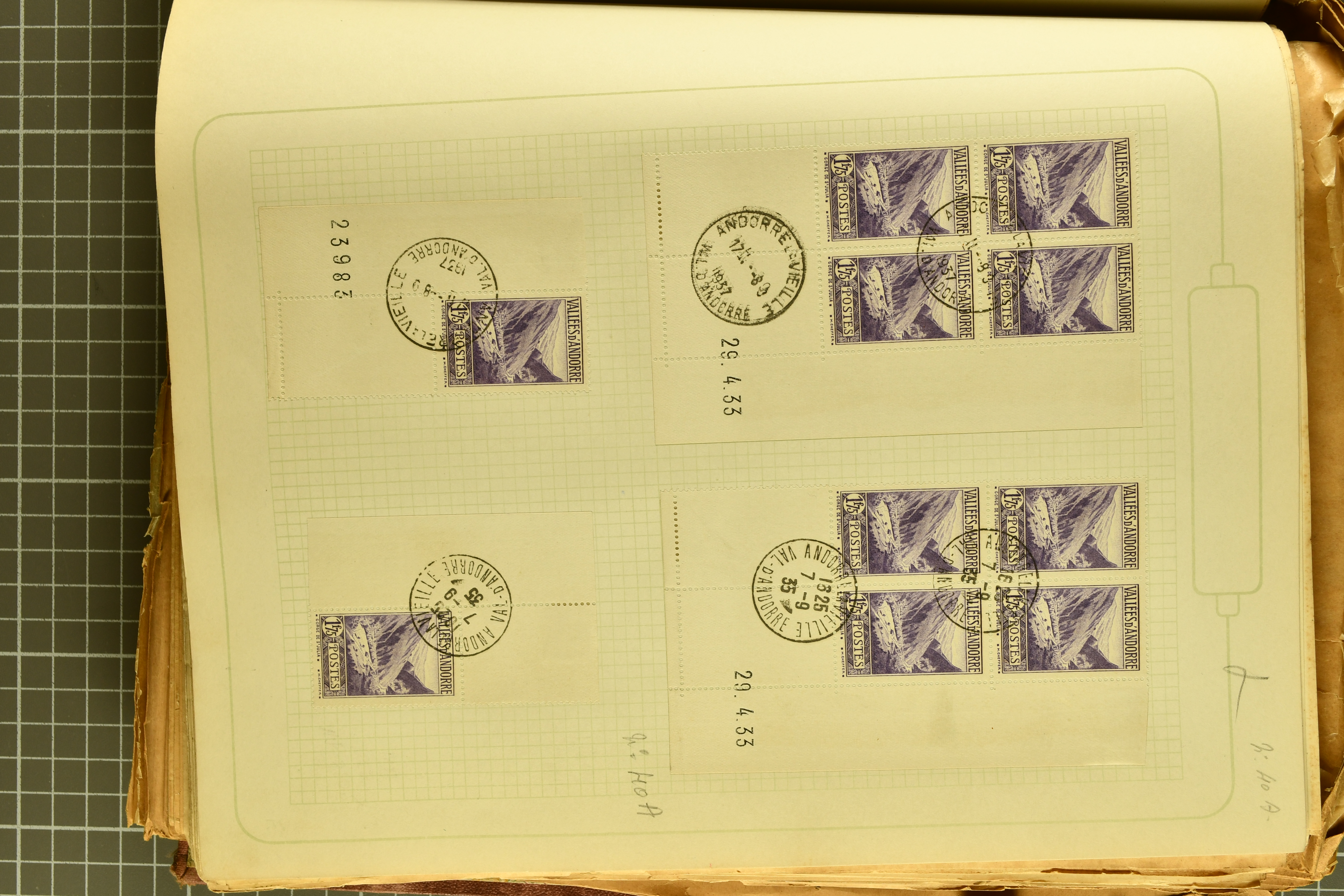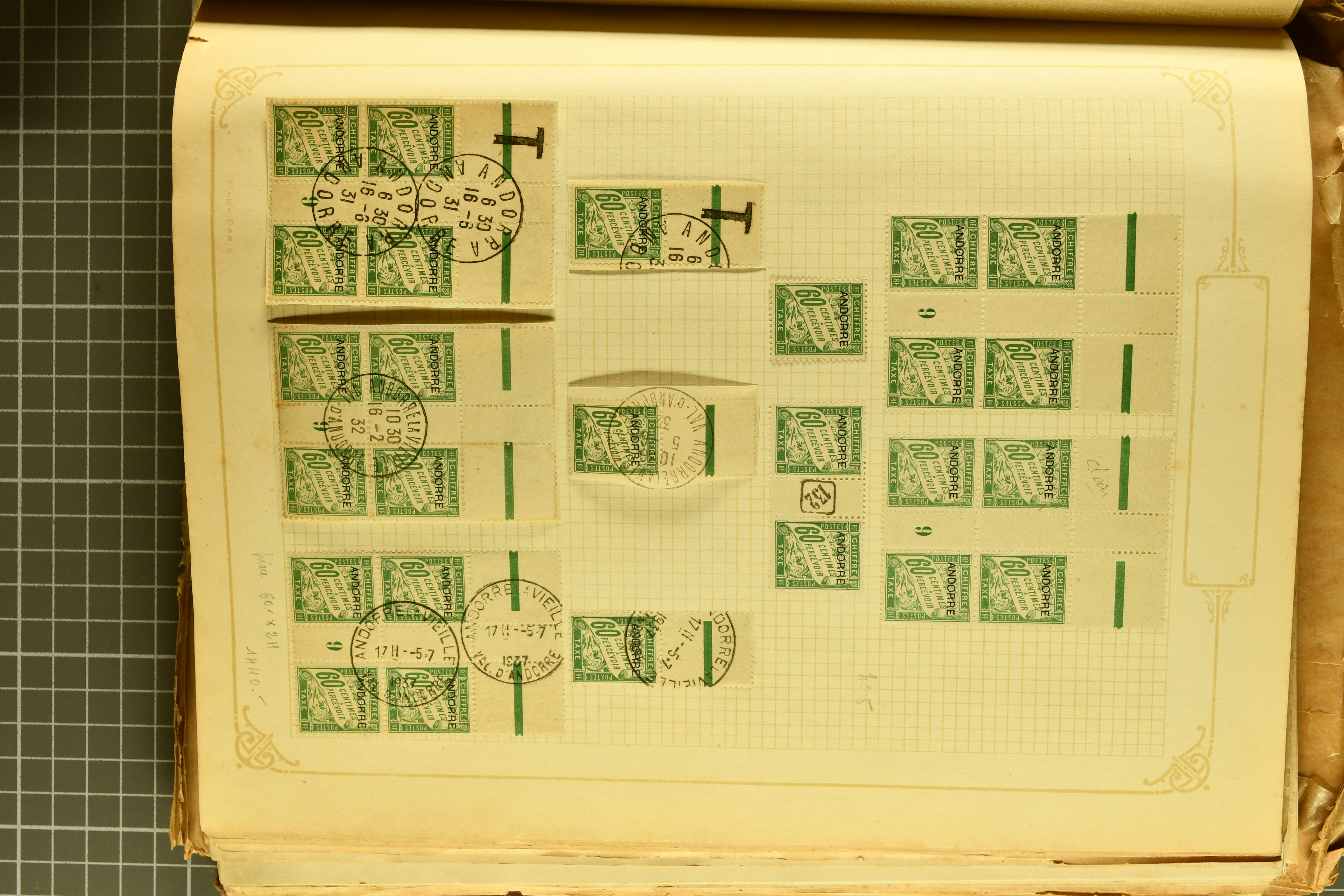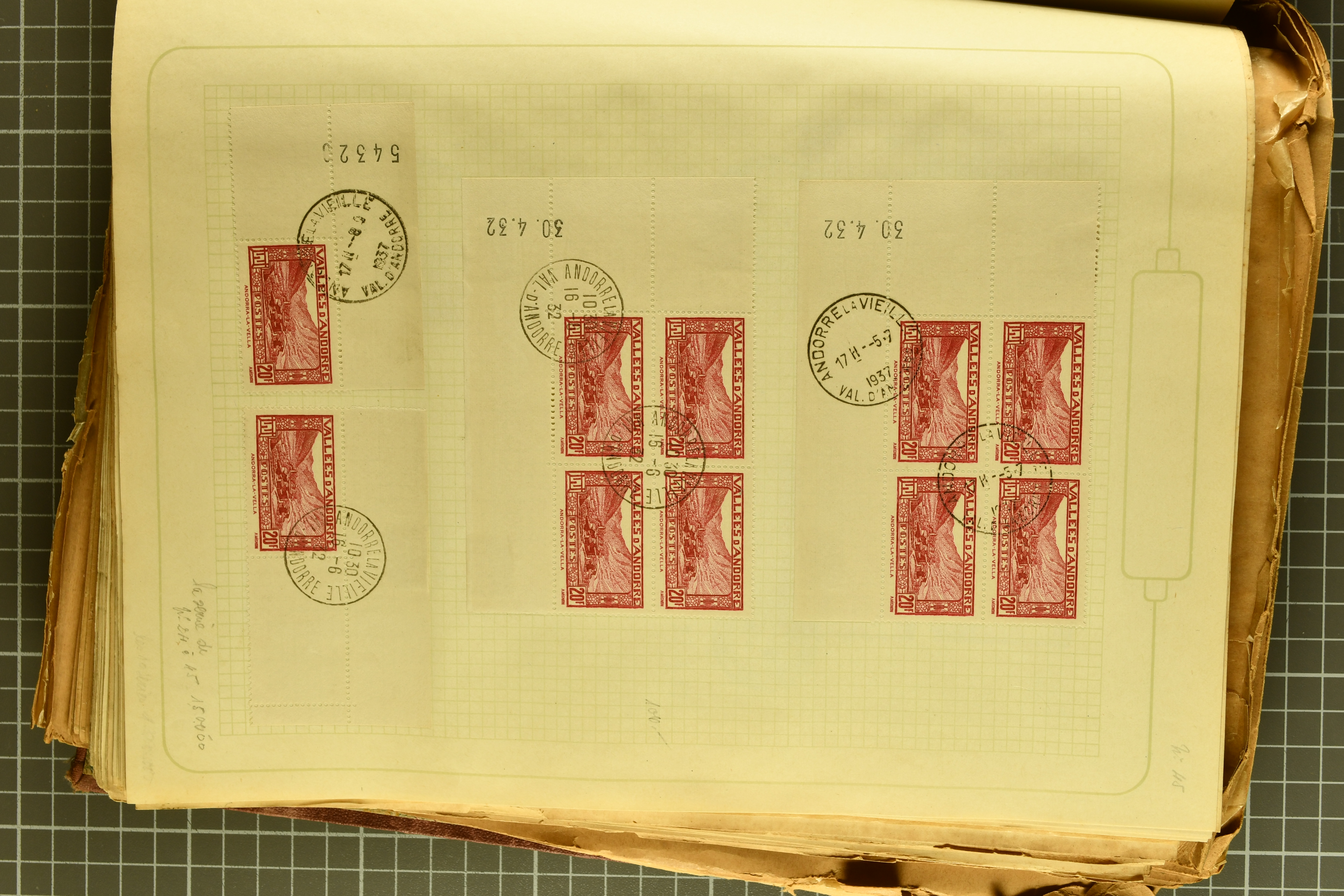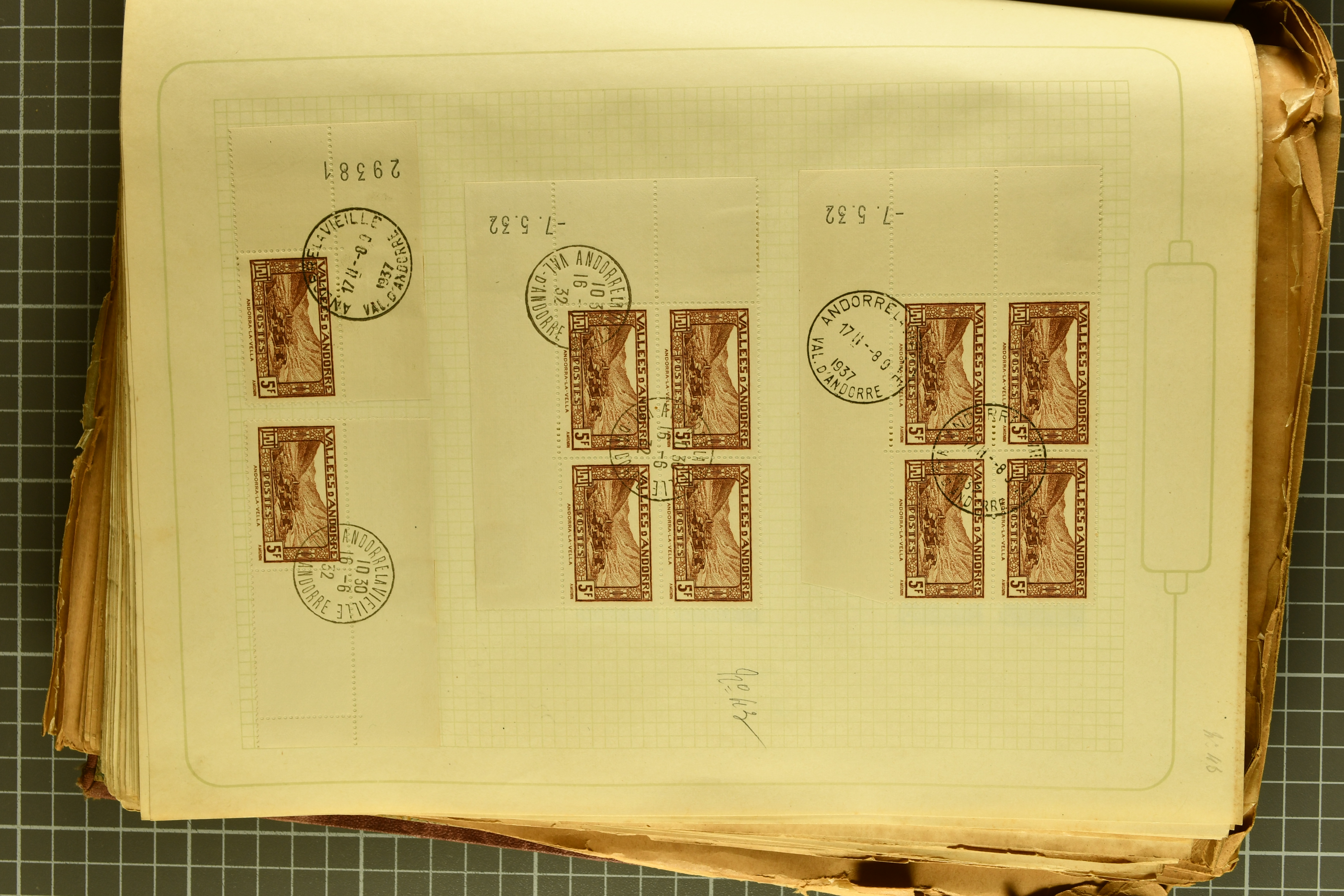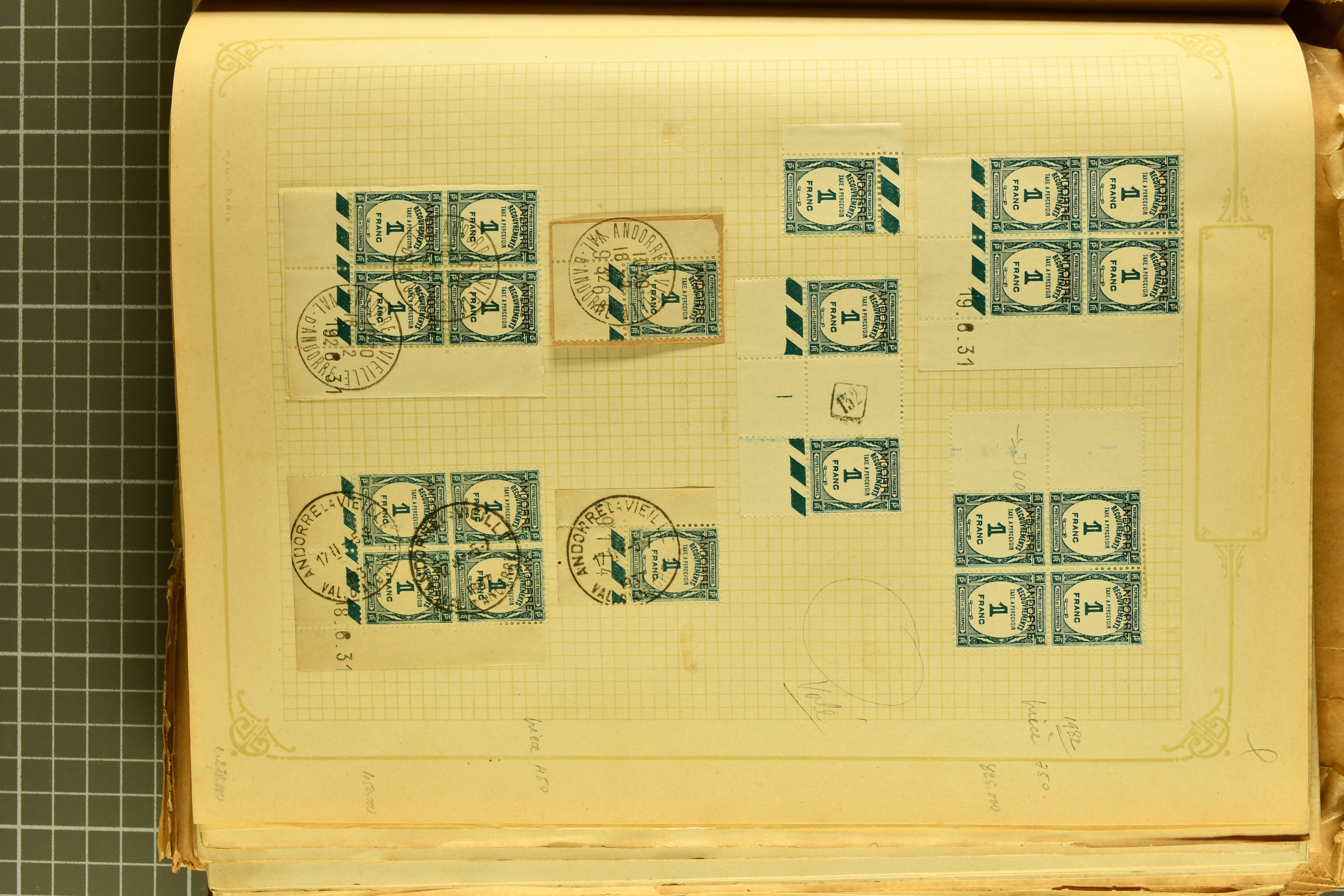 1966 imageAndorra 1929/38: Age-old collection, somewhat moisture-affected, nevertheless of considerable substance. Includes the first set of French Andorra, present 10 times: arranged as 2 blocks of four and 2 singles, all on piece and all cancelled with first day postmarks. The same applies to the first two issues of postage due stamps but 15 per times. The second set of unoverprinted definitives is largely complete (a few low values missing), also present in multiples totalling 10 stamps in the same manner as the first set. The third set is contained unused; the stamps are affixed to the album pages and therefore not counted. Likewise, the unused postage due stamps and some surplus quantities have not been included in the total. Still, the catalogue value reaches € 24'800. Towards the end of the album are further postage dues and covers franked with postage dues (all covers from France), catalogue € 3'930 (prices only for used applied). Also present: the first issue of Spanish Andorra, in used pairs, and the following sets as singles on a paper leaf, catalogue €1'900. The unused Spanish issues are partly stuck and have not been counted; the 4 P. and 10 P. exist in blocks of four, with two stamps mounted and two unmounted each. In total, the collection reaches a catalogue value of €29'830++. Noteworthy are various specialities, e.g. blocks of four frequently from the lower sheet corners (Image 1) (Image 2) (Image 3) (Image 4) (Image 5) (Image 6) (Image 7) (Image 8) (Image 9) (Image 10) (Image 11) (Image 12) (Image 13) (Image 14) (Image 15) (Image 16) (Image 17) (Image 18) (Image 19) (Image 20) (Image 21) (Image 22) (Image 23) (Image 24) (Image 25) (Image 26) (Image 27) (Image 28) (Image 29) (Image 30) (Image 31) (Image 32) (Image 33) (Image 34) (Image 35) (Image 36) (Image 37) (Image 38) (Image 39) (Image 40) (Image 41) (Image 42) (Image 43) (Image 44) (Image 45) (Image 46) (Image 47) (Image 48) (Image 49) (Image 50)