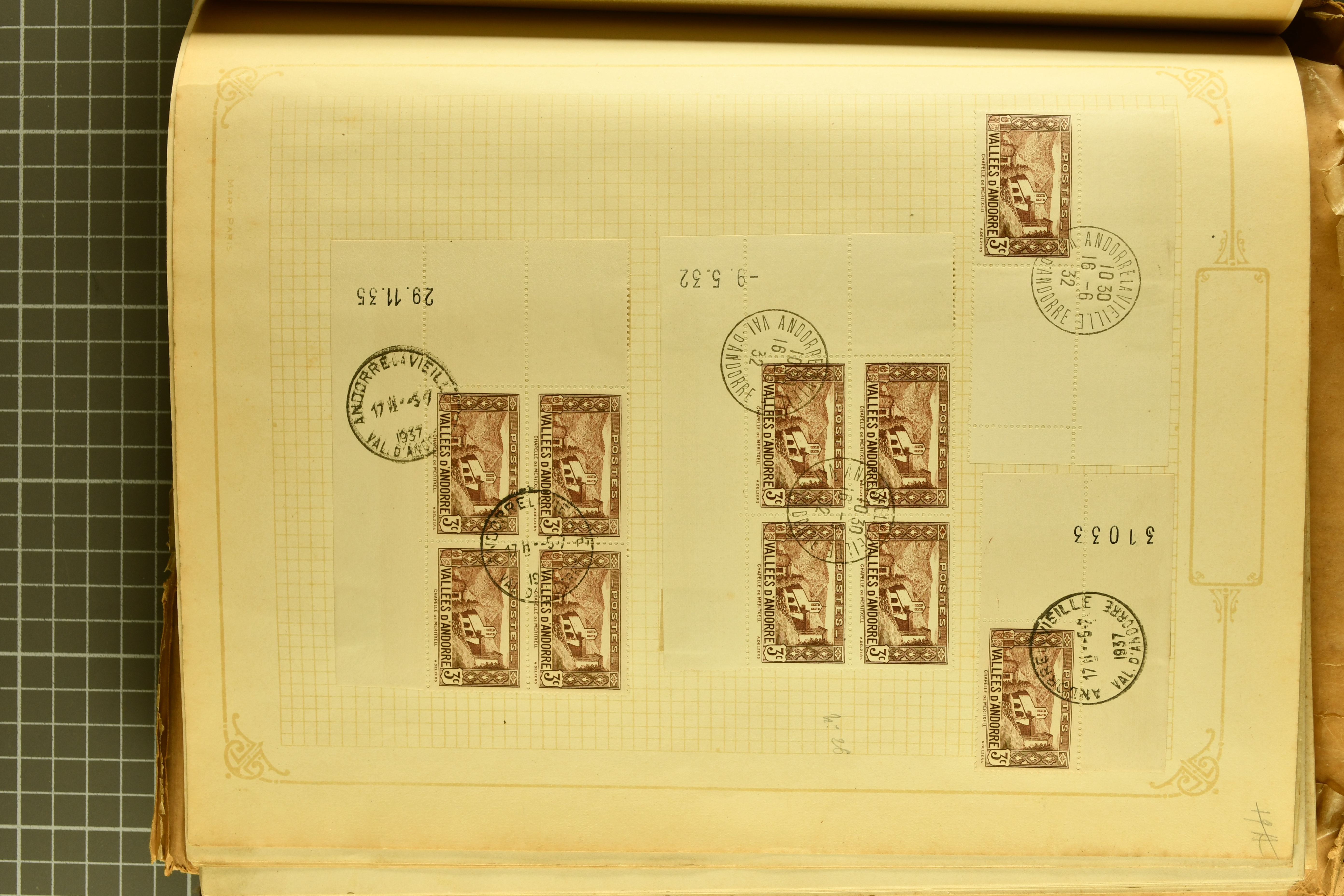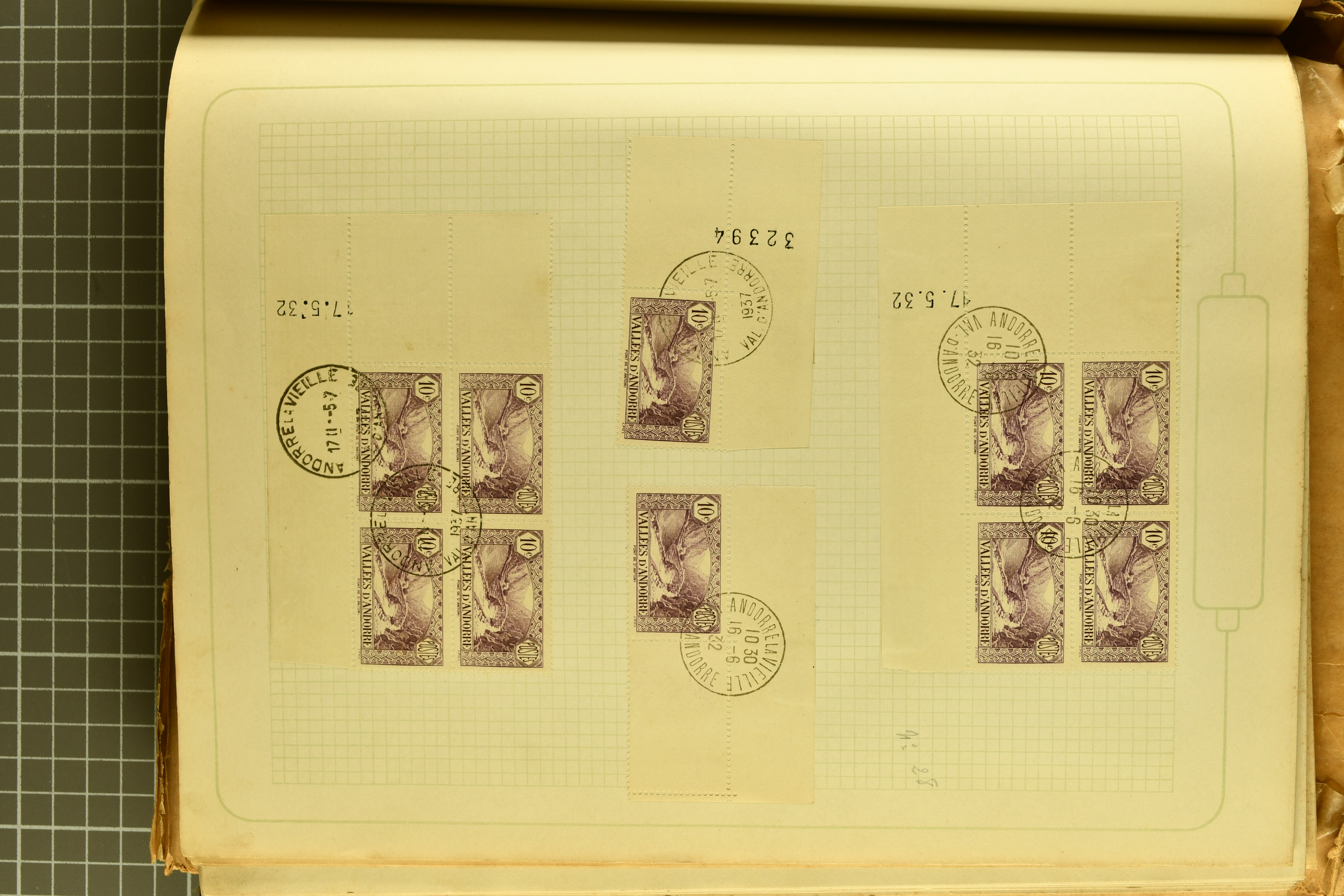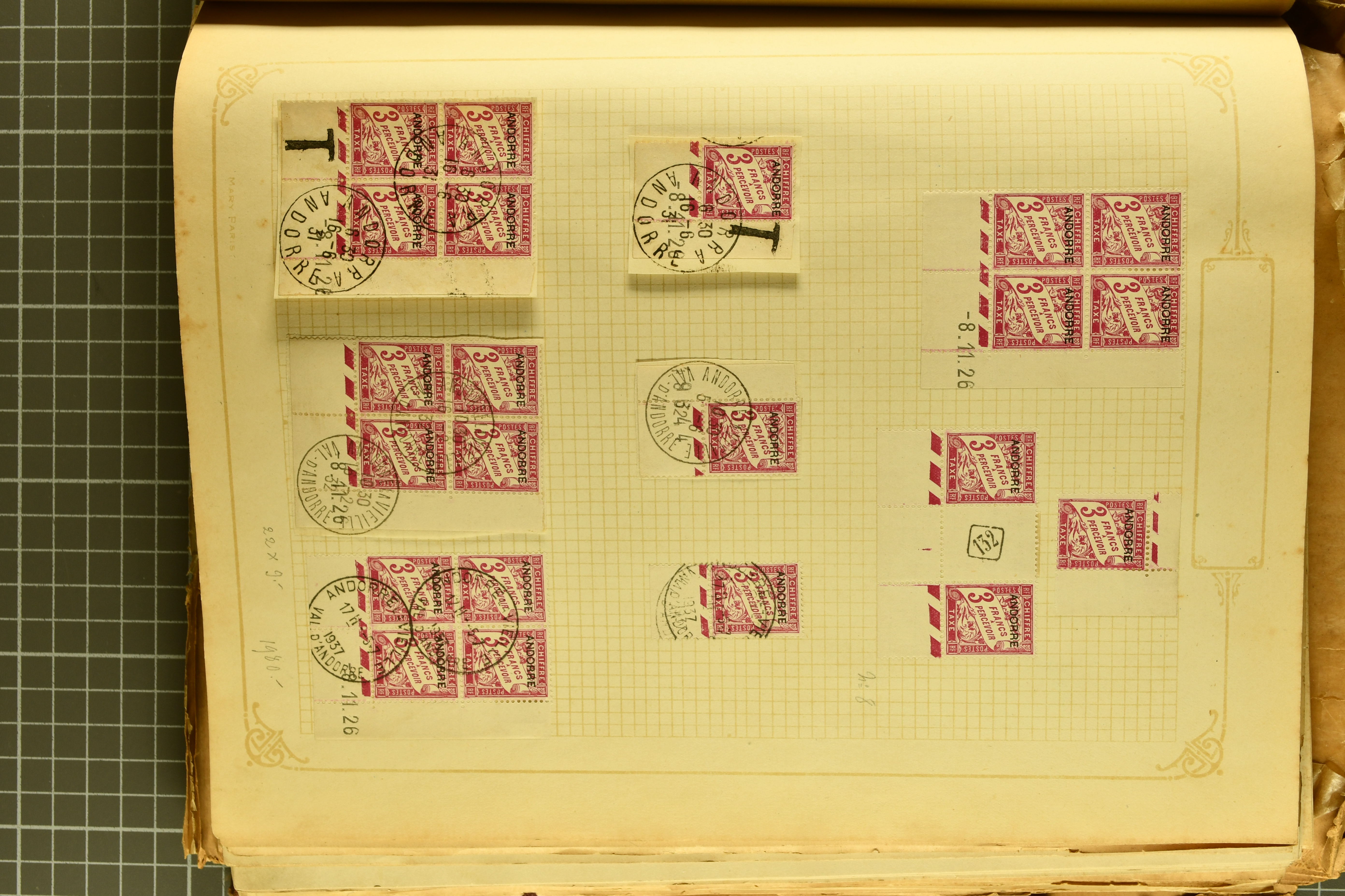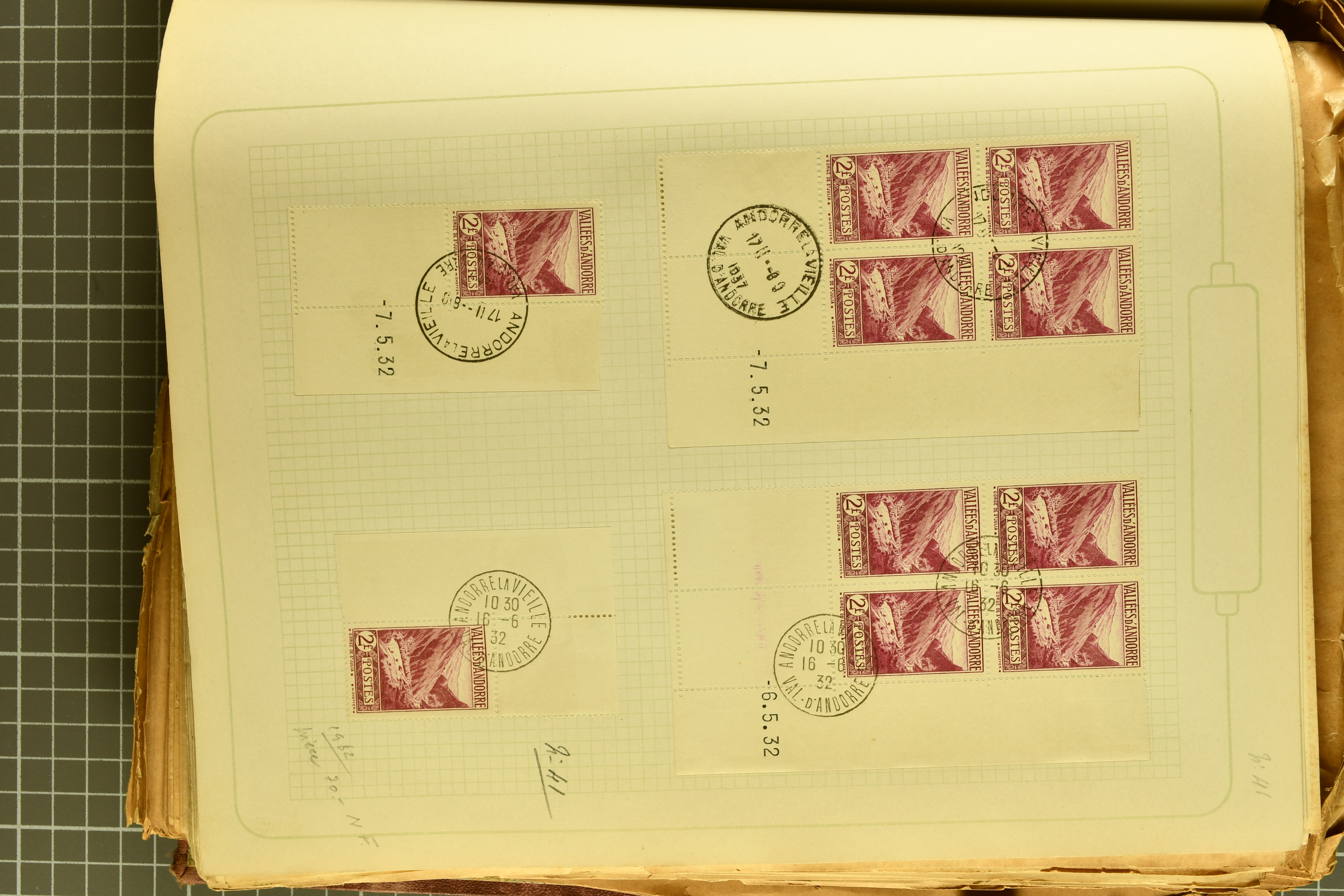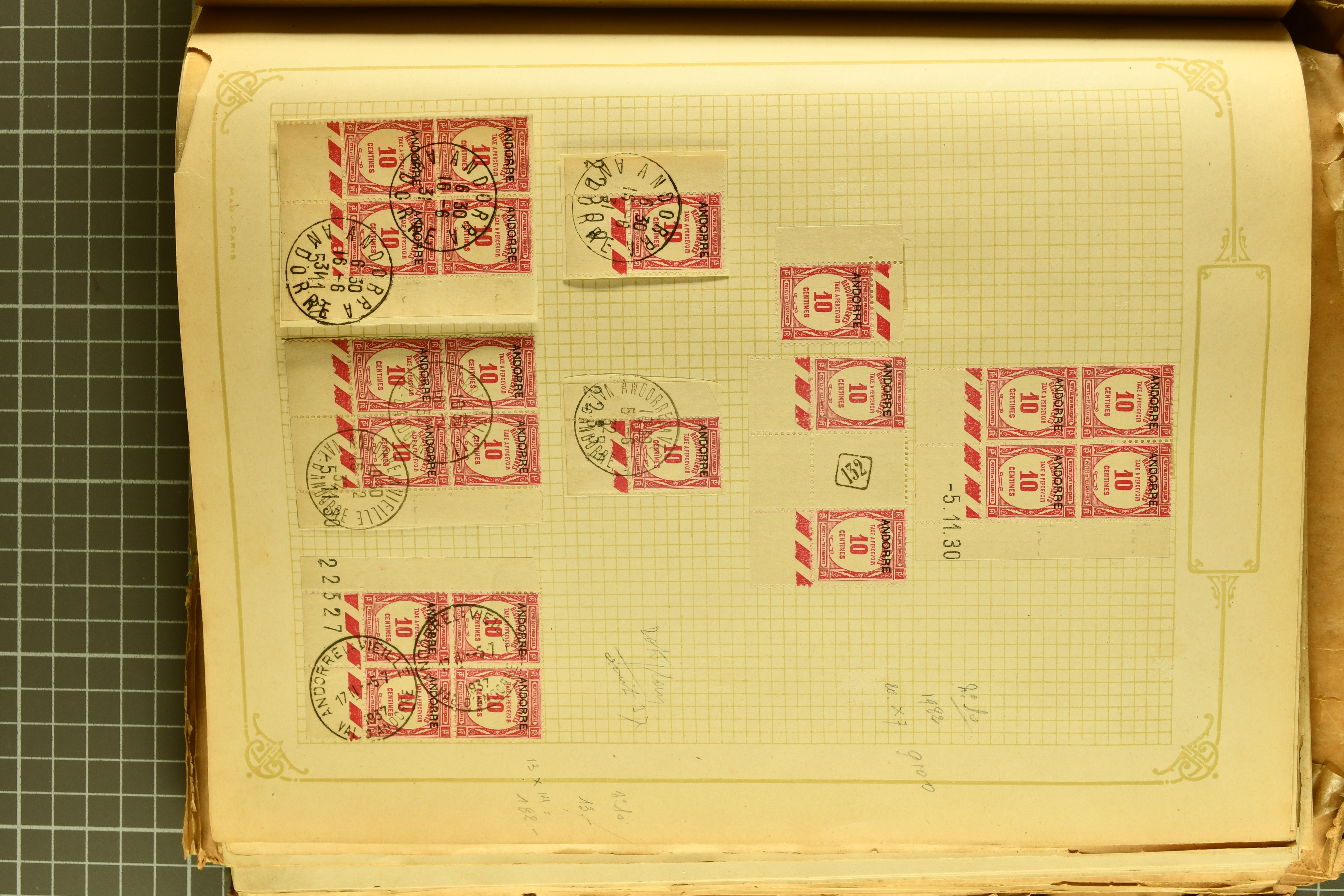1966 imageAndorra 1929/38: Age-old collection, somewhat moisture-affected, nevertheless of considerable substance. Includes the first set of French Andorra, present 10 times: arranged as 2 blocks of four and 2 singles, all on piece and all cancelled with first day postmarks. The same applies to the first two issues of postage due stamps but 15 per times. The second set of unoverprinted definitives is largely complete (a few low values missing), also present in multiples totalling 10 stamps in the same manner as the first set. The third set is contained unused; the stamps are affixed to the album pages and therefore not counted. Likewise, the unused postage due stamps and some surplus quantities have not been included in the total. Still, the catalogue value reaches € 24'800. Towards the end of the album are further postage dues and covers franked with postage dues (all covers from France), catalogue € 3'930 (prices only for used applied). Also present: the first issue of Spanish Andorra, in used pairs, and the following sets as singles on a paper leaf, catalogue €1'900. The unused Spanish issues are partly stuck and have not been counted; the 4 P. and 10 P. exist in blocks of four, with two stamps mounted and two unmounted each. In total, the collection reaches a catalogue value of €29'830++. Noteworthy are various specialities, e.g. blocks of four frequently from the lower sheet corners (Image 1) (Image 2) (Image 3) (Image 4) (Image 5) (Image 6) (Image 7) (Image 8) (Image 9) (Image 10) (Image 11) (Image 12) (Image 13) (Image 14) (Image 15) (Image 16) (Image 17) (Image 18) (Image 19) (Image 20) (Image 21) (Image 22) (Image 23) (Image 24) (Image 25) (Image 26) (Image 27) (Image 28) (Image 29) (Image 30) (Image 31) (Image 32) (Image 33) (Image 34) (Image 35) (Image 36) (Image 37) (Image 38) (Image 39) (Image 40) (Image 41) (Image 42) (Image 43) (Image 44) (Image 45) (Image 46) (Image 47) (Image 48) (Image 49) (Image 50)