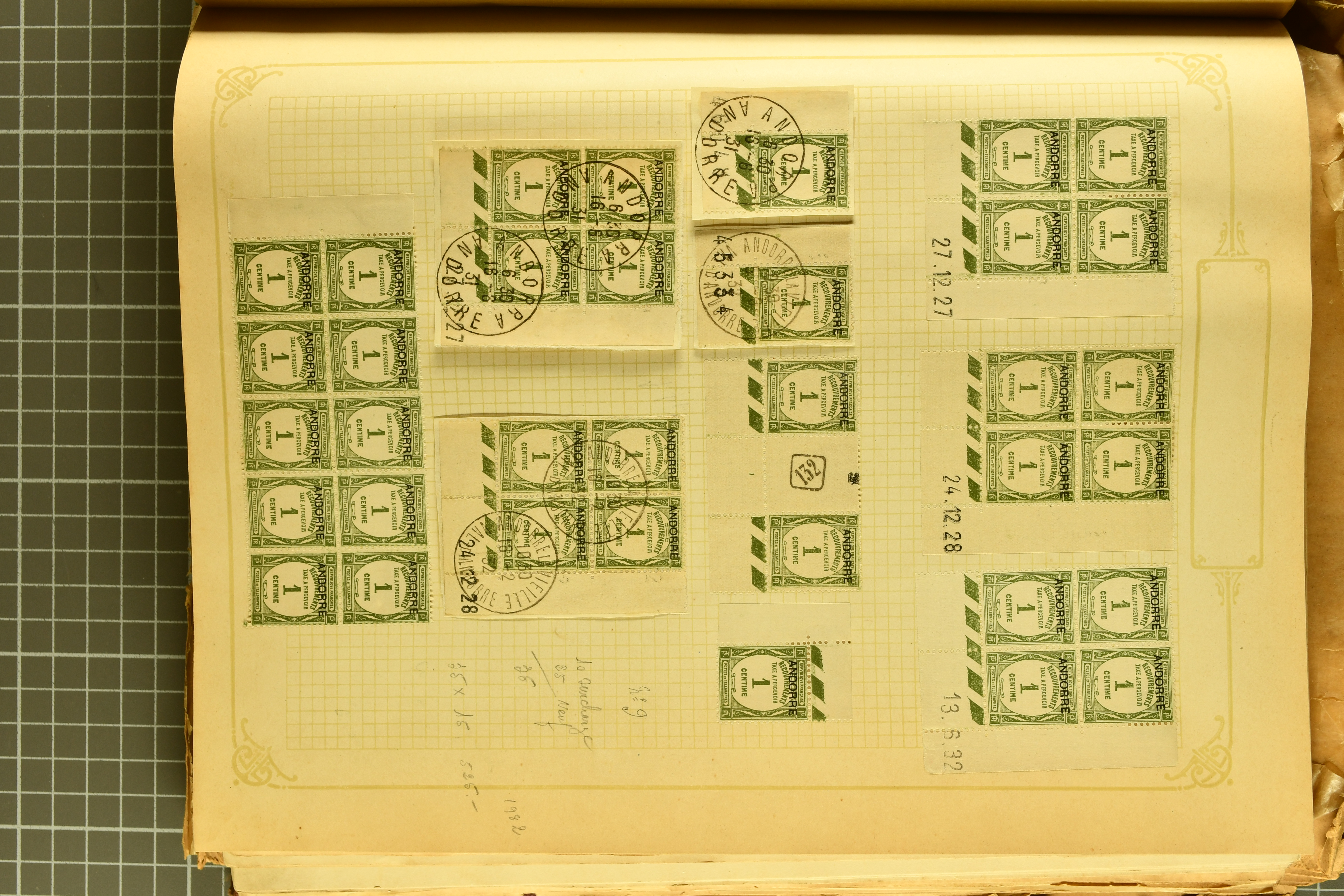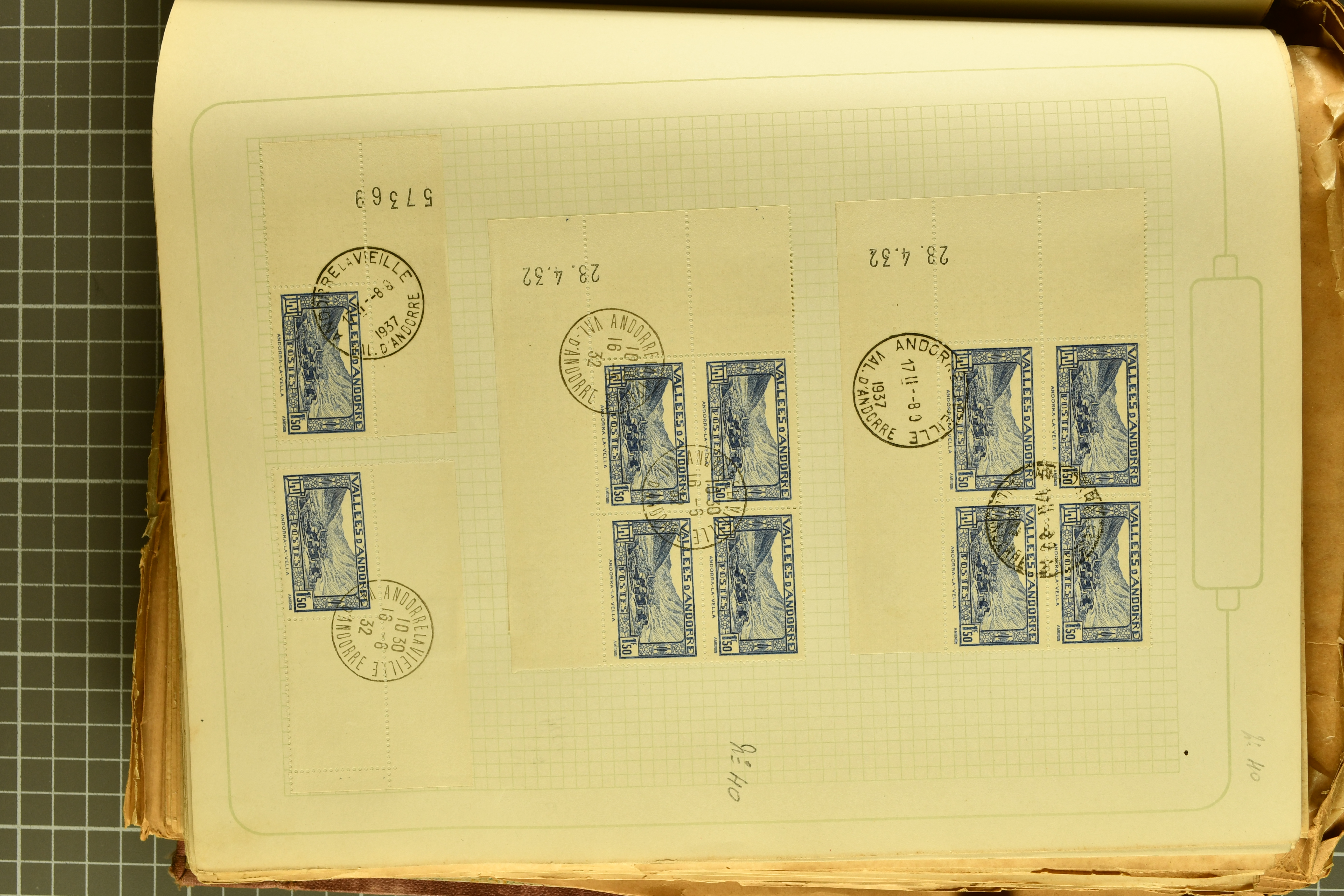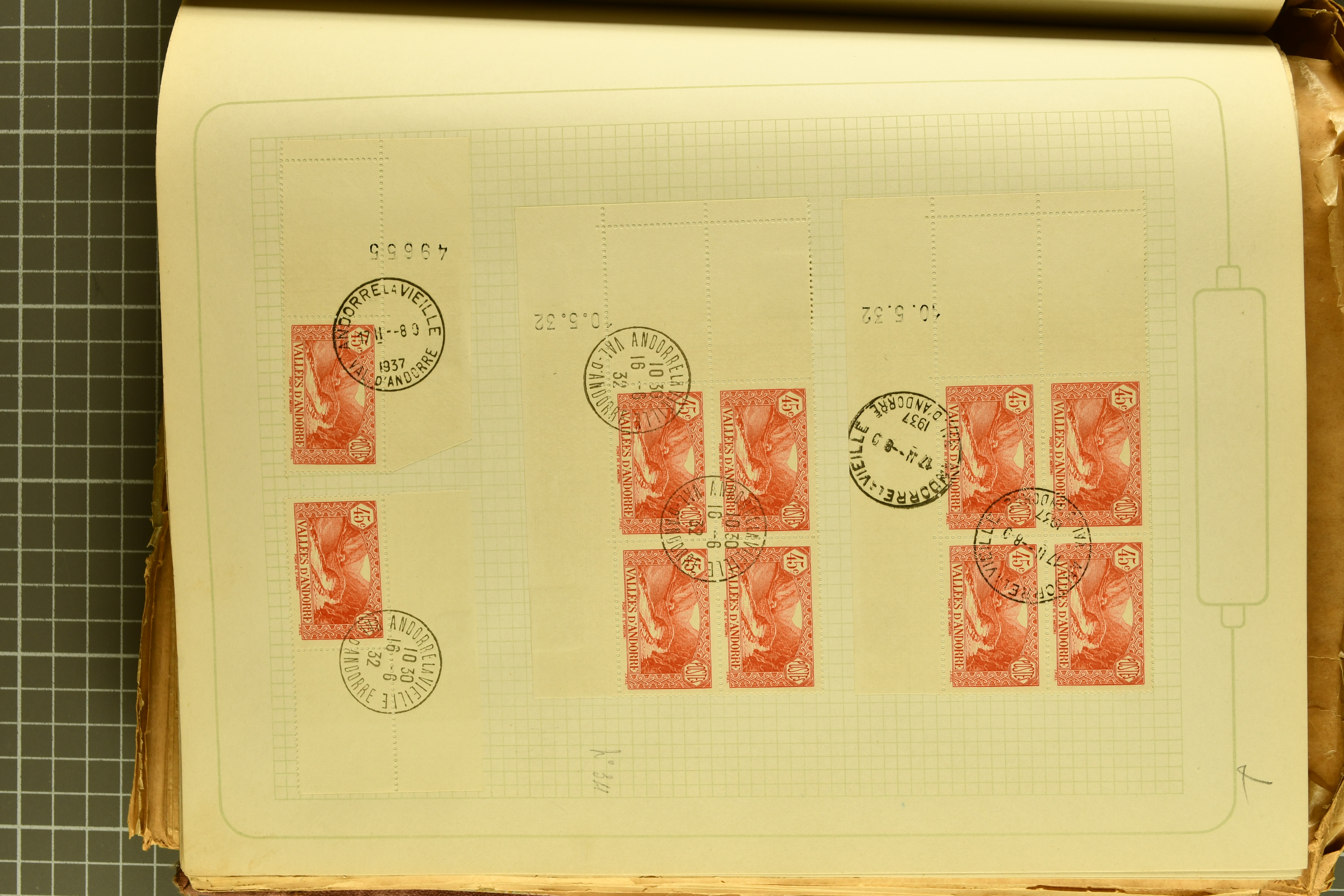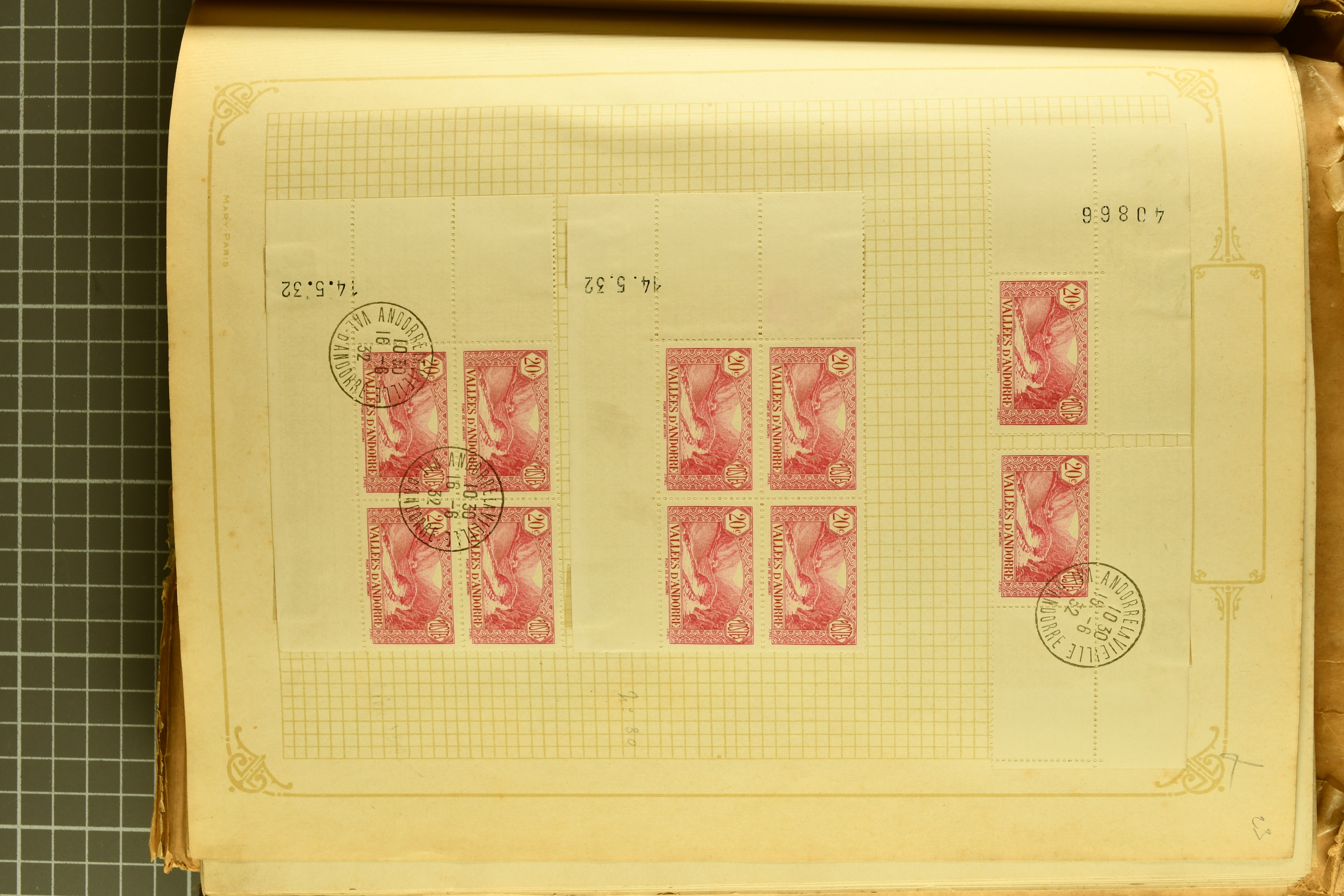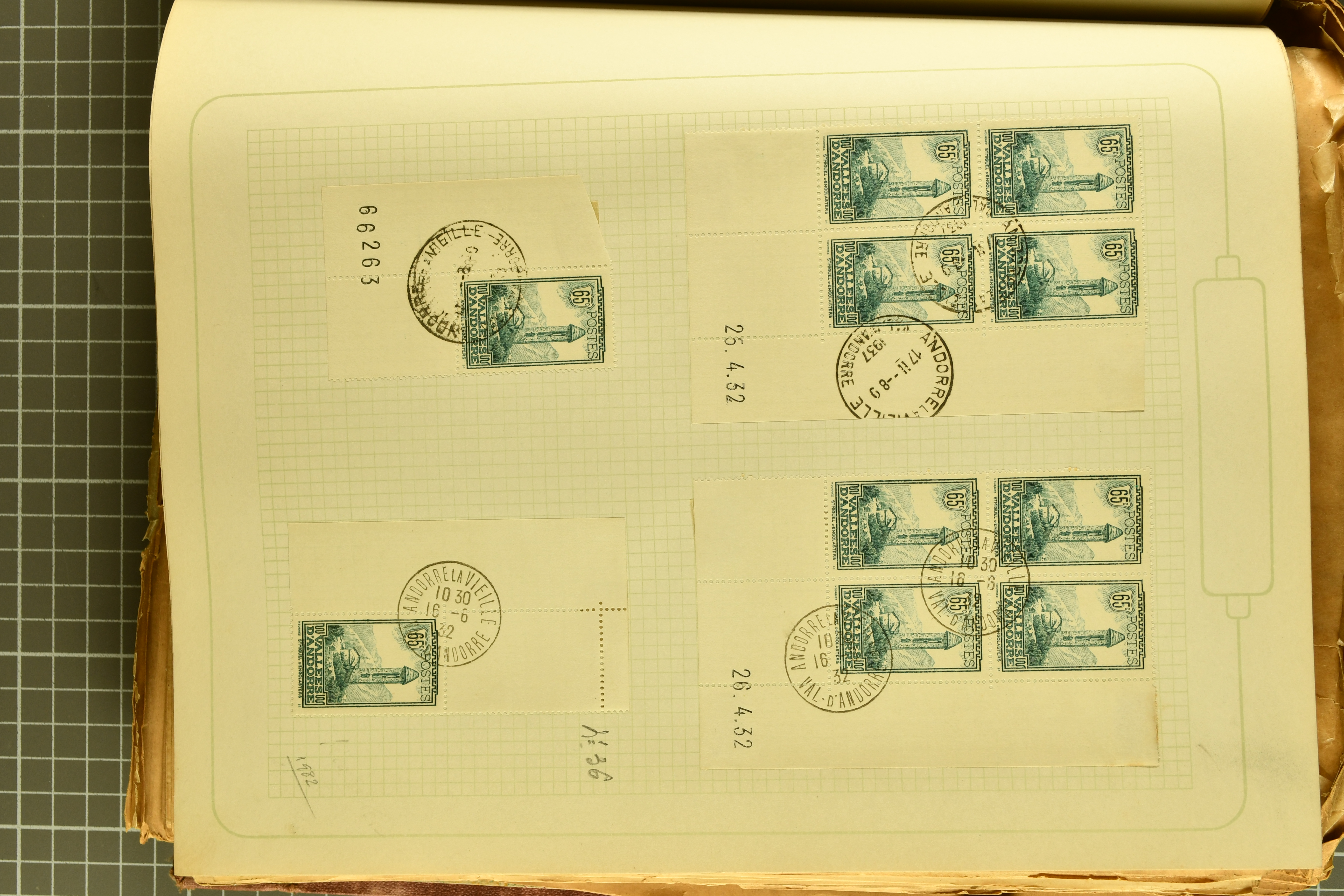 1966 imageAndorra 1929/38: Age-old collection, somewhat moisture-affected, nevertheless of considerable substance. Includes the first set of French Andorra, present 10 times: arranged as 2 blocks of four and 2 singles, all on piece and all cancelled with first day postmarks. The same applies to the first two issues of postage due stamps but 15 per times. The second set of unoverprinted definitives is largely complete (a few low values missing), also present in multiples totalling 10 stamps in the same manner as the first set. The third set is contained unused; the stamps are affixed to the album pages and therefore not counted. Likewise, the unused postage due stamps and some surplus quantities have not been included in the total. Still, the catalogue value reaches € 24'800. Towards the end of the album are further postage dues and covers franked with postage dues (all covers from France), catalogue € 3'930 (prices only for used applied). Also present: the first issue of Spanish Andorra, in used pairs, and the following sets as singles on a paper leaf, catalogue €1'900. The unused Spanish issues are partly stuck and have not been counted; the 4 P. and 10 P. exist in blocks of four, with two stamps mounted and two unmounted each. In total, the collection reaches a catalogue value of €29'830++. Noteworthy are various specialities, e.g. blocks of four frequently from the lower sheet corners (Image 1) (Image 2) (Image 3) (Image 4) (Image 5) (Image 6) (Image 7) (Image 8) (Image 9) (Image 10) (Image 11) (Image 12) (Image 13) (Image 14) (Image 15) (Image 16) (Image 17) (Image 18) (Image 19) (Image 20) (Image 21) (Image 22) (Image 23) (Image 24) (Image 25) (Image 26) (Image 27) (Image 28) (Image 29) (Image 30) (Image 31) (Image 32) (Image 33) (Image 34) (Image 35) (Image 36) (Image 37) (Image 38) (Image 39) (Image 40) (Image 41) (Image 42) (Image 43) (Image 44) (Image 45) (Image 46) (Image 47) (Image 48) (Image 49) (Image 50)