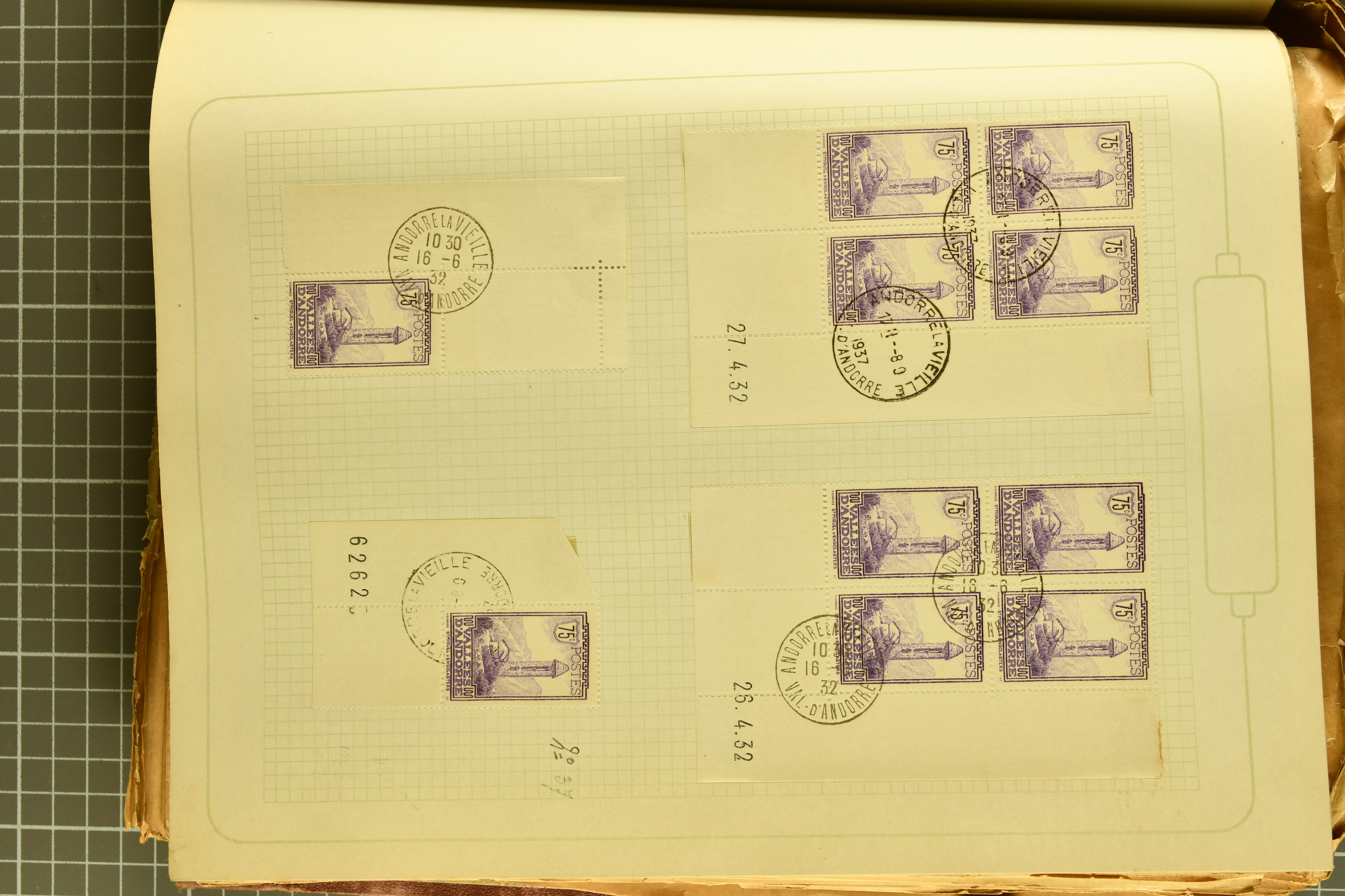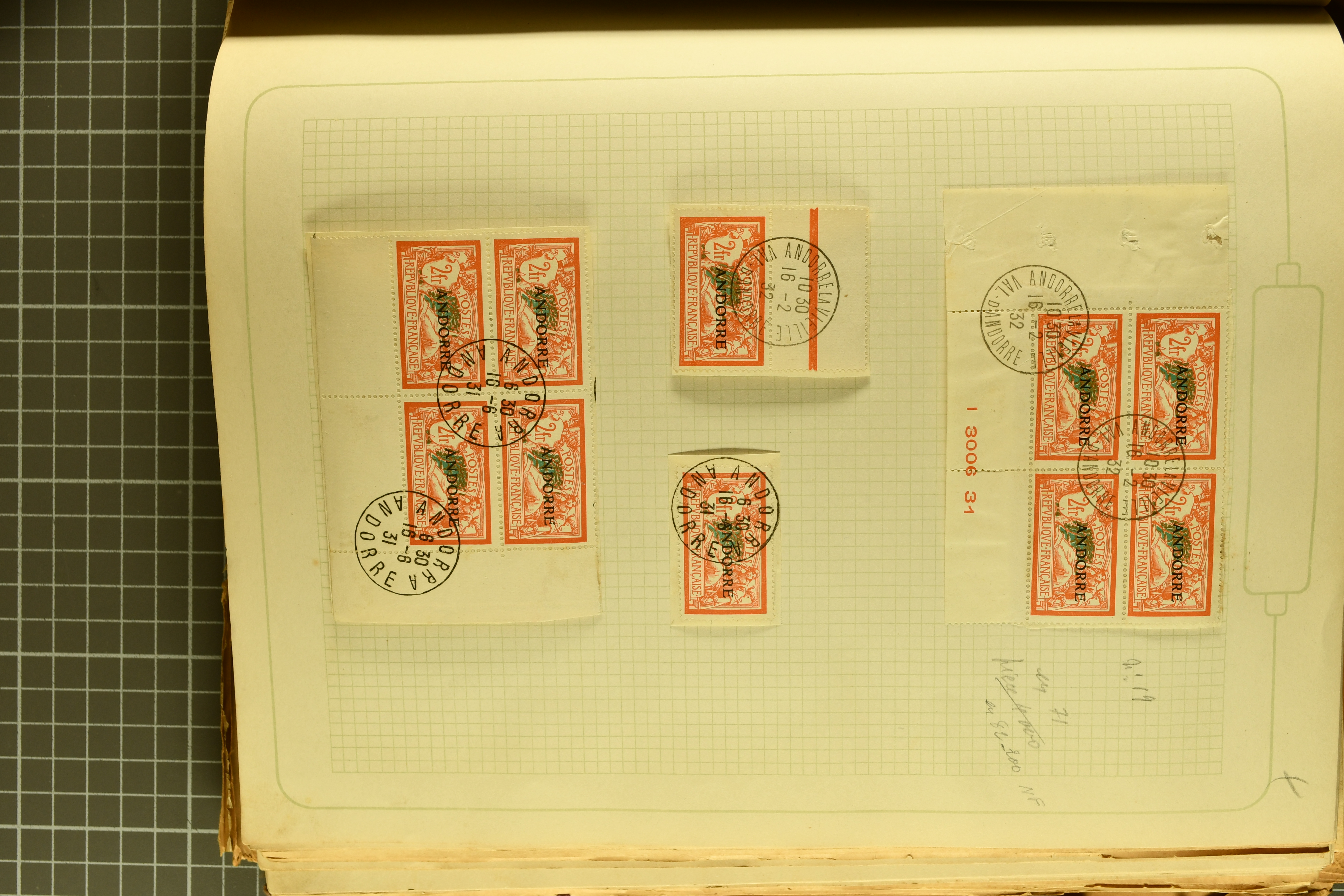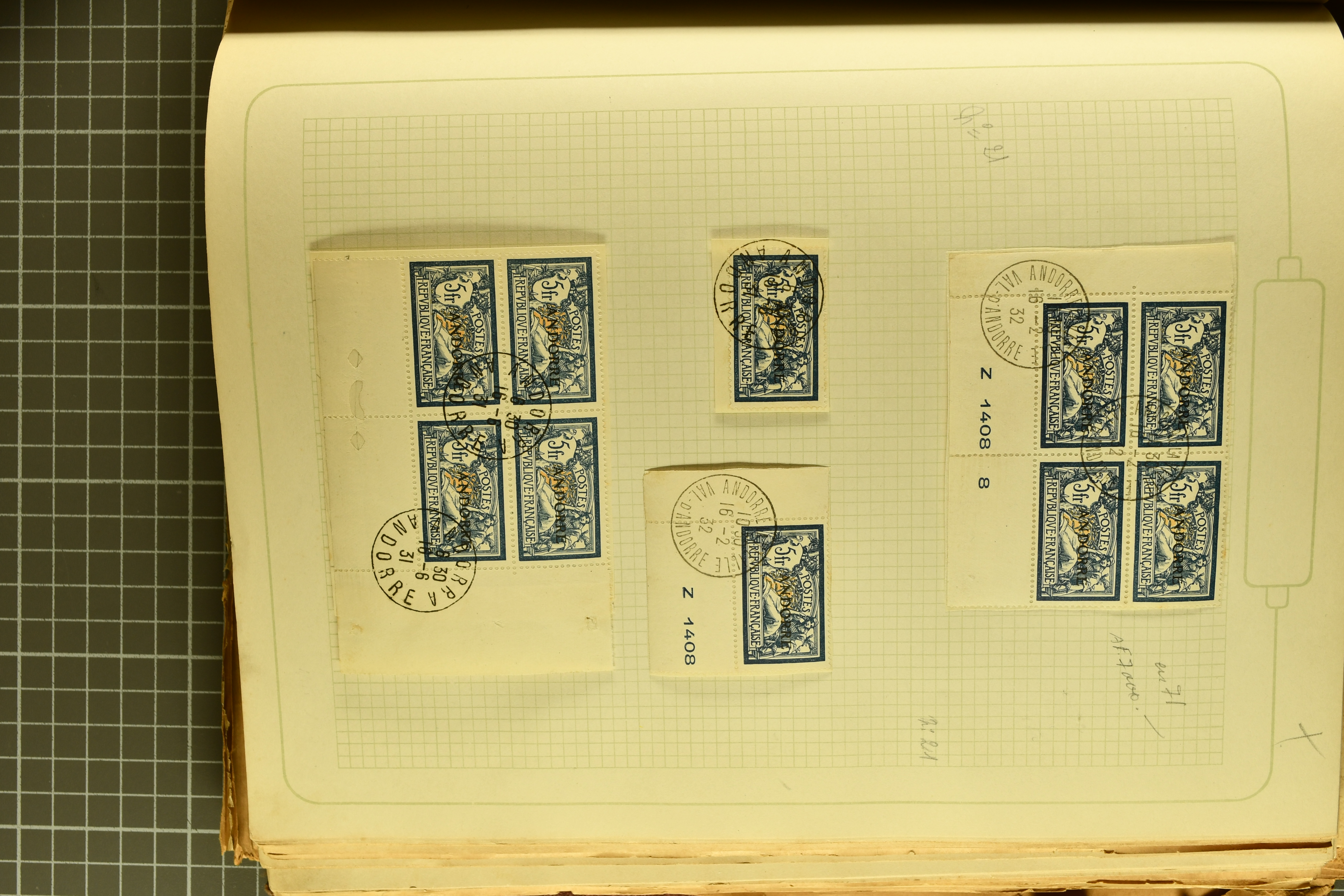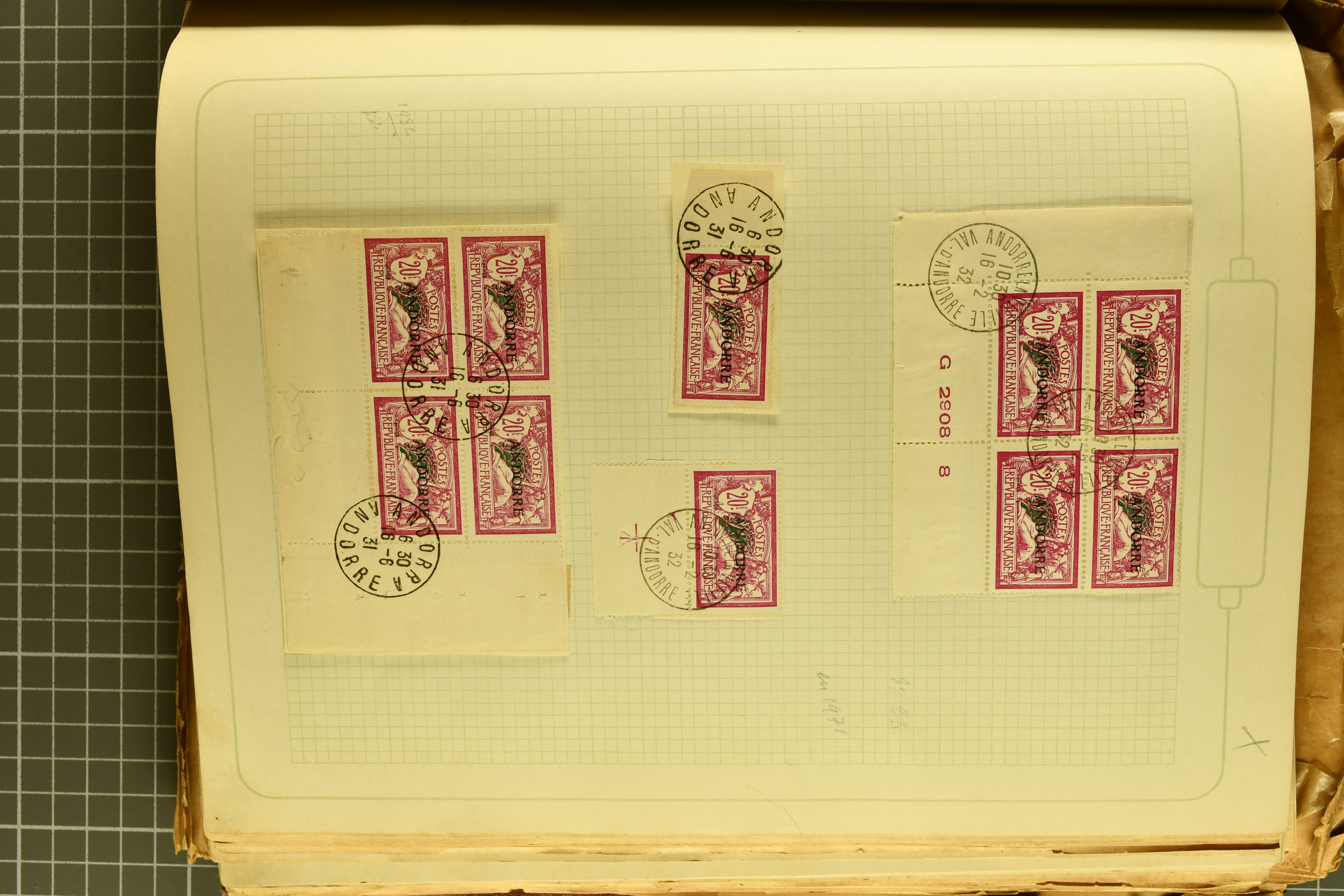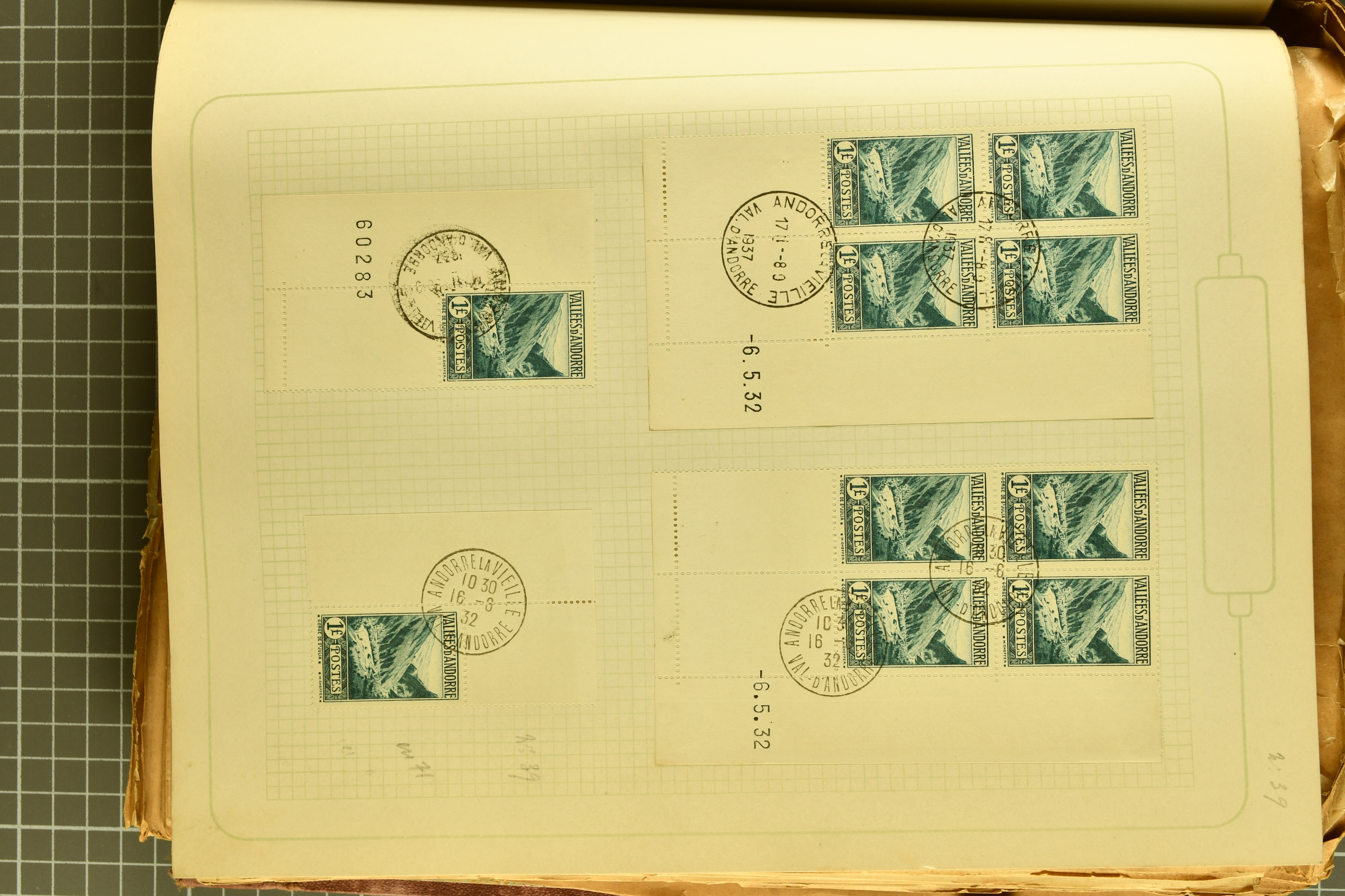 1966 imageAndorra 1929/38: Age-old collection, somewhat moisture-affected, nevertheless of considerable substance. Includes the first set of French Andorra, present 10 times: arranged as 2 blocks of four and 2 singles, all on piece and all cancelled with first day postmarks. The same applies to the first two issues of postage due stamps but 15 per times. The second set of unoverprinted definitives is largely complete (a few low values missing), also present in multiples totalling 10 stamps in the same manner as the first set. The third set is contained unused; the stamps are affixed to the album pages and therefore not counted. Likewise, the unused postage due stamps and some surplus quantities have not been included in the total. Still, the catalogue value reaches € 24'800. Towards the end of the album are further postage dues and covers franked with postage dues (all covers from France), catalogue € 3'930 (prices only for used applied). Also present: the first issue of Spanish Andorra, in used pairs, and the following sets as singles on a paper leaf, catalogue €1'900. The unused Spanish issues are partly stuck and have not been counted; the 4 P. and 10 P. exist in blocks of four, with two stamps mounted and two unmounted each. In total, the collection reaches a catalogue value of €29'830++. Noteworthy are various specialities, e.g. blocks of four frequently from the lower sheet corners (Image 1) (Image 2) (Image 3) (Image 4) (Image 5) (Image 6) (Image 7) (Image 8) (Image 9) (Image 10) (Image 11) (Image 12) (Image 13) (Image 14) (Image 15) (Image 16) (Image 17) (Image 18) (Image 19) (Image 20) (Image 21) (Image 22) (Image 23) (Image 24) (Image 25) (Image 26) (Image 27) (Image 28) (Image 29) (Image 30) (Image 31) (Image 32) (Image 33) (Image 34) (Image 35) (Image 36) (Image 37) (Image 38) (Image 39) (Image 40) (Image 41) (Image 42) (Image 43) (Image 44) (Image 45) (Image 46) (Image 47) (Image 48) (Image 49) (Image 50)