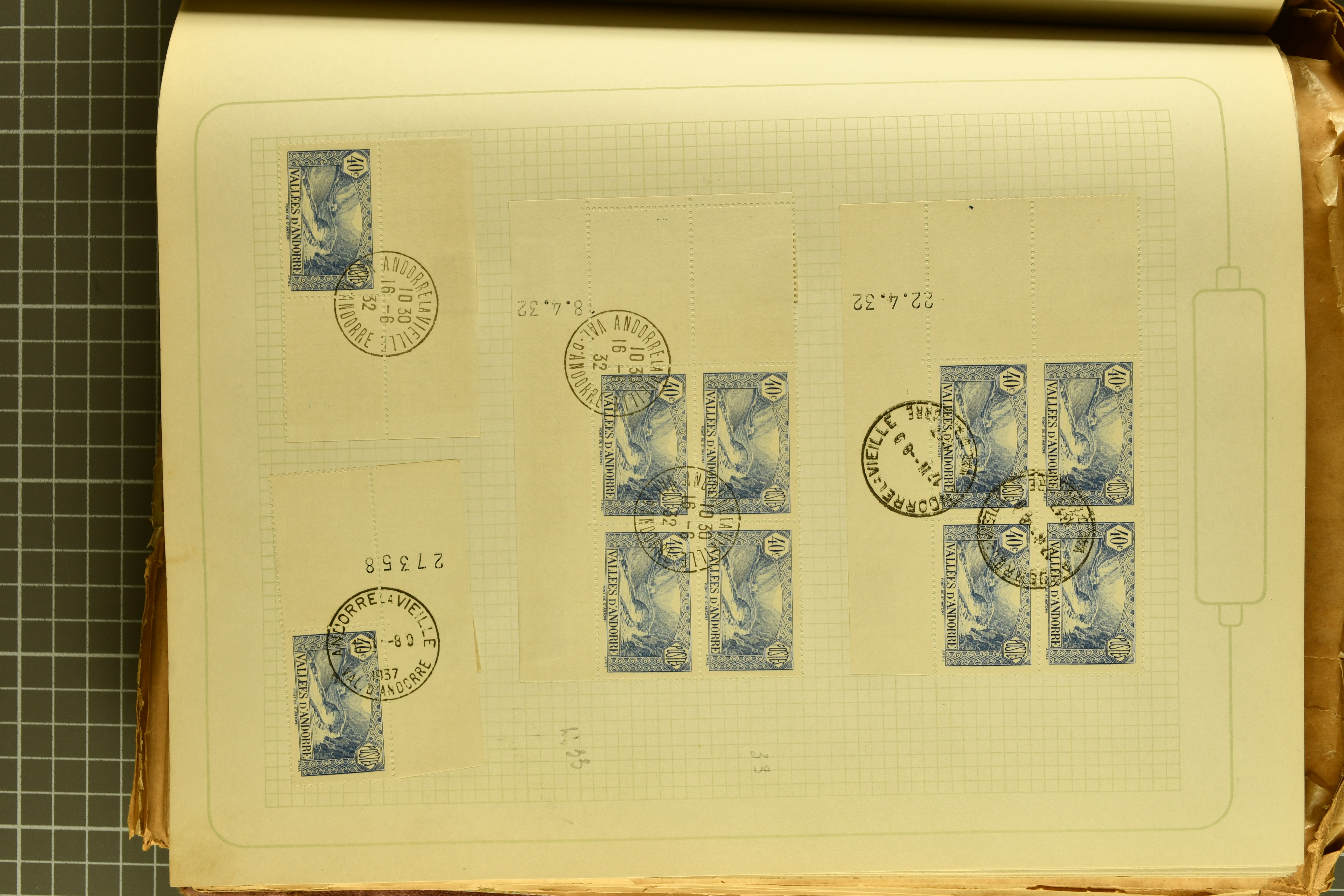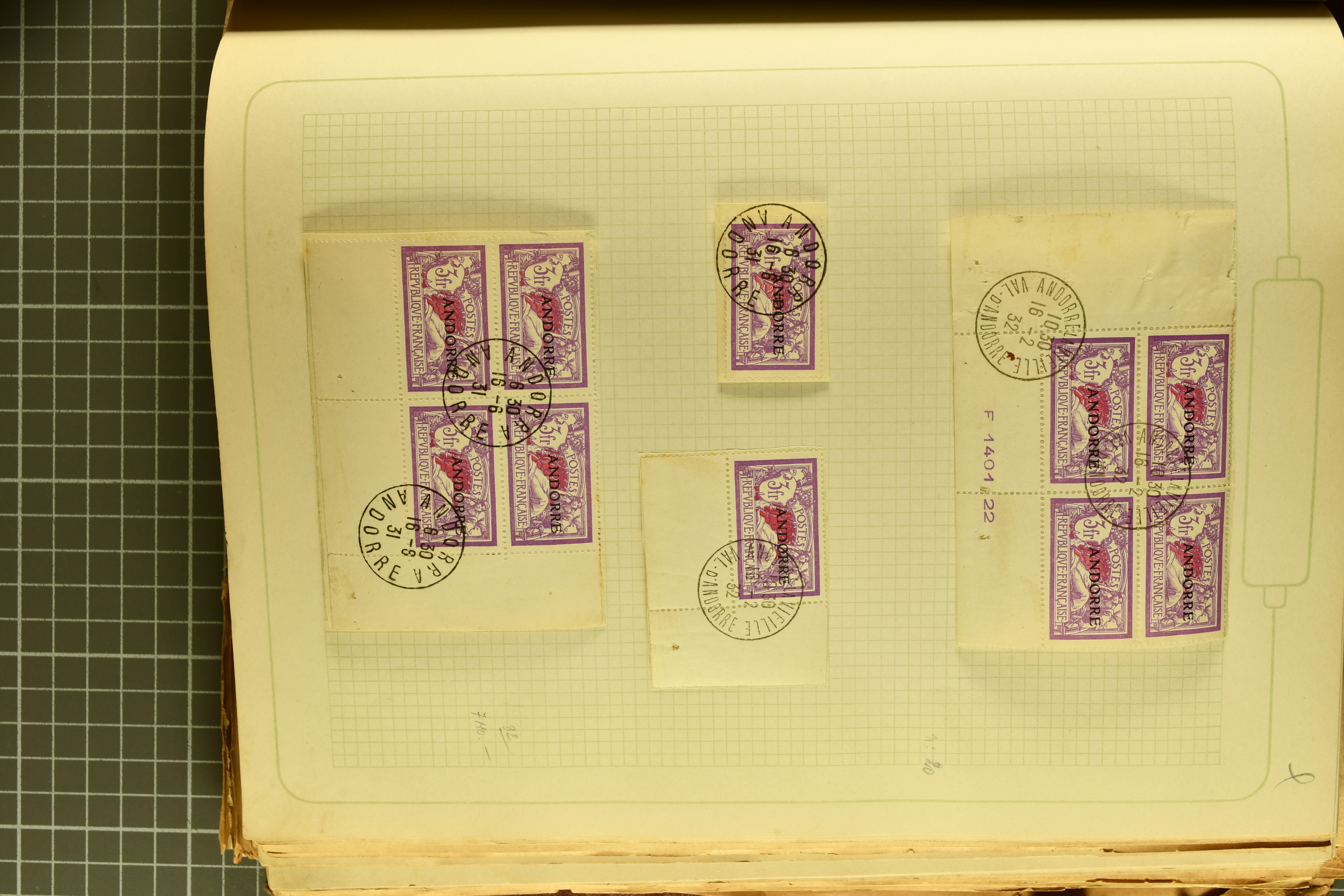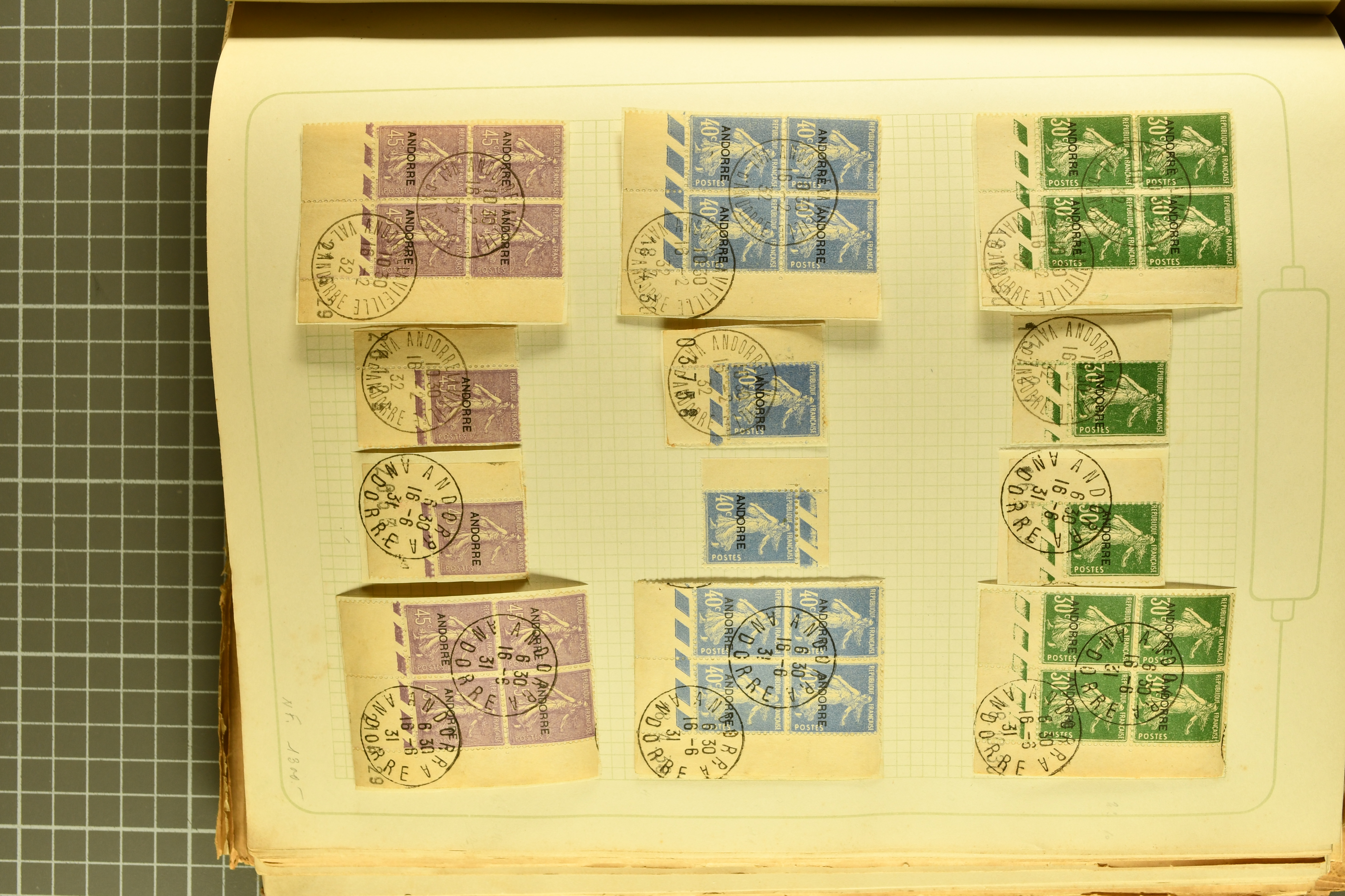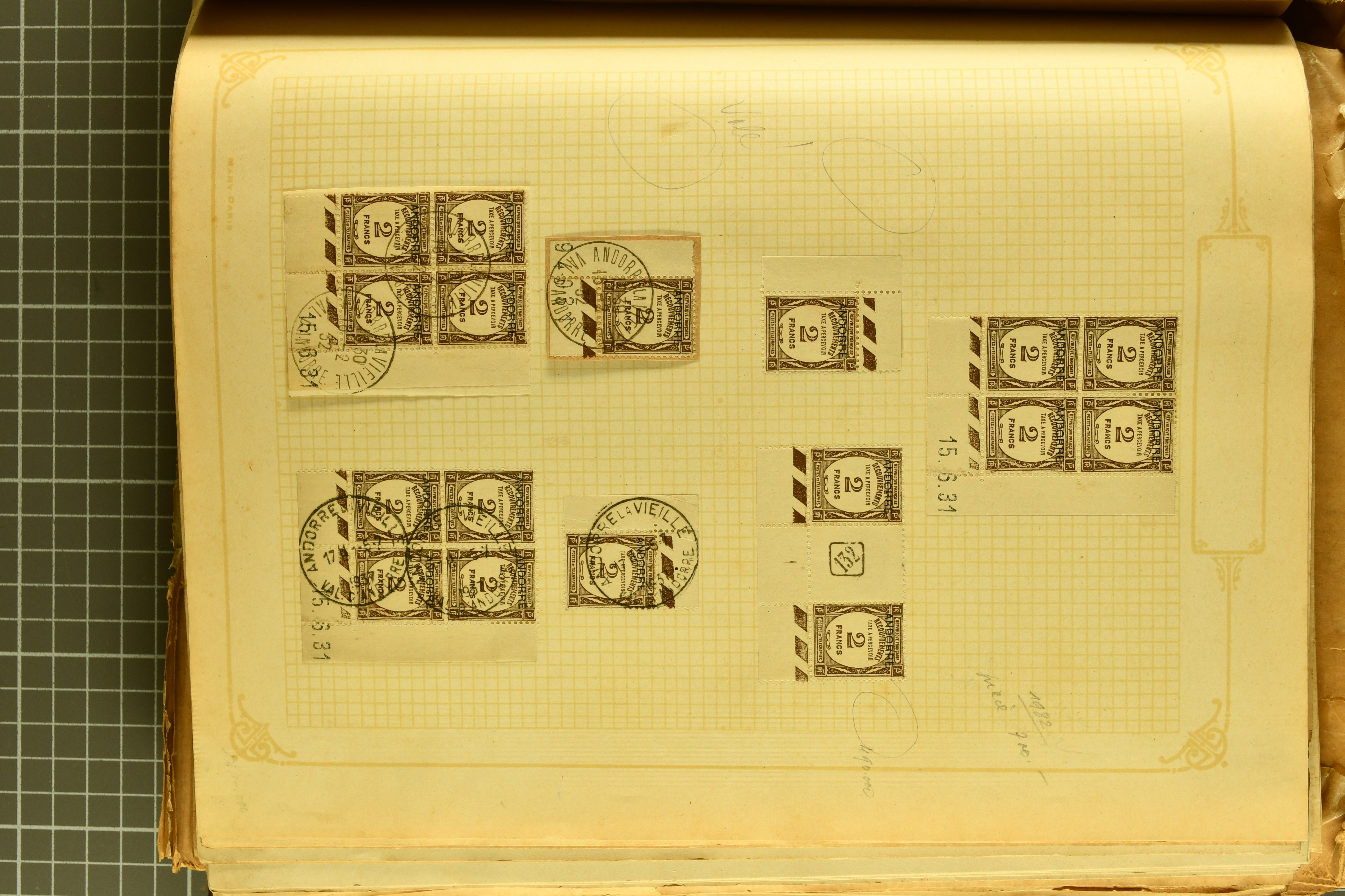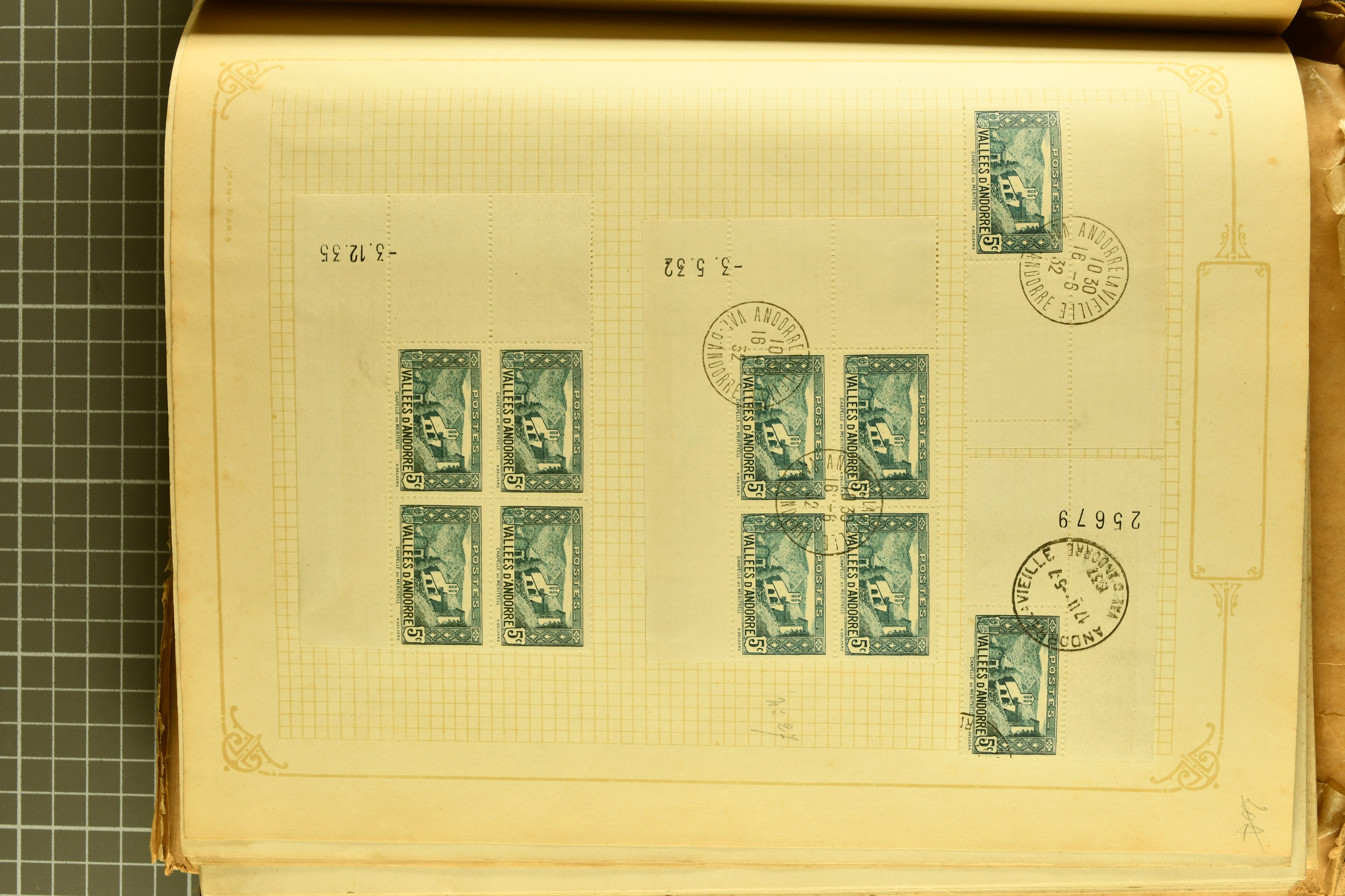 1966 imageAndorra 1929/38: Age-old collection, somewhat moisture-affected, nevertheless of considerable substance. Includes the first set of French Andorra, present 10 times: arranged as 2 blocks of four and 2 singles, all on piece and all cancelled with first day postmarks. The same applies to the first two issues of postage due stamps but 15 per times. The second set of unoverprinted definitives is largely complete (a few low values missing), also present in multiples totalling 10 stamps in the same manner as the first set. The third set is contained unused; the stamps are affixed to the album pages and therefore not counted. Likewise, the unused postage due stamps and some surplus quantities have not been included in the total. Still, the catalogue value reaches € 24'800. Towards the end of the album are further postage dues and covers franked with postage dues (all covers from France), catalogue € 3'930 (prices only for used applied). Also present: the first issue of Spanish Andorra, in used pairs, and the following sets as singles on a paper leaf, catalogue €1'900. The unused Spanish issues are partly stuck and have not been counted; the 4 P. and 10 P. exist in blocks of four, with two stamps mounted and two unmounted each. In total, the collection reaches a catalogue value of €29'830++. Noteworthy are various specialities, e.g. blocks of four frequently from the lower sheet corners (Image 1) (Image 2) (Image 3) (Image 4) (Image 5) (Image 6) (Image 7) (Image 8) (Image 9) (Image 10) (Image 11) (Image 12) (Image 13) (Image 14) (Image 15) (Image 16) (Image 17) (Image 18) (Image 19) (Image 20) (Image 21) (Image 22) (Image 23) (Image 24) (Image 25) (Image 26) (Image 27) (Image 28) (Image 29) (Image 30) (Image 31) (Image 32) (Image 33) (Image 34) (Image 35) (Image 36) (Image 37) (Image 38) (Image 39) (Image 40) (Image 41) (Image 42) (Image 43) (Image 44) (Image 45) (Image 46) (Image 47) (Image 48) (Image 49) (Image 50)