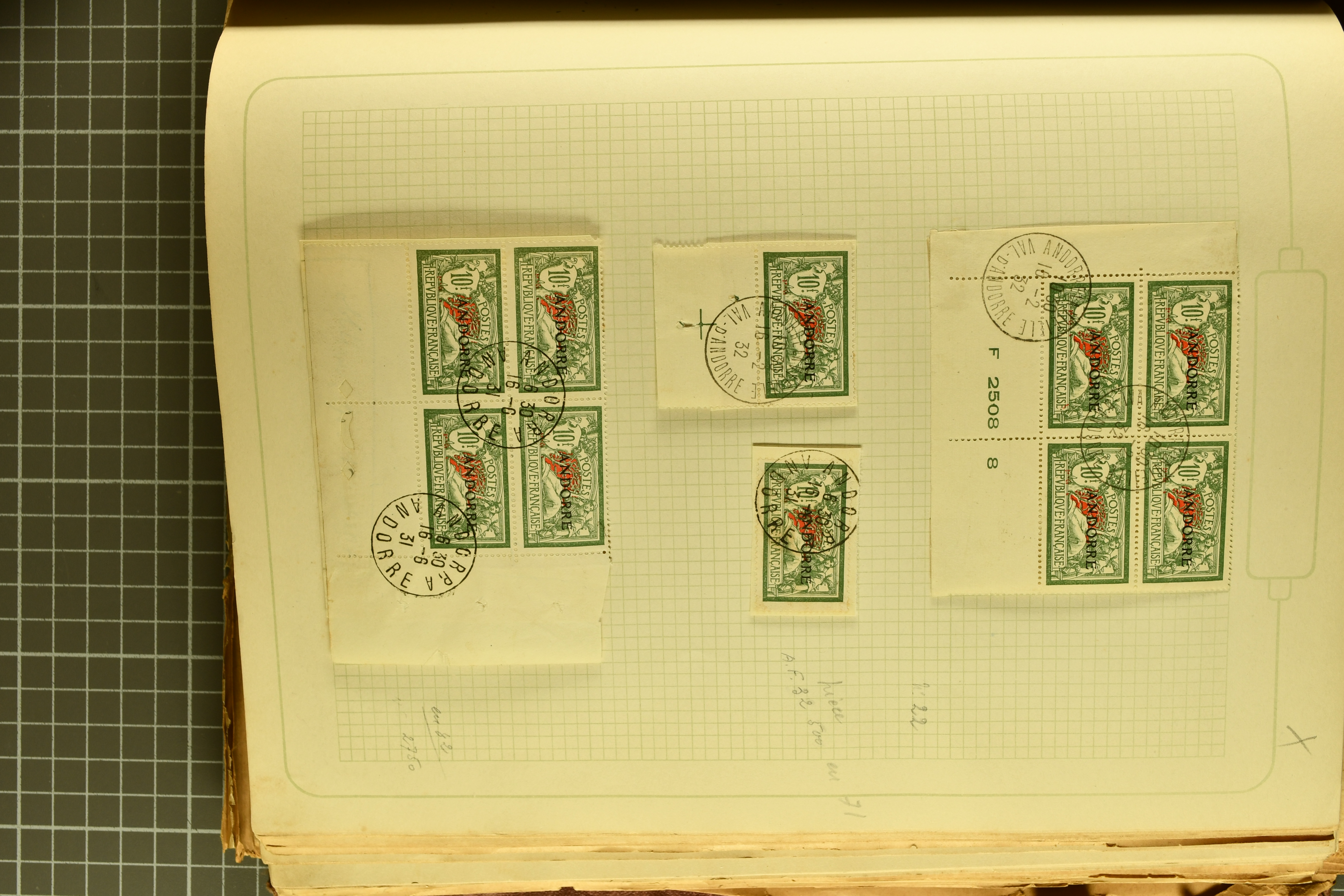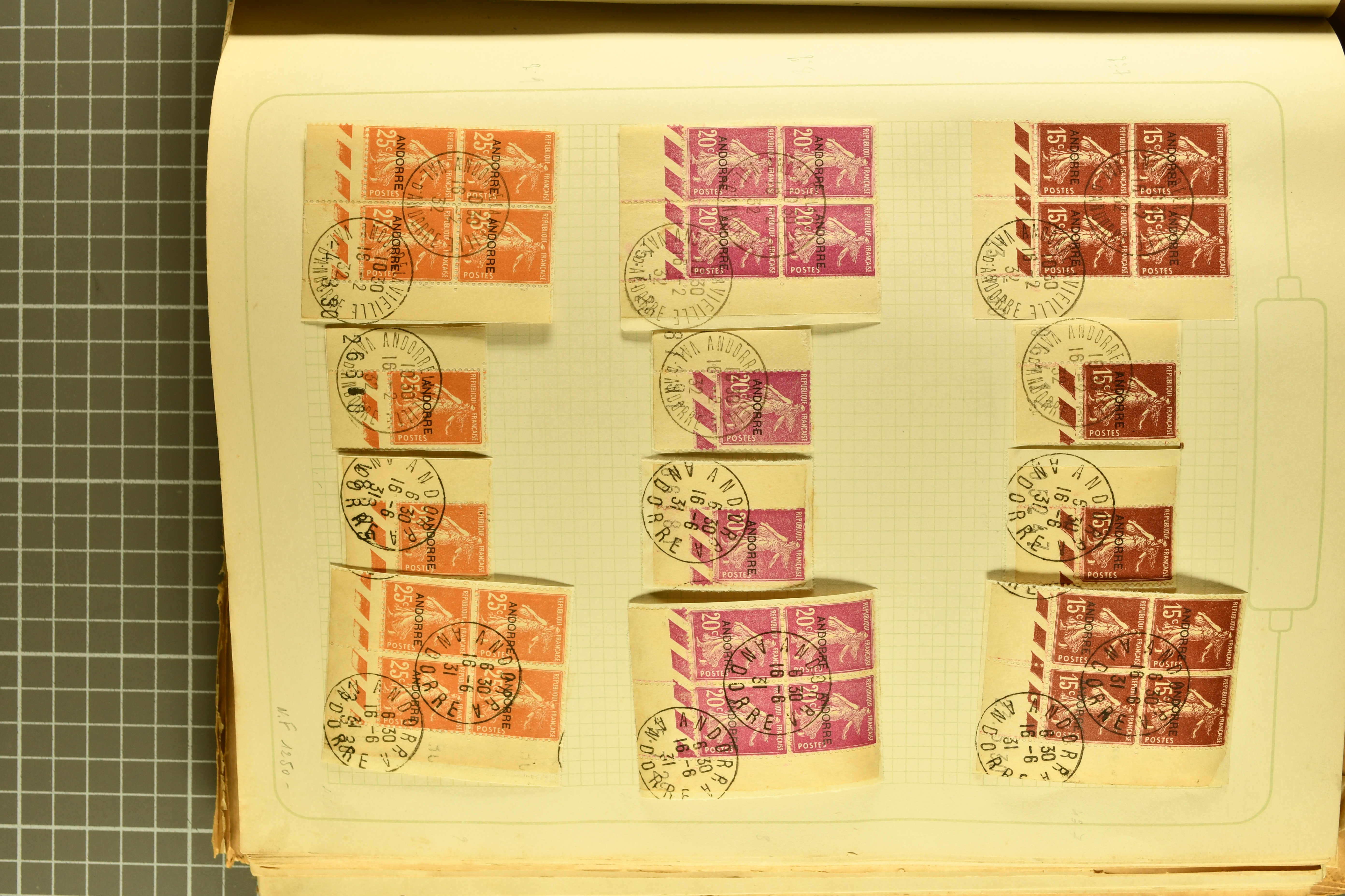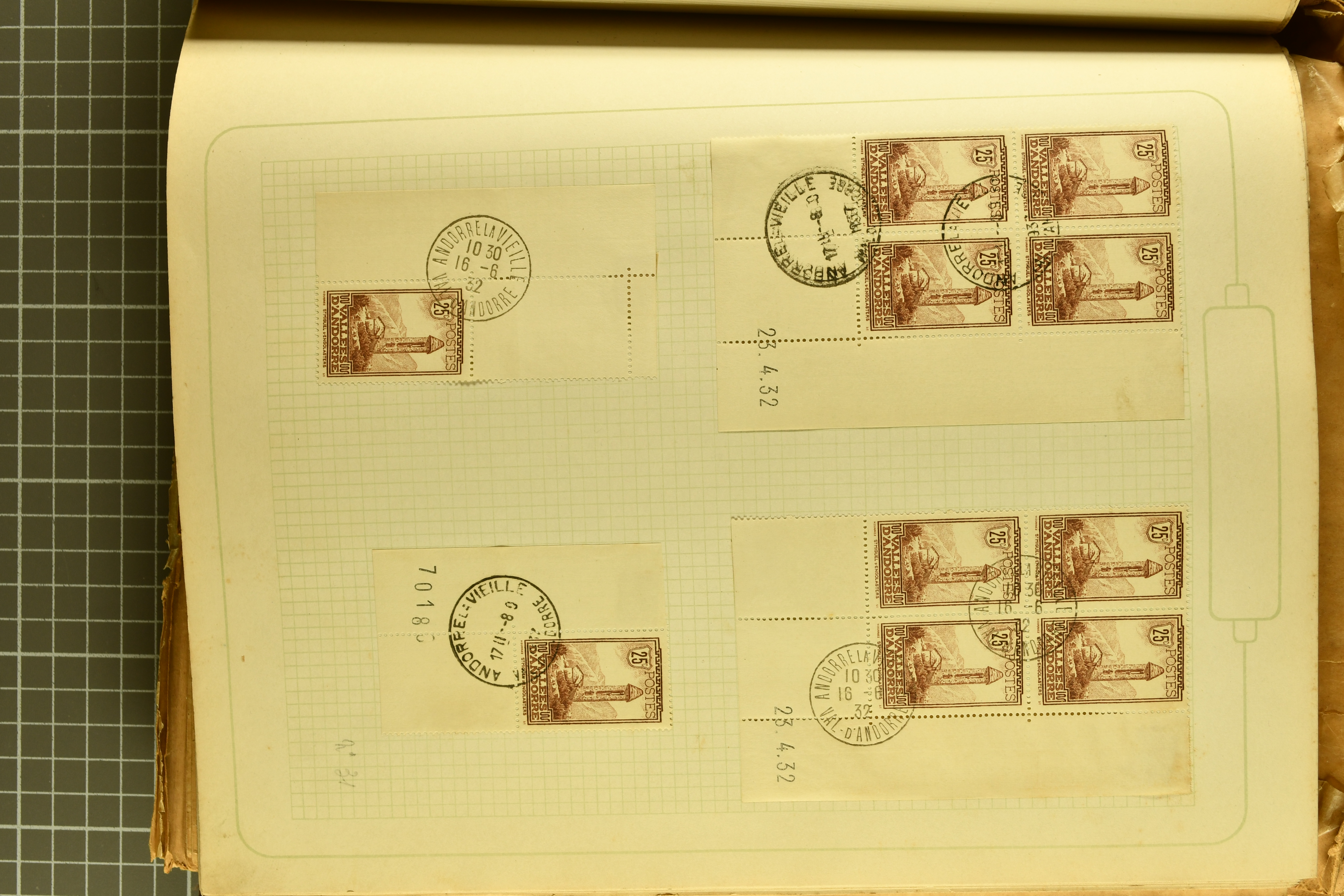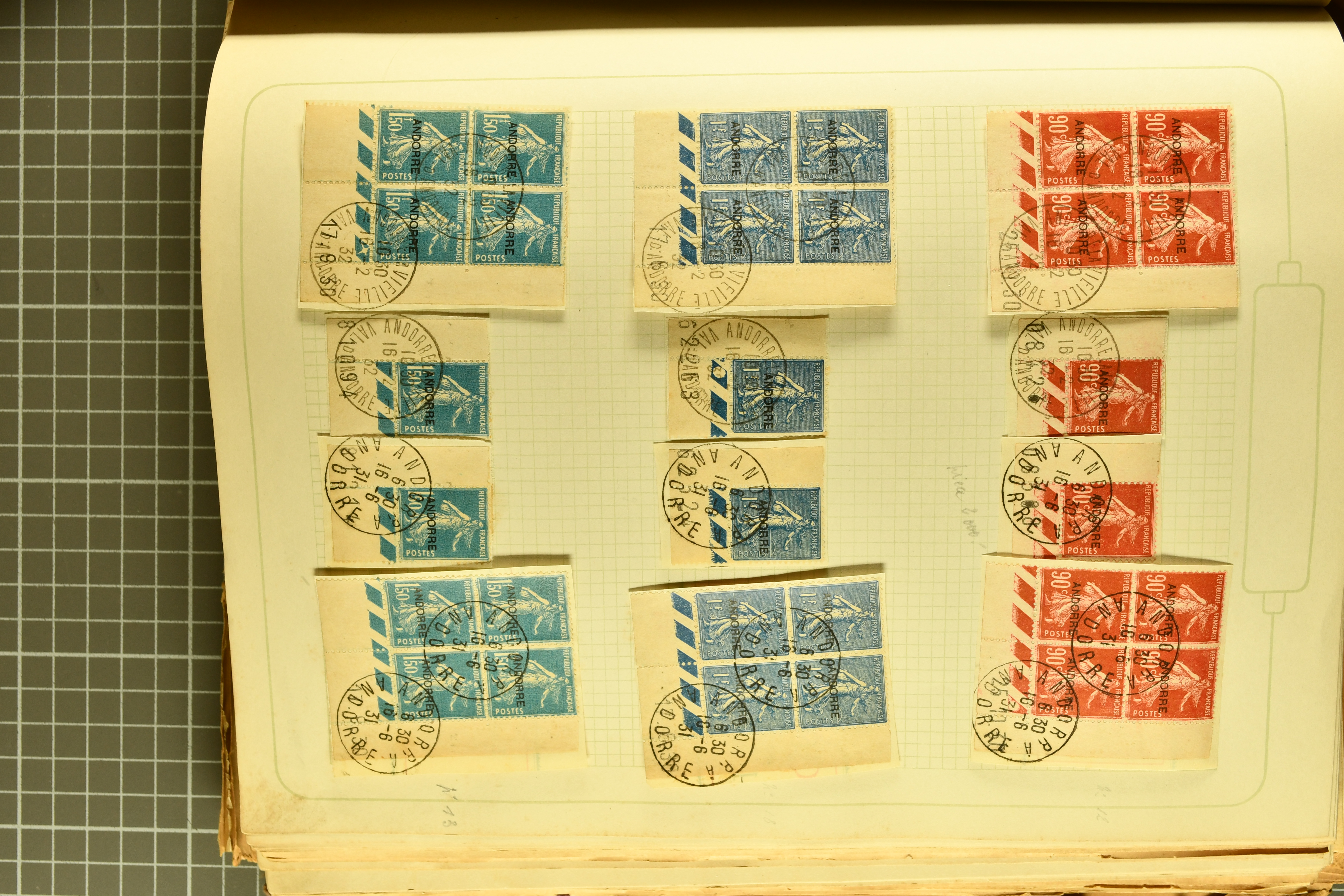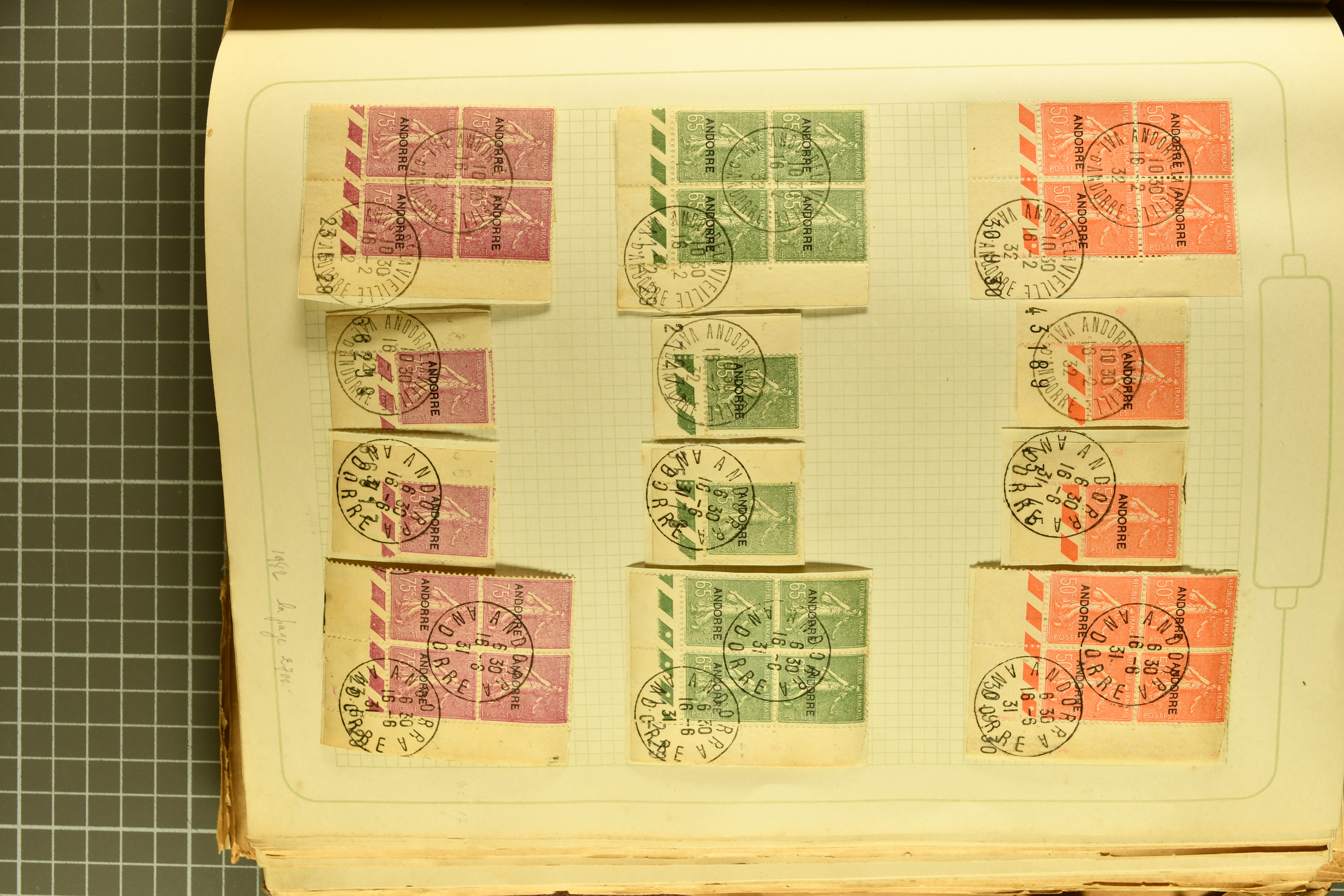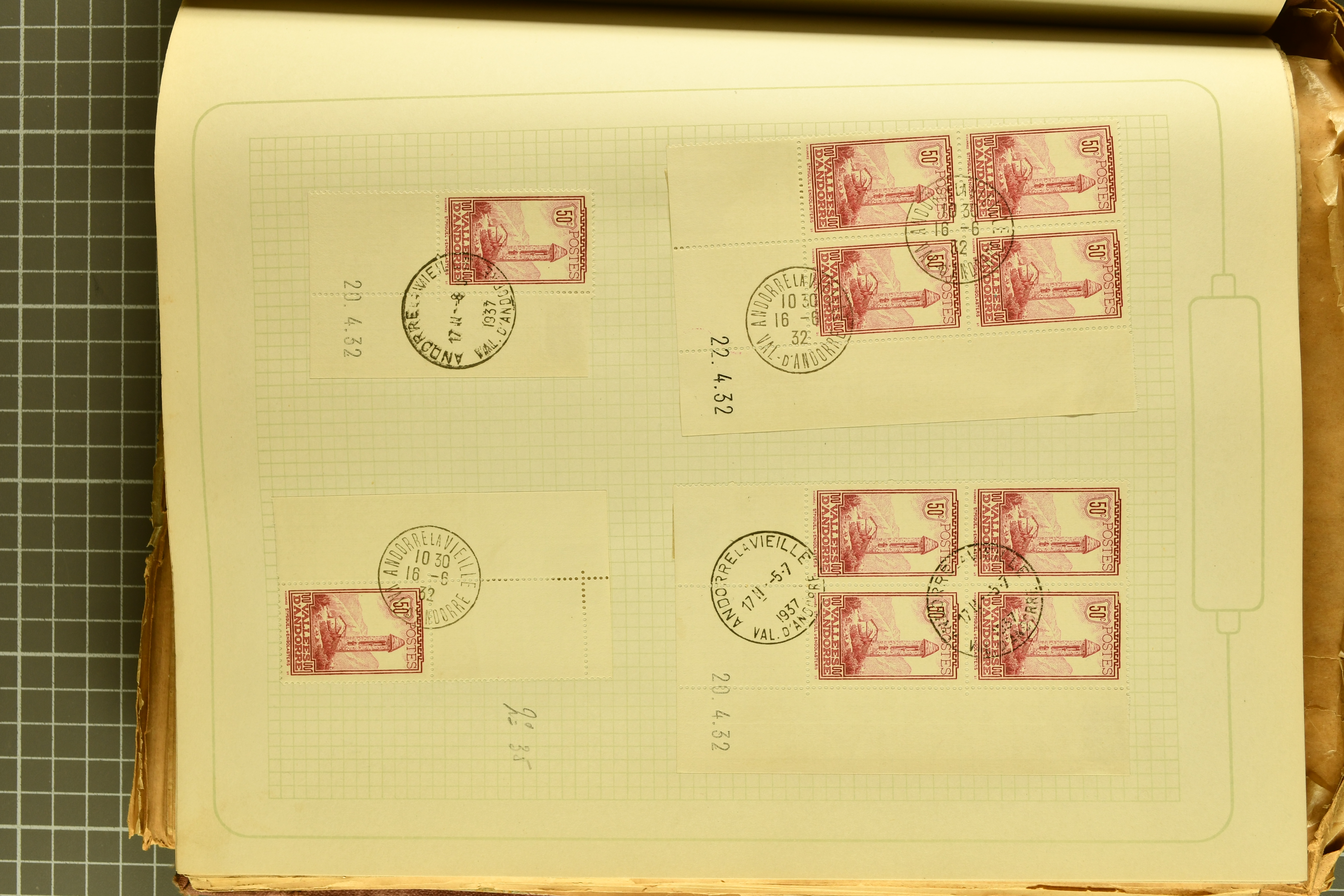 1966 imageAndorra 1929/38: Age-old collection, somewhat moisture-affected, nevertheless of considerable substance. Includes the first set of French Andorra, present 10 times: arranged as 2 blocks of four and 2 singles, all on piece and all cancelled with first day postmarks. The same applies to the first two issues of postage due stamps but 15 per times. The second set of unoverprinted definitives is largely complete (a few low values missing), also present in multiples totalling 10 stamps in the same manner as the first set. The third set is contained unused; the stamps are affixed to the album pages and therefore not counted. Likewise, the unused postage due stamps and some surplus quantities have not been included in the total. Still, the catalogue value reaches € 24'800. Towards the end of the album are further postage dues and covers franked with postage dues (all covers from France), catalogue € 3'930 (prices only for used applied). Also present: the first issue of Spanish Andorra, in used pairs, and the following sets as singles on a paper leaf, catalogue €1'900. The unused Spanish issues are partly stuck and have not been counted; the 4 P. and 10 P. exist in blocks of four, with two stamps mounted and two unmounted each. In total, the collection reaches a catalogue value of €29'830++. Noteworthy are various specialities, e.g. blocks of four frequently from the lower sheet corners (Image 1) (Image 2) (Image 3) (Image 4) (Image 5) (Image 6) (Image 7) (Image 8) (Image 9) (Image 10) (Image 11) (Image 12) (Image 13) (Image 14) (Image 15) (Image 16) (Image 17) (Image 18) (Image 19) (Image 20) (Image 21) (Image 22) (Image 23) (Image 24) (Image 25) (Image 26) (Image 27) (Image 28) (Image 29) (Image 30) (Image 31) (Image 32) (Image 33) (Image 34) (Image 35) (Image 36) (Image 37) (Image 38) (Image 39) (Image 40) (Image 41) (Image 42) (Image 43) (Image 44) (Image 45) (Image 46) (Image 47) (Image 48) (Image 49) (Image 50)