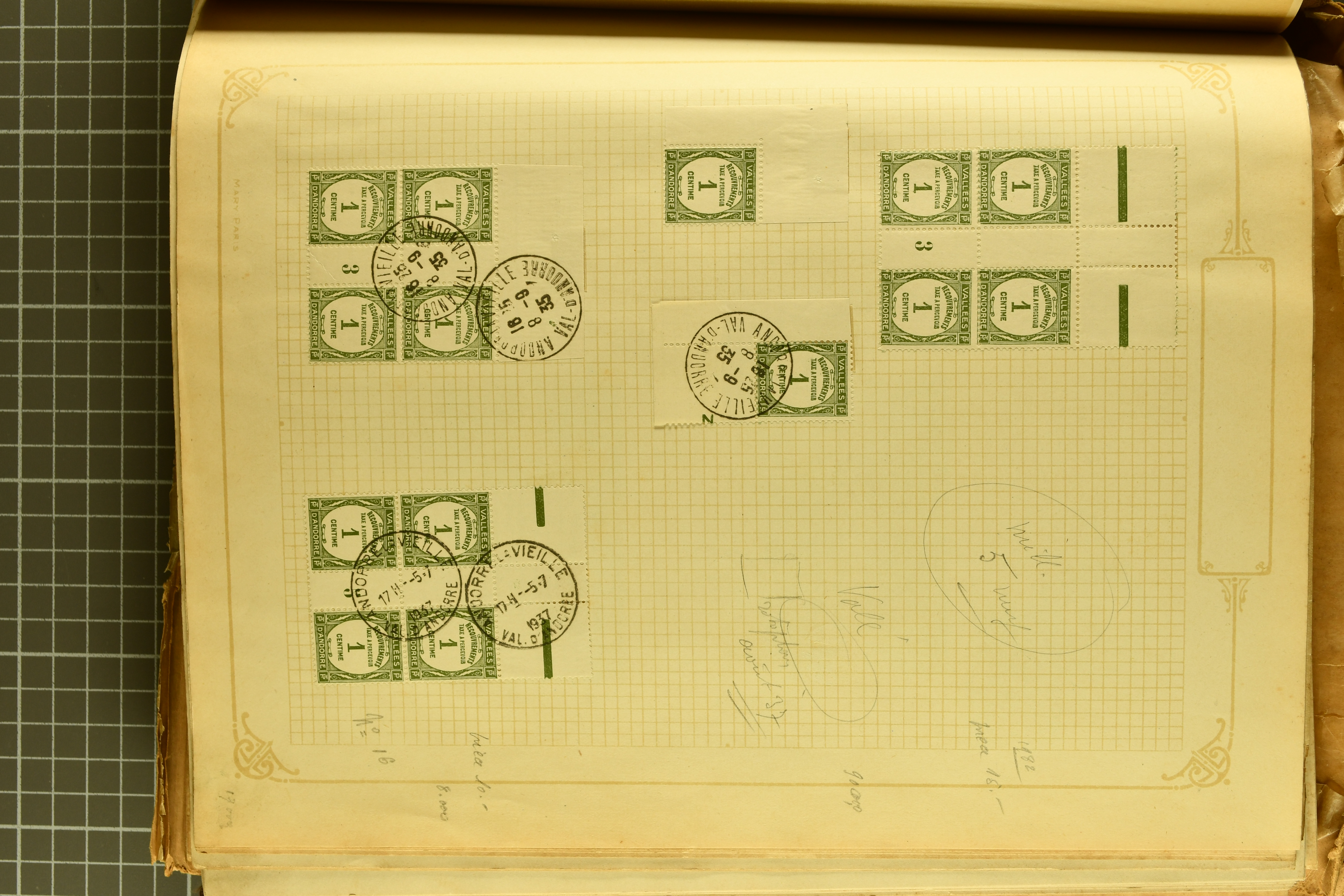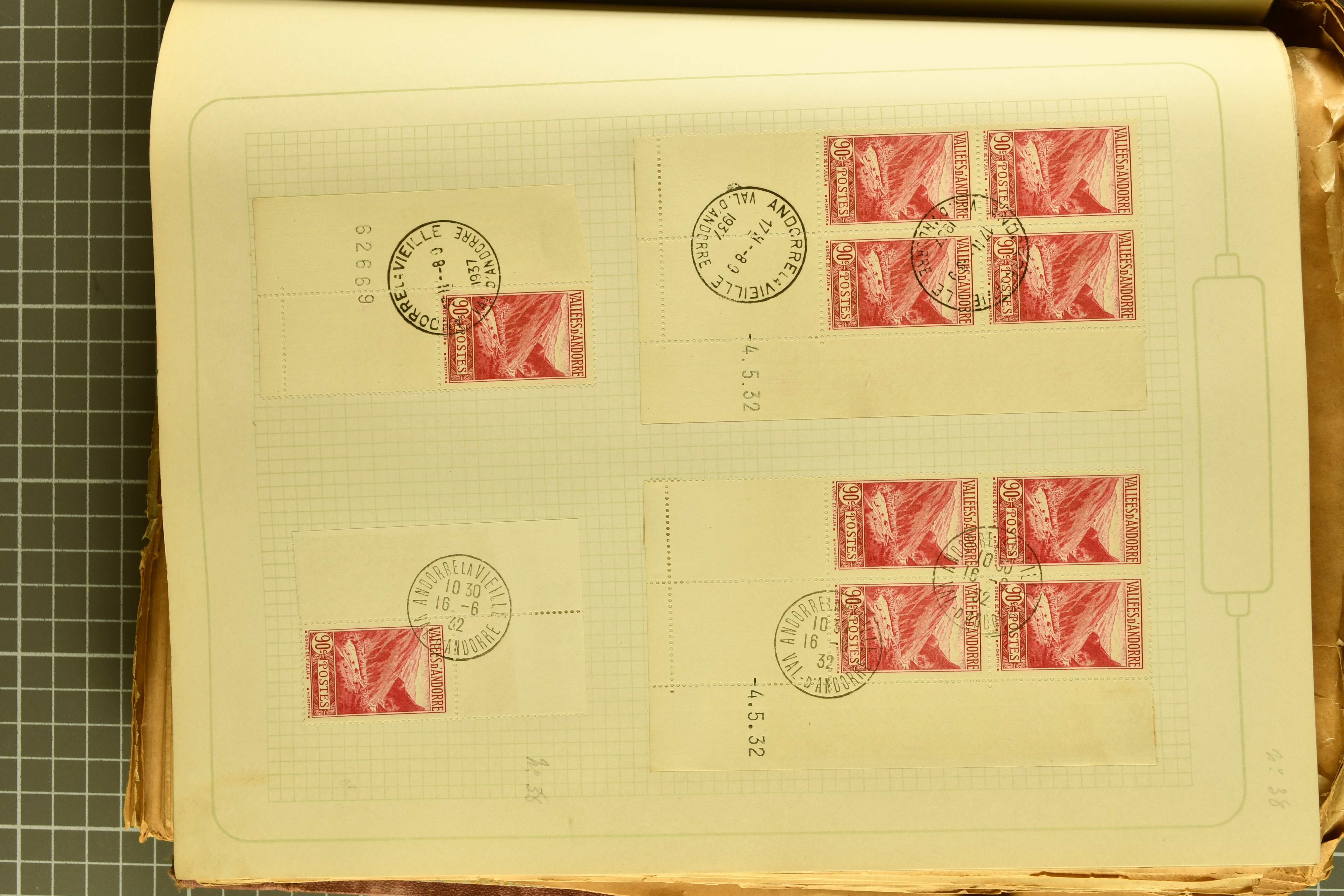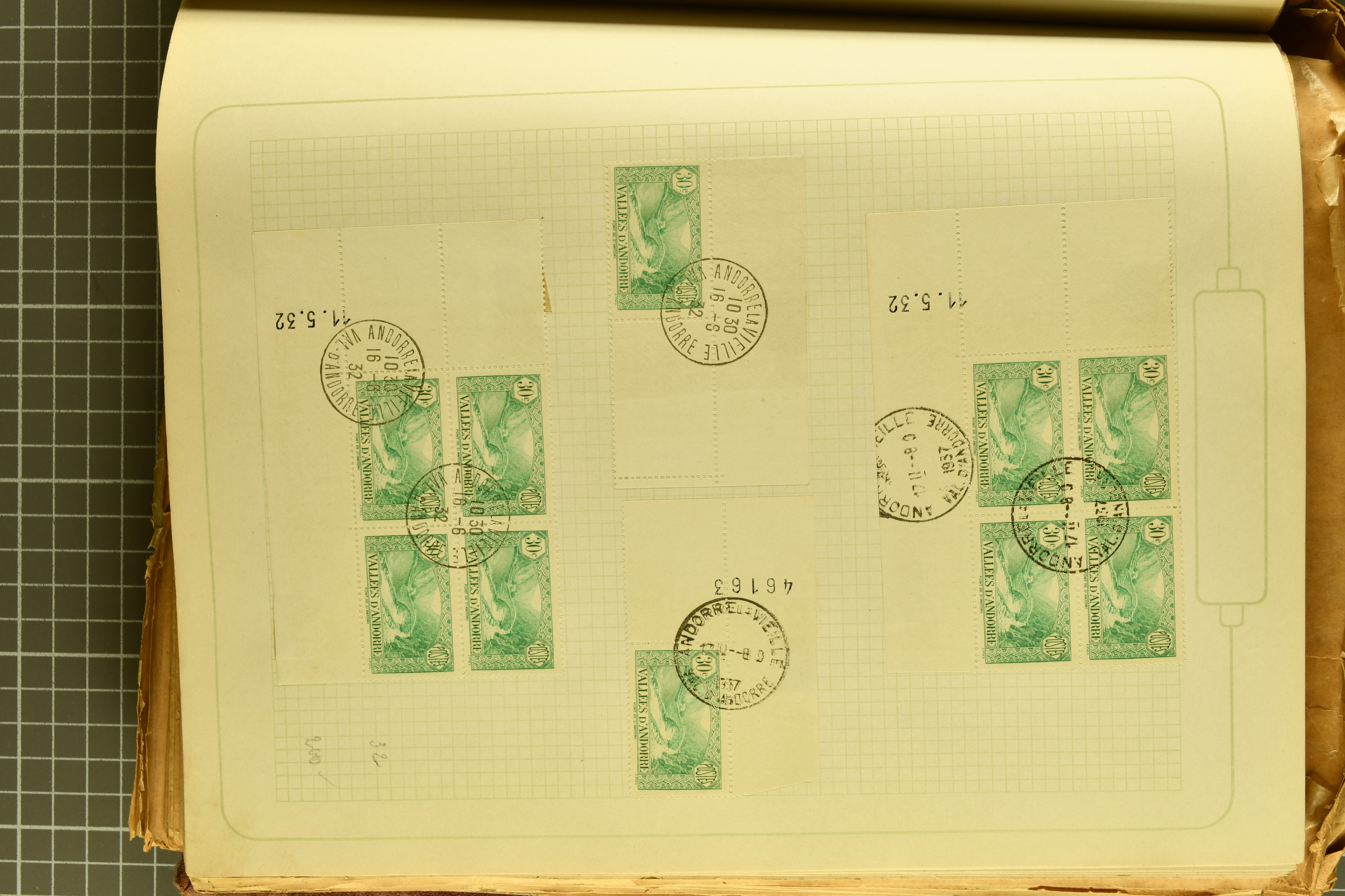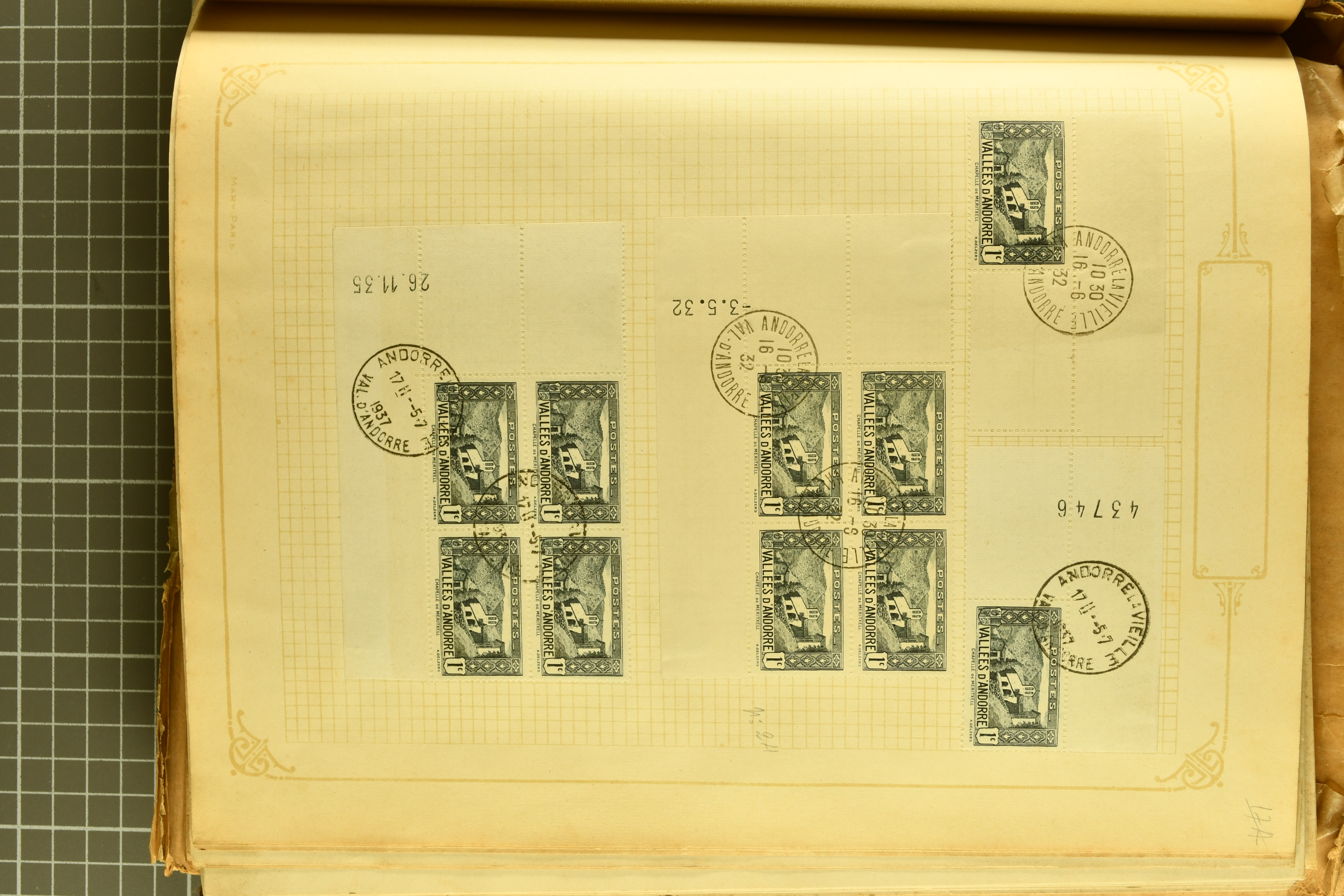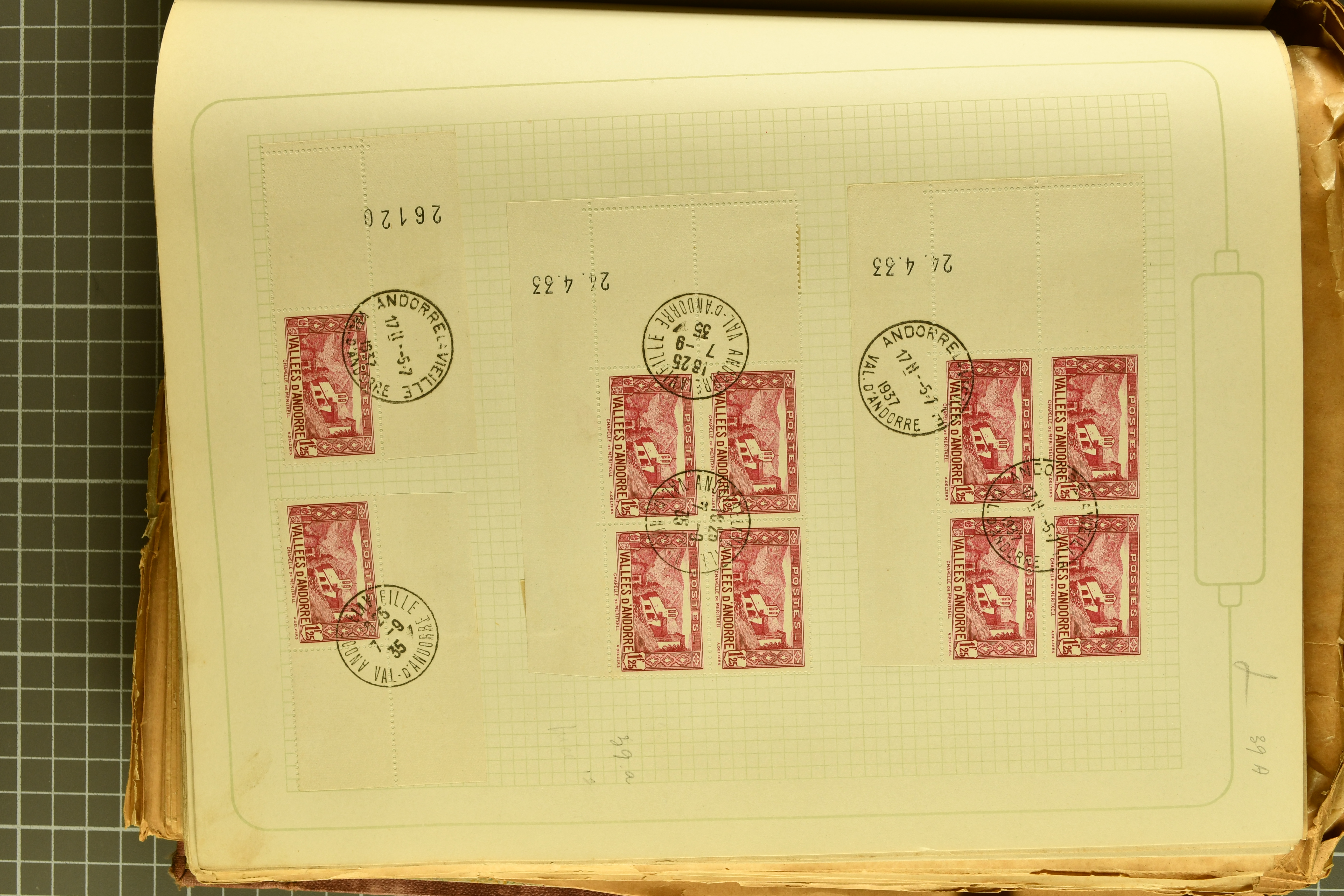 1966 imageAndorra 1929/38: Age-old collection, somewhat moisture-affected, nevertheless of considerable substance. Includes the first set of French Andorra, present 10 times: arranged as 2 blocks of four and 2 singles, all on piece and all cancelled with first day postmarks. The same applies to the first two issues of postage due stamps but 15 per times. The second set of unoverprinted definitives is largely complete (a few low values missing), also present in multiples totalling 10 stamps in the same manner as the first set. The third set is contained unused; the stamps are affixed to the album pages and therefore not counted. Likewise, the unused postage due stamps and some surplus quantities have not been included in the total. Still, the catalogue value reaches € 24'800. Towards the end of the album are further postage dues and covers franked with postage dues (all covers from France), catalogue € 3'930 (prices only for used applied). Also present: the first issue of Spanish Andorra, in used pairs, and the following sets as singles on a paper leaf, catalogue €1'900. The unused Spanish issues are partly stuck and have not been counted; the 4 P. and 10 P. exist in blocks of four, with two stamps mounted and two unmounted each. In total, the collection reaches a catalogue value of €29'830++. Noteworthy are various specialities, e.g. blocks of four frequently from the lower sheet corners (Image 1) (Image 2) (Image 3) (Image 4) (Image 5) (Image 6) (Image 7) (Image 8) (Image 9) (Image 10) (Image 11) (Image 12) (Image 13) (Image 14) (Image 15) (Image 16) (Image 17) (Image 18) (Image 19) (Image 20) (Image 21) (Image 22) (Image 23) (Image 24) (Image 25) (Image 26) (Image 27) (Image 28) (Image 29) (Image 30) (Image 31) (Image 32) (Image 33) (Image 34) (Image 35) (Image 36) (Image 37) (Image 38) (Image 39) (Image 40) (Image 41) (Image 42) (Image 43) (Image 44) (Image 45) (Image 46) (Image 47) (Image 48) (Image 49) (Image 50)