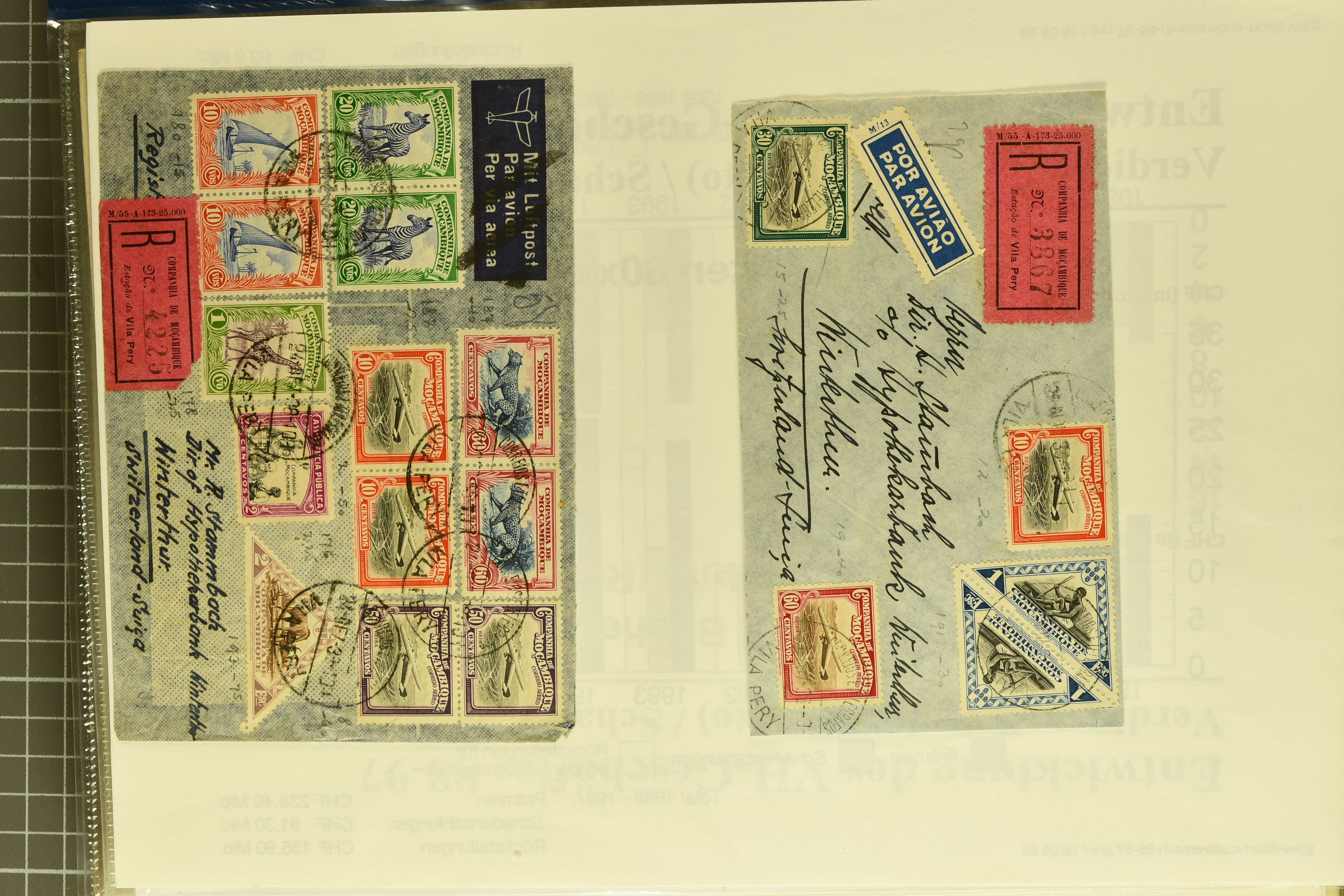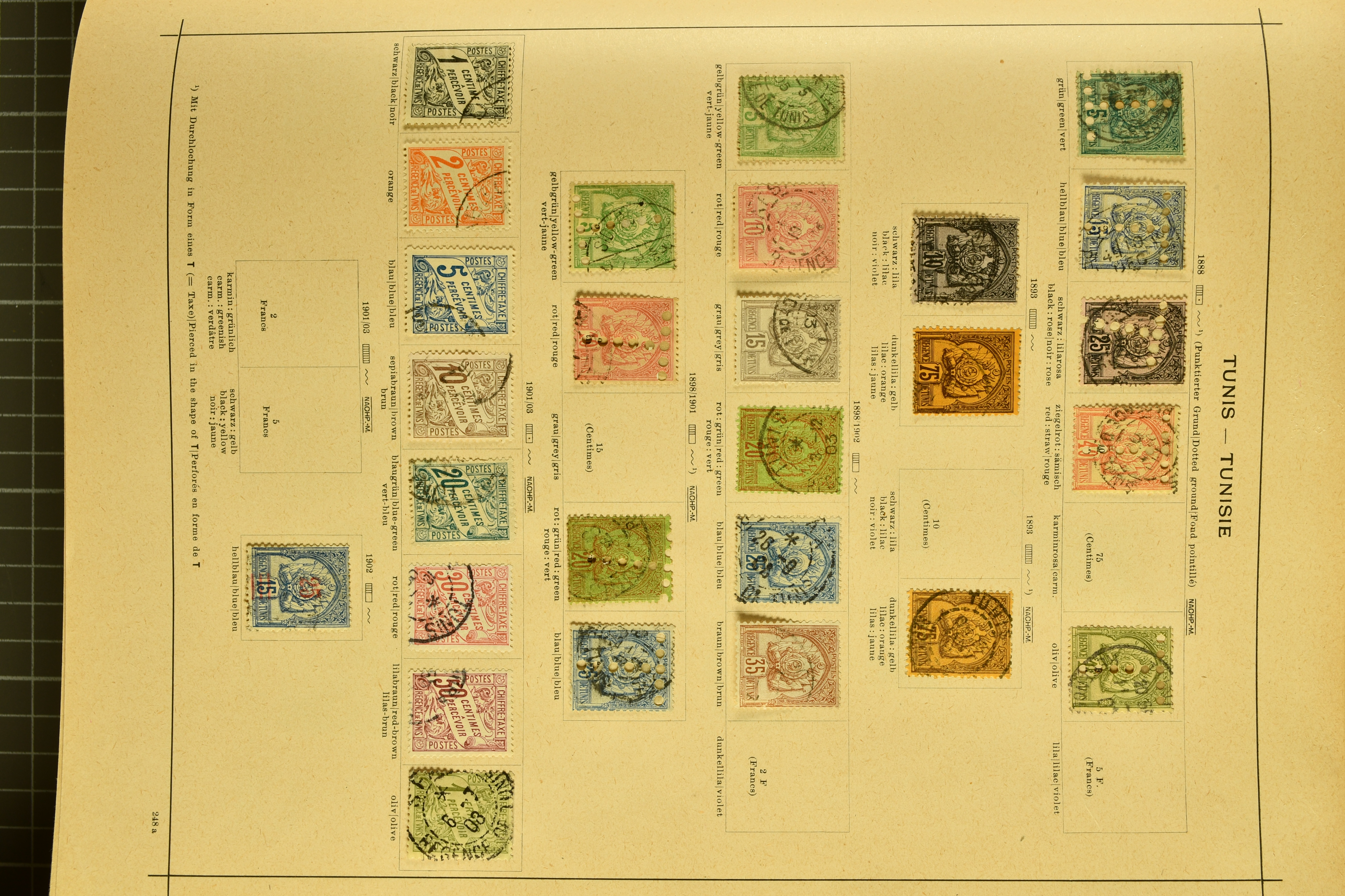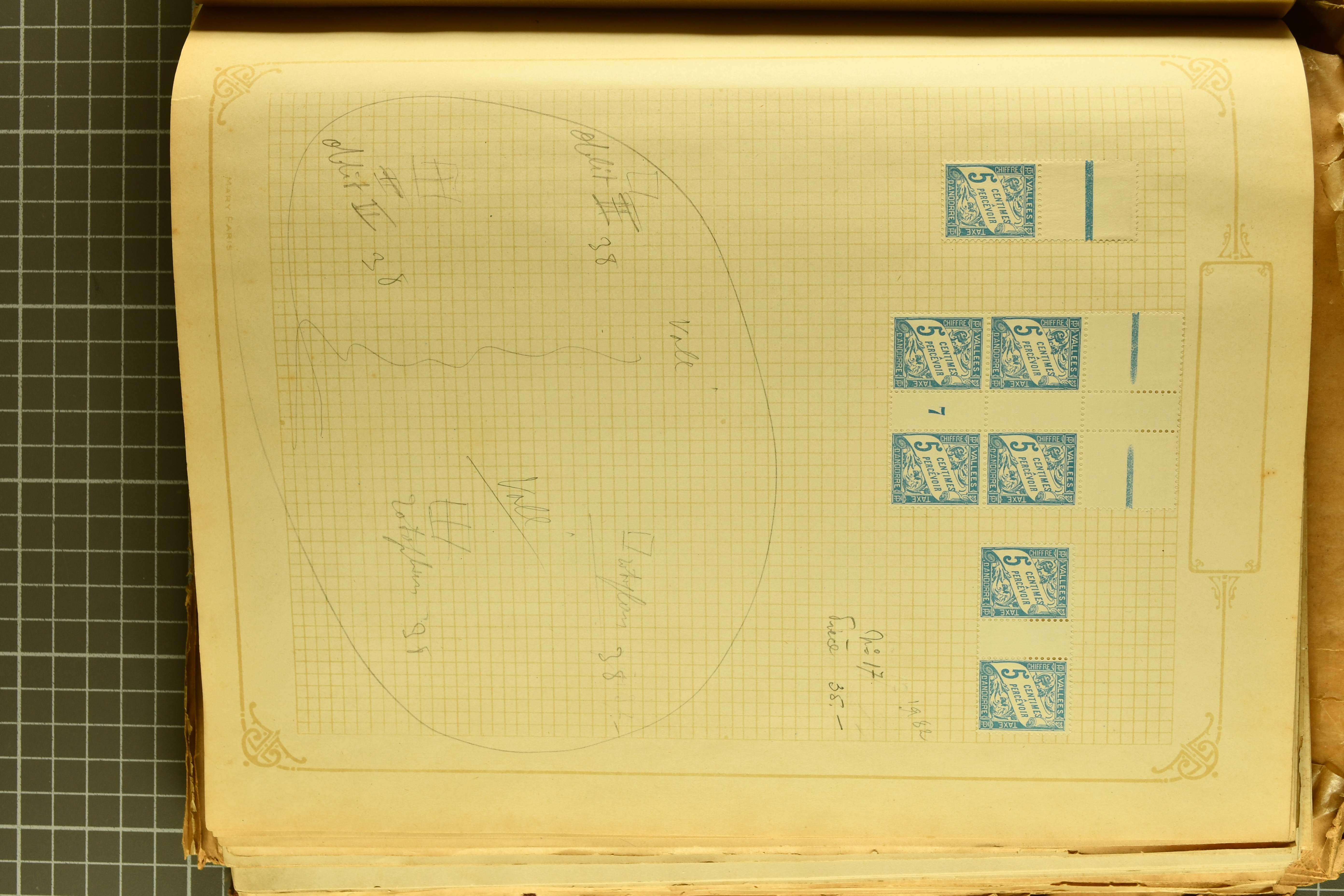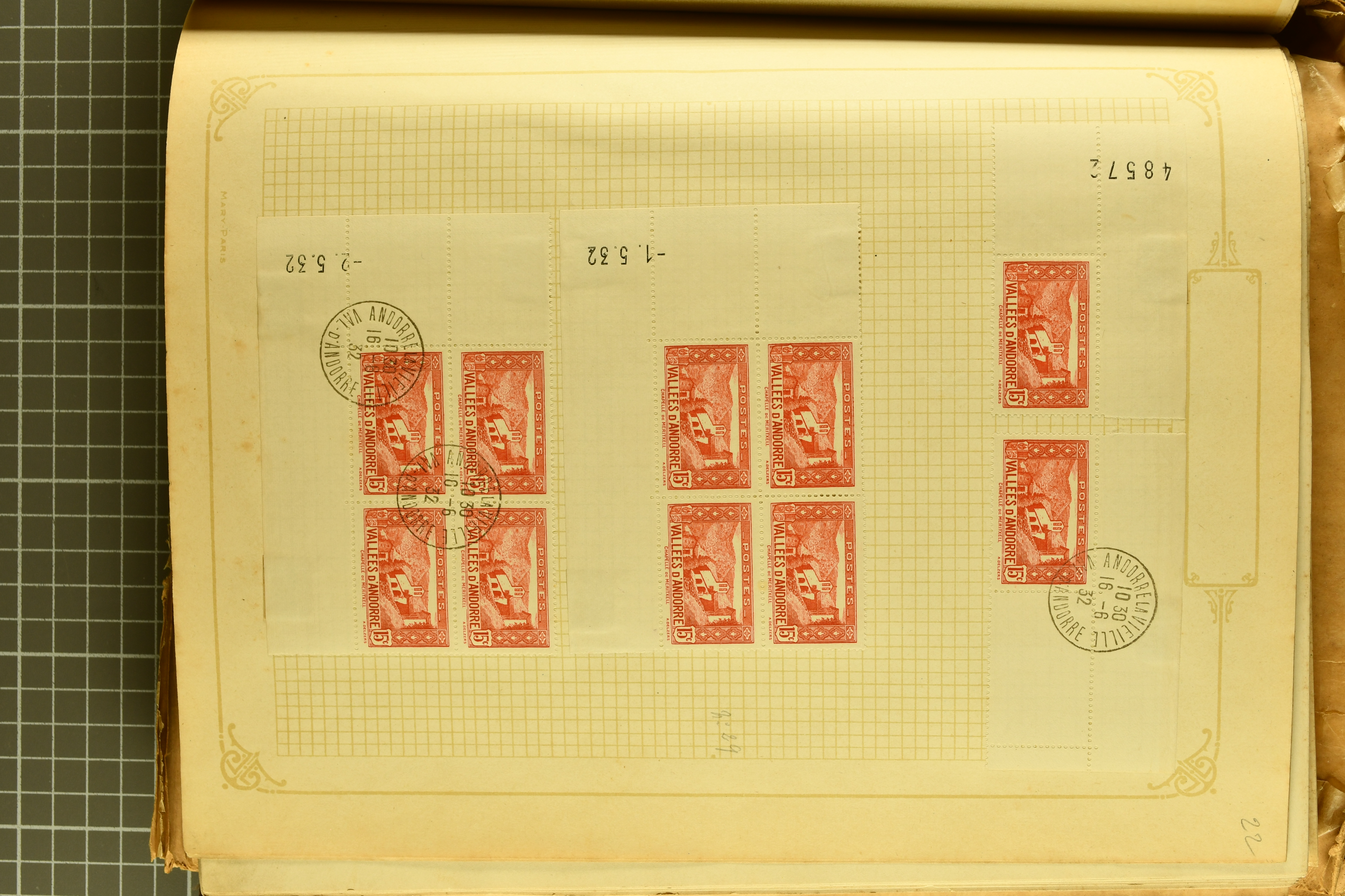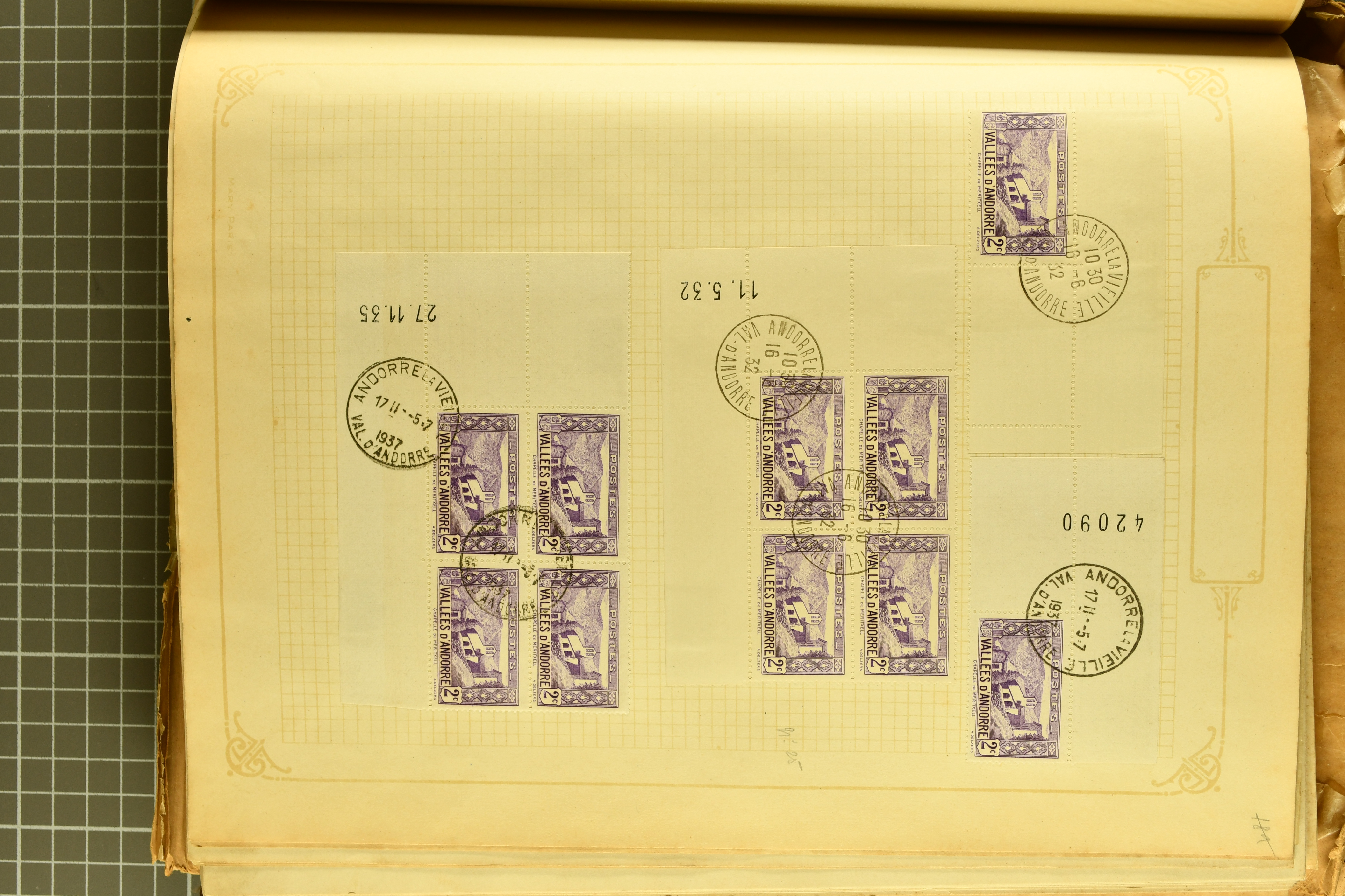 1966 imageAndorra 1929/38: Age-old collection, somewhat moisture-affected, nevertheless of considerable substance. Includes the first set of French Andorra, present 10 times: arranged as 2 blocks of four and 2 singles, all on piece and all cancelled with first day postmarks. The same applies to the first two issues of postage due stamps but 15 per times. The second set of unoverprinted definitives is largely complete (a few low values missing), also present in multiples totalling 10 stamps in the same manner as the first set. The third set is contained unused; the stamps are affixed to the album pages and therefore not counted. Likewise, the unused postage due stamps and some surplus quantities have not been included in the total. Still, the catalogue value reaches € 24'800. Towards the end of the album are further postage dues and covers franked with postage dues (all covers from France), catalogue € 3'930 (prices only for used applied). Also present: the first issue of Spanish Andorra, in used pairs, and the following sets as singles on a paper leaf, catalogue €1'900. The unused Spanish issues are partly stuck and have not been counted; the 4 P. and 10 P. exist in blocks of four, with two stamps mounted and two unmounted each. In total, the collection reaches a catalogue value of €29'830++. Noteworthy are various specialities, e.g. blocks of four frequently from the lower sheet corners (Image 1) (Image 2) (Image 3) (Image 4) (Image 5) (Image 6) (Image 7) (Image 8) (Image 9) (Image 10) (Image 11) (Image 12) (Image 13) (Image 14) (Image 15) (Image 16) (Image 17) (Image 18) (Image 19) (Image 20) (Image 21) (Image 22) (Image 23) (Image 24) (Image 25) (Image 26) (Image 27) (Image 28) (Image 29) (Image 30) (Image 31) (Image 32) (Image 33) (Image 34) (Image 35) (Image 36) (Image 37) (Image 38) (Image 39) (Image 40) (Image 41) (Image 42) (Image 43) (Image 44) (Image 45) (Image 46) (Image 47) (Image 48) (Image 49) (Image 50)