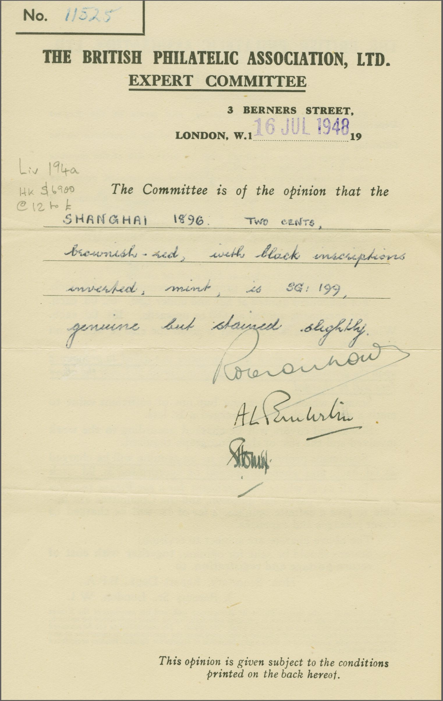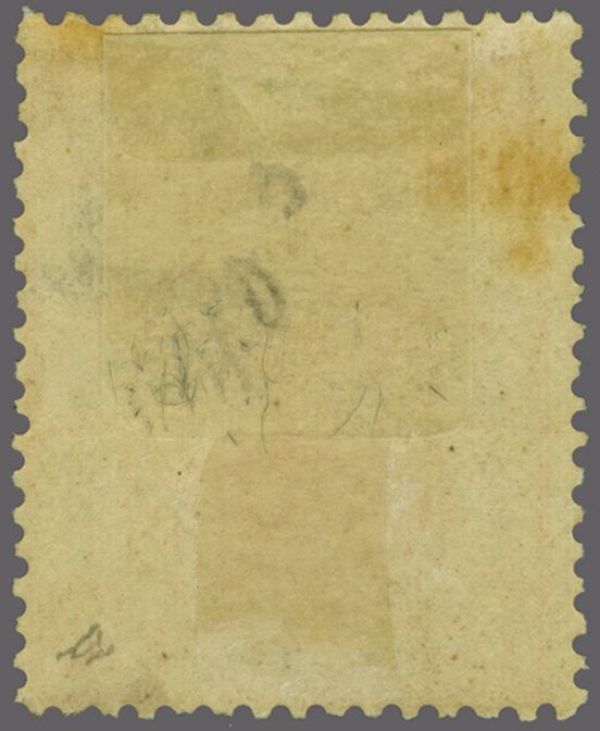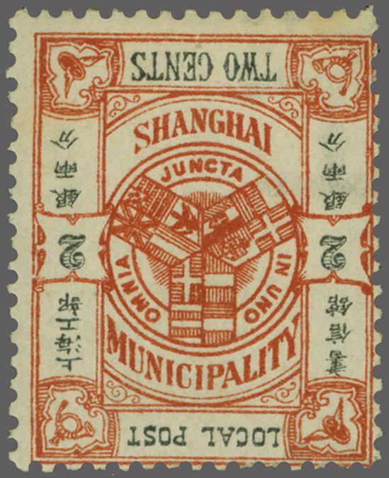 938 * imageShanghai Local Post 1896 (Oct): 2 c. brownish red & black, wmk. Kung Pu, perf. 13½ x 14, an unused example, variety "Black Inscriptions Inverted", slight ageing on large part original gum. An extremely rare variety. Cert. BPA (1948) Mi. 119 bF = unpriced / Gi = £ 2'500 (Image 1) (Image 2) (Image 3)