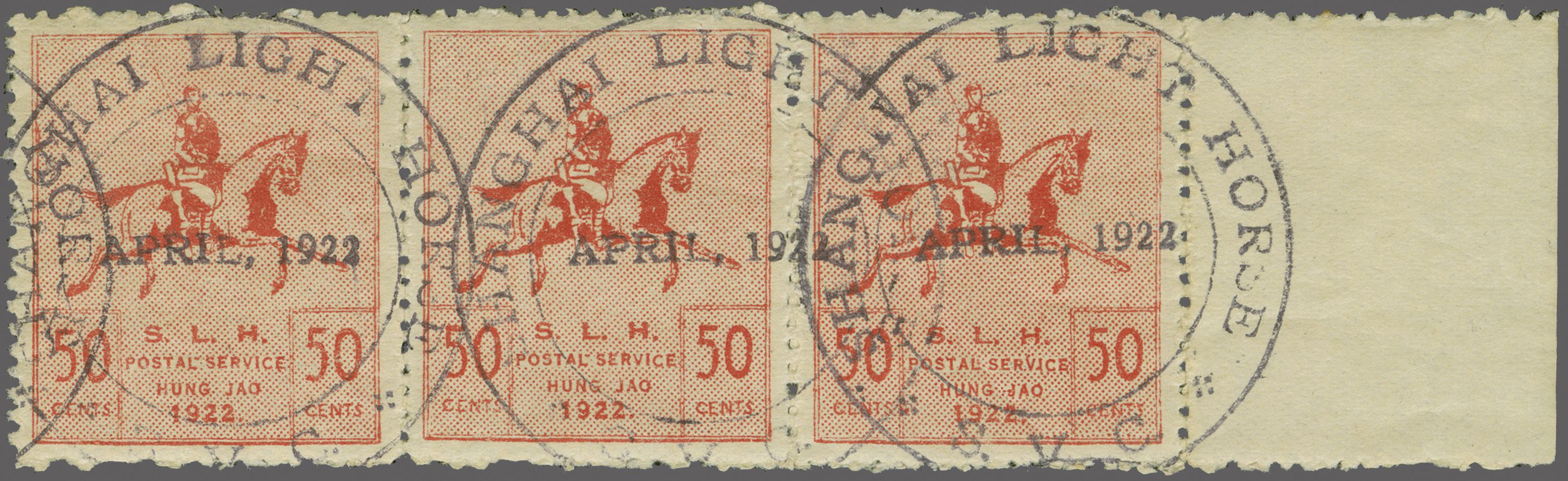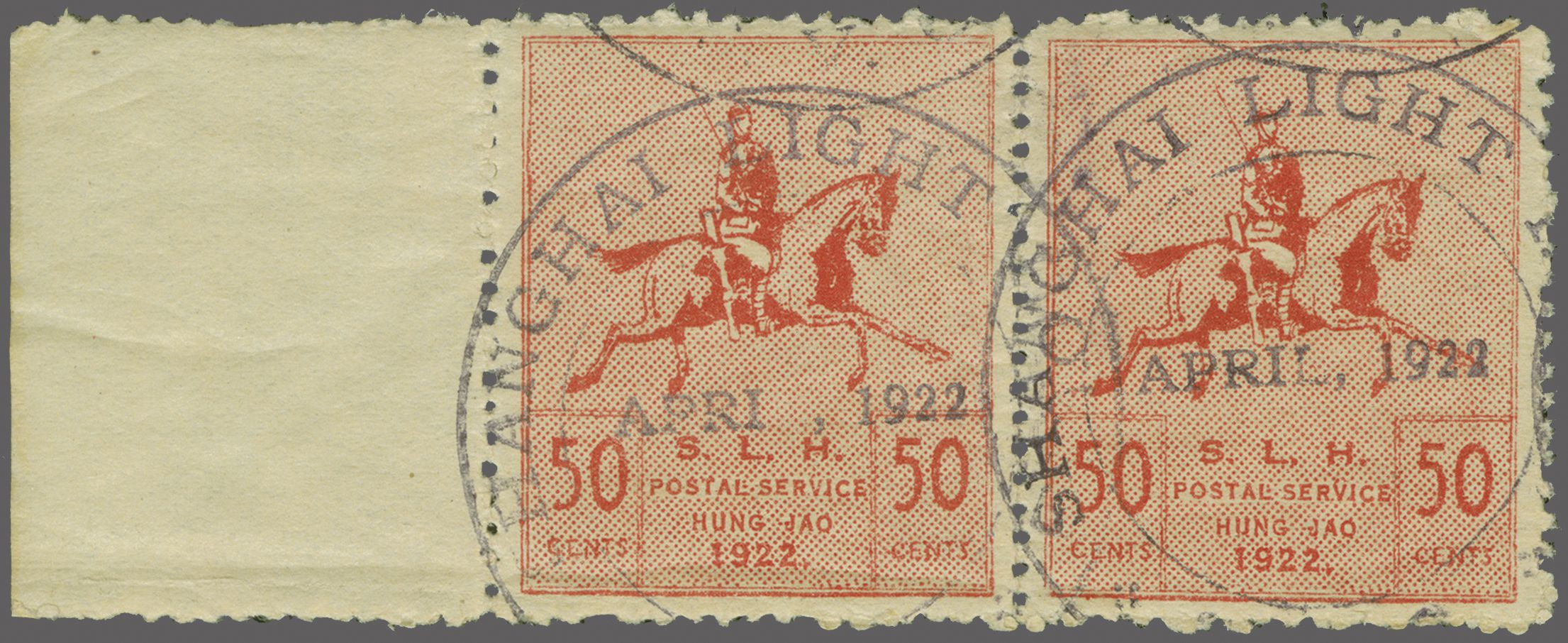 940 imageShanghai Volunteer Corps 1922: SLH Postal Service 50 c. red & rose, a used horizontal pair with sheet margin at right, lightly cancelled by SHANGHAI LIGHT HORSE datestamps (April 1922) in blackish-violet. Usual small gum creasing and rough perfs. but very scarce (Image 1) (Image 2)