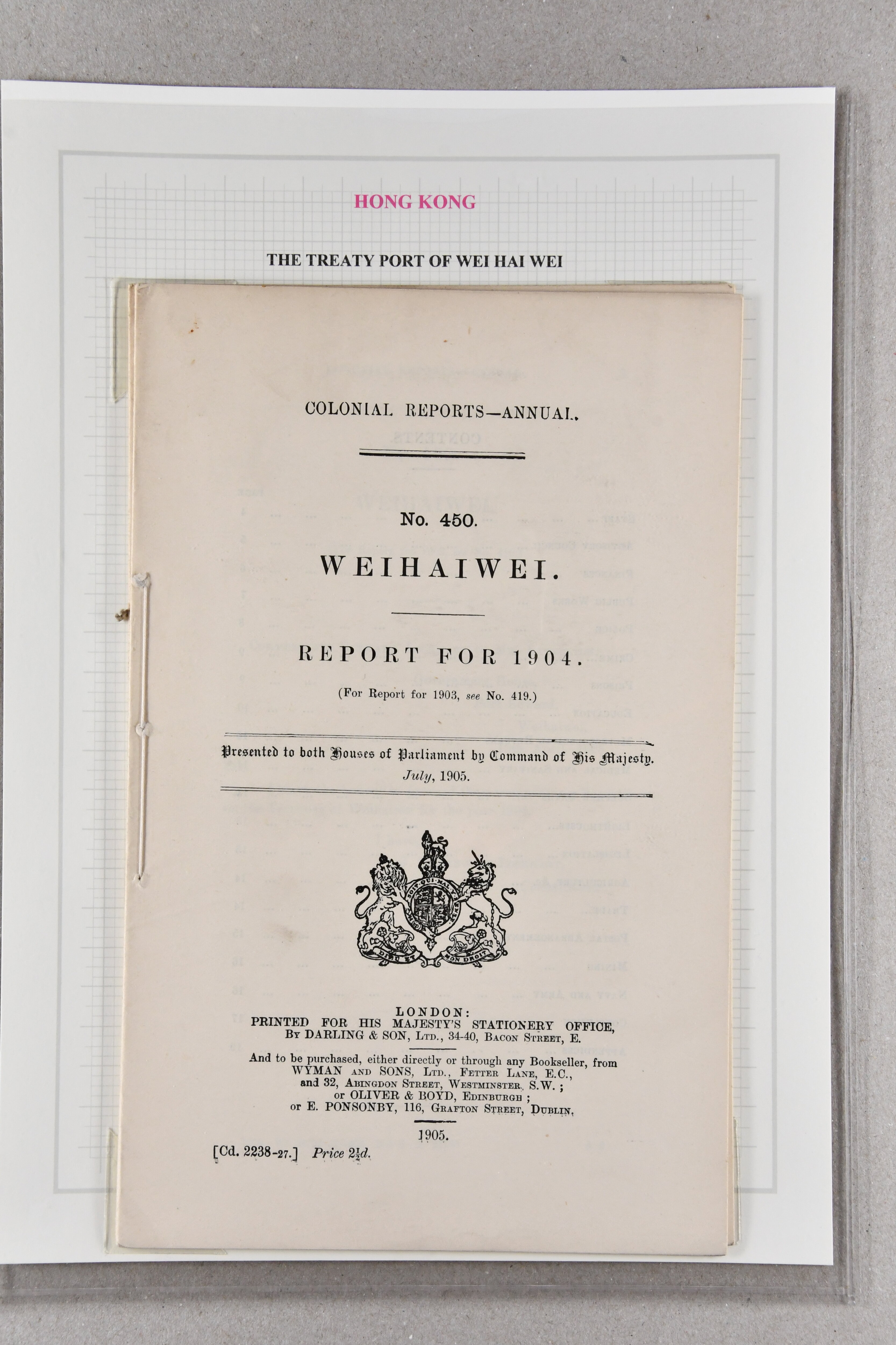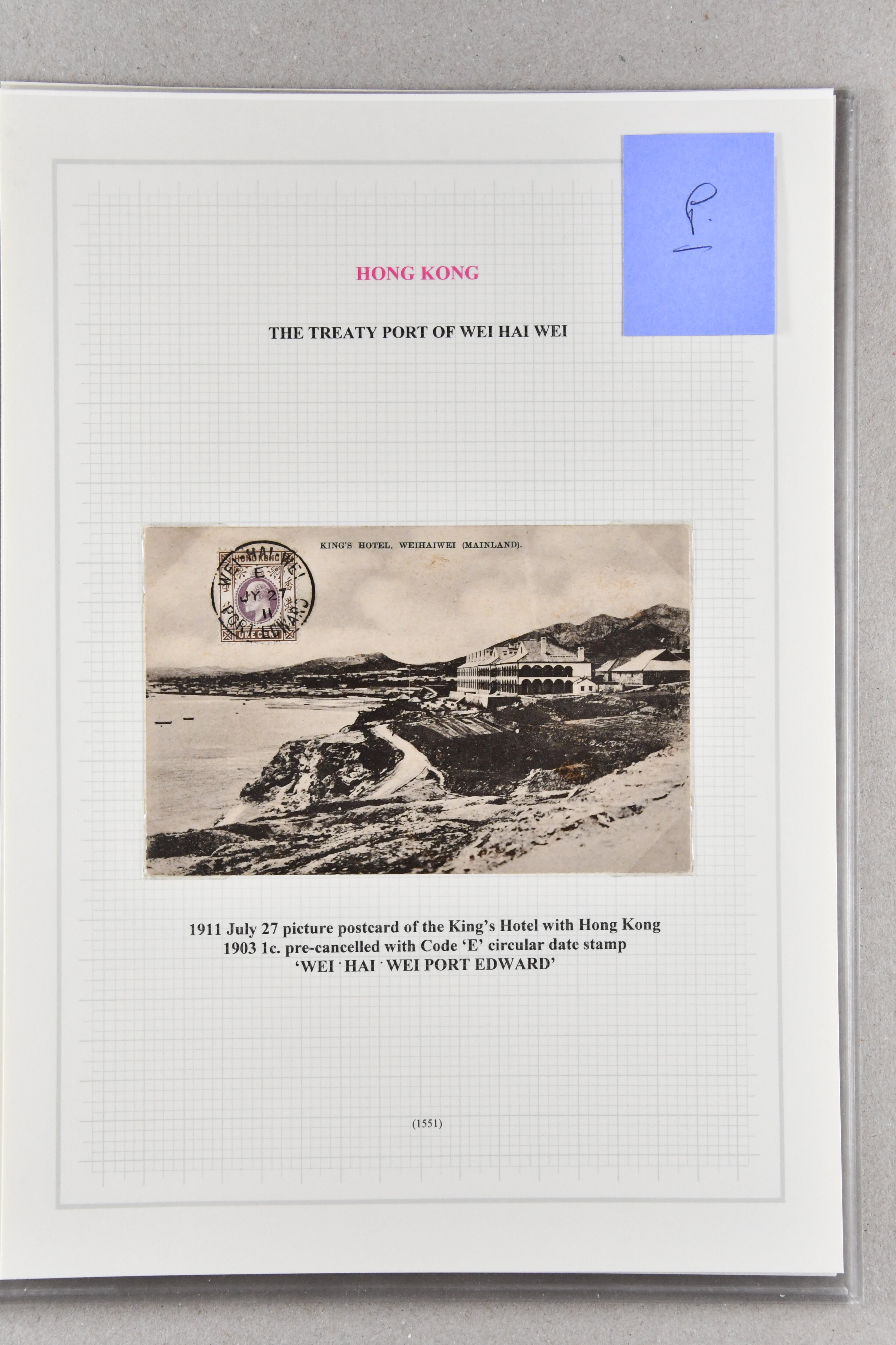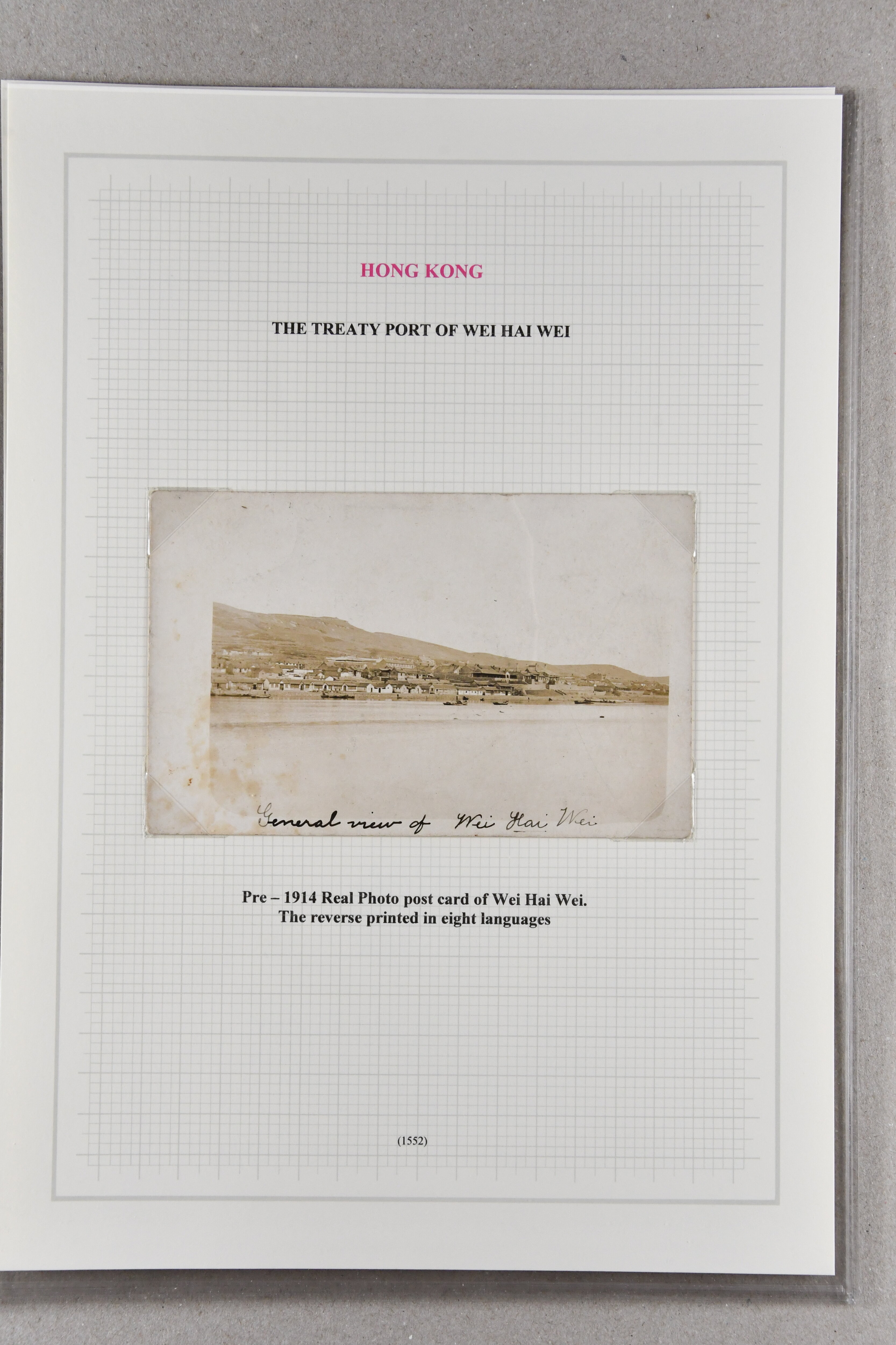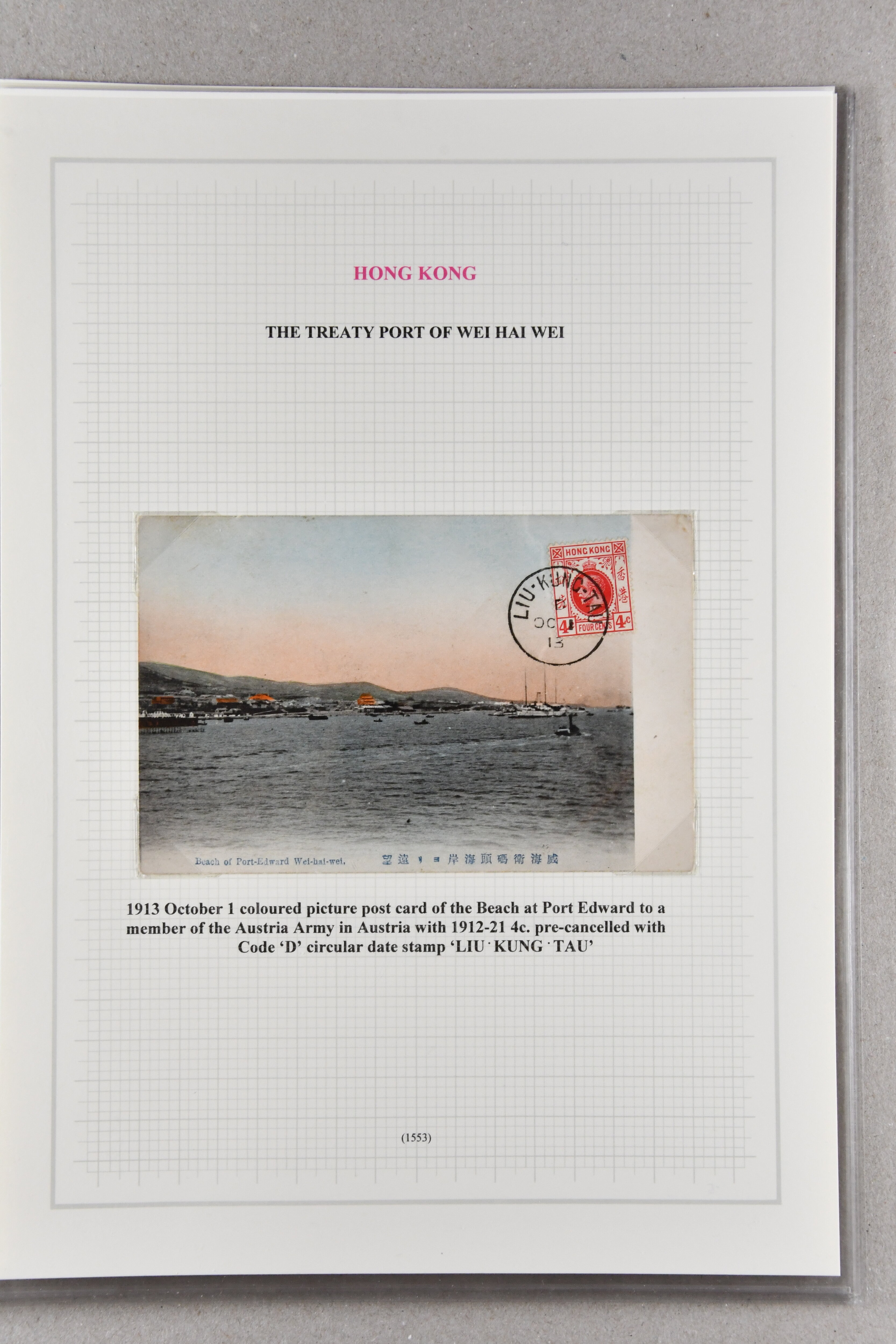 5433 cover image1905/13: Wei Hei Wei: Small group of four items with Colonial Report document for 1904 presented to both Houses of Parliament in superb quality (48 pages), 1911 postcard of King's Hotel with 1903 Hong Kong 1 c. brown & purple tied by bold "WEI-HEI-WEI / PORT EDWARD" cds (July 27), 1913 colour postcard of Wei-Hei-Wei beach franked by 1912 4 c. red tied by bold "LIU-KUNG-TAU" cds (Oct 1) and unused early photographic card in black & white showing a similar view. Fine group (4) (Image 1) (Image 2) (Image 3) (Image 4)