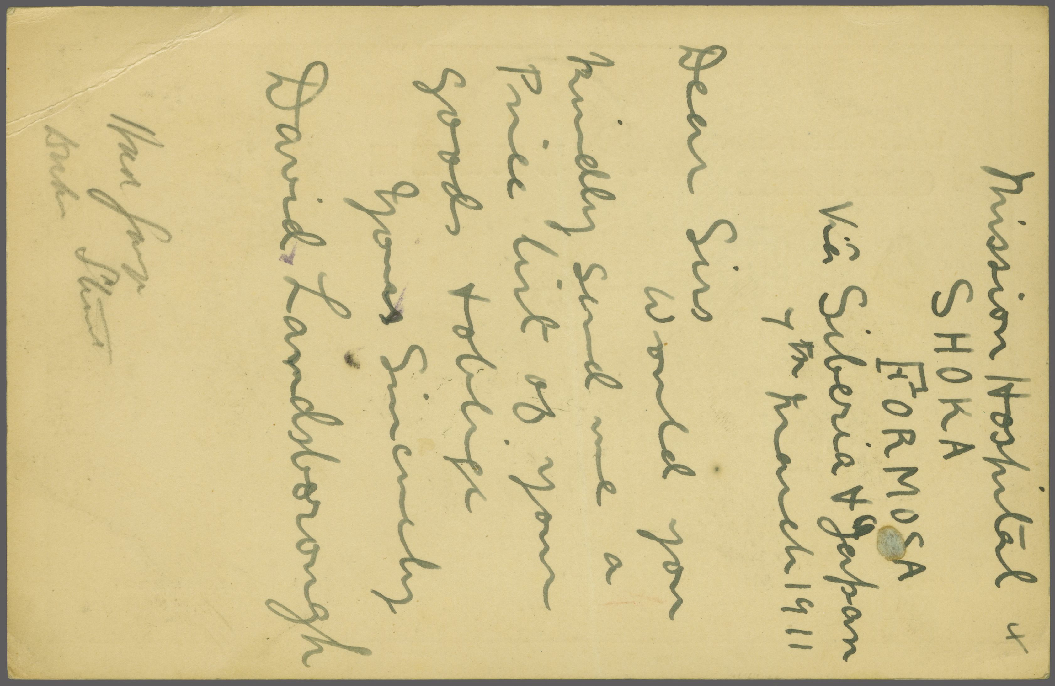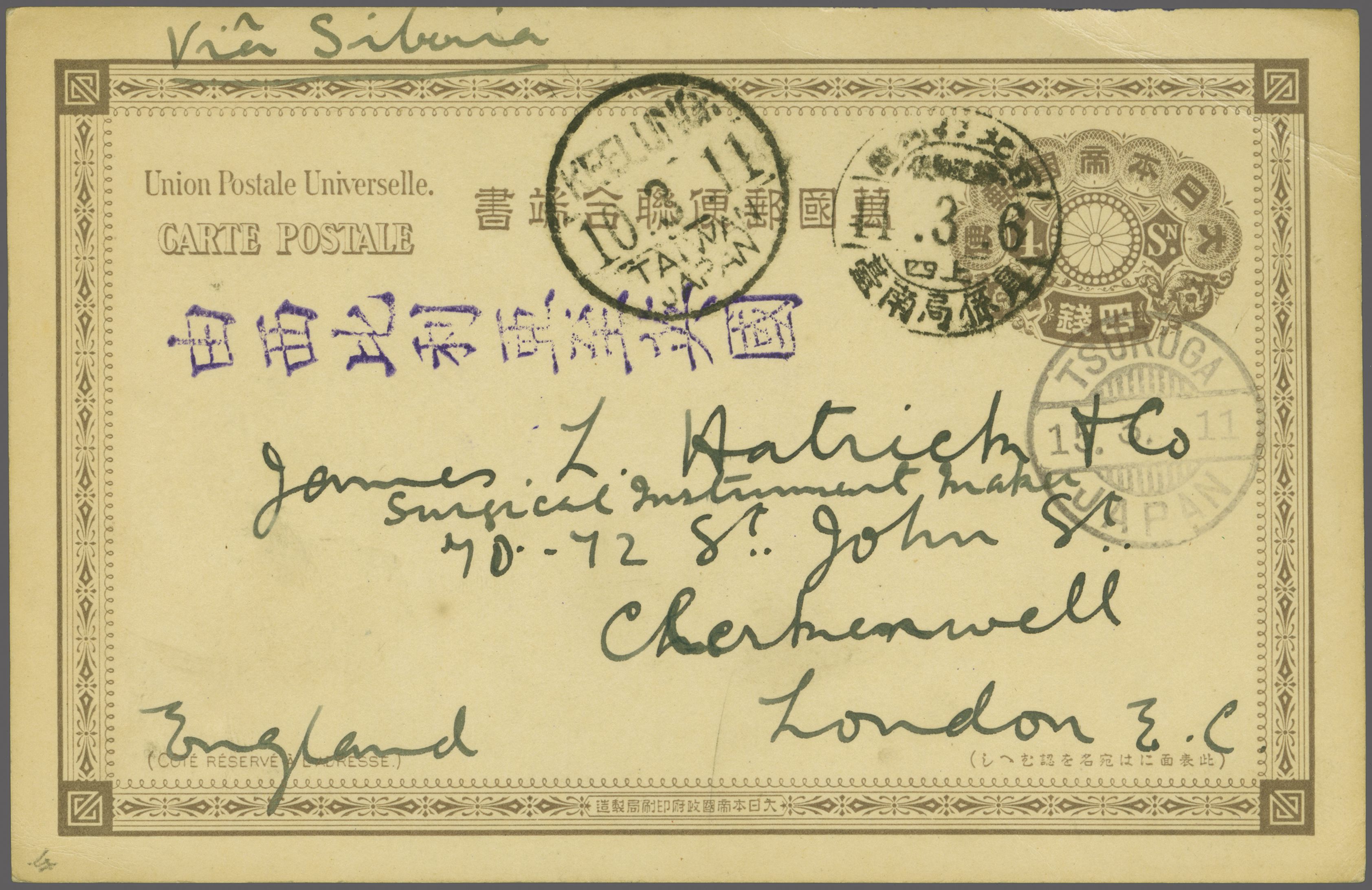 5111 cover image1911: Japan 4 s. brown on cream postal stationery card, mailed from Shoka, Taiwan with superb all Chinese despatch datestamp (March 6); "KEELUNG / TAIWAN" transit cds in black (March 10) and thence via "Tsuruga / Japan" (March 15) to England. The card mailed by a British missionary requesting a catalogue of surgical instruments. Rare and very fine (Image 1) (Image 2)