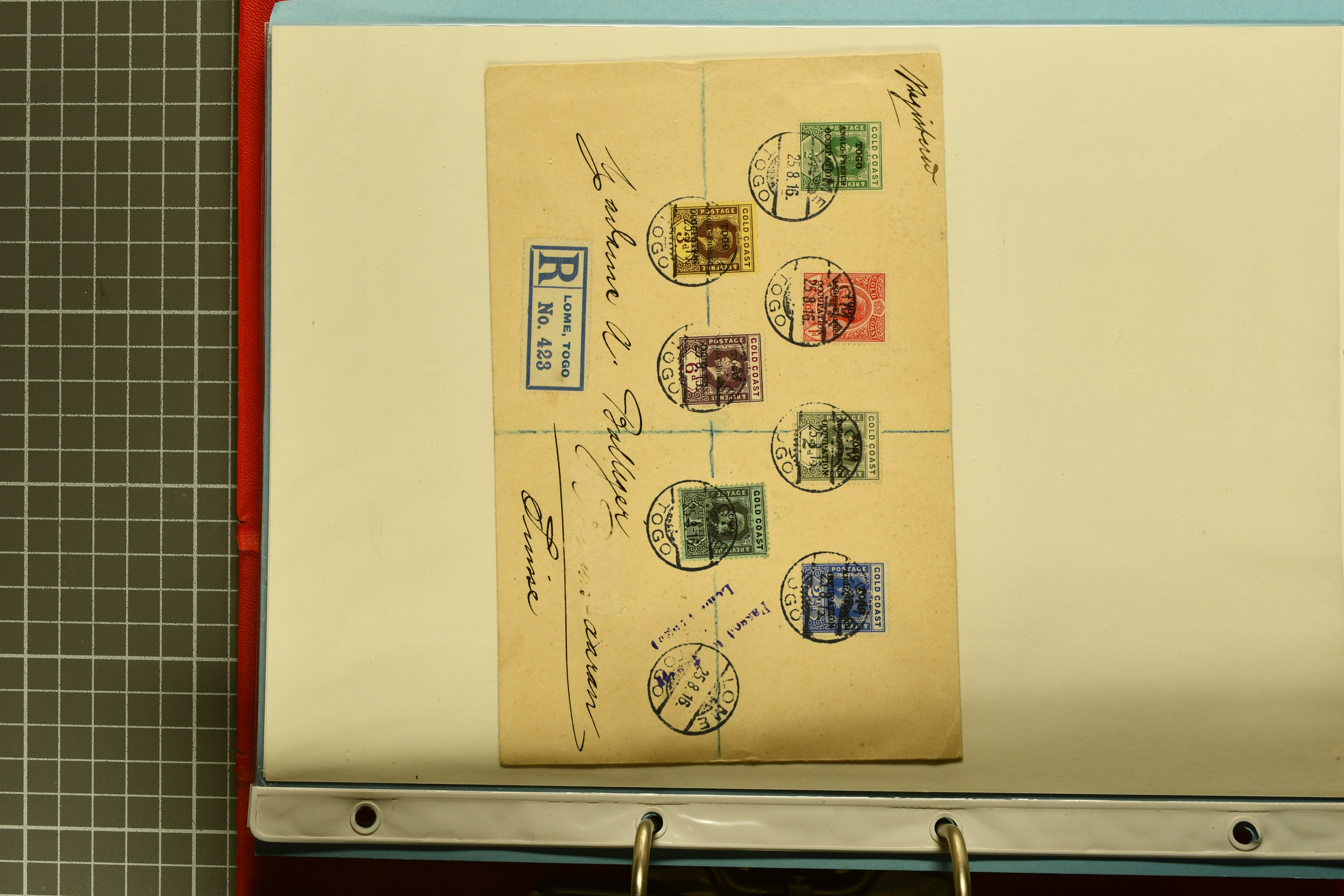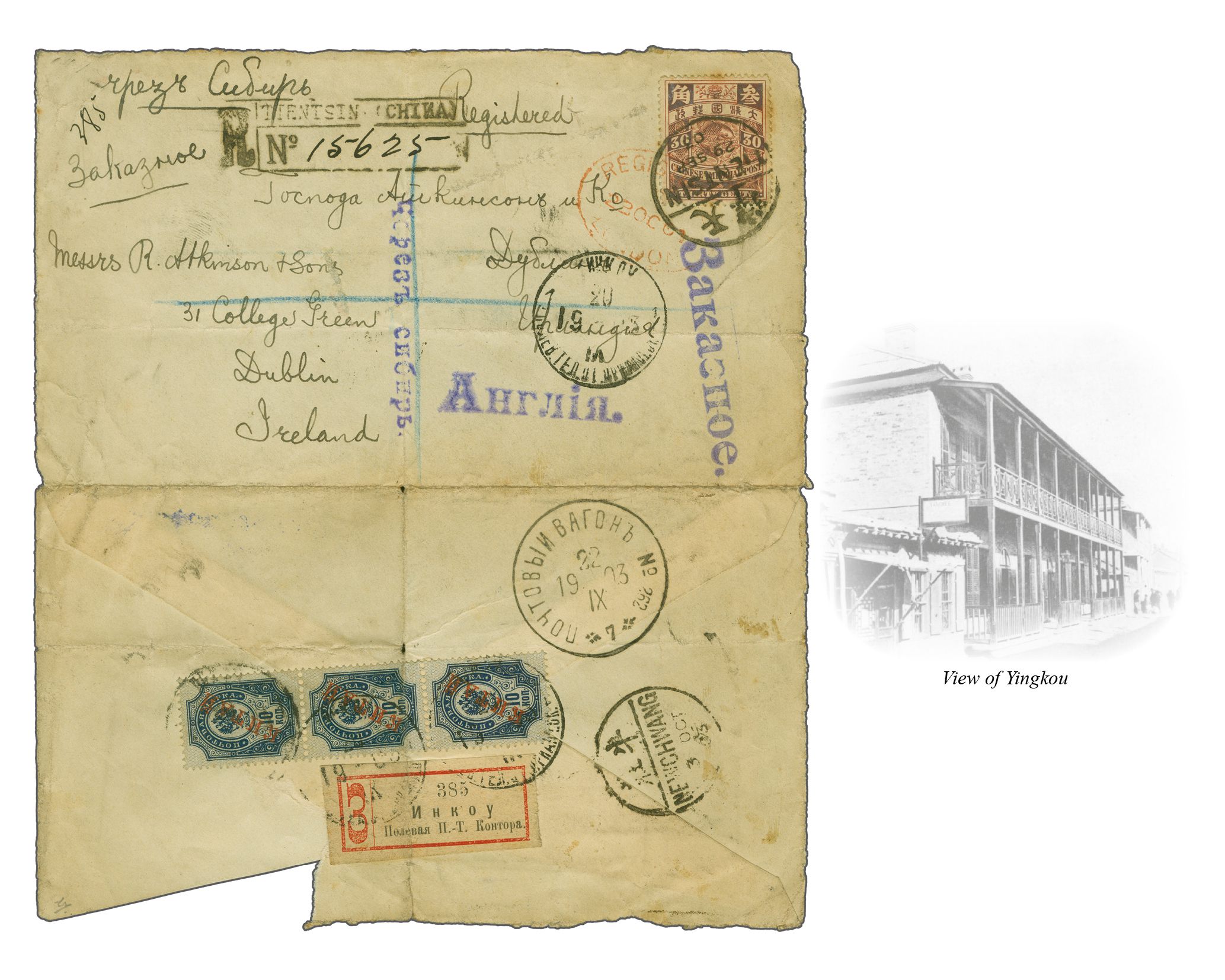 5109 cover imageRussian Post Offices in China 1901: China 30 c. red used on bilingually addressed 1903 registered cover to Dublin, Ireland tied by "Tientsin" cds (Sept 29), with Chinese P.O. "Newchang" transit (Oct 3) and reverse showing Russian P.O. in China 'Kitai' 10 k. blue in a vertical strip of three all tied by "YINKOW (Newchang) FIELD POST OFFICE" cds's in black (Tchilinghirian fig. 655) also tying the Cyrillic registration label of same below. Superb strike of Chinese Eastern Railway "POSTAL WAGON No. 262 / 7" cds (Sept 22j) in black (Tchilinghirian fig. 658) and red oval London registered transit (Oct 23). A fine and rare cover that opens well for Exhibit display (Image 1) (Image 2)