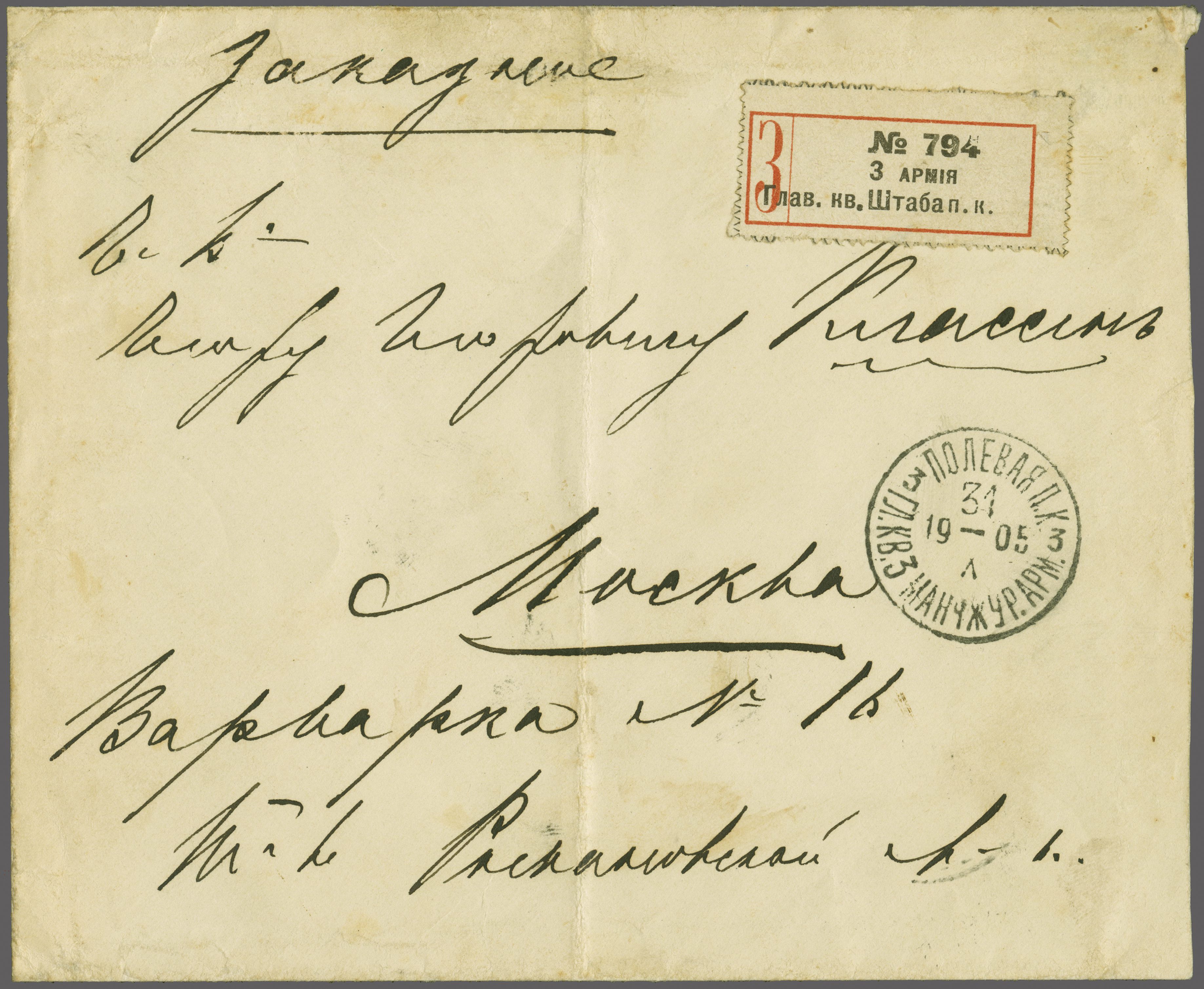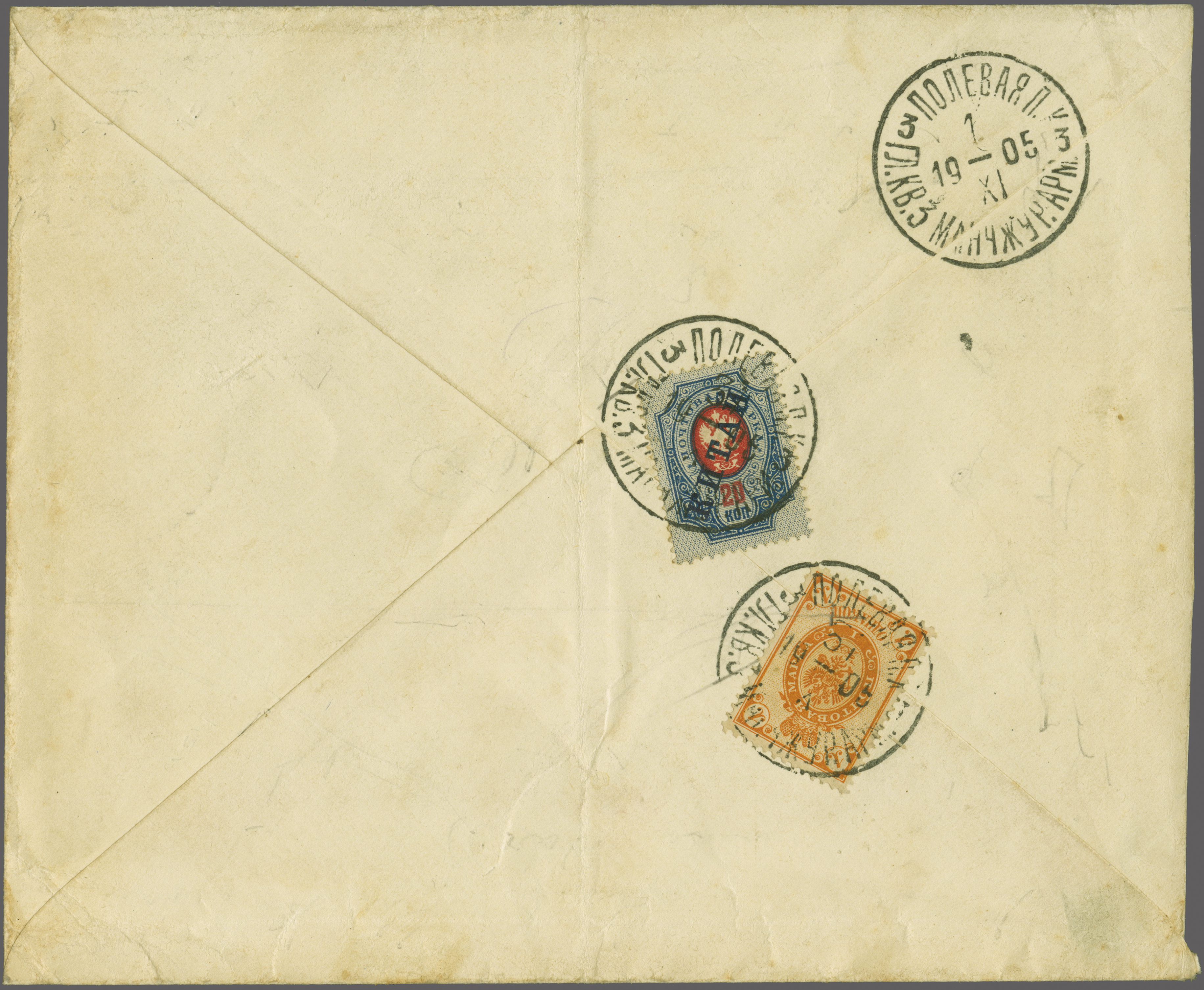 5110 cover imageRussian Post Offices in China 1905: Imperial 1 k. orange and 'Kitai' 20 k. deep blue, used on reverse of 1905 registered cover to Moscow, each tied by bold strikes of Military "Headquarters / KB3" datestamps in black (Oct 31) with obverse showing "3rd Army Headquarters" registered label and further strike of the despatch cds. An unusual double weight registered franking (Image 1) (Image 2)