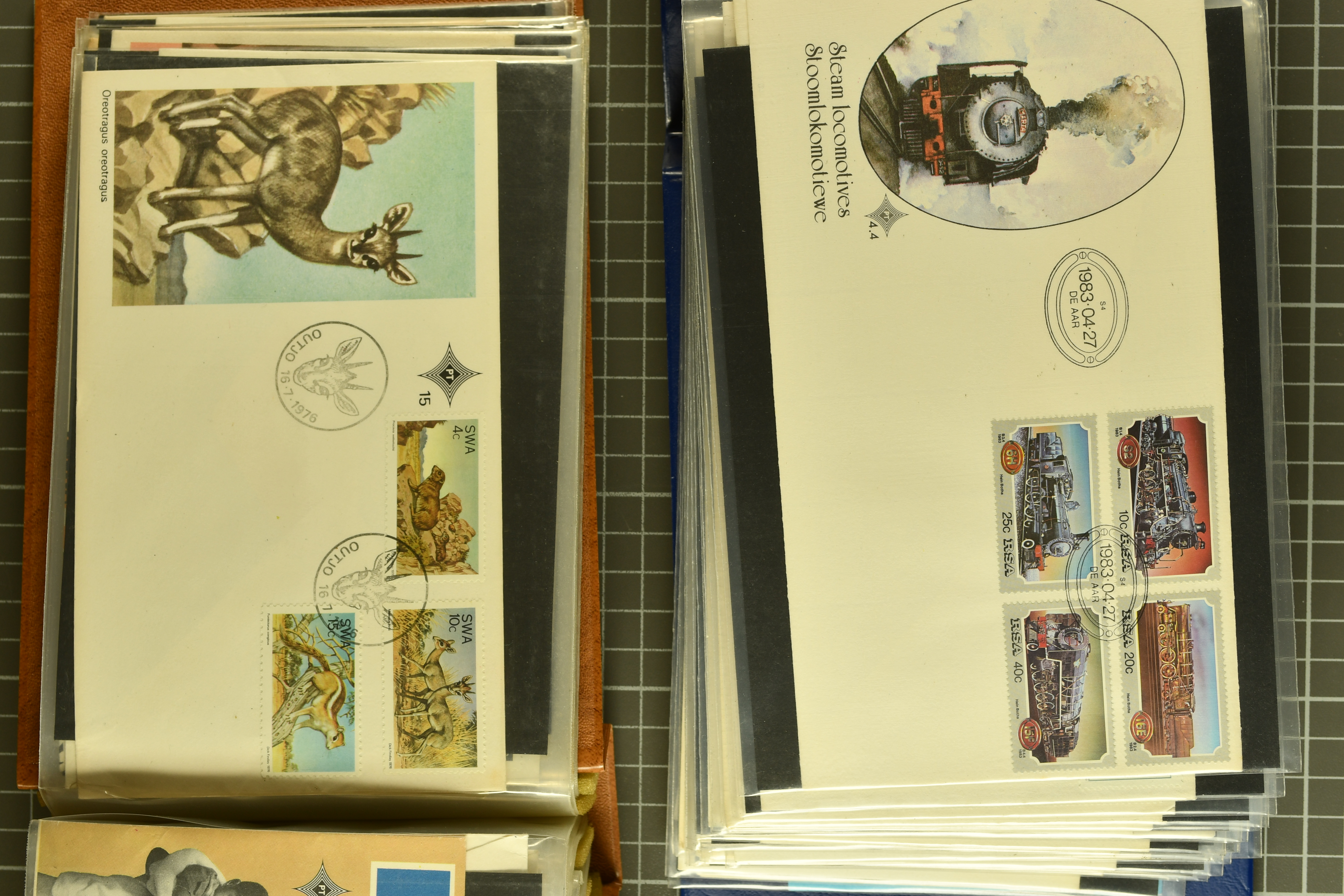 1463 image1853/1990ca.: Extensive Southern Africa accumulation housed in a volume on Schaubek pages, opening with Angola and followed by a diverse range including Cape of Good Hope, Madagascar, Diego Suarez, Nossi Bé, Mayotte, Mozambique and Réunion, with better stamps noted in each country. A second album contains Mauritius, St. Helena and Seychelles. Also included are six stockbooks with duplication, two small albums of South African FDCs, and a basic South Africa collection, ideal as a foundation or for further development (Image 1) (Image 2) (Image 3) (Image 4) (Image 5) (Image 6) (Image 7) (Image 8) (Image 9) (Image 10) (Image 11) (Image 12) (Image 13) (Image 14) (Image 15) (Image 16) (Image 17) (Image 18) (Image 19) (Image 20) (Image 21) (Image 22) (Image 23) (Image 24) (Image 25) (Image 26) (Image 27) (Image 28) (Image 29) (Image 30) (Image 31) (Image 32) (Image 33) (Image 34) (Image 35) (Image 36) (Image 37) (Image 38) (Image 39) (Image 40)