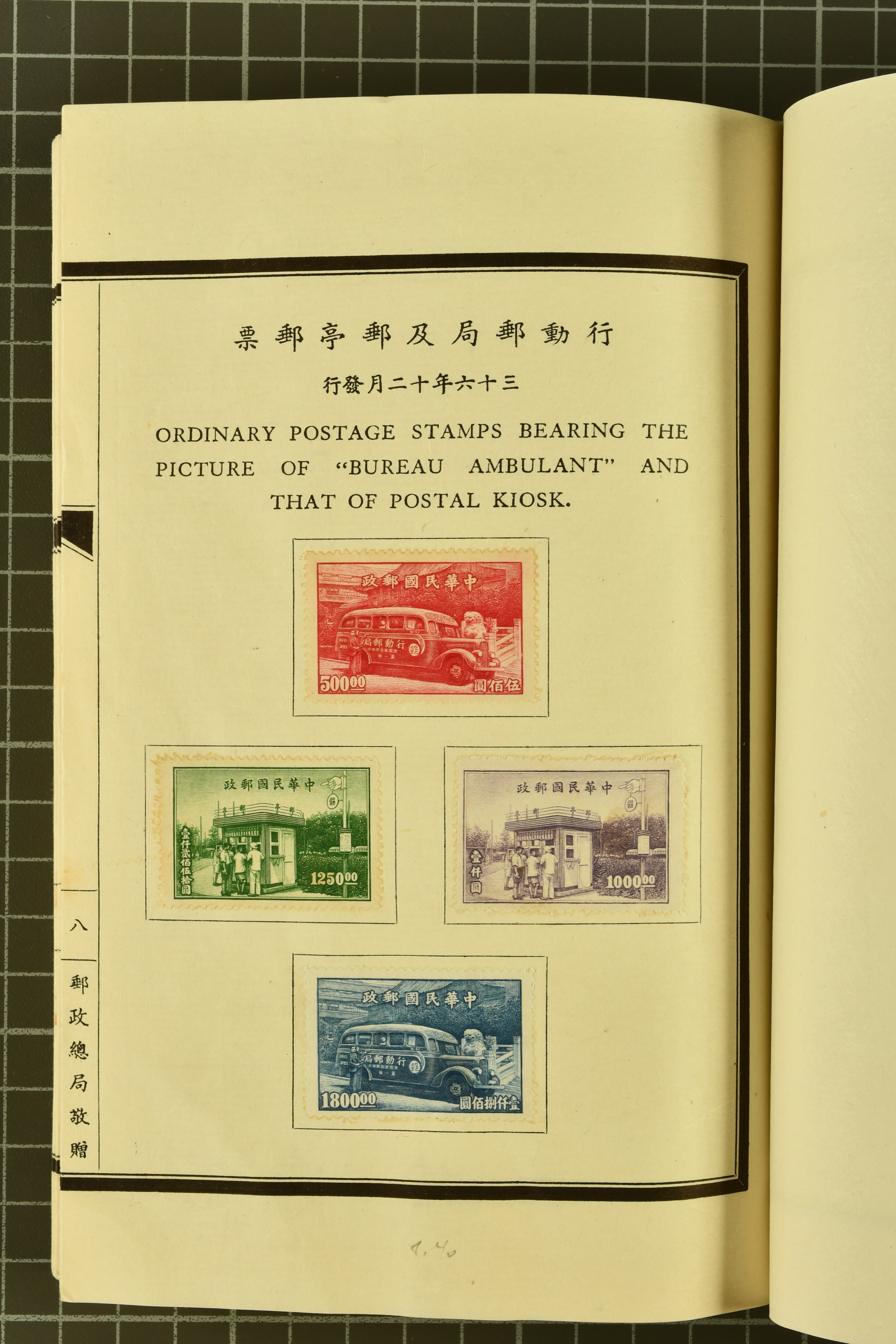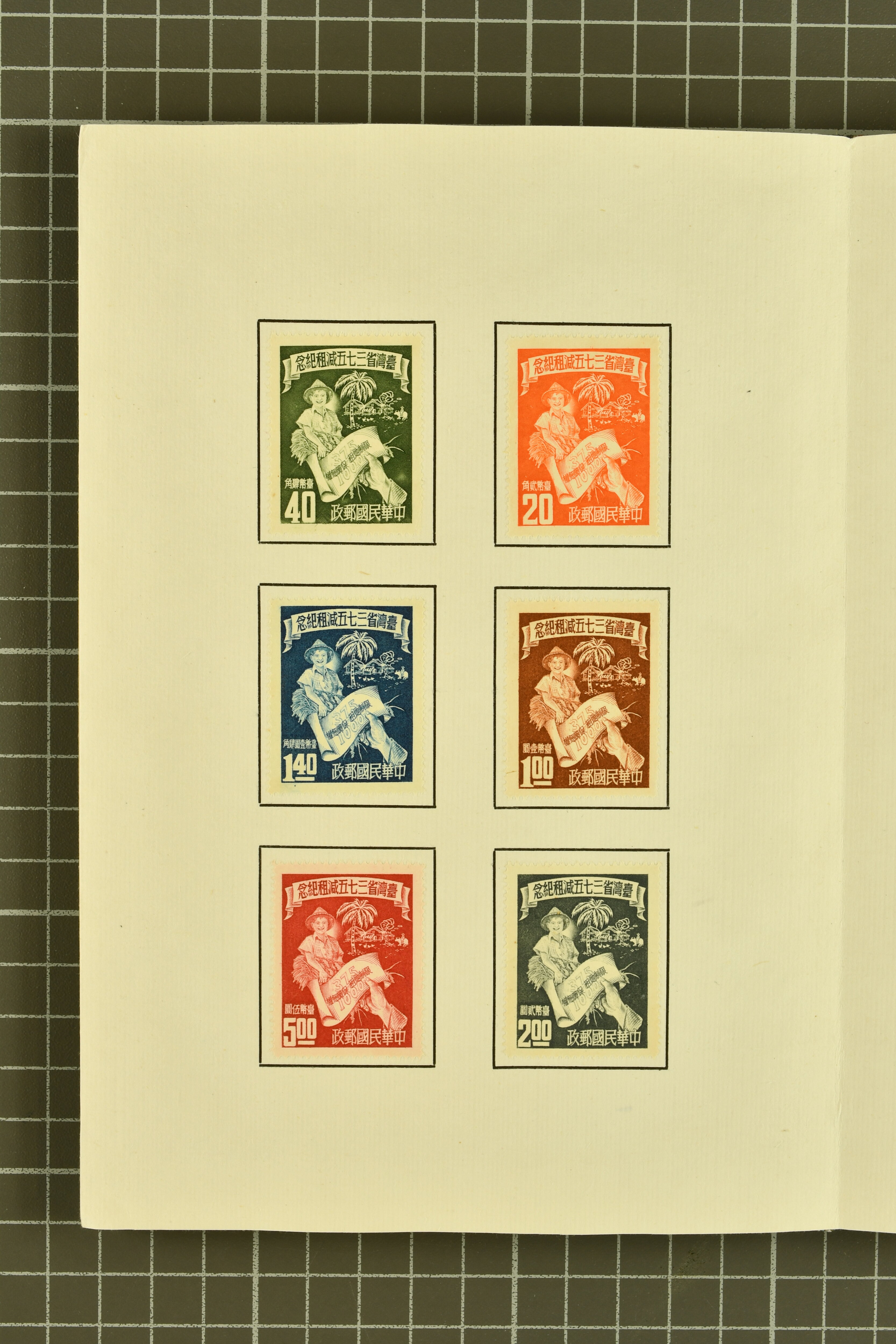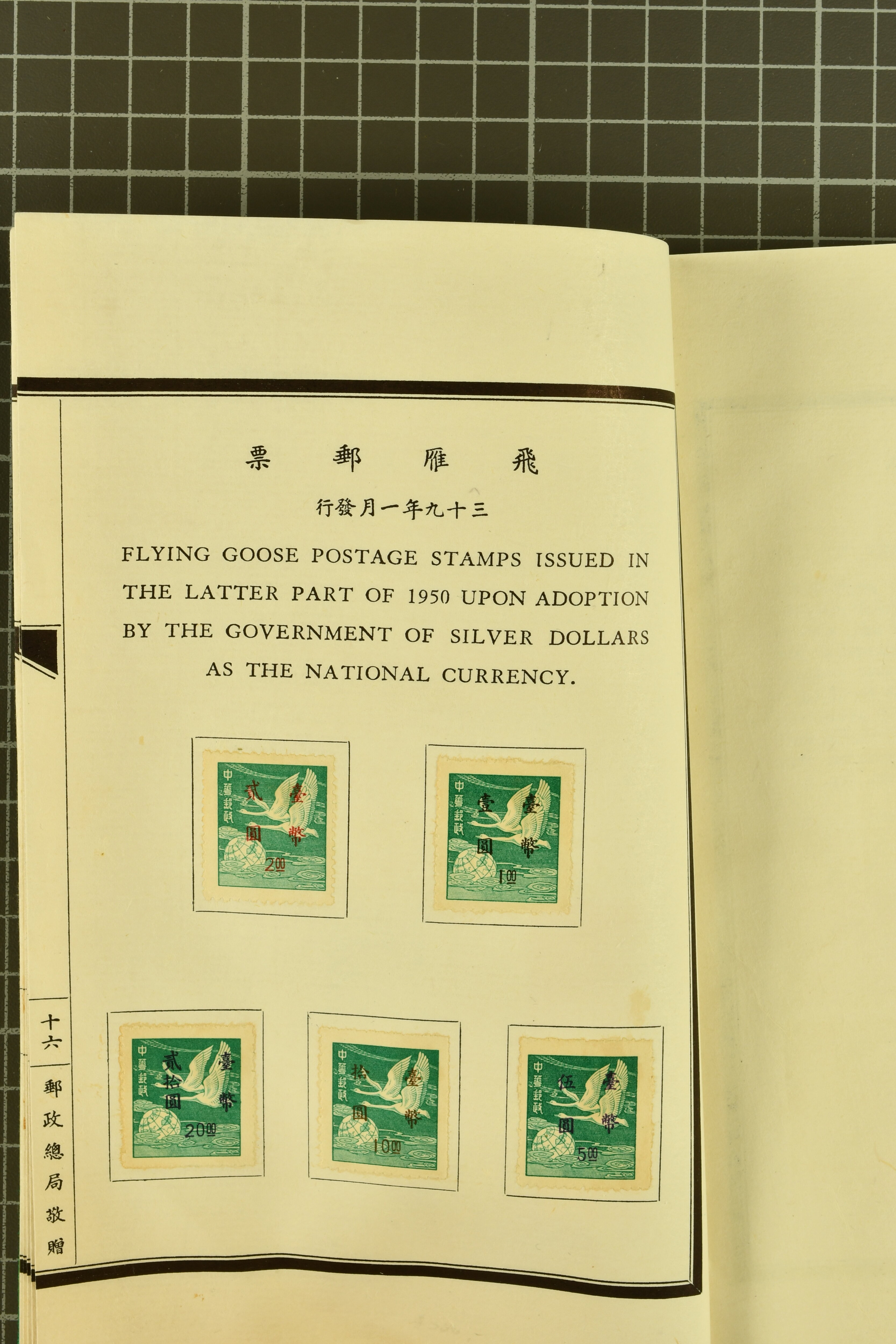 960 (*) image1951 (May): Green silk covered Book with printed "Compliments from the Directorate General of Posts, Republic of China, Taipeh, Taiwan", containing Nov 1945 5 s. - 10 yen, 1947 Chiang Kai-shek set of six, 1947 SYS set of ten, extremely rare 1 Jan 1950 "Whistling Swans" set of five overprinted values (Gi = £ 5'500) with the $ 2 surcharged at the Central Engraving and Printing Works; 1950 'Koxinga' set of fourteen, 1951 Districts set of four perf., imperf. Miniature Sheet with $ 2 blue-green somewhat toned, and various issues of China various common 1947 issues of China. The "Whistling Swans" set very fine, a rare and seldom seen Booklet in much above average condition Gi 2/9+30/35+41/50+100/104+111/124+125A/128A+MS128BA = £ 6'700+ (Image 1) (Image 2) (Image 3) (Image 4) (Image 5) (Image 6)