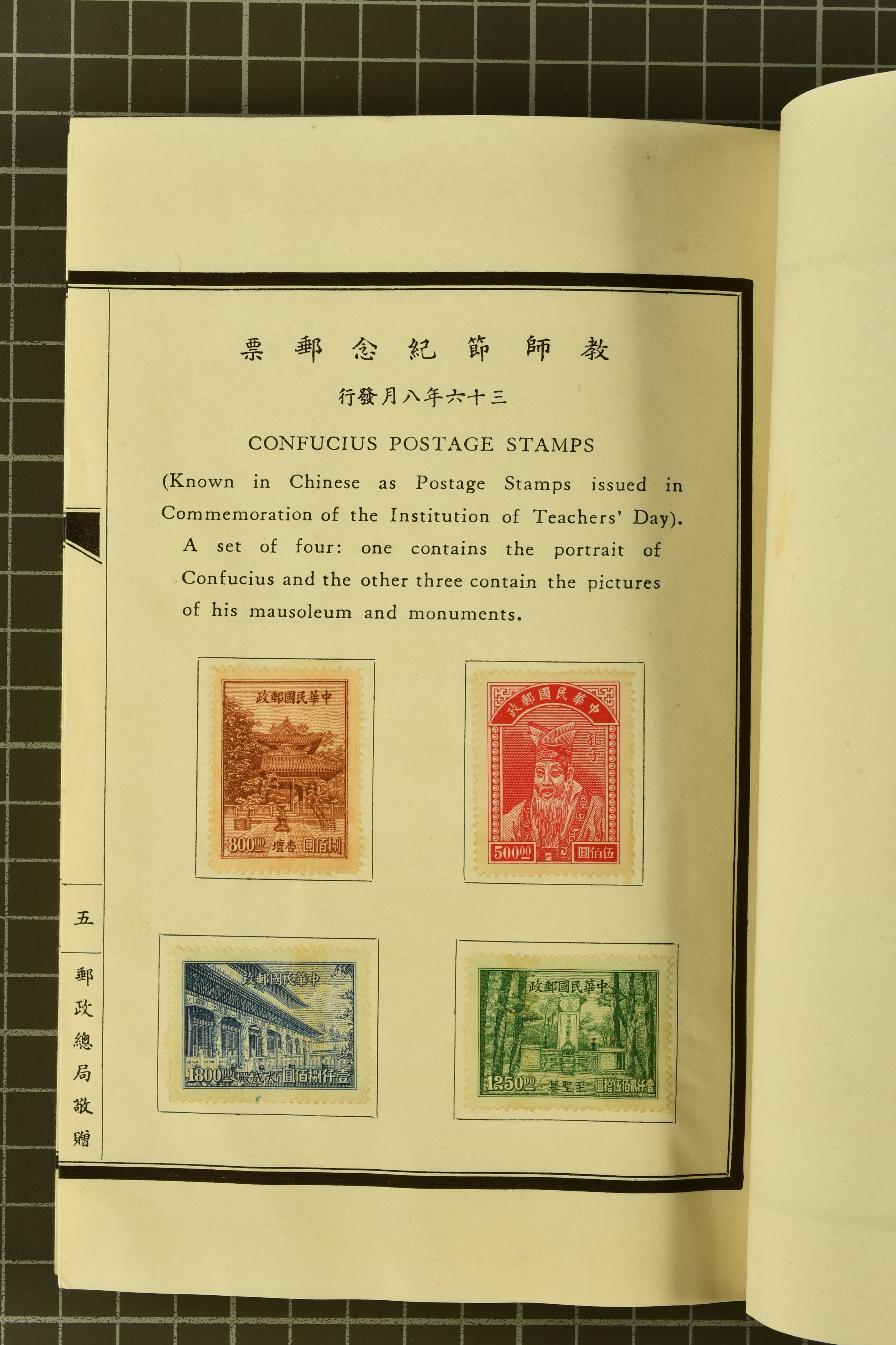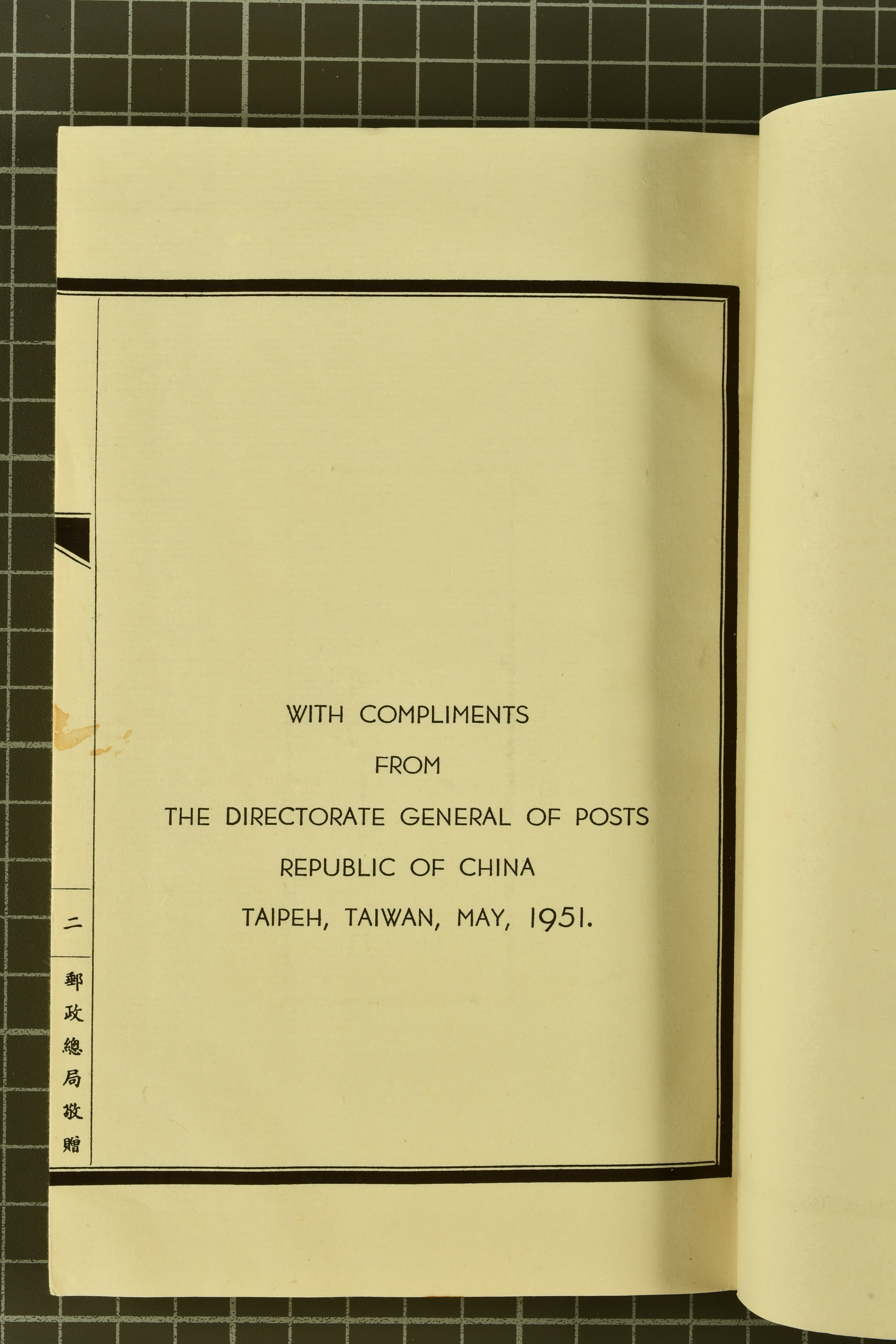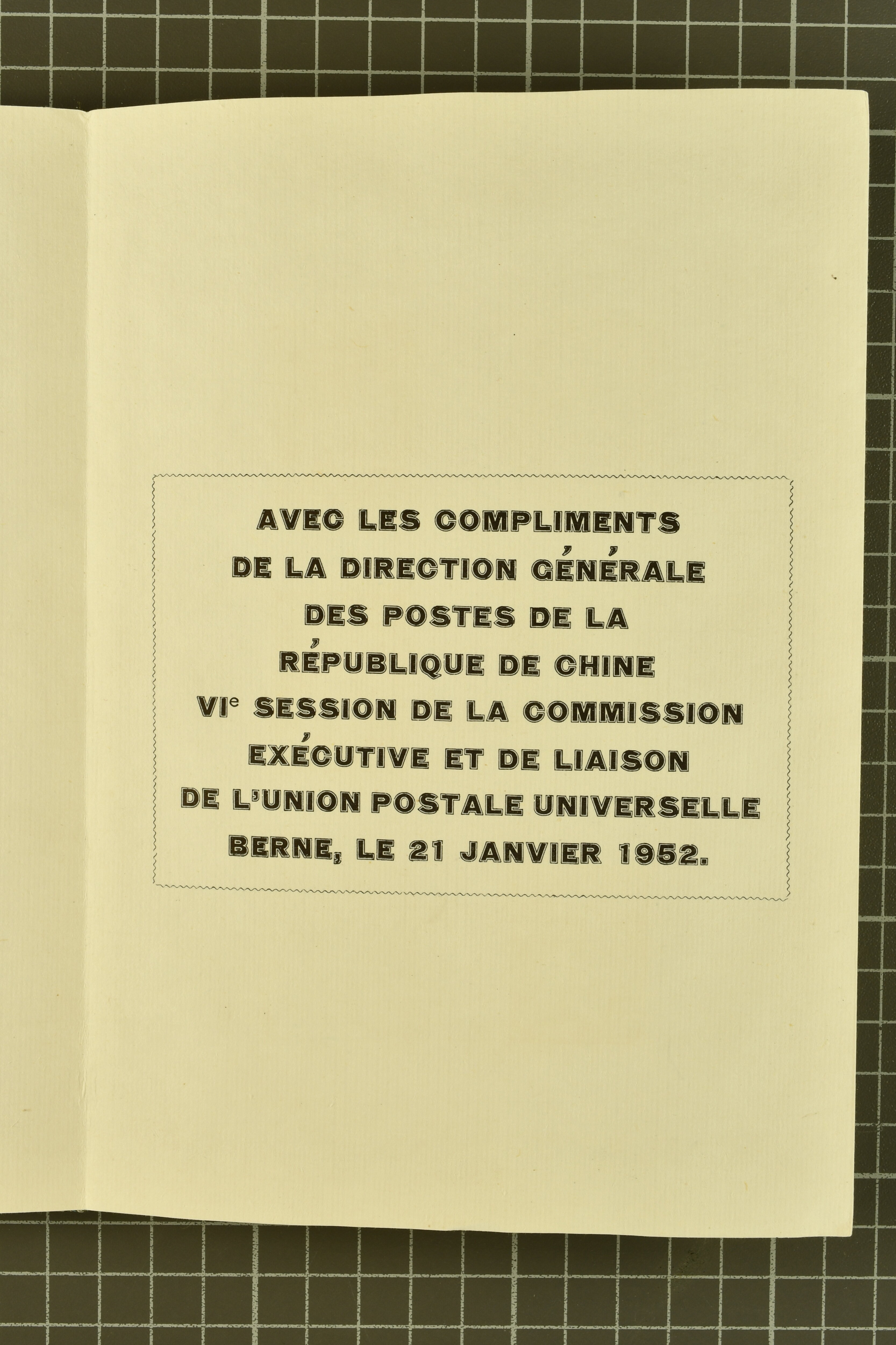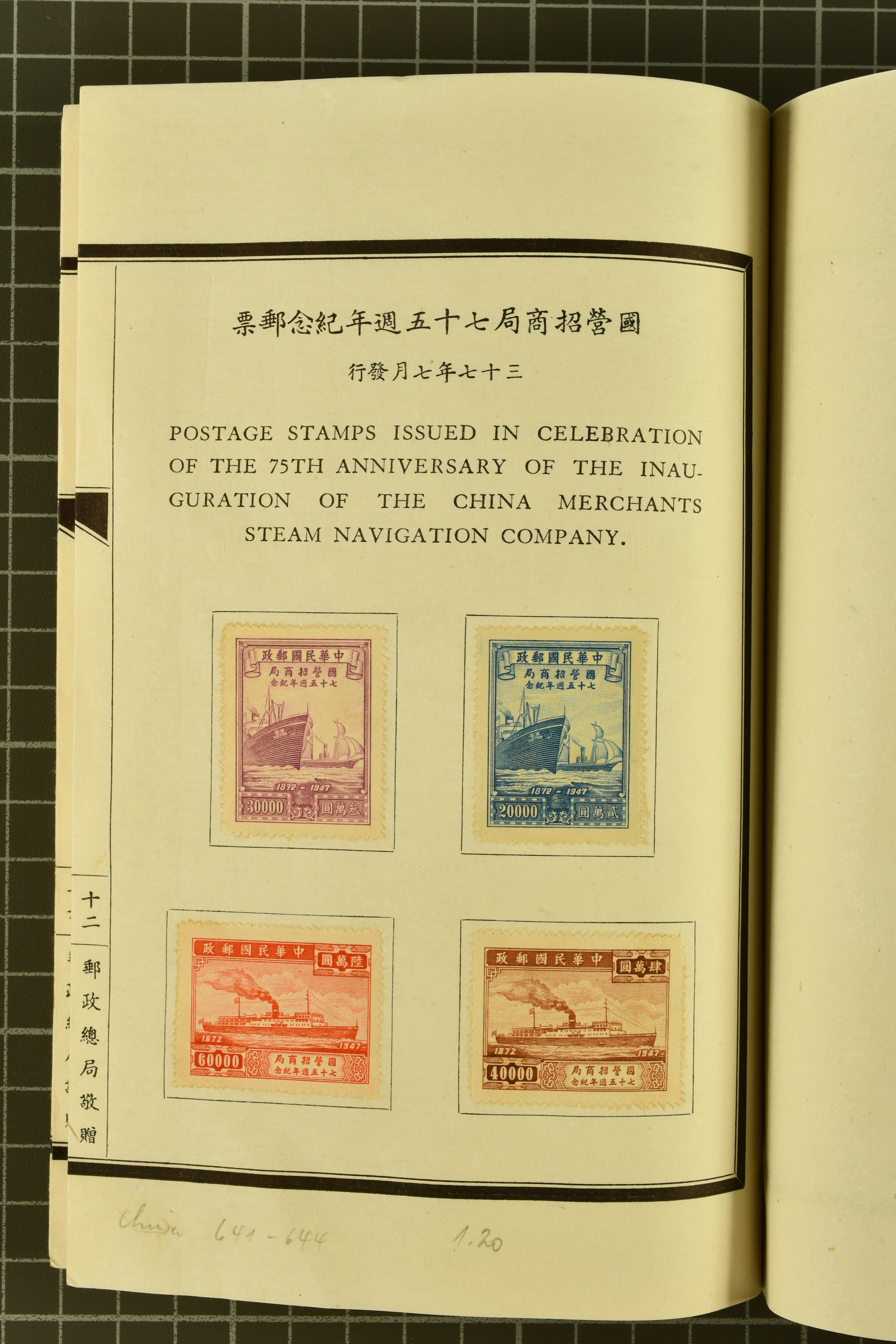 960 (*) image1951 (May): Green silk covered Book with printed "Compliments from the Directorate General of Posts, Republic of China, Taipeh, Taiwan", containing Nov 1945 5 s. - 10 yen, 1947 Chiang Kai-shek set of six, 1947 SYS set of ten, extremely rare 1 Jan 1950 "Whistling Swans" set of five overprinted values (Gi = £ 5'500) with the $ 2 surcharged at the Central Engraving and Printing Works; 1950 'Koxinga' set of fourteen, 1951 Districts set of four perf., imperf. Miniature Sheet with $ 2 blue-green somewhat toned, and various issues of China various common 1947 issues of China. The "Whistling Swans" set very fine, a rare and seldom seen Booklet in much above average condition Gi 2/9+30/35+41/50+100/104+111/124+125A/128A+MS128BA = £ 6'700+ (Image 1) (Image 2) (Image 3) (Image 4) (Image 5) (Image 6)