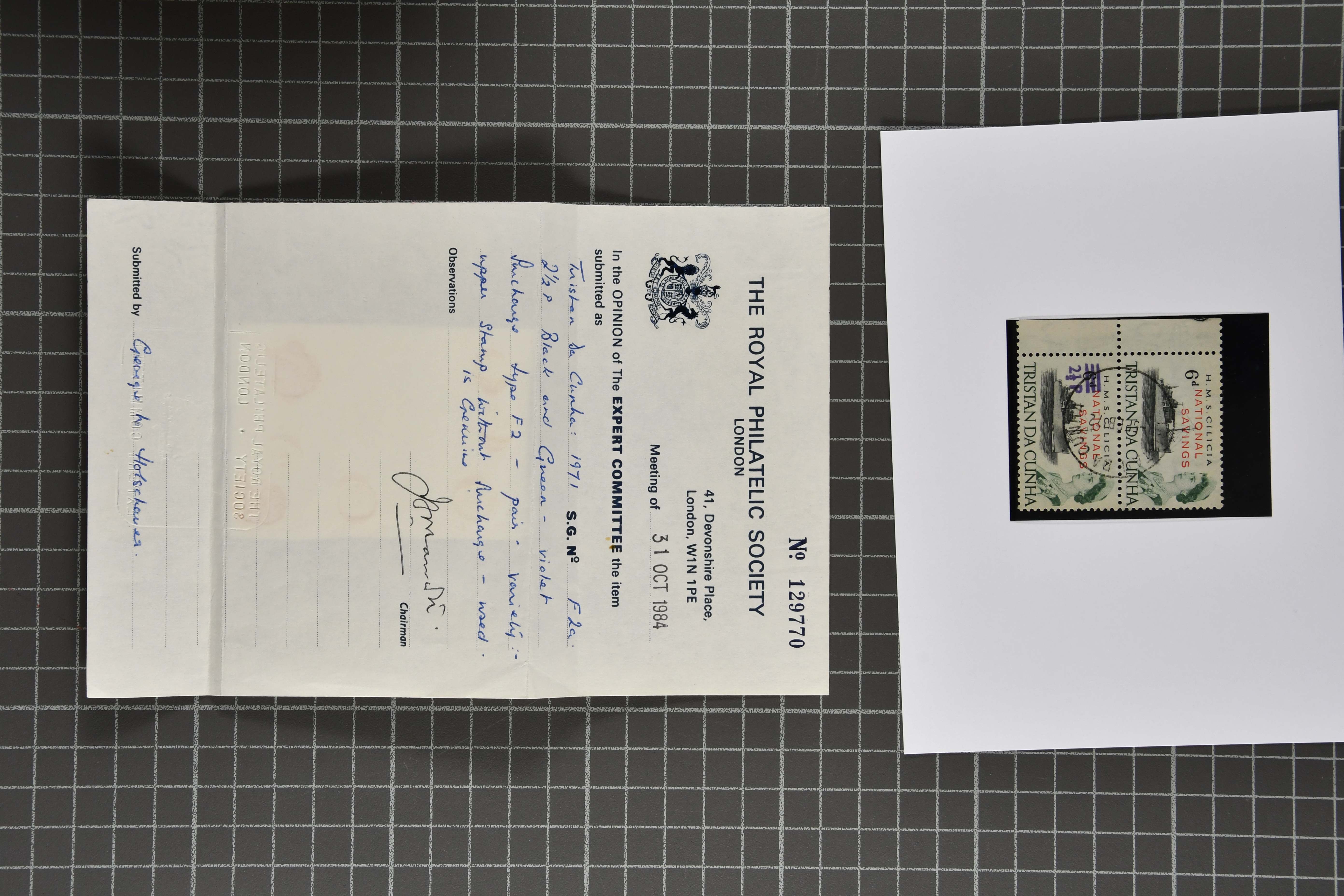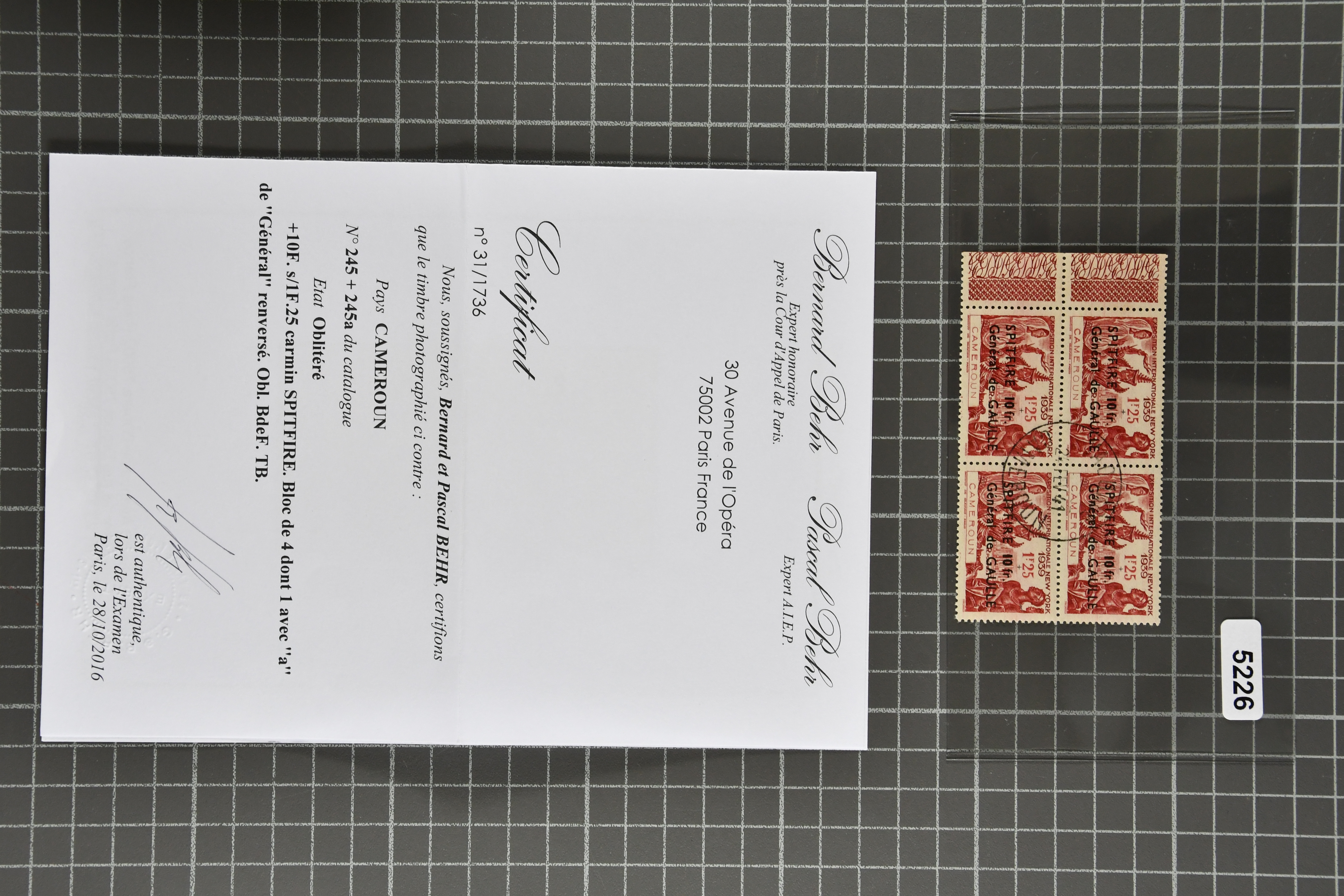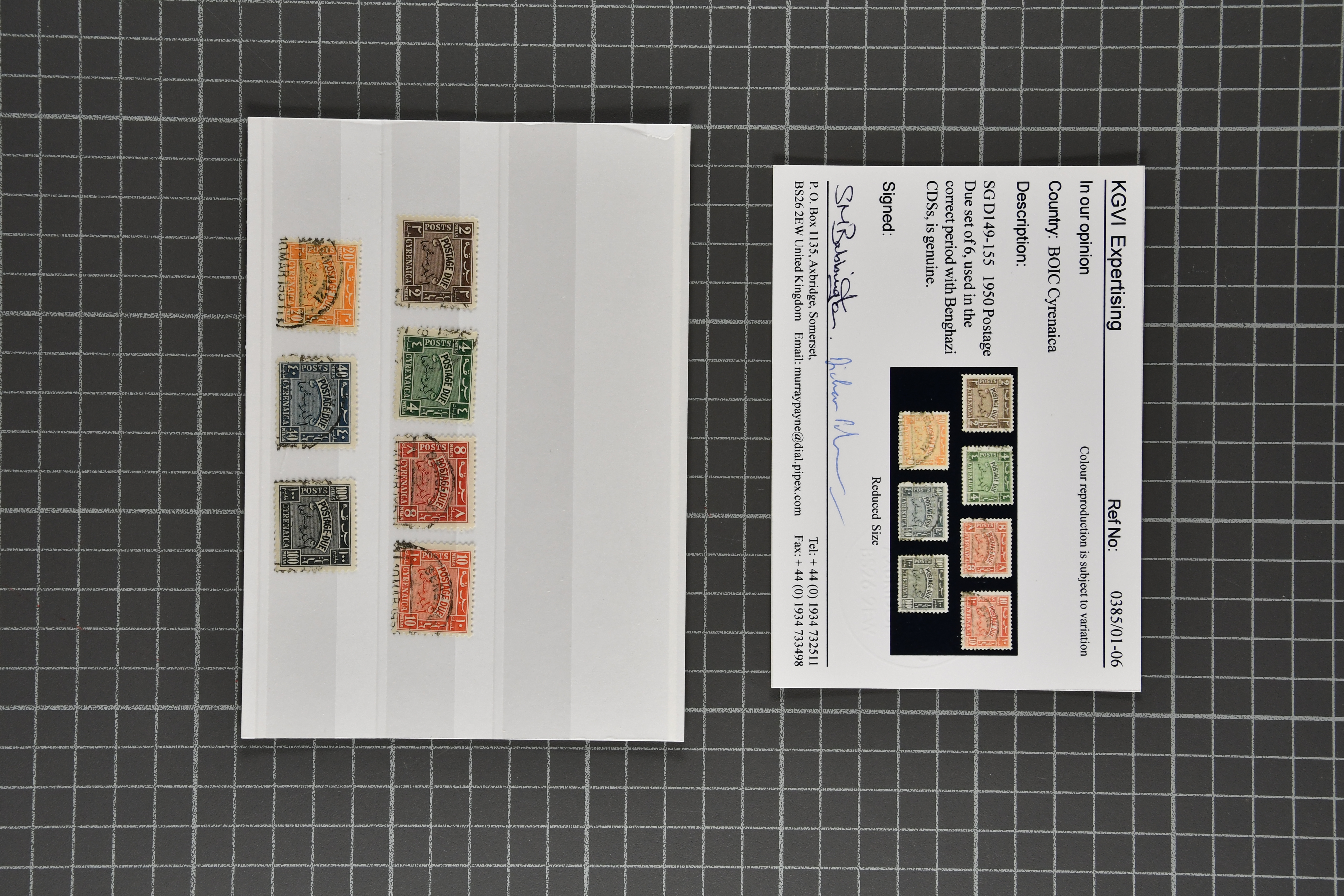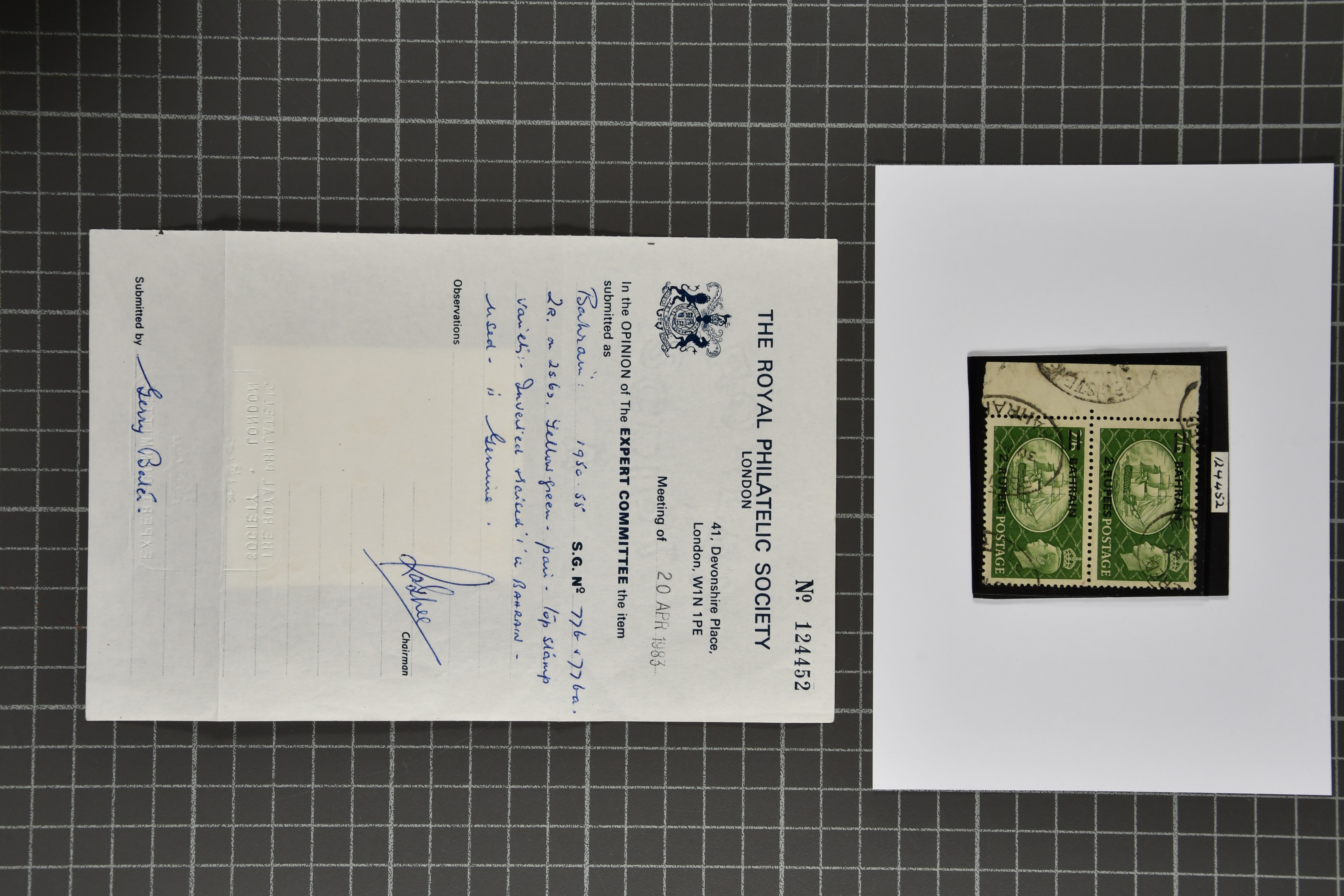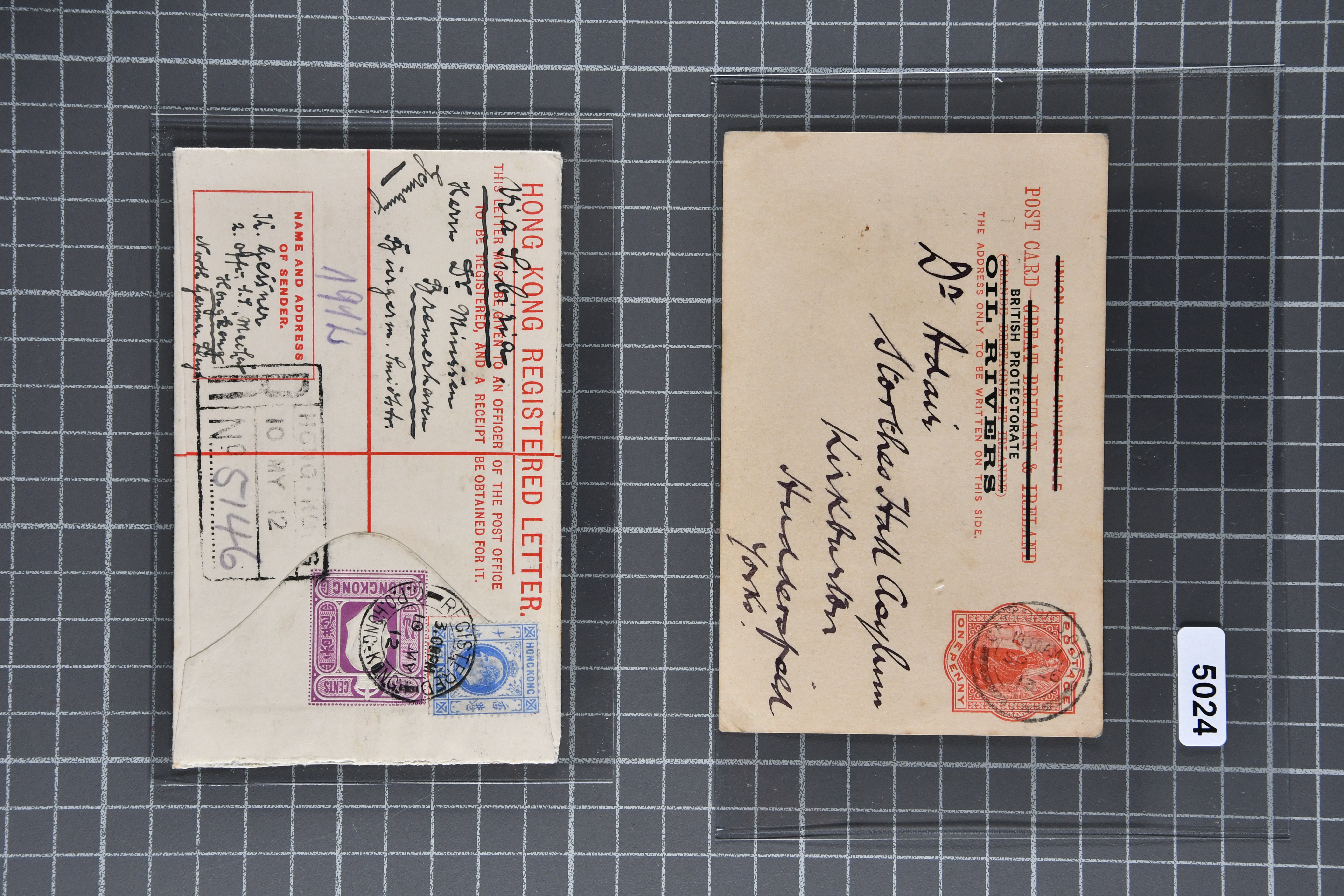 590 **/*/cover/(*) image1892-1971: An attractive group of 8 items several with certs. comprising: Niger Coast Protectorate 1892 1 d. vermilion postal stationery card used 1913 in GB with fascinating message; France 1941 “Spitfire/De Gaulle” block of 4 with “a of Général inverted” (cert. Behr); Bahrain 1955 2 r. on 2 s. 6 d. pair with surcharge varieties (cert. RPSL); GB 1971 Cilicia 2½ p. on 6 d. pair with surcharge omitted (cert. RPSL); Tonga 1937 Coronation 7 c. ultramarine, perf. 13, fine used (cert. RPSL, Gi £800); Cyprus 1938–52 5 s. reddish lilac & blue on striated chalk-surfaced paper (cert. BPA, Gi £ 750); Cyrenaica 1950 Postage Dues complete set of 7 (cert. KGVI, Gi £ 1,000); and Hong Kong 1907 registered envelope uprated to Germany 1912. The odd fault or imperfection, otherwise in the main fine. A varied assembly of scarce items and varieties, ideal for the specialist (Image 1) (Image 2) (Image 3) (Image 4) (Image 5) (Image 6) (Image 7) (Image 8)