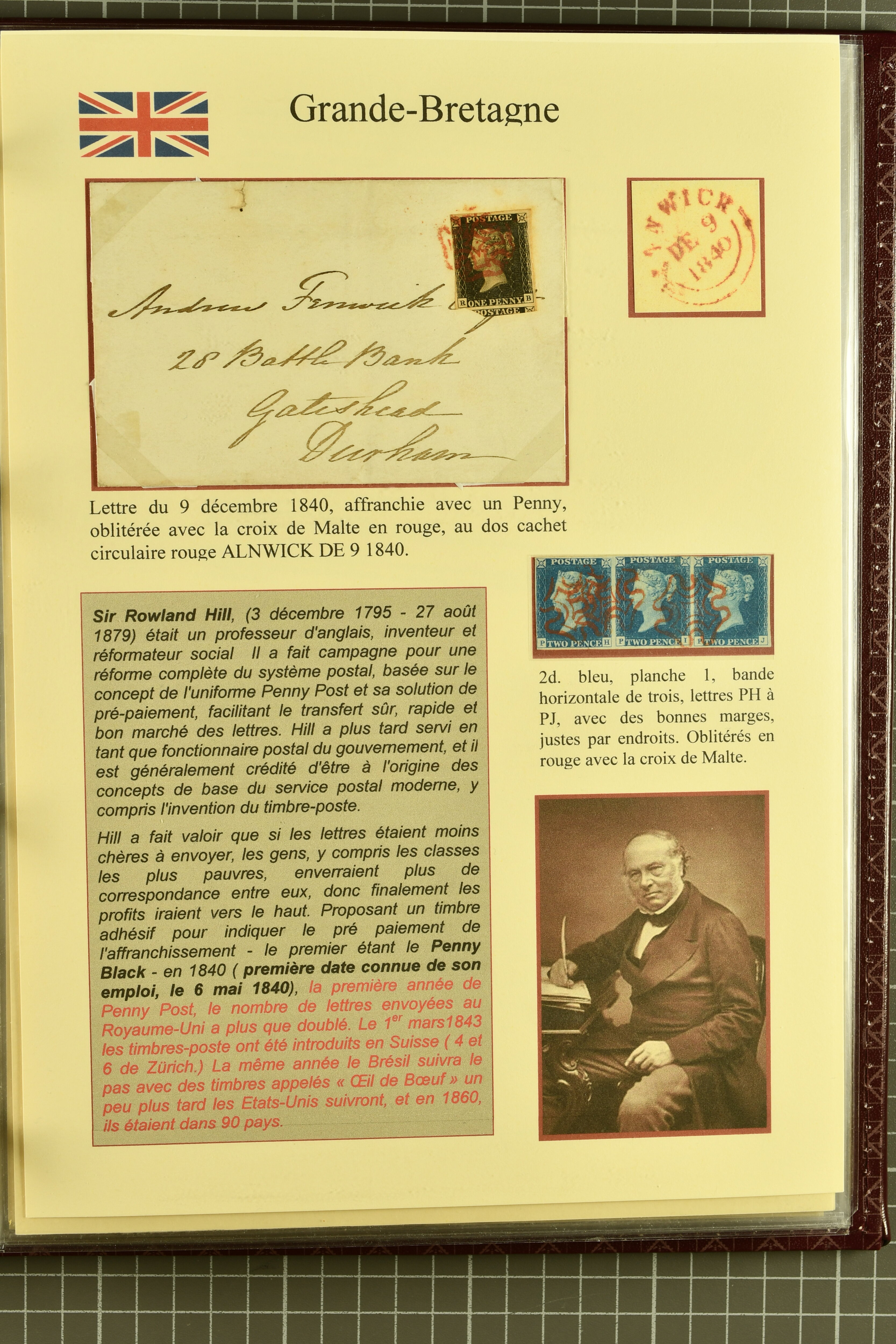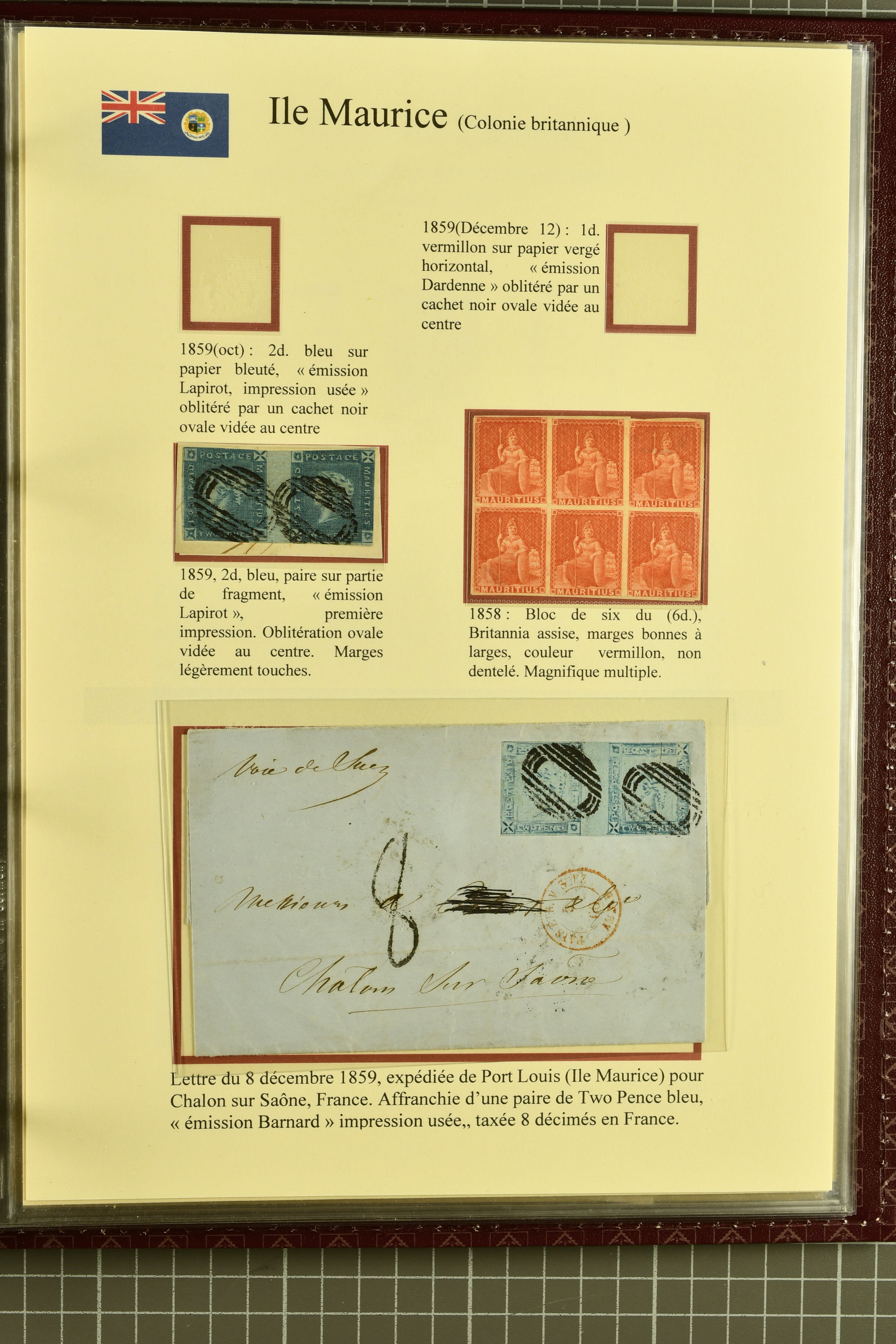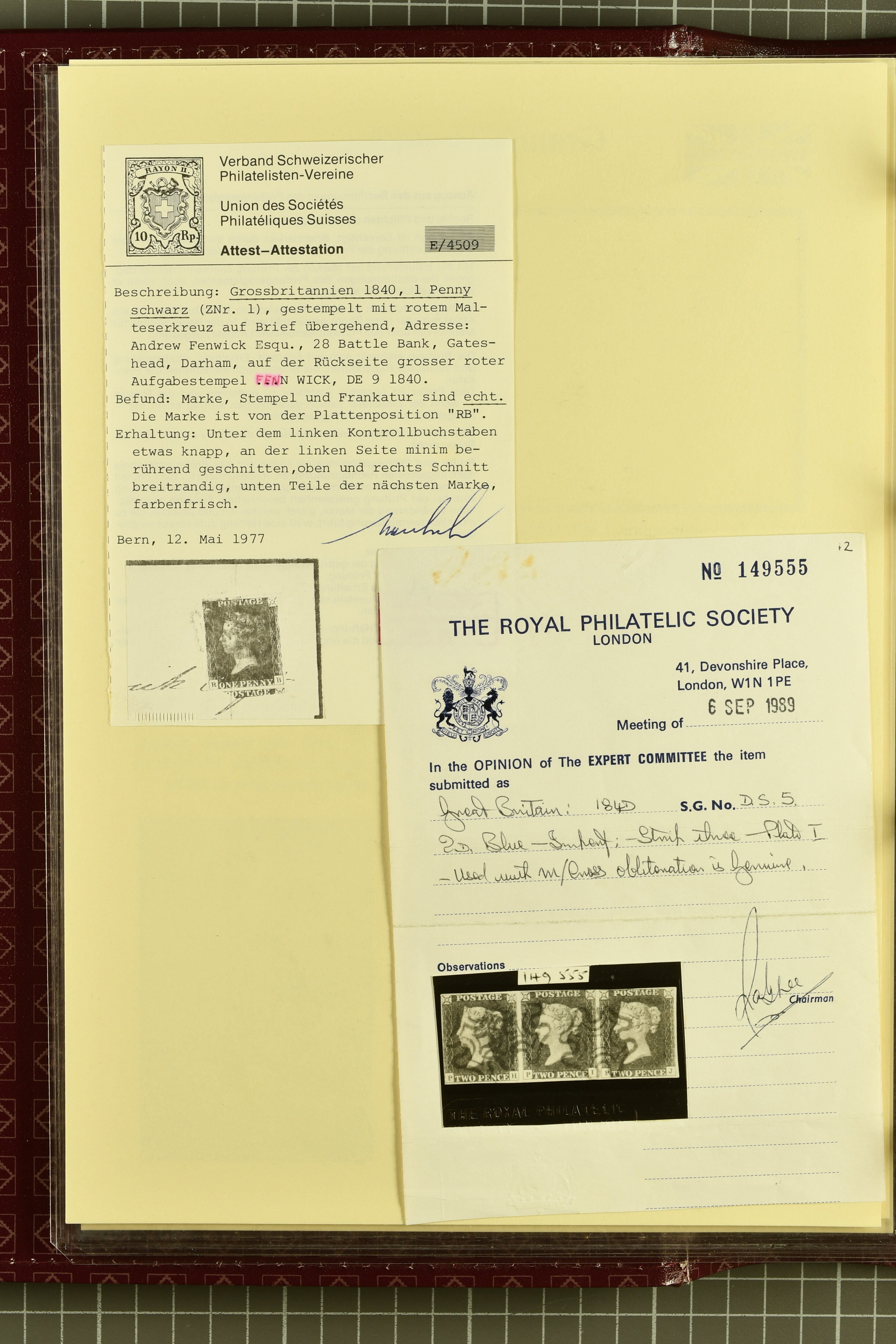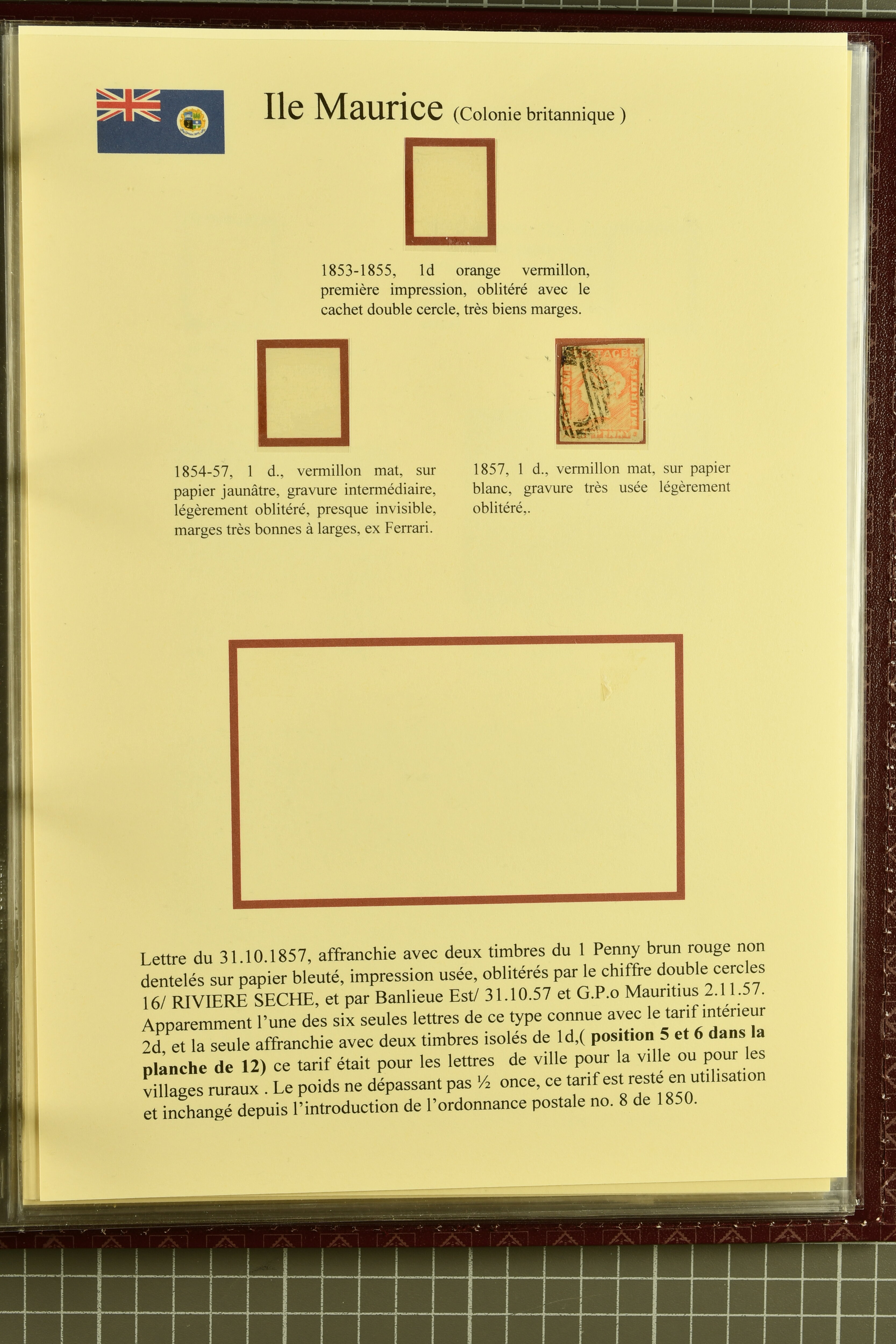 130 piece/cover/bof image1840/: Collection with Great Britain with 1840 1 d. black used, 1 d. black used on Dec 1840 cover cancelled by red MC and March 1841 cover front with 1 d. black cancelled in black, 1840 2 d. blue pl. 1 in an attractive horizontal strip of three cancelled by Mltese Crosses in red (cert. RPSL); 1841 1 d. red from black plate 9 in an unused block of four (ex the Dublin Find, and illustrated in the Madden/Louis handbook on page 35); 1841 1 d. red on covers (3), thereafter with Colnies incl. Antigua with rare 1862 6 d. green (Gi 1 = £ 800), Bahamas with 1860 1 d. dull lake unused and 1887 cover to London franked by 1882 4 d. rose, Basutoland 1933 unused set of ten (Gi = £ 325), Bechuanaland from 1885 incl. 1888 ½ d. vermilion optd SPECIMEN in single and pair (Gi 40s = £ 225), 1 d. and 1 s. handstamped SPECIMEN, 1888 4 d. on ½ d. vermilion unused and optd. SPECIMEN (Gi 53+53s= £ 200), Bermuda with 1865 1 d. rose-red in an unused block of four (ex collection Sir Henry Tucker), 1 d. pale rose on local cover and 3 d. brownish-buff unused; British Honduras 1865 first issue set of three unused with part og. (Gi = £ 950); Caymans 1900 set of two unused, Gambia 1856 4 d.brown and 6 d. each cancelled in red (Gi = £ 400+), Hong Kong 1862/63 8 c. buff, 12 c. pale greenish-blue and 18 c. lilac used, New Brunswick 1851 3 d. red on blued used, 6 d. yellow on blued used (Gi 2+4 = £ 1'275) and an attractive cover with four margin 3 d. red to Richibuchto; Nova Scotia with 1851 1 d. red-brown vertical pair used, 3 d. blue used, 6 d. yellow-green lightly cancelled used example (Gi = £ 1'900) together with single 3 d. blue on cover; Straits Settlements 1865 1½ c. on ½ a. and 2 c. on 1 a. unused; Mauritius with 1854/57 1 d. orange used, Britannia (6 d.) vermilion in an unused block of six (Gi = £ 420+) 1859 Lapirot 2 d. blue early impression pair on piece and an 1859 entire letter bearing a worn impression horizontal pair; St. Helena with 1856 6 d. blue unused and 1863 1 d. lake unused, together with an 1893 mixed issue four-colour franking cover; Nevis with 1862 1 d. unused (shades), Newfoundland with 1857 1 d. brown-purple unused, 1860 2 d. orange-vermilion (Gi 10) unused and 3 d. green used - all with Eichele opinions (Gi = £ 1'000+), Niger Coast / Oil Rivers with piece bearing five stamps incl. ½ d. on 2 d. cancelled in blue (Gi 30 = £ 800) and a fine 1895 registered stationery card; Queensland with imperforate 1860 1 d. rose unused (cert. RPSV, 1982) and superb 6 d. green used (Gi 1+3 = £ 7'000+) Sirmoor 1878 1 d. pale green unused, Tasmania with 4 d. orange, Pl. I and pl. II fine used examples, Wadwhan 1888/94 ½ p. used, Western Australia with 1854 imperforate 1 d. black used (2) and wonderful 1 d. black rouletted (showing portions of five adjoing stamps (cert. Ceremuga, 2018); 4 d. blue unused (2) and 1855 1 s. grey-brown and 1 s. pale brown unused (Gi 1+2+3+4b+4c = £ 3'750). A fine and attractively arranged collection with many fine and rare stamps present (Image 1) (Image 2) (Image 3) (Image 4) (Image 5) (Image 6) (Image 7) (Image 8) (Image 9) (Image 10) (Image 11) (Image 12) (Image 13) (Image 14) (Image 15) (Image 16) (Image 17) (Image 18) (Image 19) (Image 20) (Image 21) (Image 22) (Image 23) (Image 24) (Image 25) (Image 26) (Image 27) (Image 28) (Image 29) (Image 30) (Image 31) (Image 32) (Image 33) (Image 34) (Image 35)