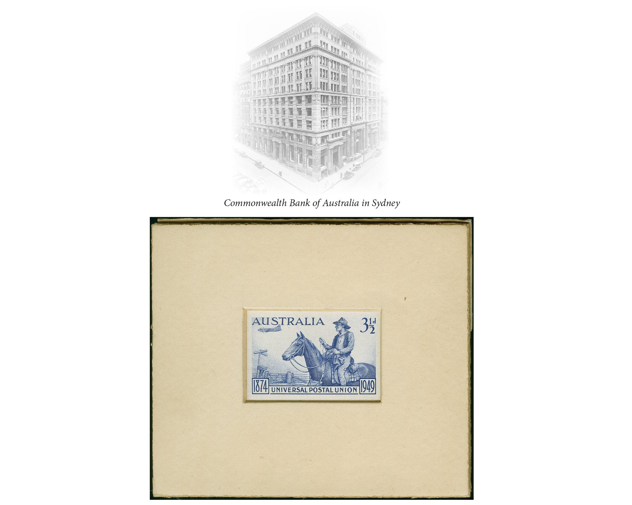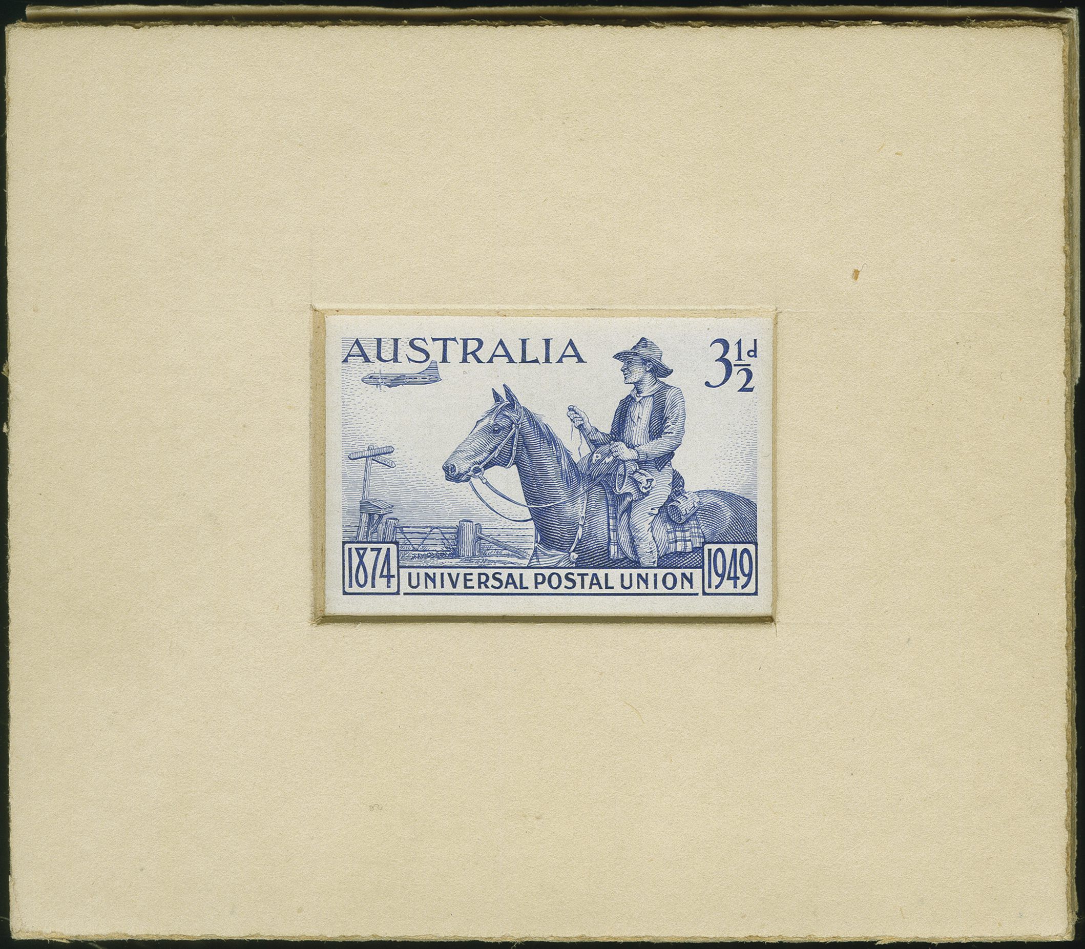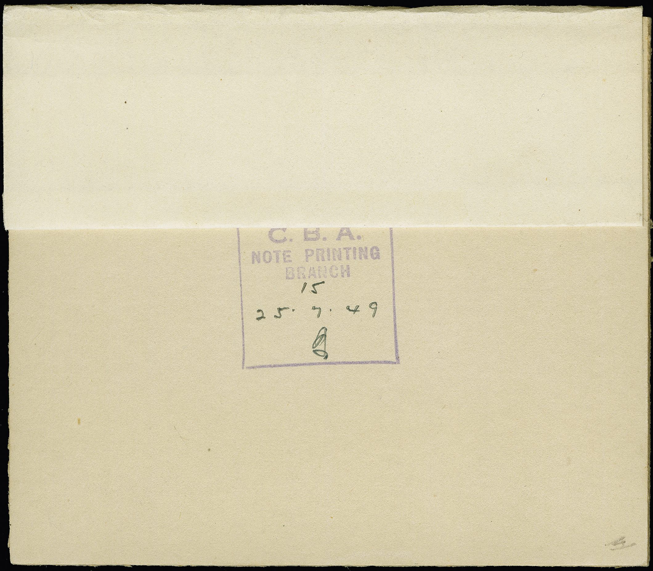 90118 (*) image1949: Sunken Die Proof for 3½ pence ultramarine (lighter shade than issued), marked on reverse ‘C.B.A. NOTE PRINTING BRANCH’ framed in violet with manuscript ‘15, 25.7.49’ and signature below. A splendid and rare Proof. Just 8 examples distributed (Image 1) (Image 2) (Image 3)