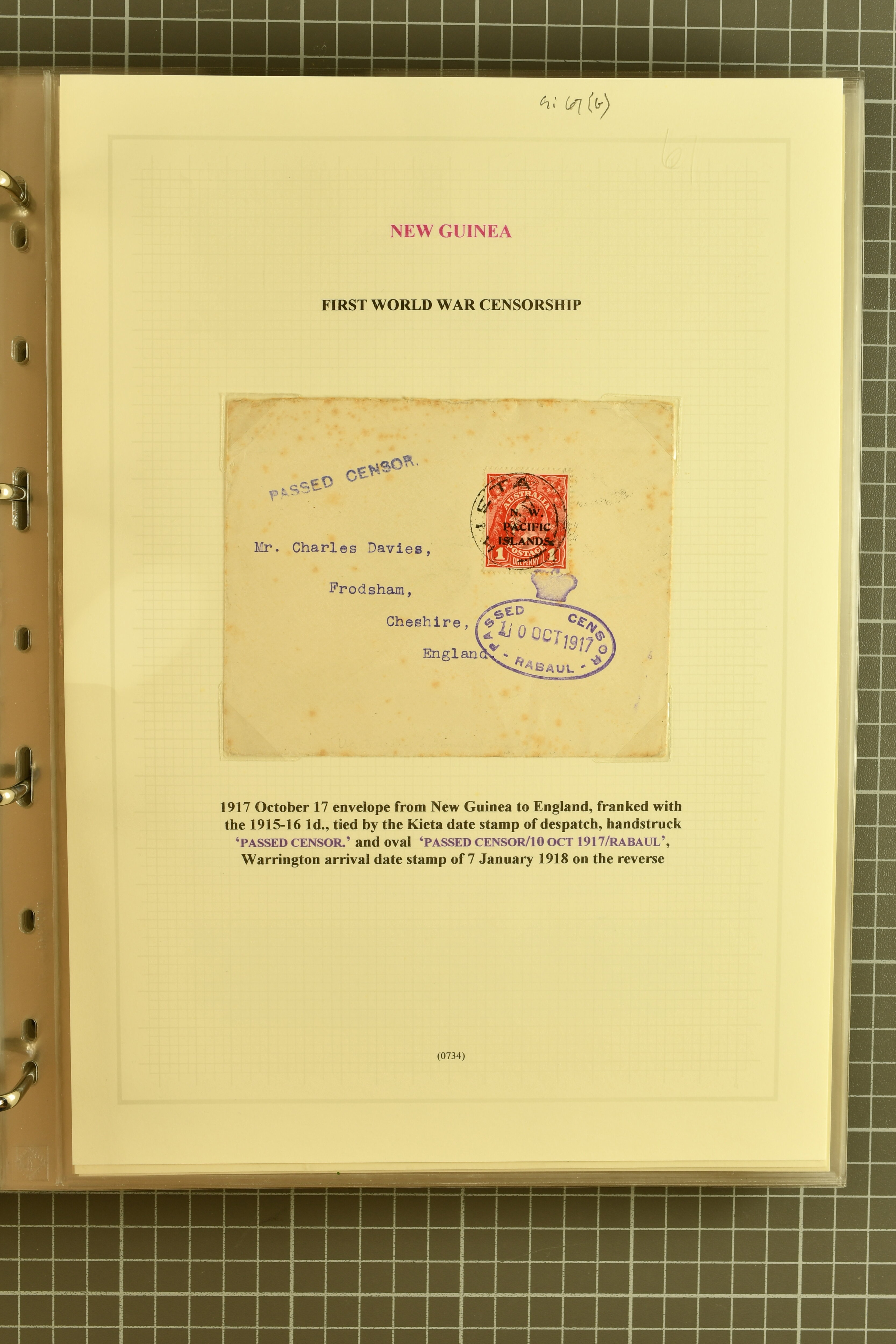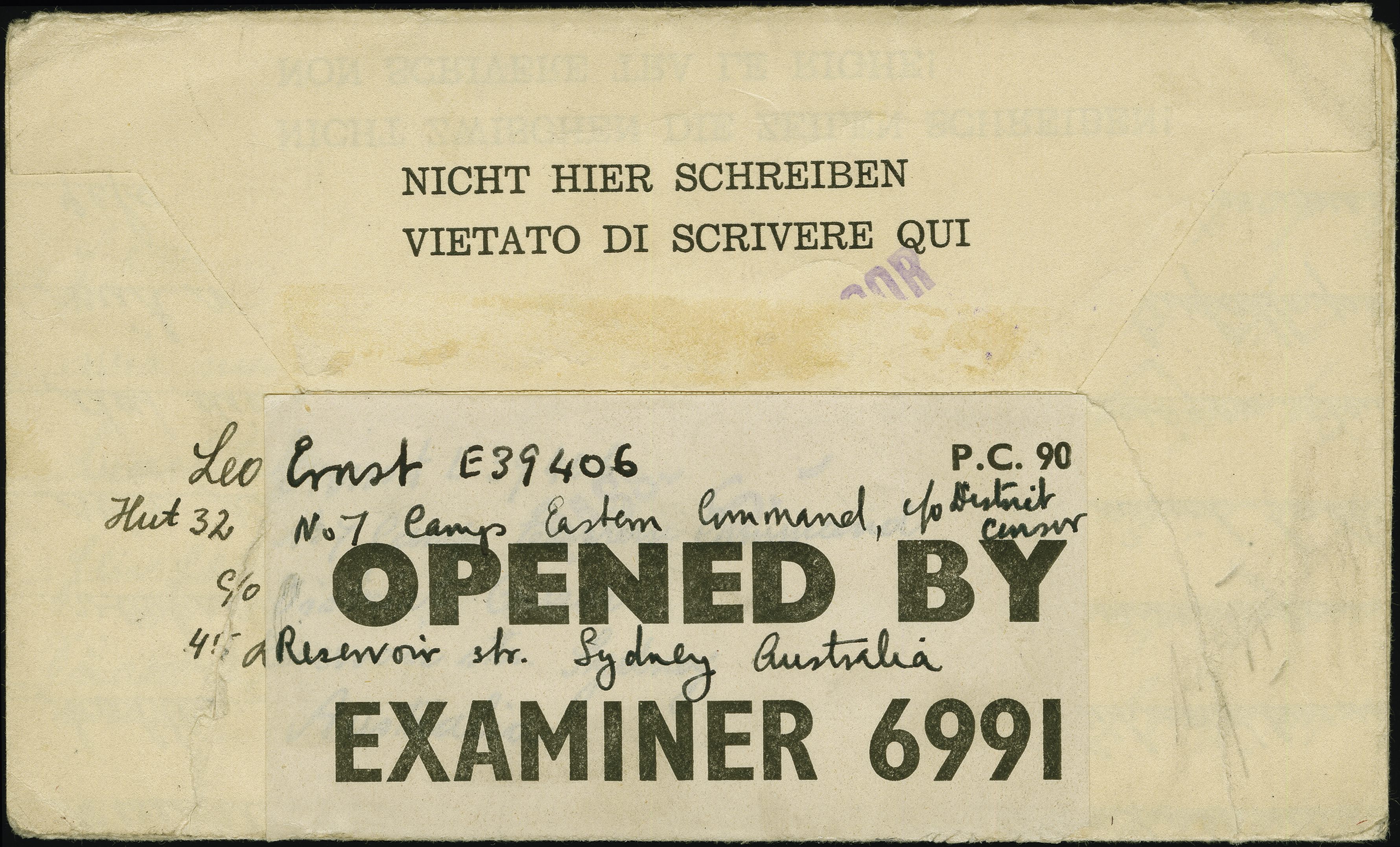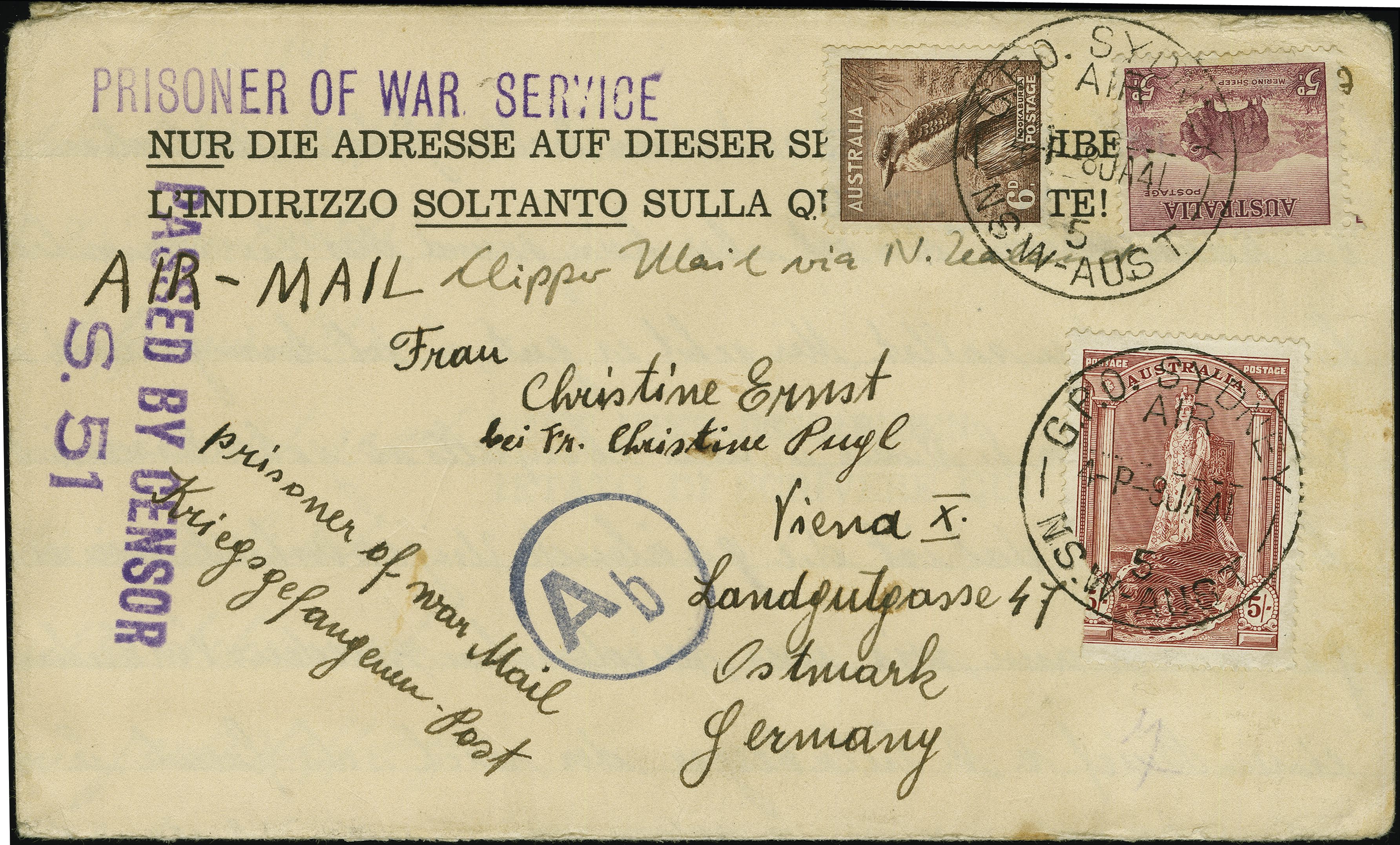 90117 cover image1937: 5 shillings claret, 5 pence purple and 6 pence purple-brown, used with cds “G.P.O SYDNEY 3 JA 41” to special formula letter to Germany, written by a prisoner of war interned in the 32th hut of the 7th Camp at Sydney, sent by clipper mail via New Zealand then by airmail via USA, censored on transit with bluish-violet two-line “PASSED BY CENSOR S.51” and circle “Ab”, the 5 shillings lower left corner missing, still a fine and fresh cover, pre-dating the entry of the USA into the war theaterPrisoner of war mail was granted the free frank status since the Congress of Rome, however the Conference on airmail at the Hague in 1927 redefined airmail as being an extraordinary service on which UPU rules on prepayment did not apply, hence the mandatory franking for POW airmails (Image 1) (Image 2)