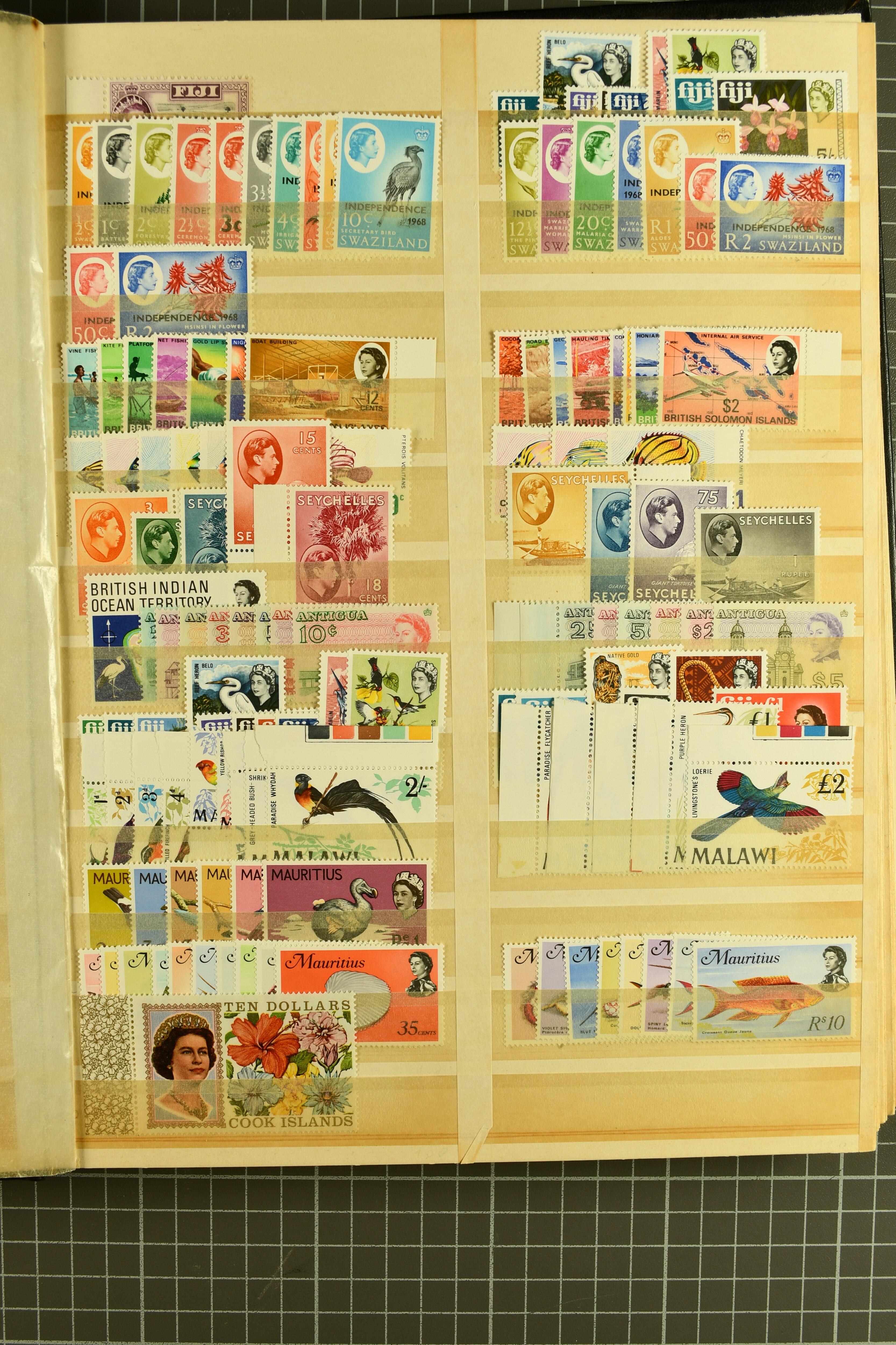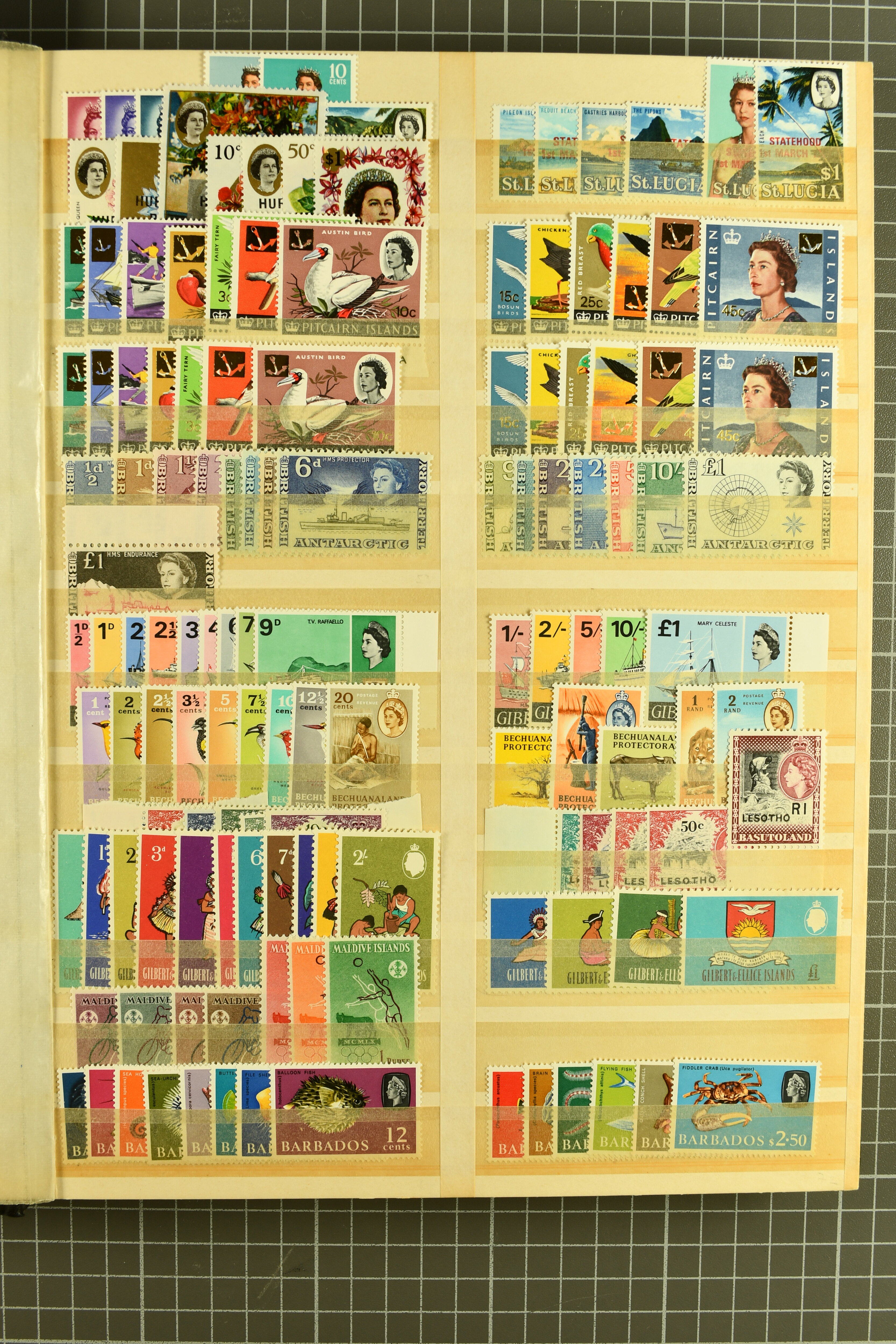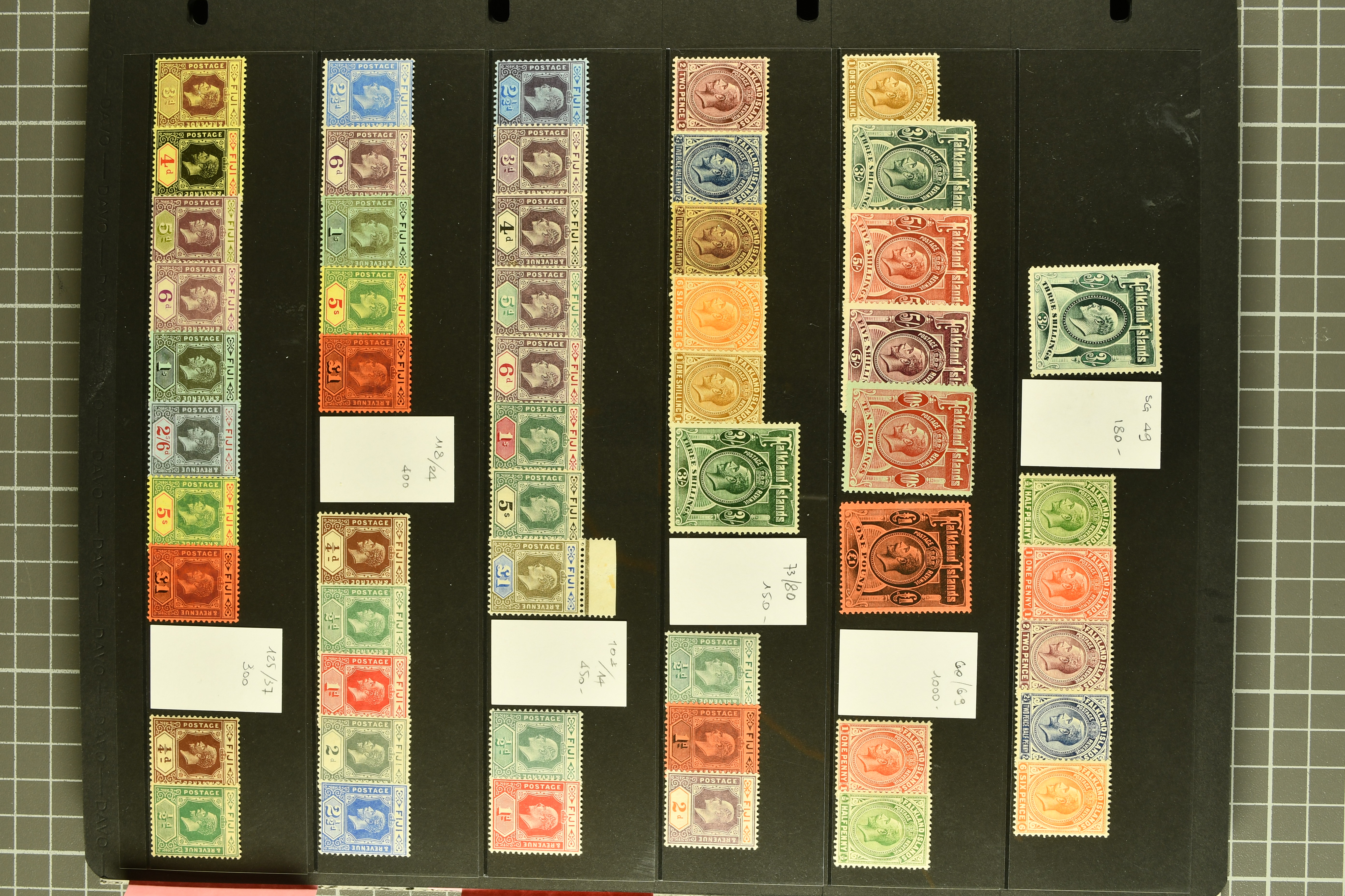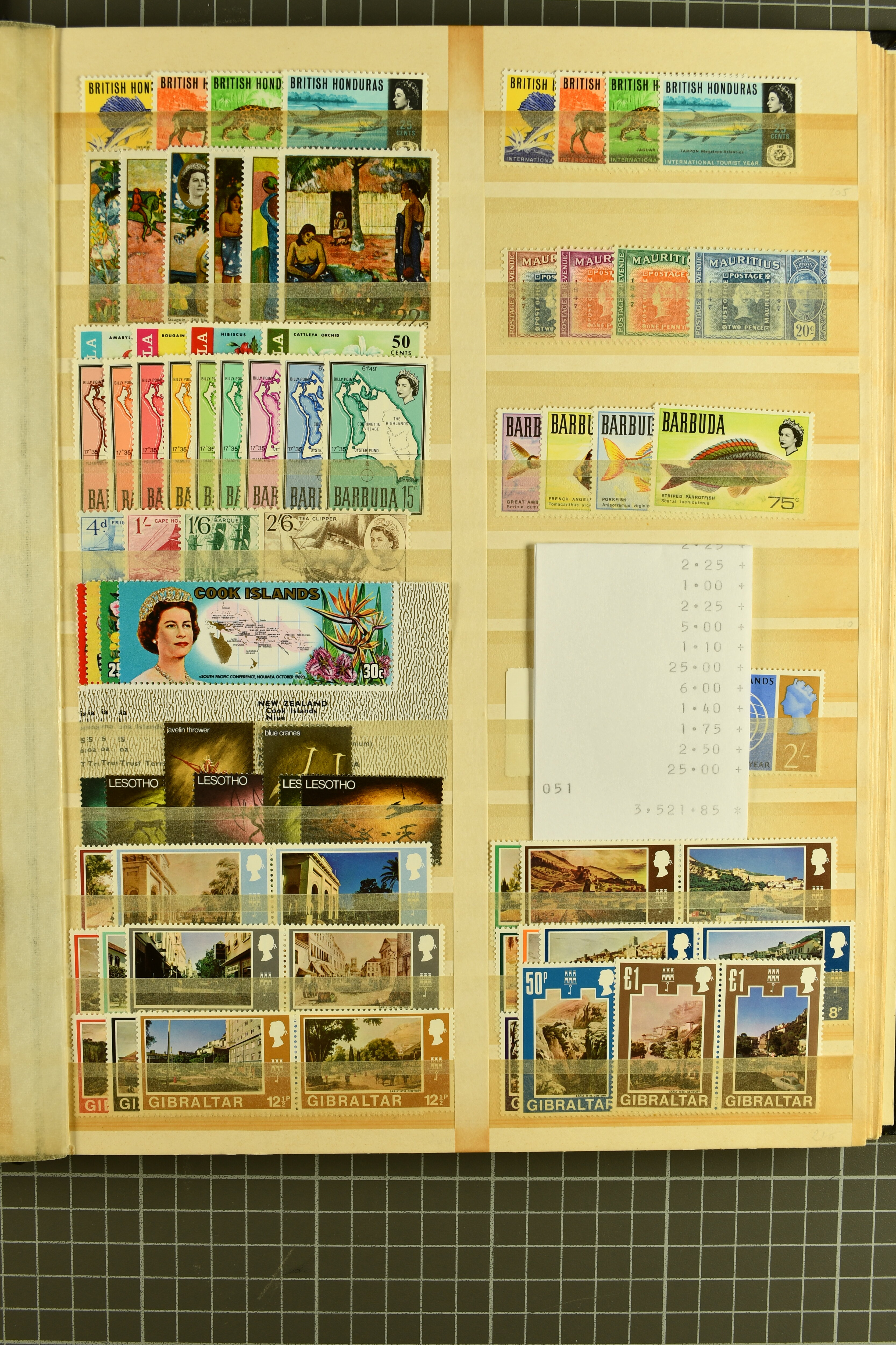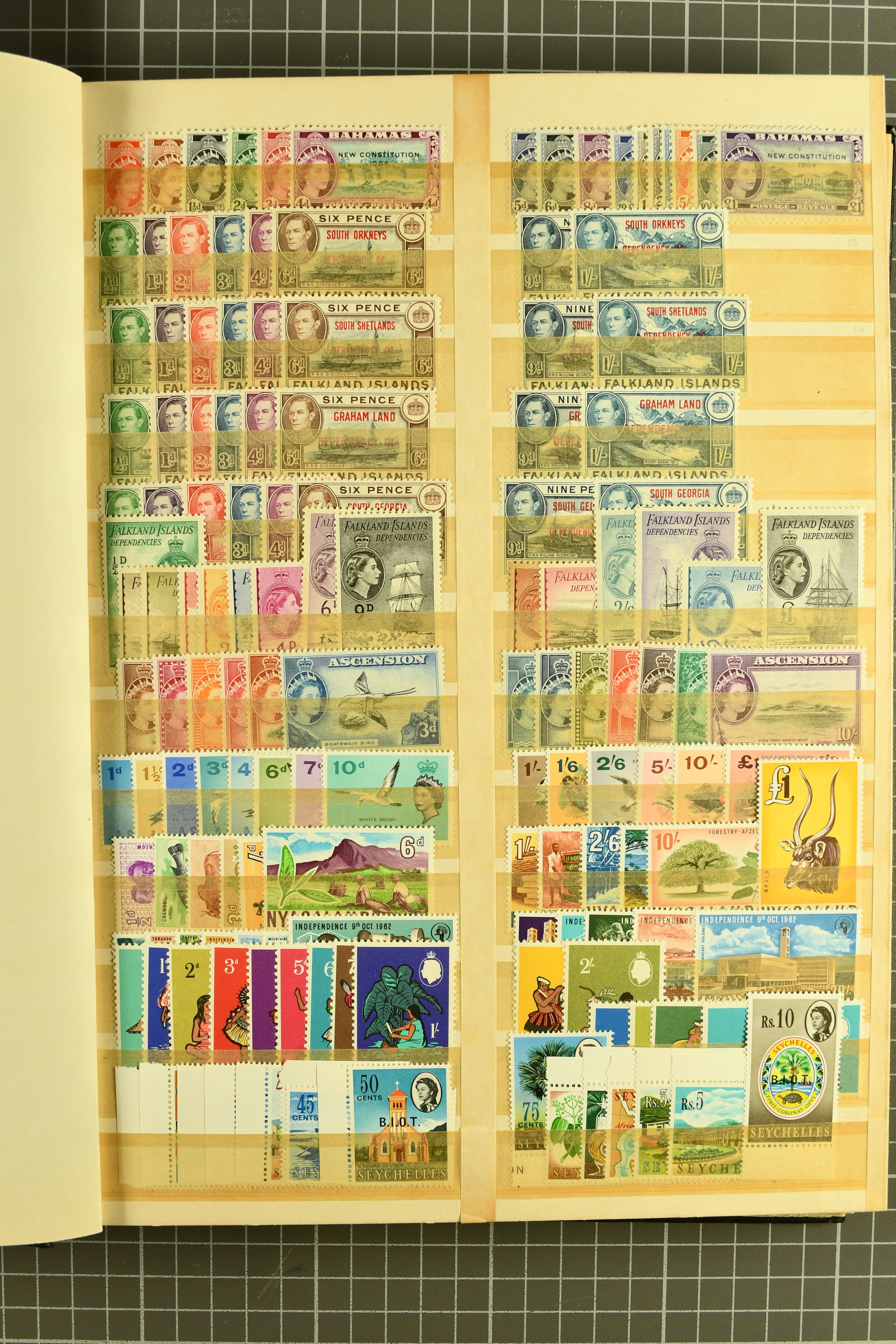 584 1870/1960ca.: Commonwealth Dealer's stock in ten albums with many good and predominantely unused sets from Aden to Zanzibar, including Bahrain, Barbados with unused 1907 2d. showing inverted ovpt. (cert. RPSL 2010), 1885 British Bechuanaland (Gi. 1/8) unused, British Guyana, Cayman Islands, Ceylon 1912 and later Issues, Falkland Islands and Dependencies 1878ff including 1898 2s.6d and 5s.unused, 1933 5s. King Penguin and 10s. Coat of Arms unused, 1938 part set to 2s.6d., all unused o.g., Fiji 1909ff., Iraq, Kuwait, Morocco Agencies, India 1902ff. with 1948 Gandhi official 1½ a. and some Indian states, various sets or part sets of Malayan states with Johore, Kedah, Kelantan and Perak, Labuan and North Borneo, Montserrat 1903ff, Nigeria and Northern Nigeria 1902ff, a good part of 'N.W. Pacific Islands' and New Guinea and Papua, further South Africa, Southern Rhodesia, St. Helena, St. Kitts and Nevis, St. Lucia, St. Vincent, Seychelles to Sierra Leone as well as sets from Sudan, Tanganyika, Trinidad, Transjordan, Turks and Caicos Islands, Virgin Islands to Zanzibar. All well preserved fresh and fine in choice condition. Viewing recommended