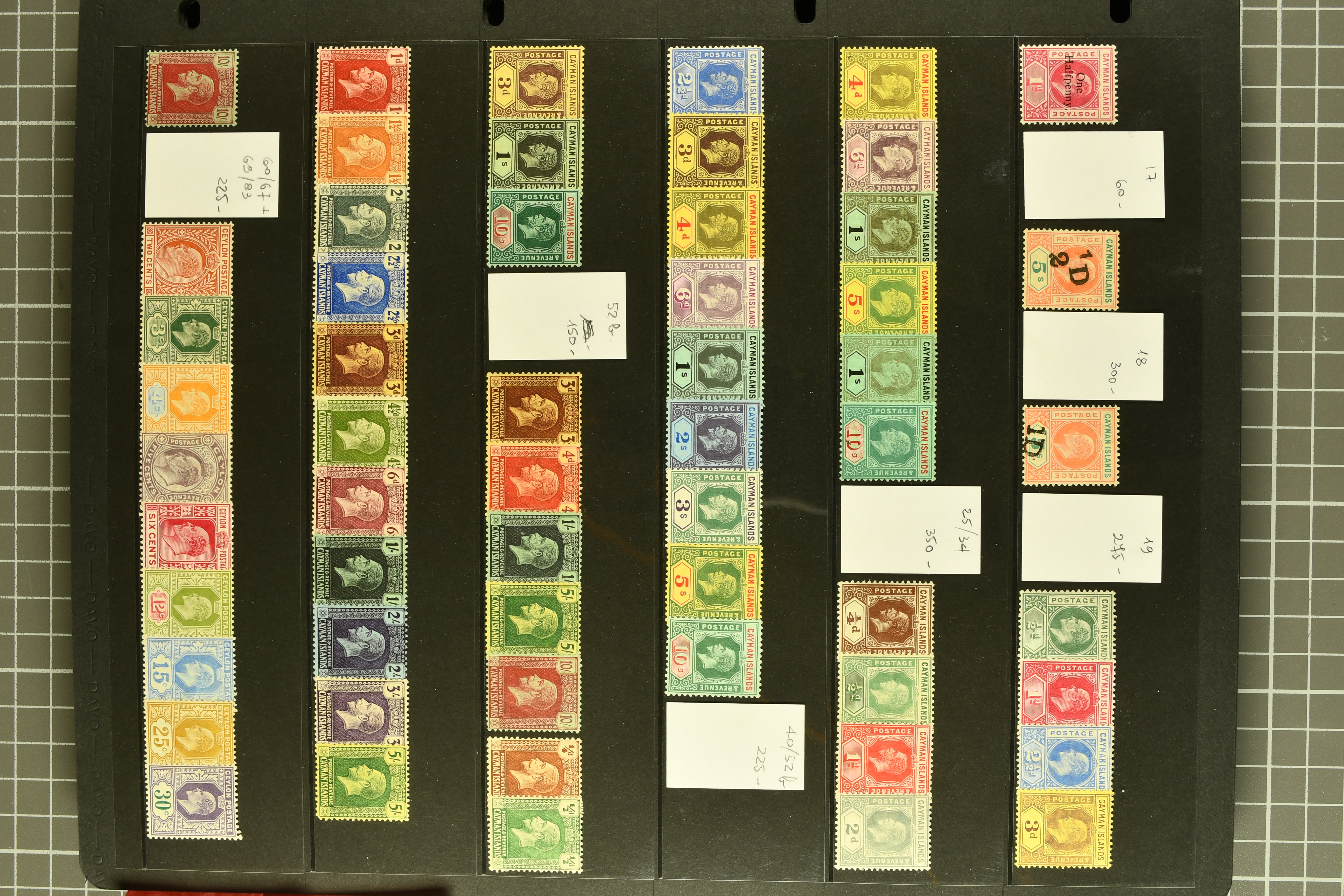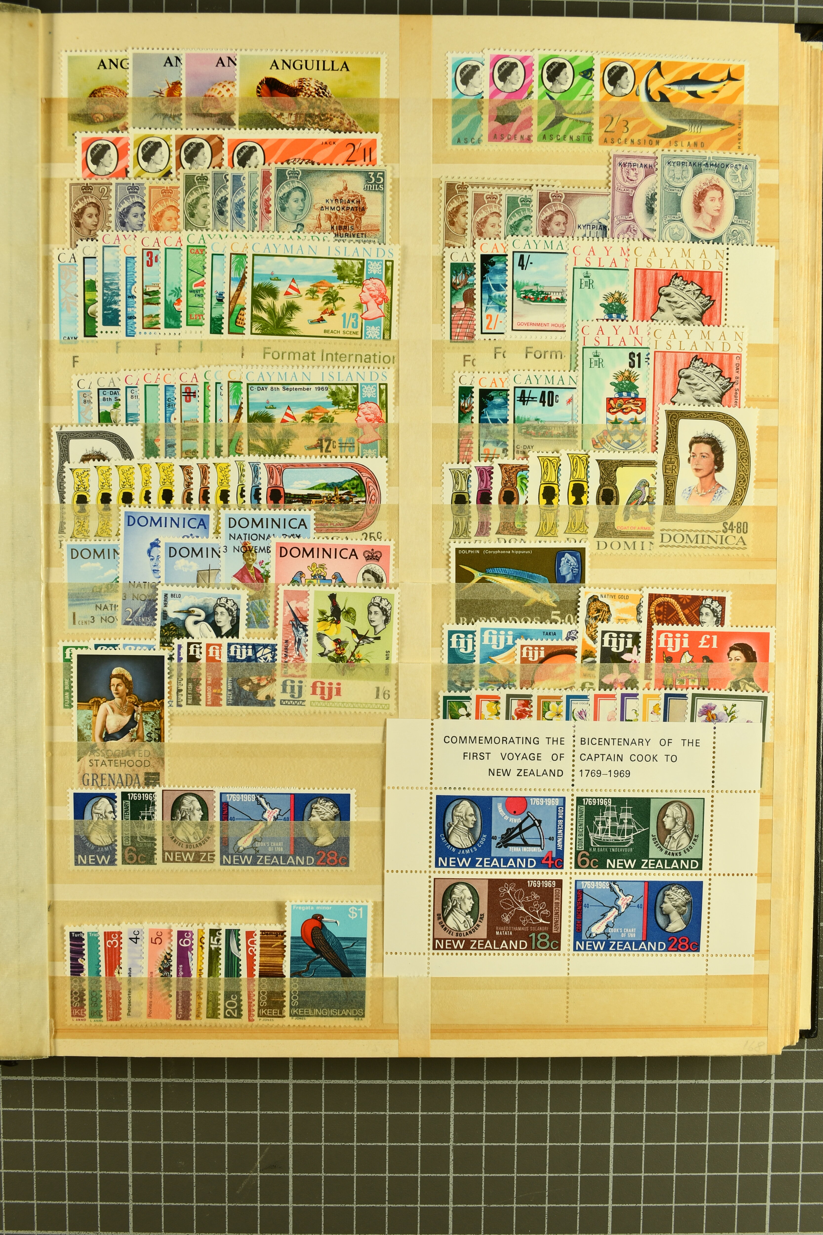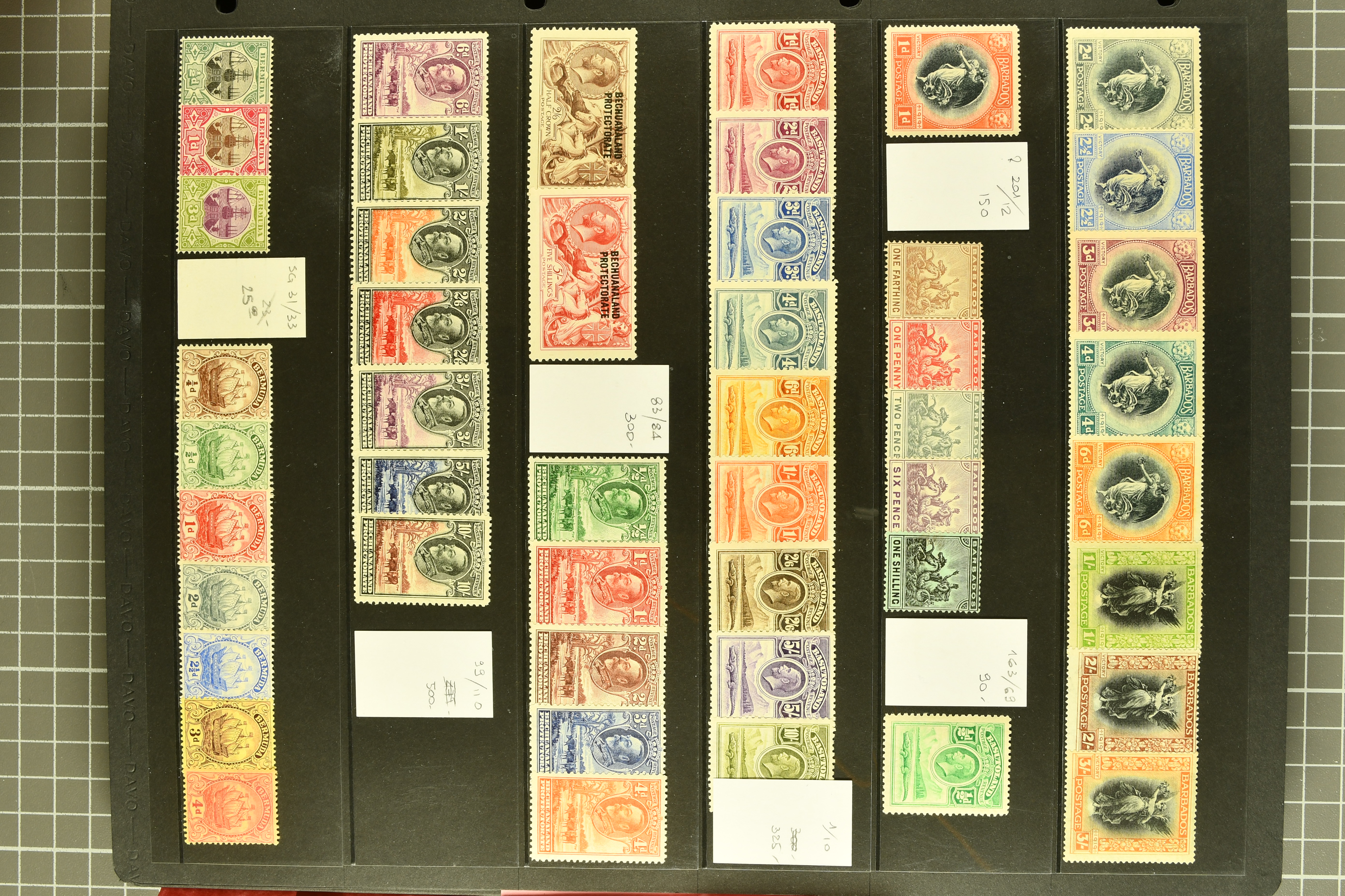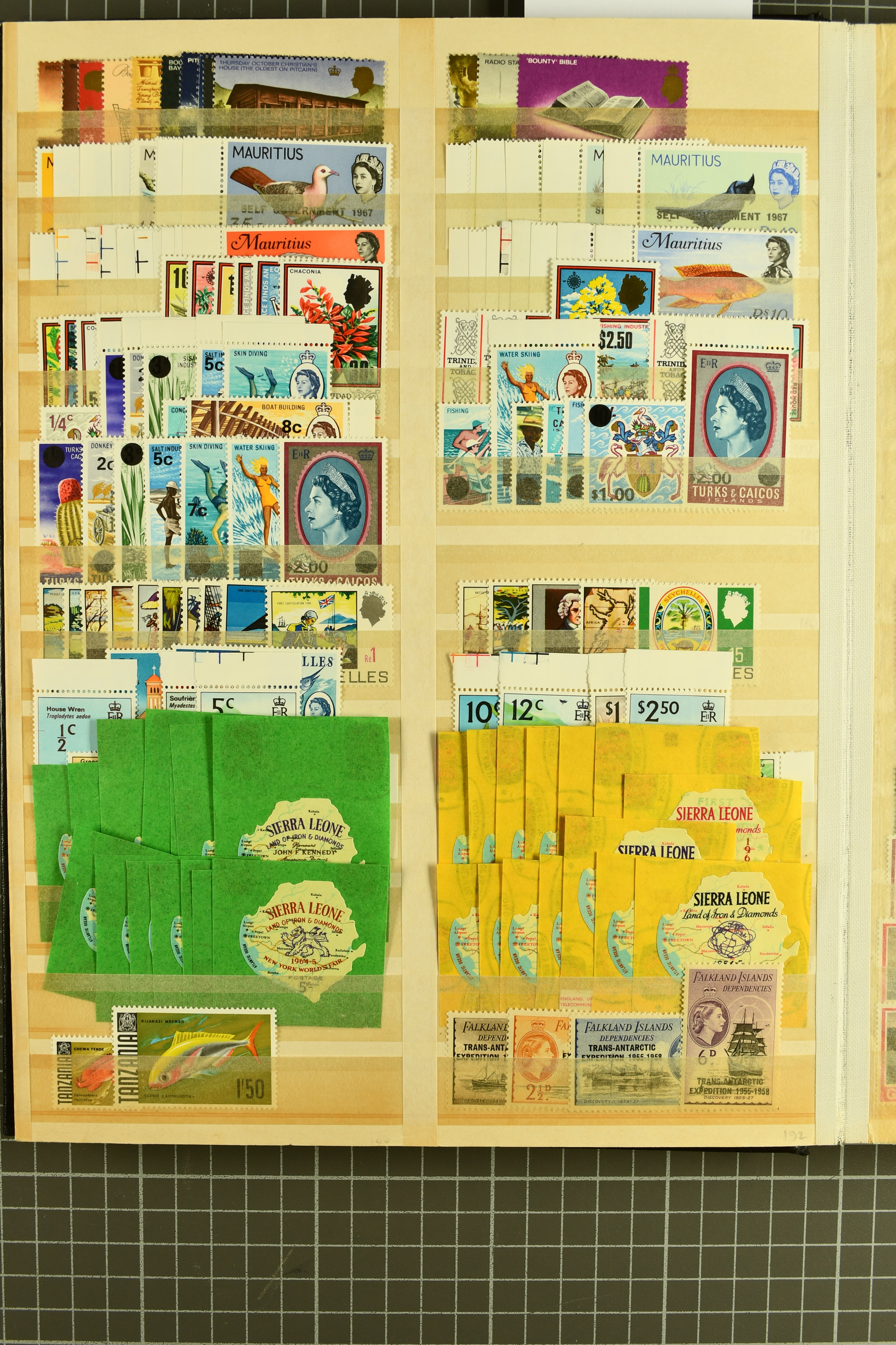 584 1870/1960ca.: Commonwealth Dealer's stock in ten albums with many good and predominantely unused sets from Aden to Zanzibar, including Bahrain, Barbados with unused 1907 2d. showing inverted ovpt. (cert. RPSL 2010), 1885 British Bechuanaland (Gi. 1/8) unused, British Guyana, Cayman Islands, Ceylon 1912 and later Issues, Falkland Islands and Dependencies 1878ff including 1898 2s.6d and 5s.unused, 1933 5s. King Penguin and 10s. Coat of Arms unused, 1938 part set to 2s.6d., all unused o.g., Fiji 1909ff., Iraq, Kuwait, Morocco Agencies, India 1902ff. with 1948 Gandhi official 1½ a. and some Indian states, various sets or part sets of Malayan states with Johore, Kedah, Kelantan and Perak, Labuan and North Borneo, Montserrat 1903ff, Nigeria and Northern Nigeria 1902ff, a good part of 'N.W. Pacific Islands' and New Guinea and Papua, further South Africa, Southern Rhodesia, St. Helena, St. Kitts and Nevis, St. Lucia, St. Vincent, Seychelles to Sierra Leone as well as sets from Sudan, Tanganyika, Trinidad, Transjordan, Turks and Caicos Islands, Virgin Islands to Zanzibar. All well preserved fresh and fine in choice condition. Viewing recommended