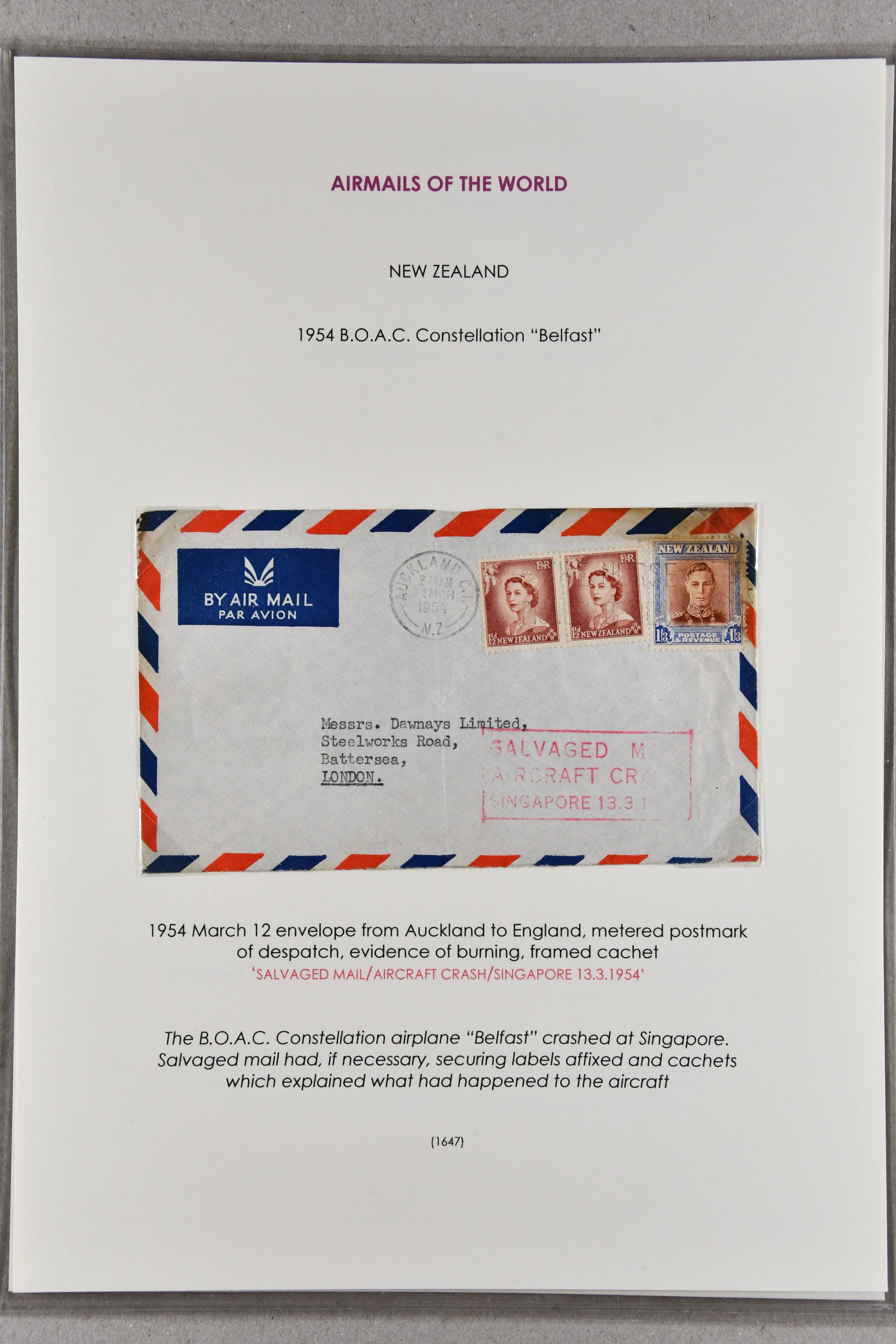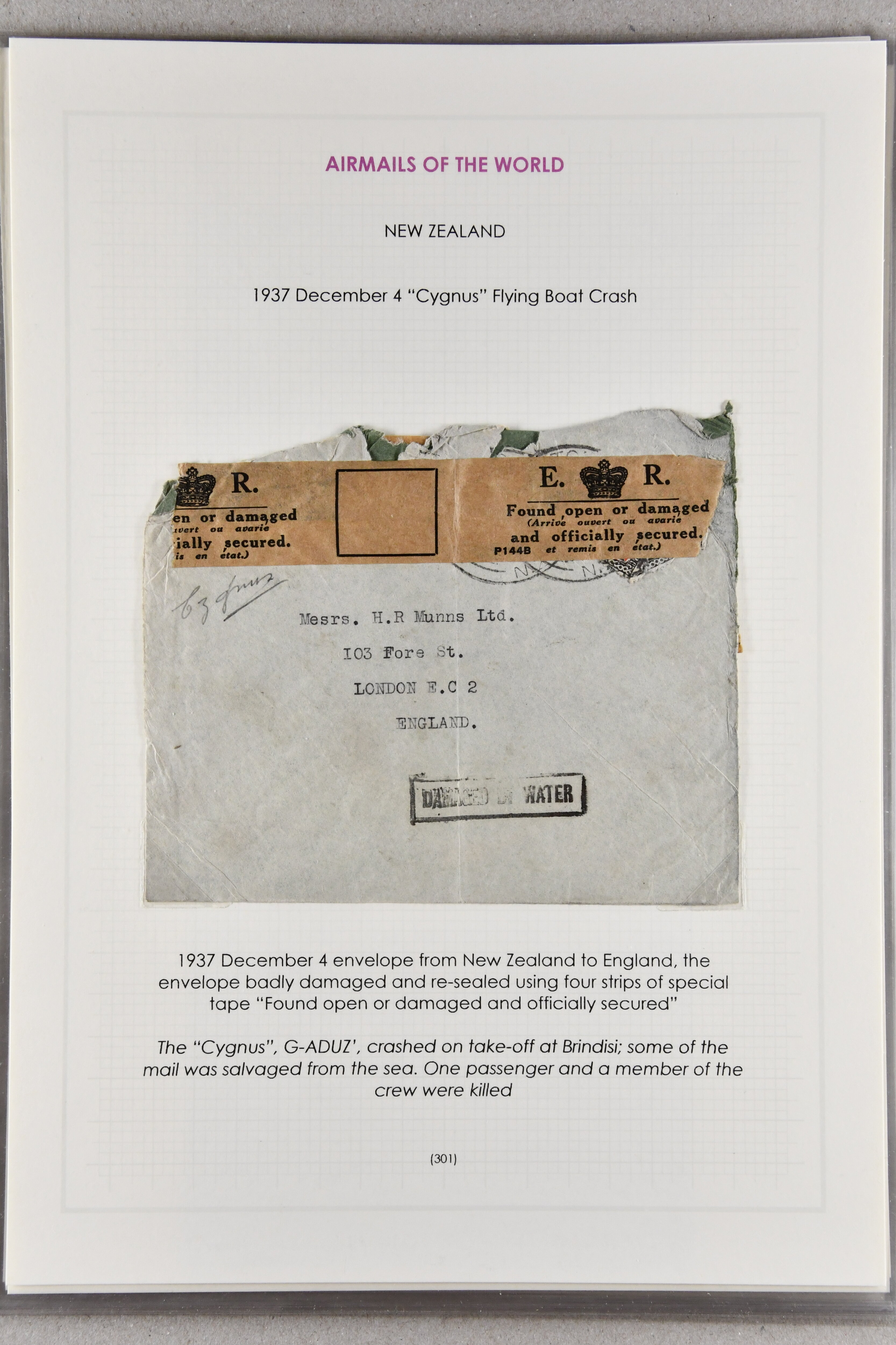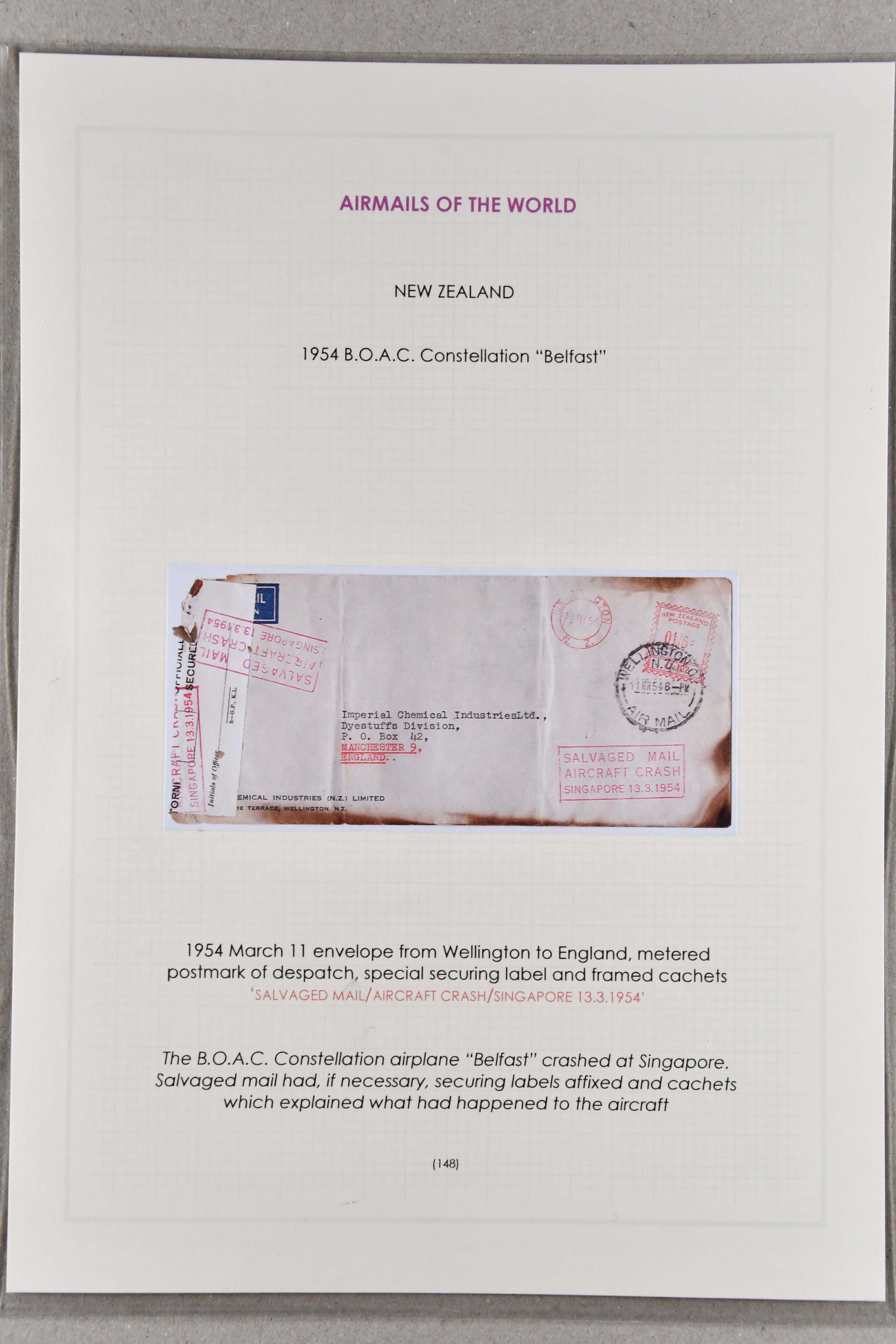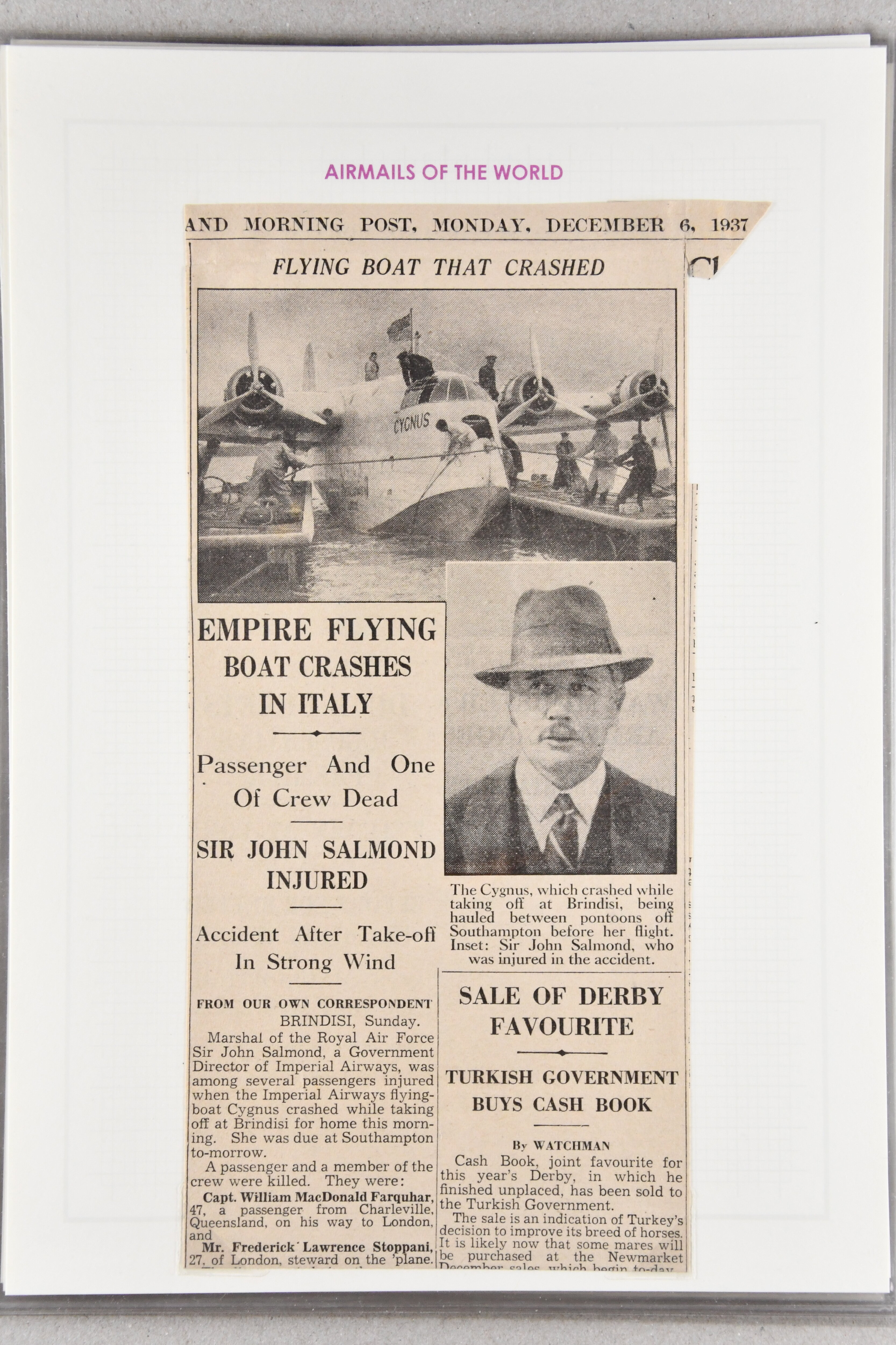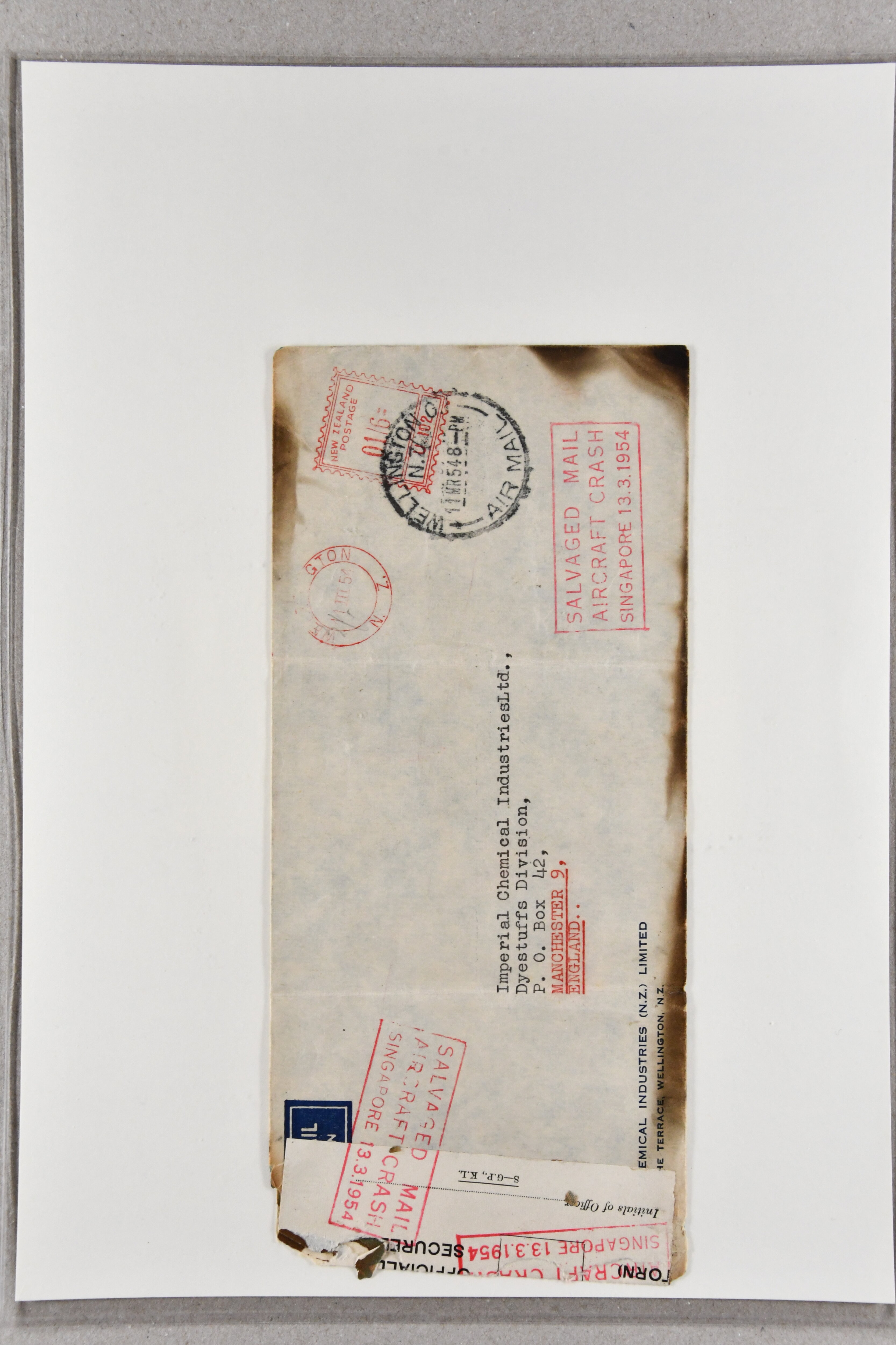 5611 cover imageRecovered Air Mail 1937/54: Group of seven crash covers of different aircraft crashes, incl. 1937 'Cygnus' flying boat crash at Brindisi 1937 with three different markings on two envelopes from India and one from New Zealand to UK (Nierinck 390915), 1945 (Aug. 13) salvaged O.A.S envelope from India (Nierinck 450819), 1953 'SALVAGED MAIL / Comet Crash, Near Calcutta / 2nd MAY 1953' as well as 1954 two envelopes from New Zealand bearing 'Salvaged Mail / Aircraft Crash Singapore 13.3.1954' handstamp in red of BOAC Constellation "Belfast" (Image 1) (Image 2) (Image 3) (Image 4) (Image 5) (Image 6) (Image 7) (Image 8) (Image 9) (Image 10)