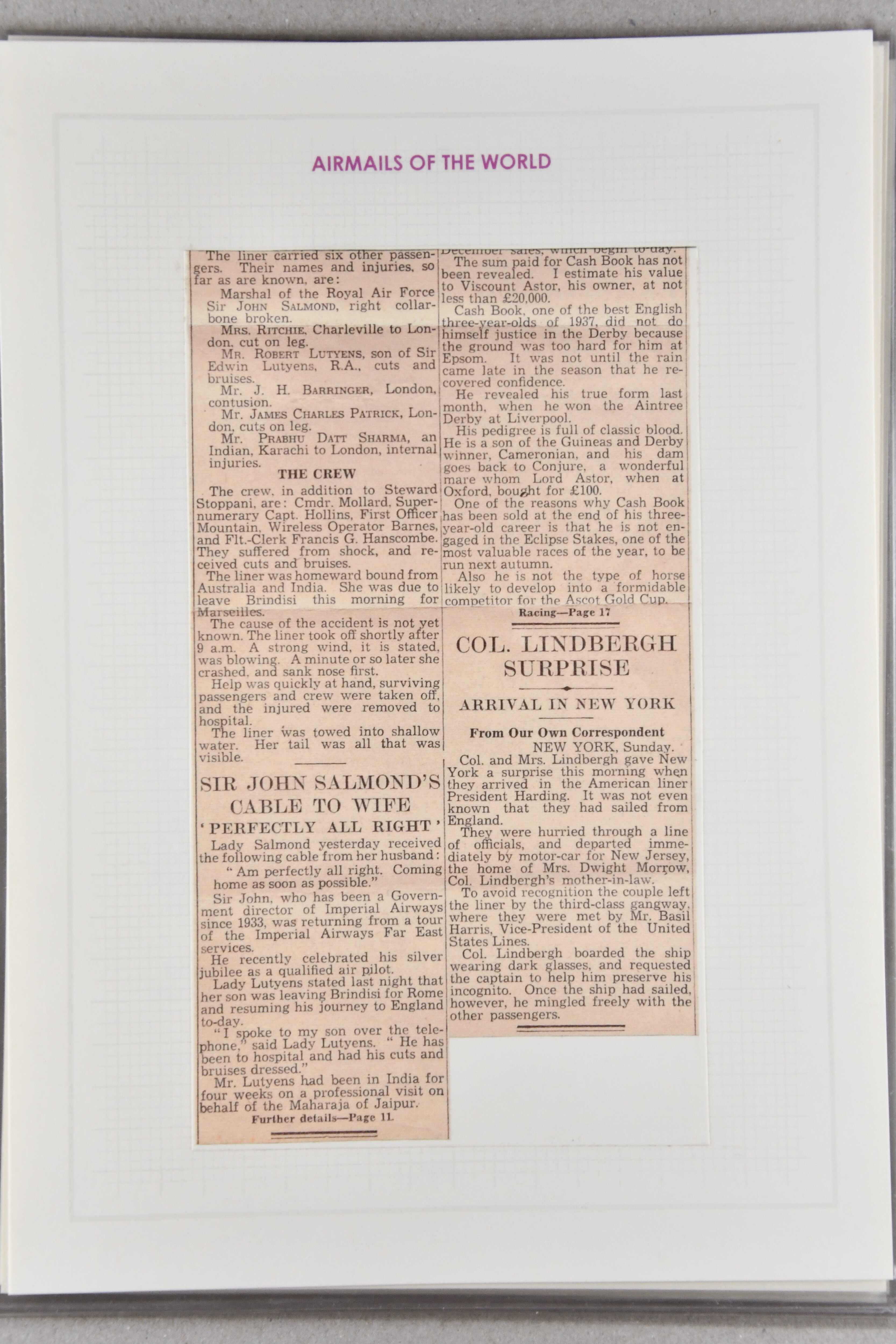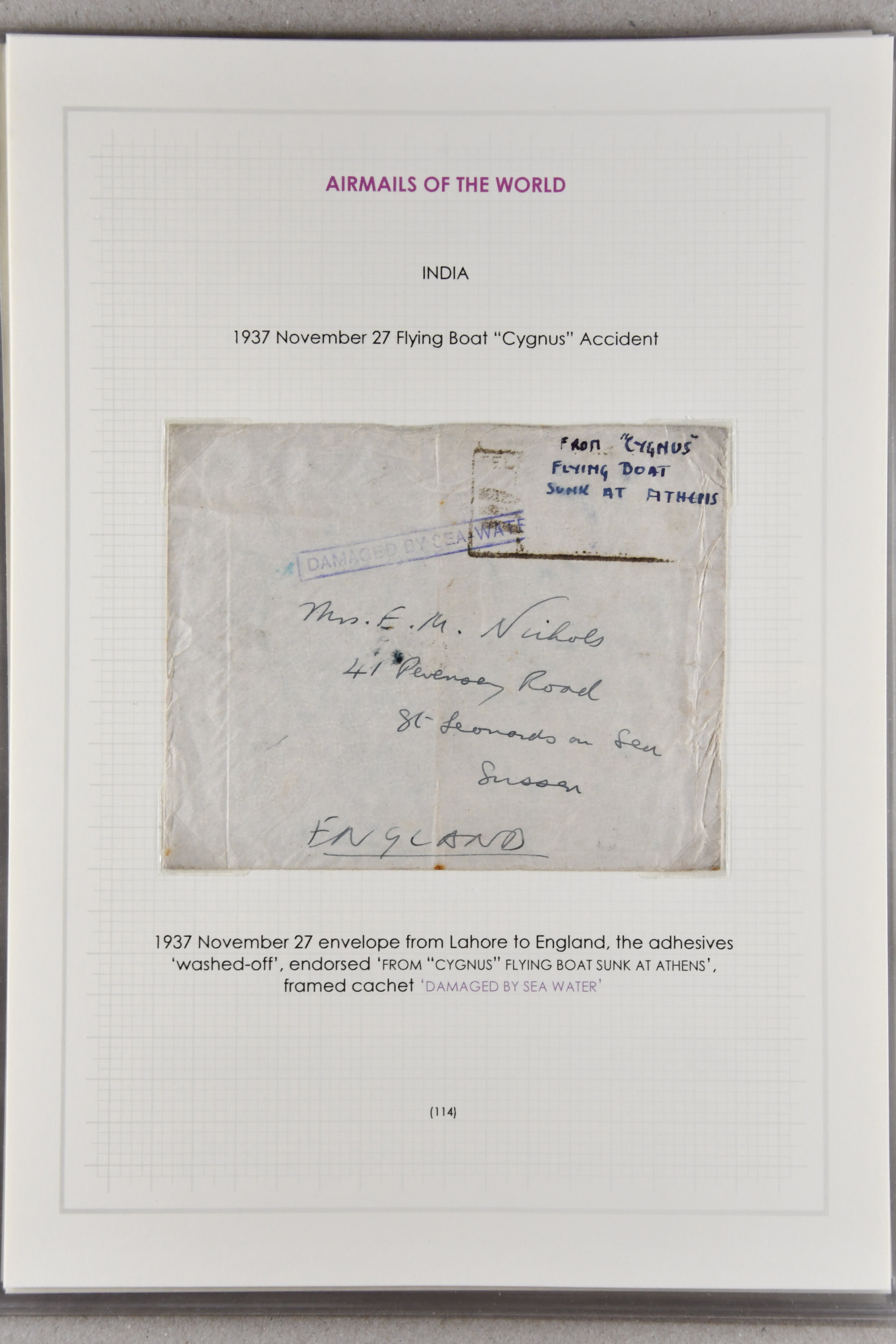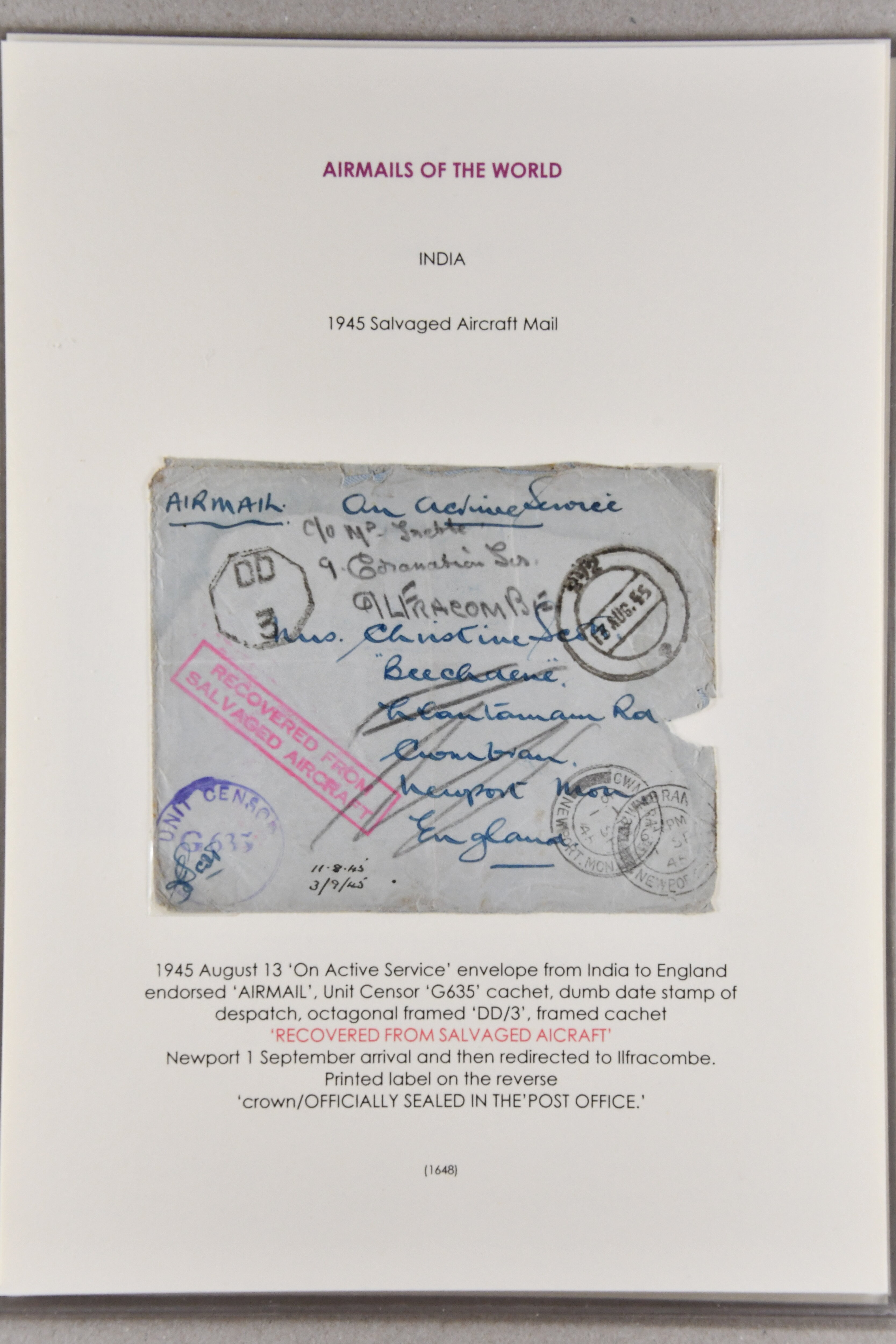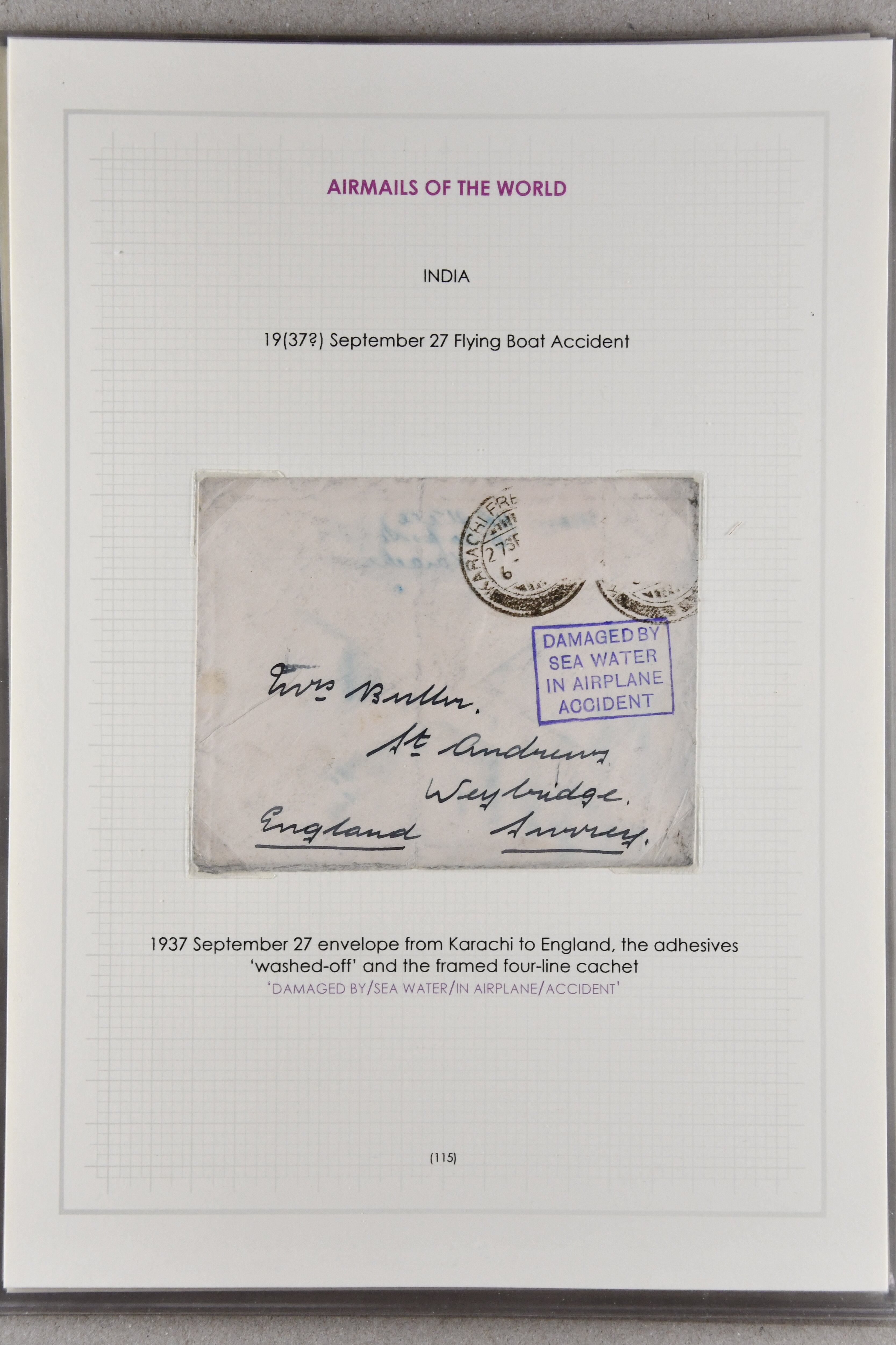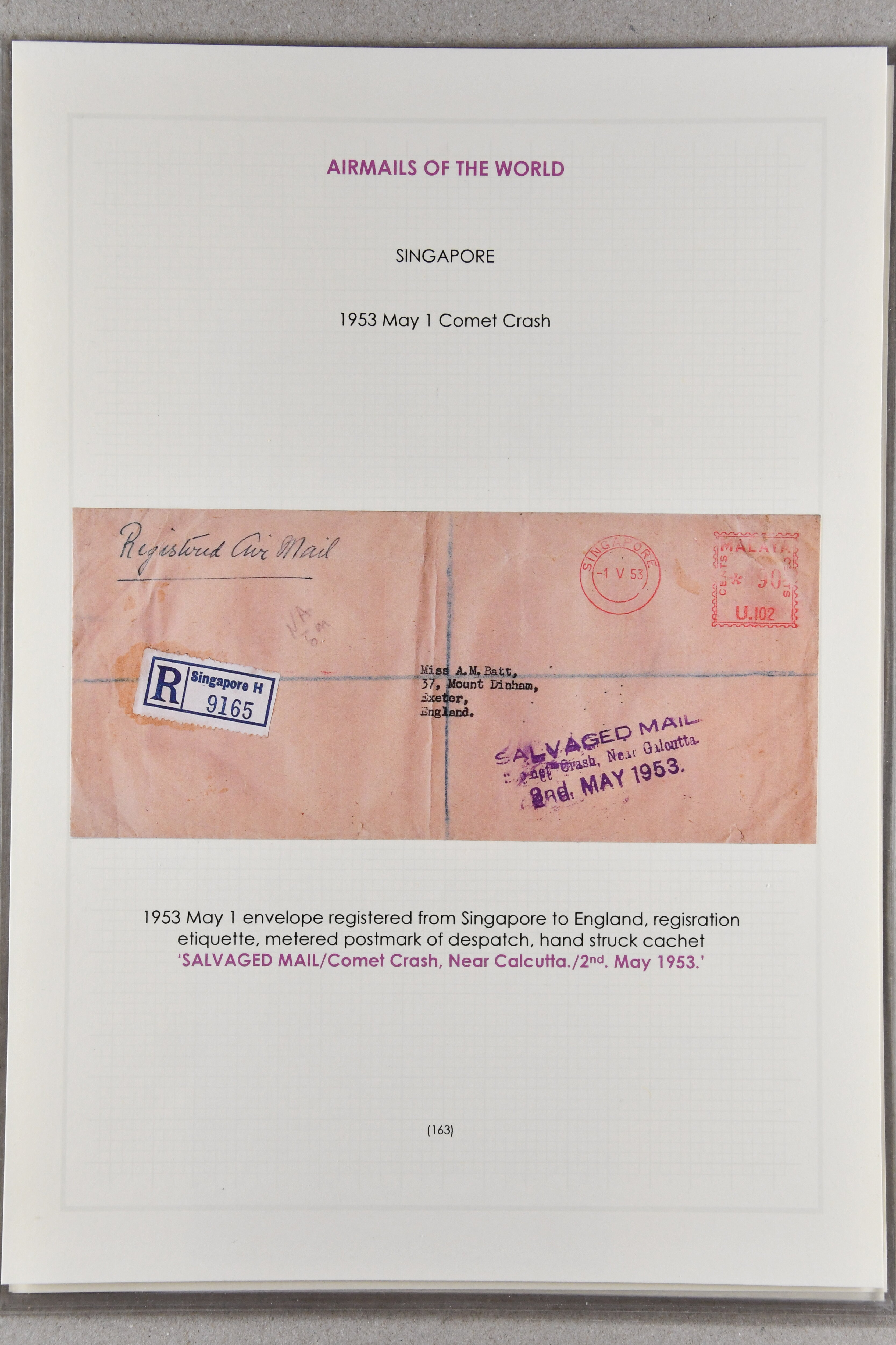 5611 cover imageRecovered Air Mail 1937/54: Group of seven crash covers of different aircraft crashes, incl. 1937 'Cygnus' flying boat crash at Brindisi 1937 with three different markings on two envelopes from India and one from New Zealand to UK (Nierinck 390915), 1945 (Aug. 13) salvaged O.A.S envelope from India (Nierinck 450819), 1953 'SALVAGED MAIL / Comet Crash, Near Calcutta / 2nd MAY 1953' as well as 1954 two envelopes from New Zealand bearing 'Salvaged Mail / Aircraft Crash Singapore 13.3.1954' handstamp in red of BOAC Constellation "Belfast" (Image 1) (Image 2) (Image 3) (Image 4) (Image 5) (Image 6) (Image 7) (Image 8) (Image 9) (Image 10)