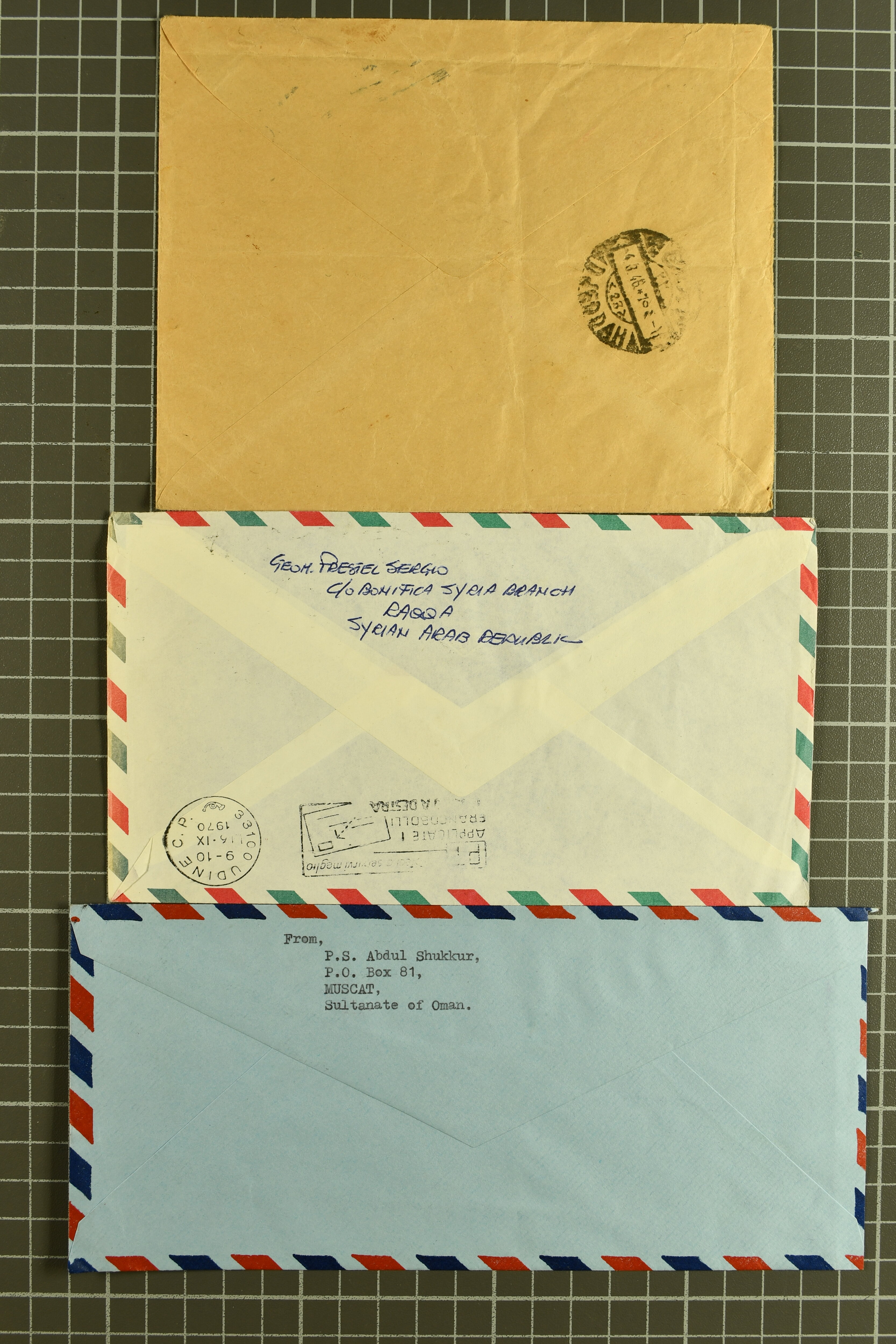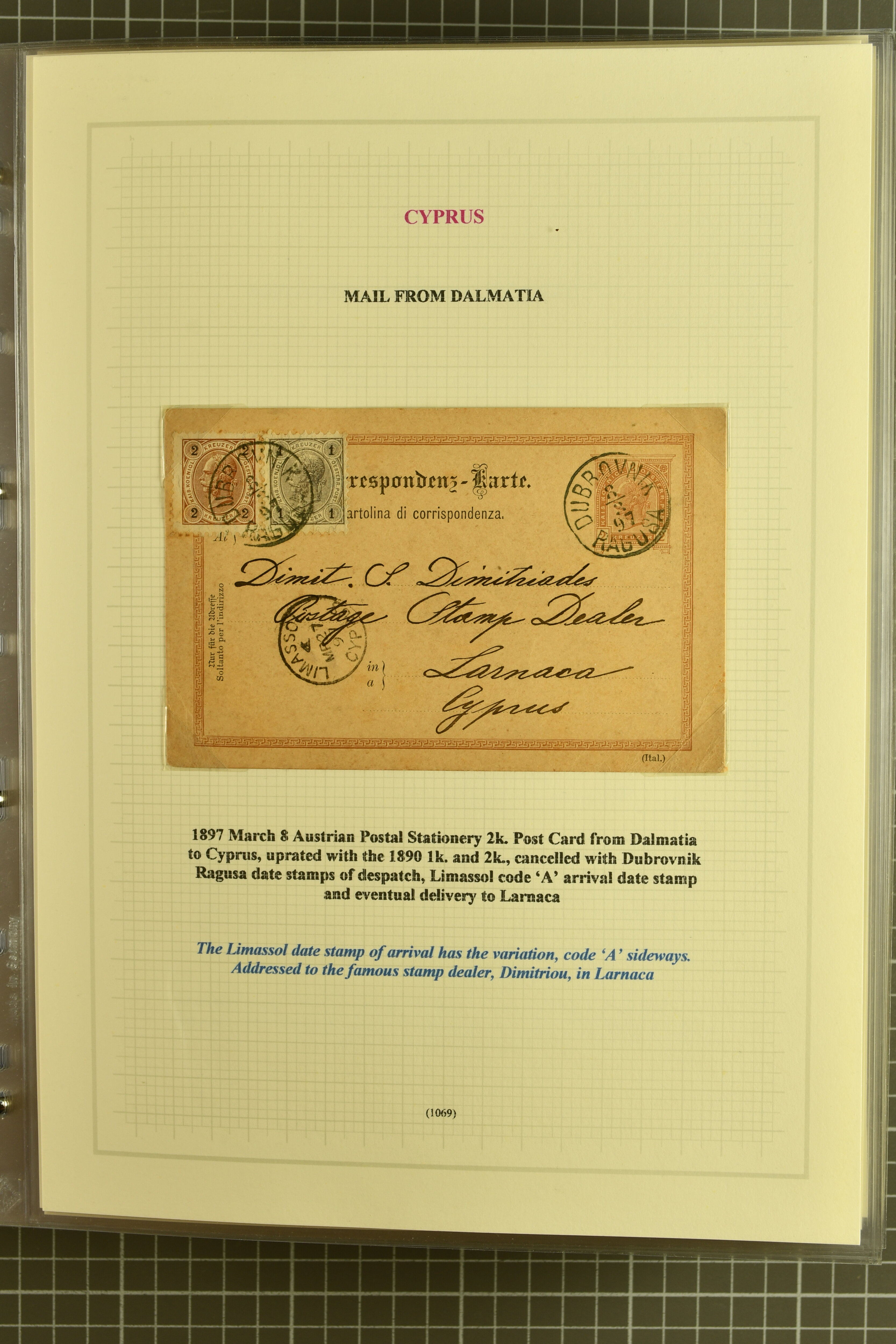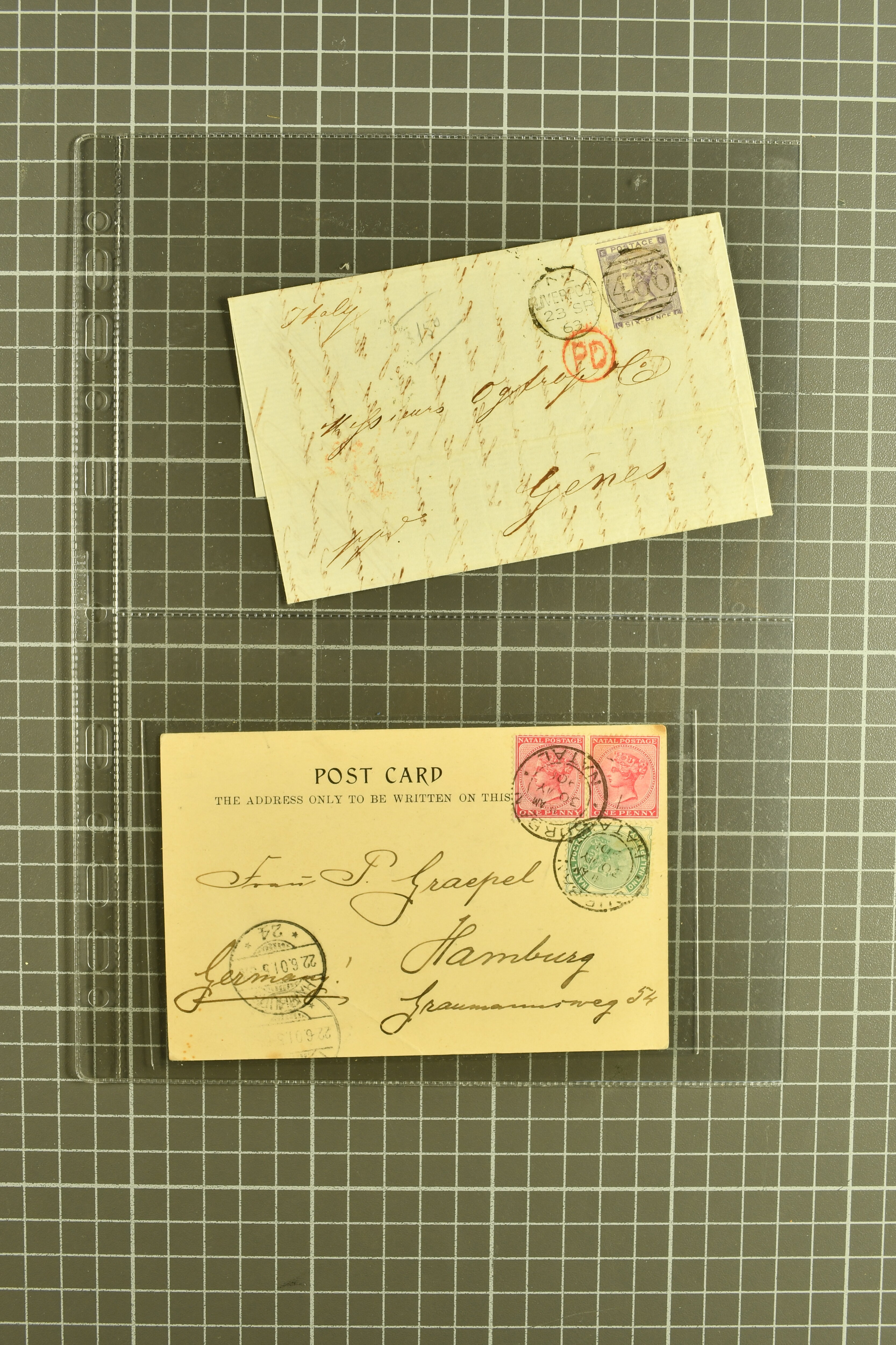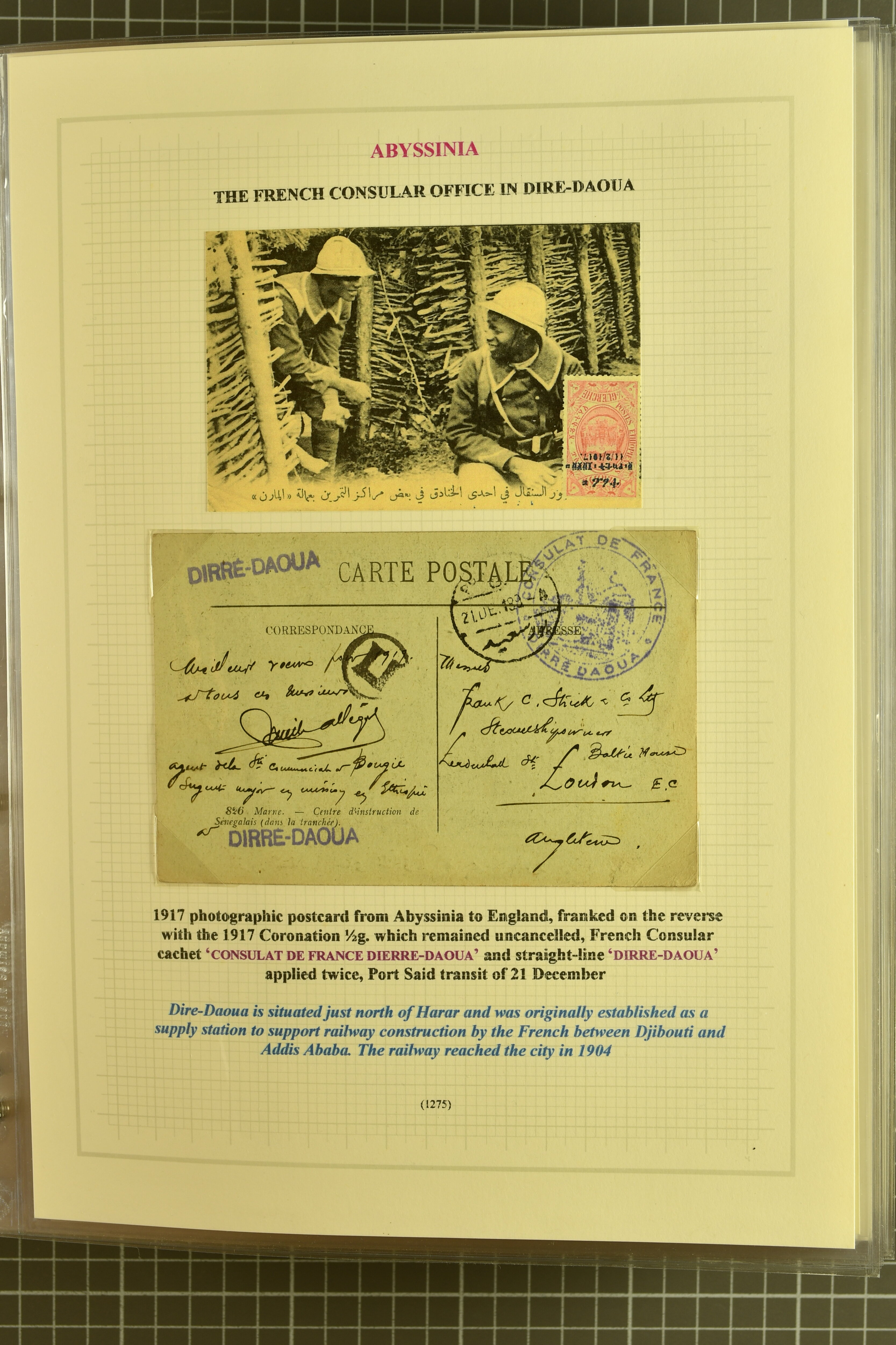 5612 cover image1766/1936: Collection of covers/cards (83) with Ethiopia 1917 consular postcard with "Consulat de France / Dire Daoua" cachet in violet, Afghanistan 1935 consular cover from Kabul to England witth India Official 2 a. 6 p. orange, 1847 Antigua cover to England, Austria 1864 2 kr. yellow on Printed Matter cover from "Huszt", 1897 uprated stationery card mailed to Larnaca, Cyprus; 1875 cover from Smirna to England franked 1867/74 3 s. green and 10 s. blue pair tied by SMIRNE thimble cds; 1875 cover to Jaffa from Smirne franked 10 s. blue, 1892 Cook Islands first issue cover with single 2½ d. blue, Dahomey 1896 cover franked at 25 c. to Oyo via Lagos; Leewards 1 d. rose stationery envelopes (2) each cancelled "Wesley / Dominica" cds's; 1875 cover to UK with France 1871/75 Cérès 10 c. and 25 c. pair cancelled by 5098 gros chiffres of Smirna; 1897 20 pa. stationery card from Constantinople to Cyprus; 1888 South Australia 6 d. blue on cover to Hawaii, range of Italian pre-stamp covers/ entires, 1917 New Guinea cover with 1 d. red ex Kieta to England via Rabaul; 1906 North Borneo cards (2) each franked 4 c. to Singapore; Palestine with 1 pi. ultramarine on 1918 cover to Alexandria, 1910 registered cover with scarce 'small Papua' 2 s. 6 d., 1896 Queensland 1½ d. brown card to Japan; 1858 and 1859 covers from Russia to Scotland; Seychelles with six covers/cards, 1894 India 1 a. card used from Aden to Bangkok, 1903 Somaliland cover from Berbera, 1842 cover from Trinidad to England etc. Generally fine throughout with much of interest to the postal historian (Image 1) (Image 2) (Image 3) (Image 4) (Image 5) (Image 6) (Image 7) (Image 8) (Image 9) (Image 10) (Image 11) (Image 12) (Image 13) (Image 14) (Image 15) (Image 16) (Image 17) (Image 18) (Image 19) (Image 20) (Image 21) (Image 22) (Image 23) (Image 24) (Image 25) (Image 26) (Image 27) (Image 28) (Image 29) (Image 30) (Image 31) (Image 32) (Image 33) (Image 34) (Image 35) (Image 36) (Image 37) (Image 38) (Image 39) (Image 40) (Image 41) (Image 42) (Image 43) (Image 44) (Image 45) (Image 46) (Image 47) (Image 48) (Image 49) (Image 50)