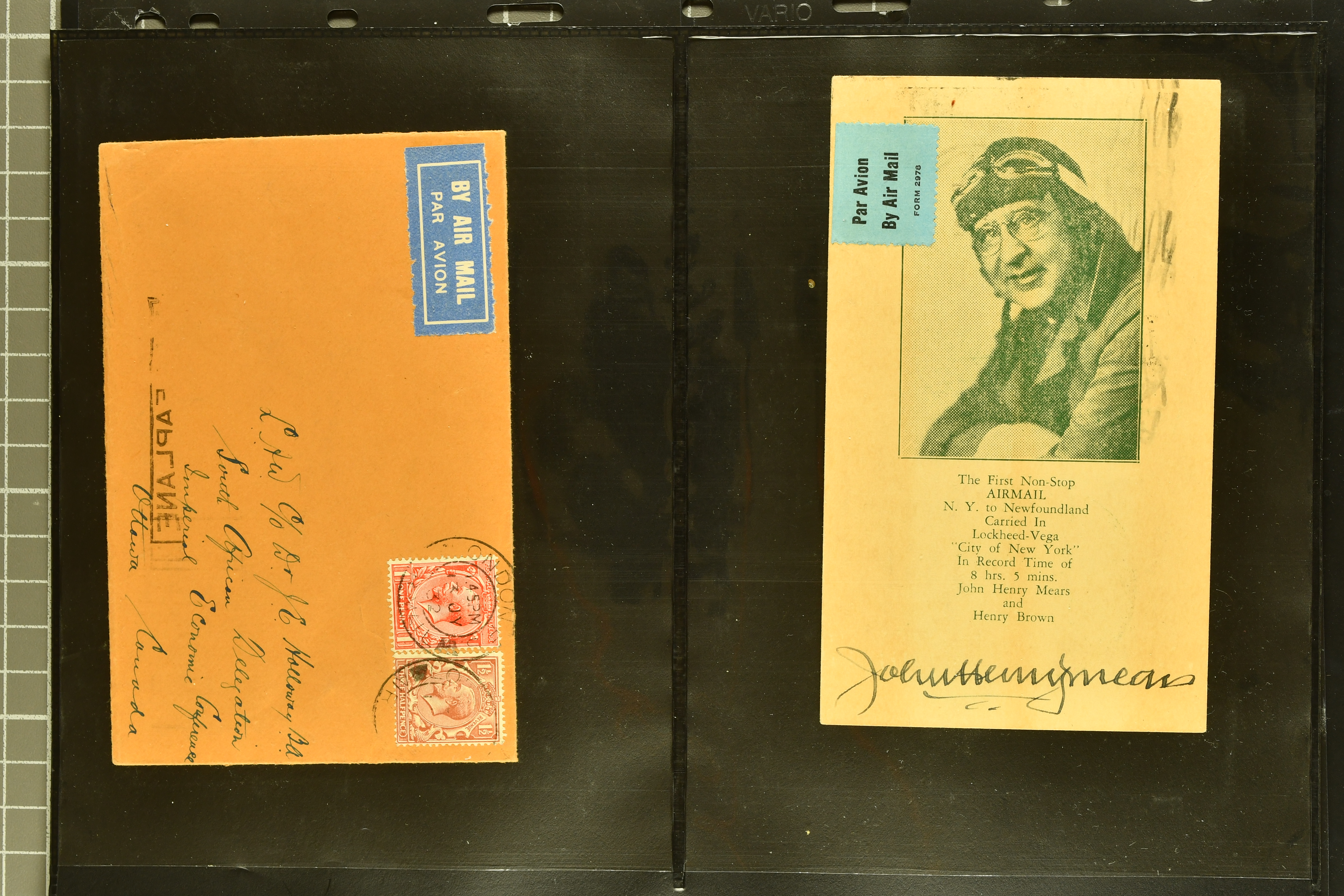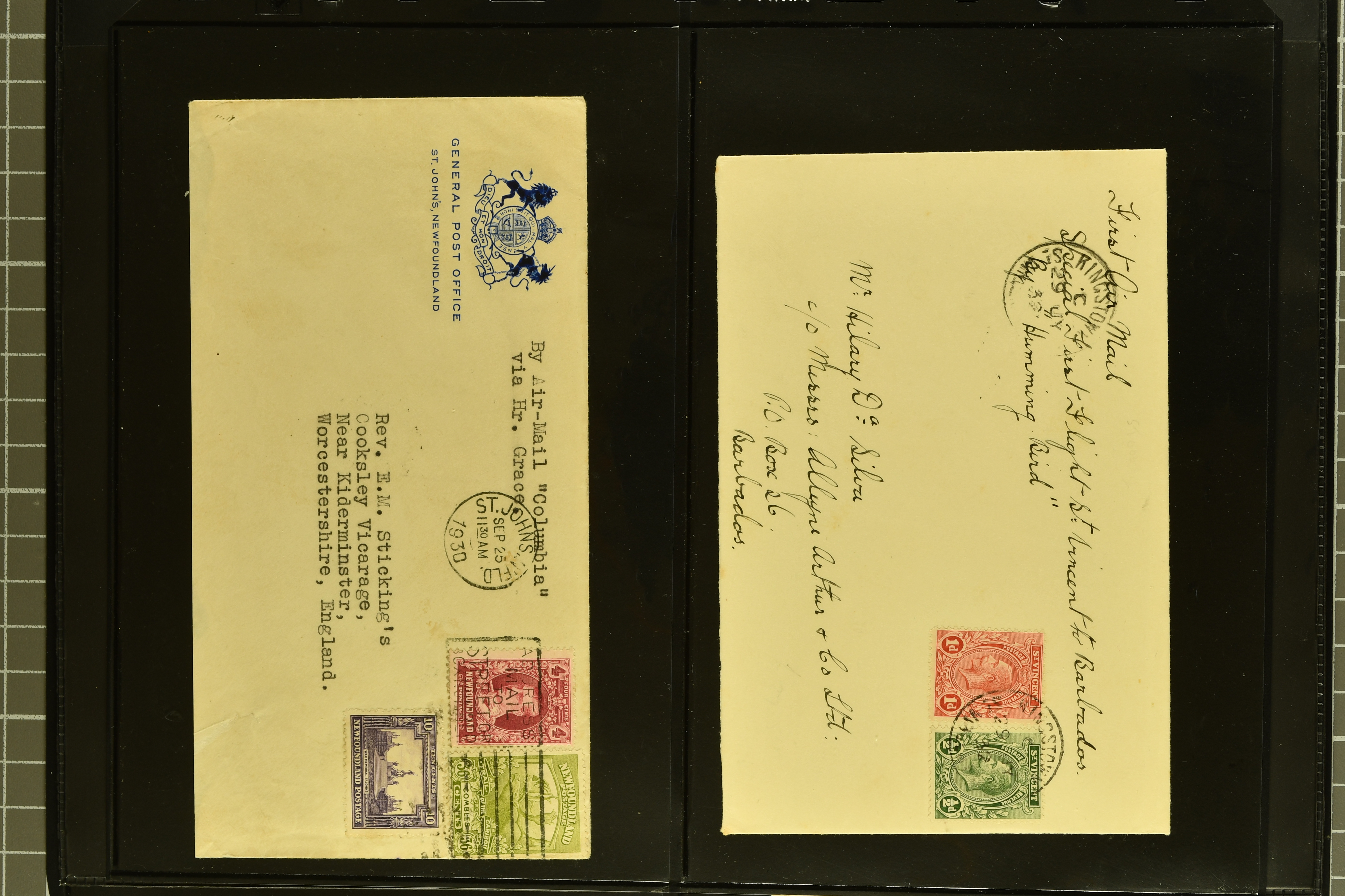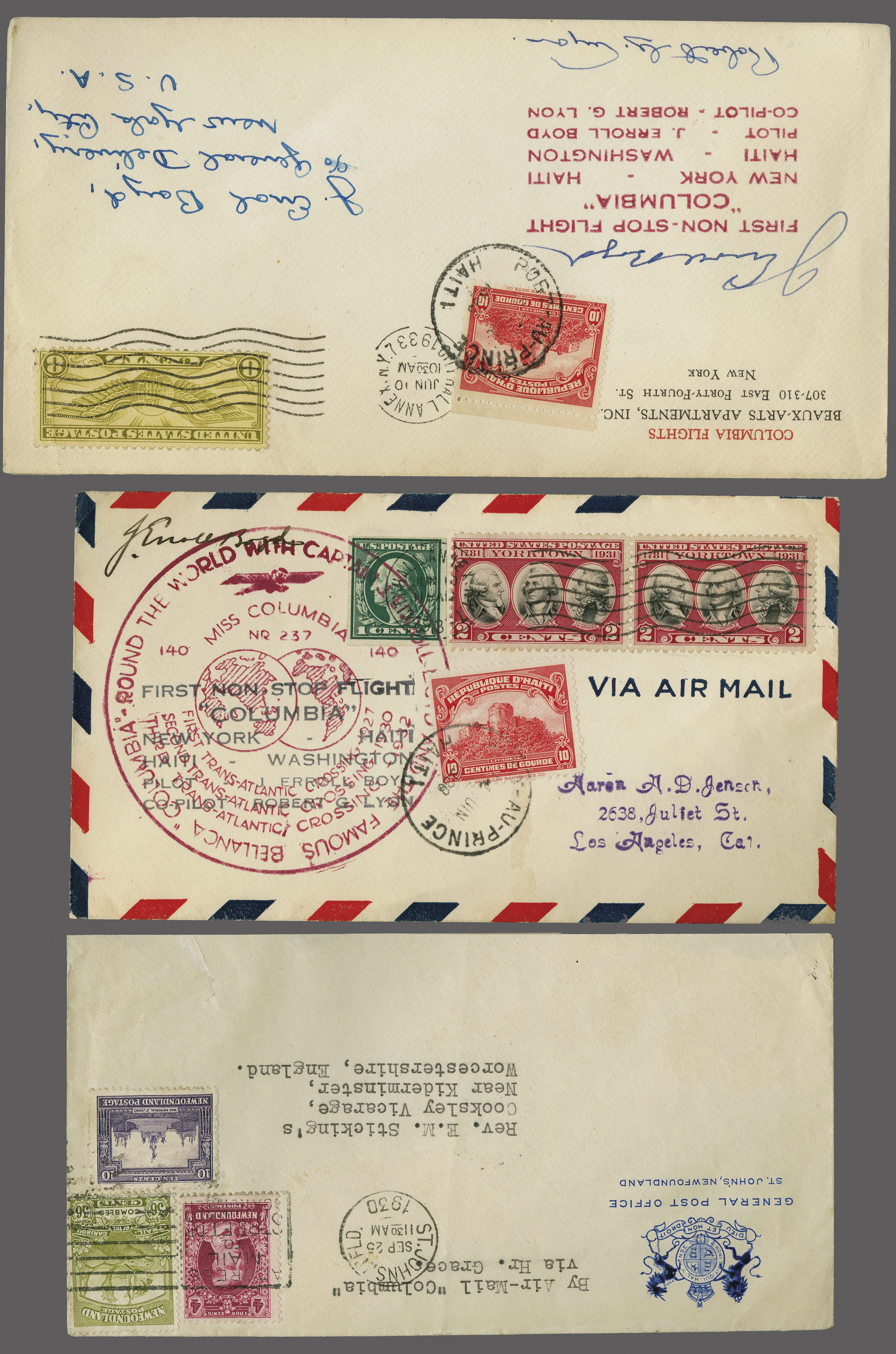 588 cover image1930/32: Group of 11 first flight covers, incl. 1930 John Mears autographed 1 c. stationery card of his N.Y. - Newfoundland flight (Aug. 2), Erroll Boyd Columbia I-II flights 1930/33 three envelopes incl. 1930 Newfoundland - England flight from "St. Johns Nfld. Sep. 25" and 1933 Miss Columbia flight from Port au Prince Haiti to "Los Angeles June 21", 1932 (July 29) first flight St. Vincent - Barbados by Cipriani in 'The Humming Bird' as well as 1928/32 UK-Canada Ship to Shore flights by St. Lawrence Seaway Airmail Service. All fine and scarce first flights (Image 1) (Image 2) (Image 3) (Image 4) (Image 5) (Image 6) (Image 7) (Image 8)