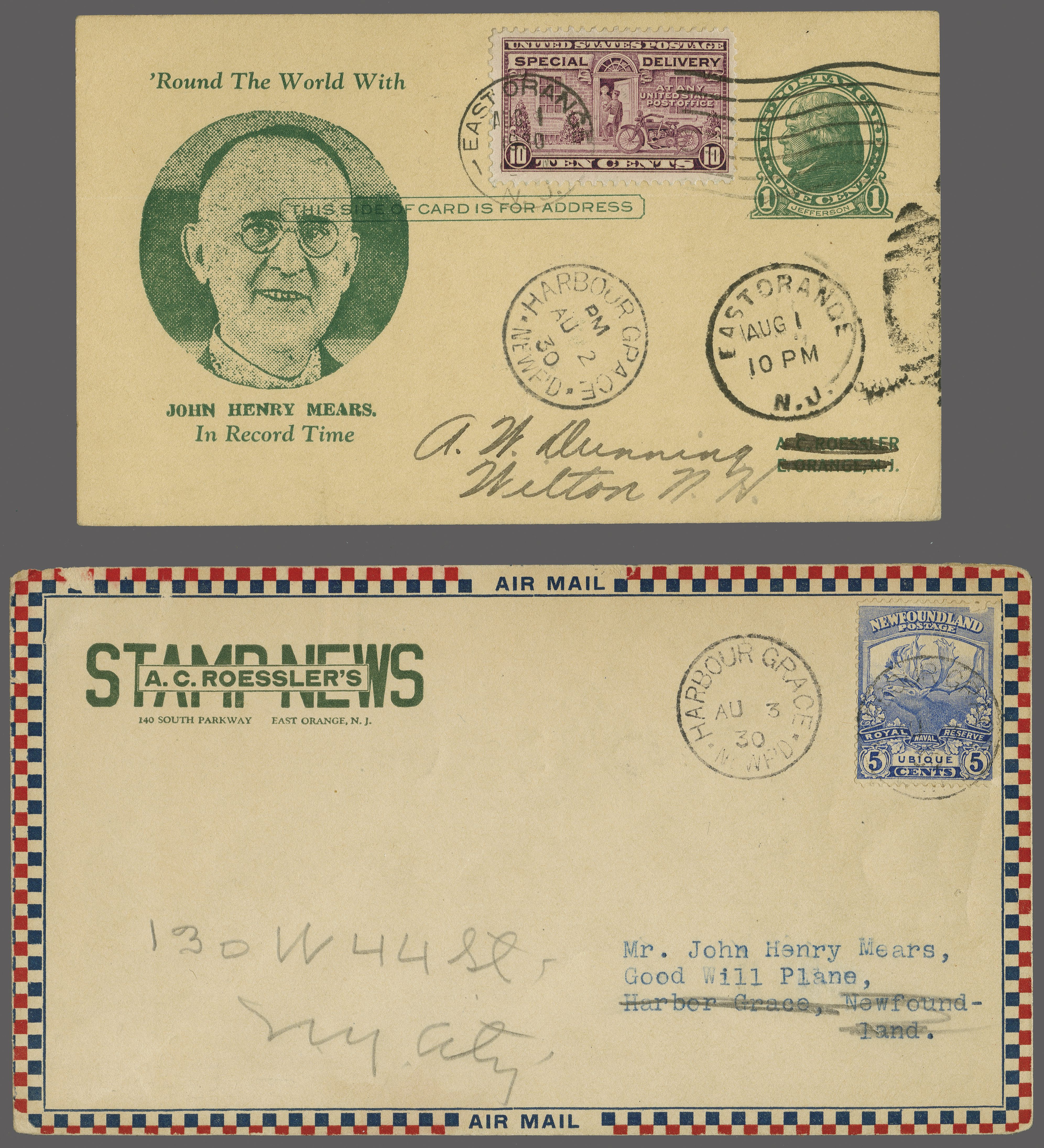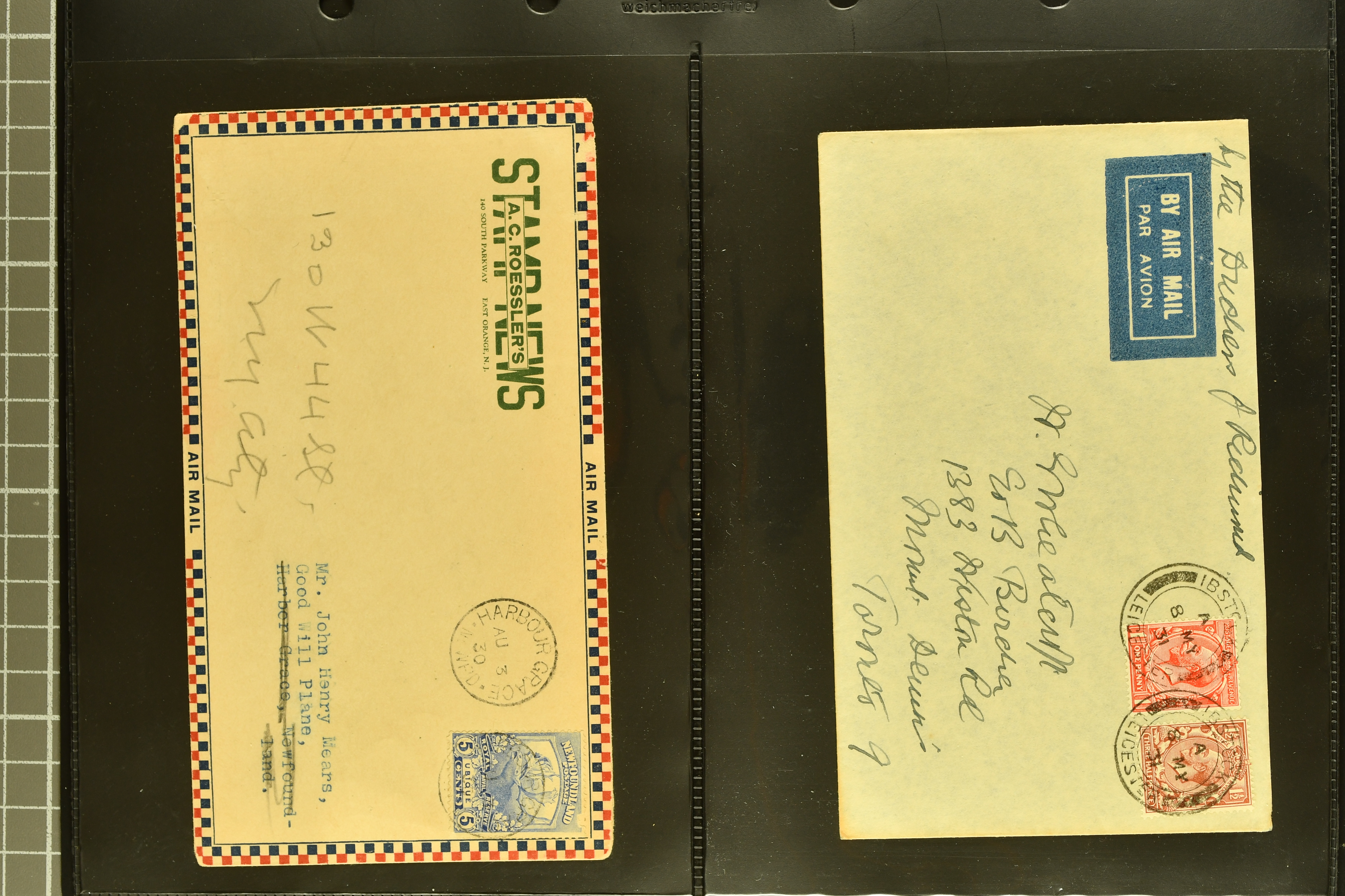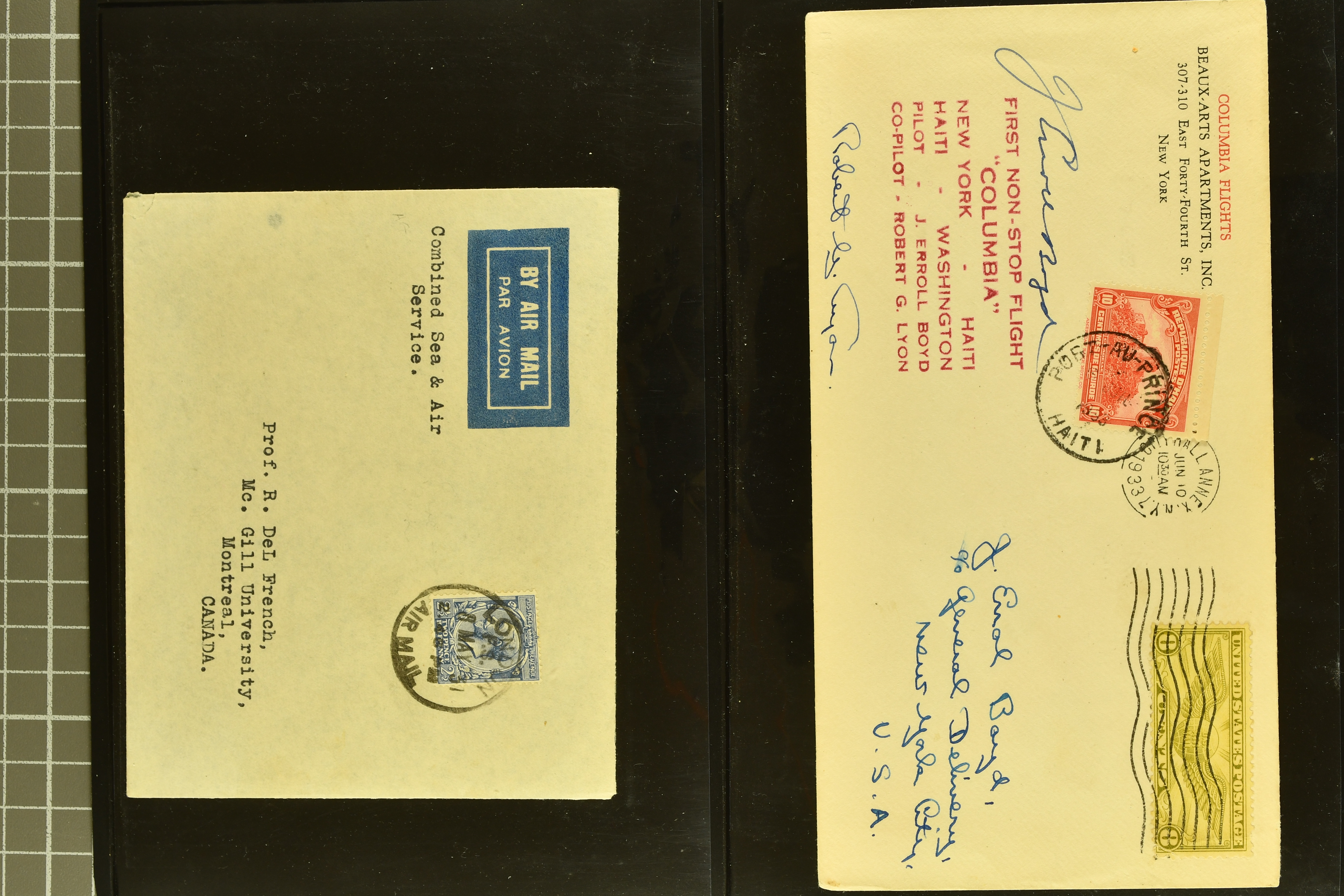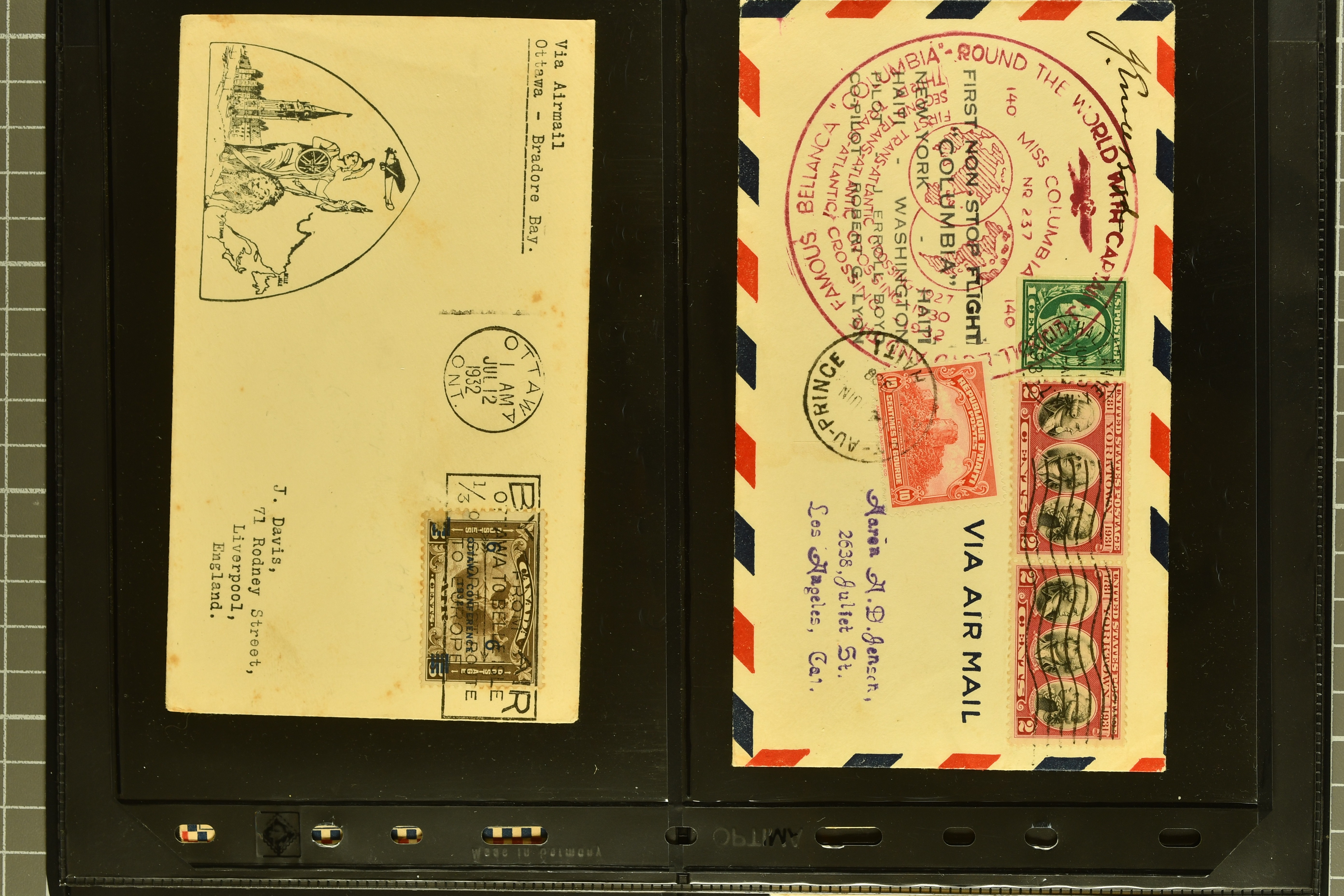588 cover image1930/32: Group of 11 first flight covers, incl. 1930 John Mears autographed 1 c. stationery card of his N.Y. - Newfoundland flight (Aug. 2), Erroll Boyd Columbia I-II flights 1930/33 three envelopes incl. 1930 Newfoundland - England flight from "St. Johns Nfld. Sep. 25" and 1933 Miss Columbia flight from Port au Prince Haiti to "Los Angeles June 21", 1932 (July 29) first flight St. Vincent - Barbados by Cipriani in 'The Humming Bird' as well as 1928/32 UK-Canada Ship to Shore flights by St. Lawrence Seaway Airmail Service. All fine and scarce first flights (Image 1) (Image 2) (Image 3) (Image 4) (Image 5) (Image 6) (Image 7) (Image 8)