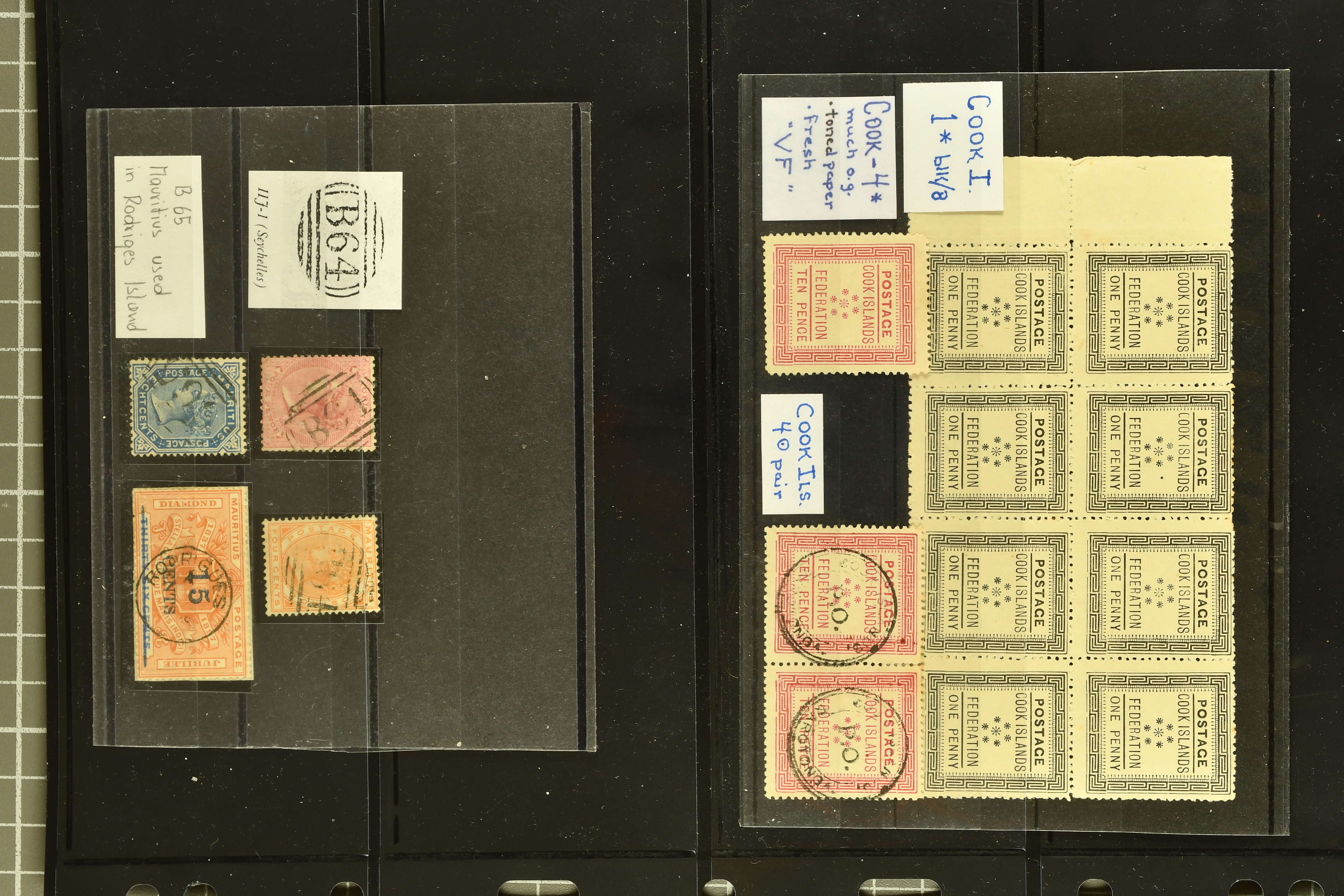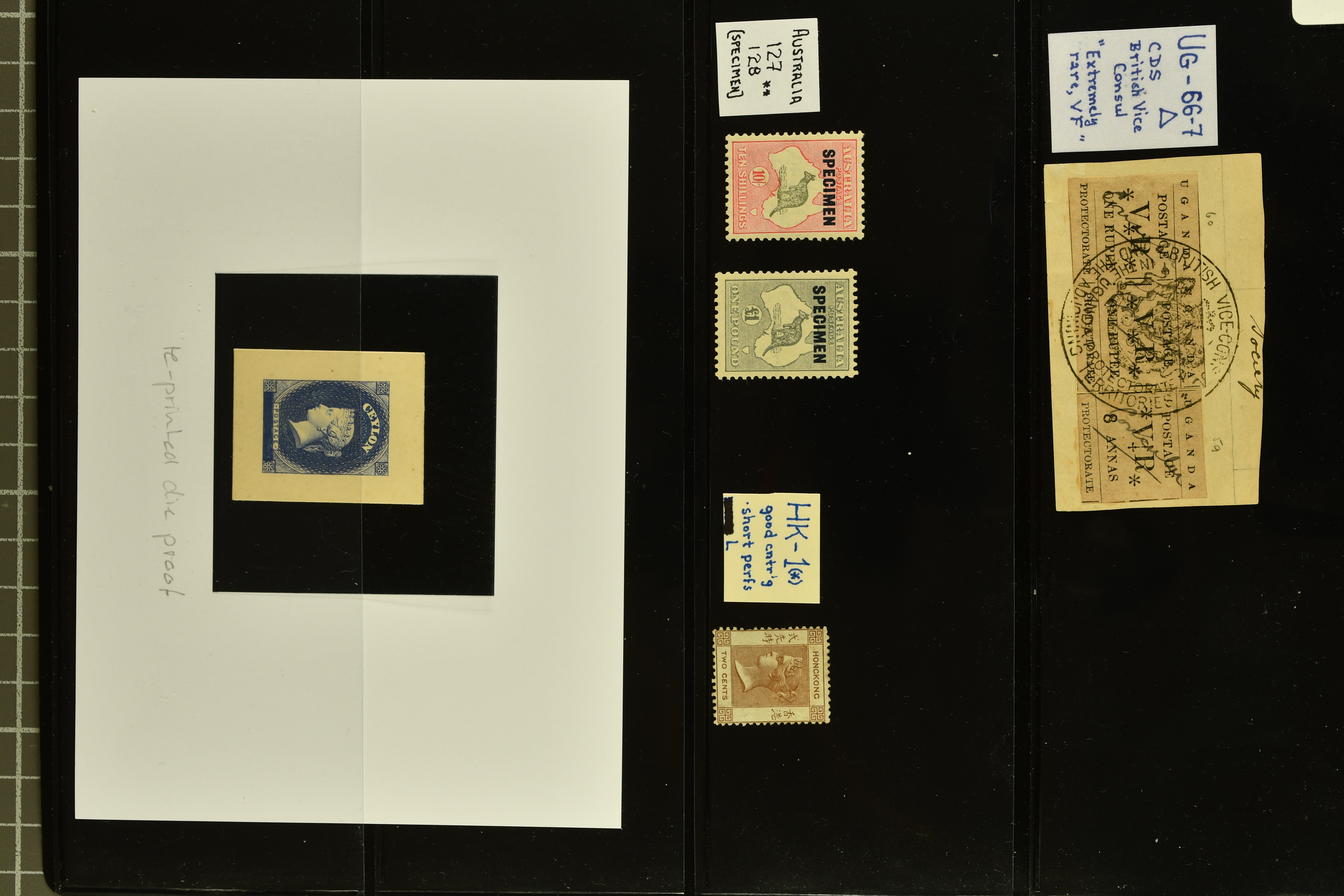 580 image1850/1931: Small group including Dominica 1874/79 unused 1d. and 1sh dull lilac, Falkland 1878/79 unused 4d. grey, Uganda 1896 1 R pair and 8a each with manuscript 'Consular' tied to piece by complete strike of 'BRITISH VICE-CONSUL / IN THE UGANDA PROTECTORATE' handstamp, further Australia SPECIMEN overprinted 1931/36 Kangaroos 10 s. and 1£ unused, Cook Islands 1892 1 d. black in an unused marginal block of eight and 10 d. carmine used/unused together with 'B64' usages on Seychelles and Rodrigues Islands. A fine and scarce assembly (Image 1) (Image 2) (Image 3) (Image 4)