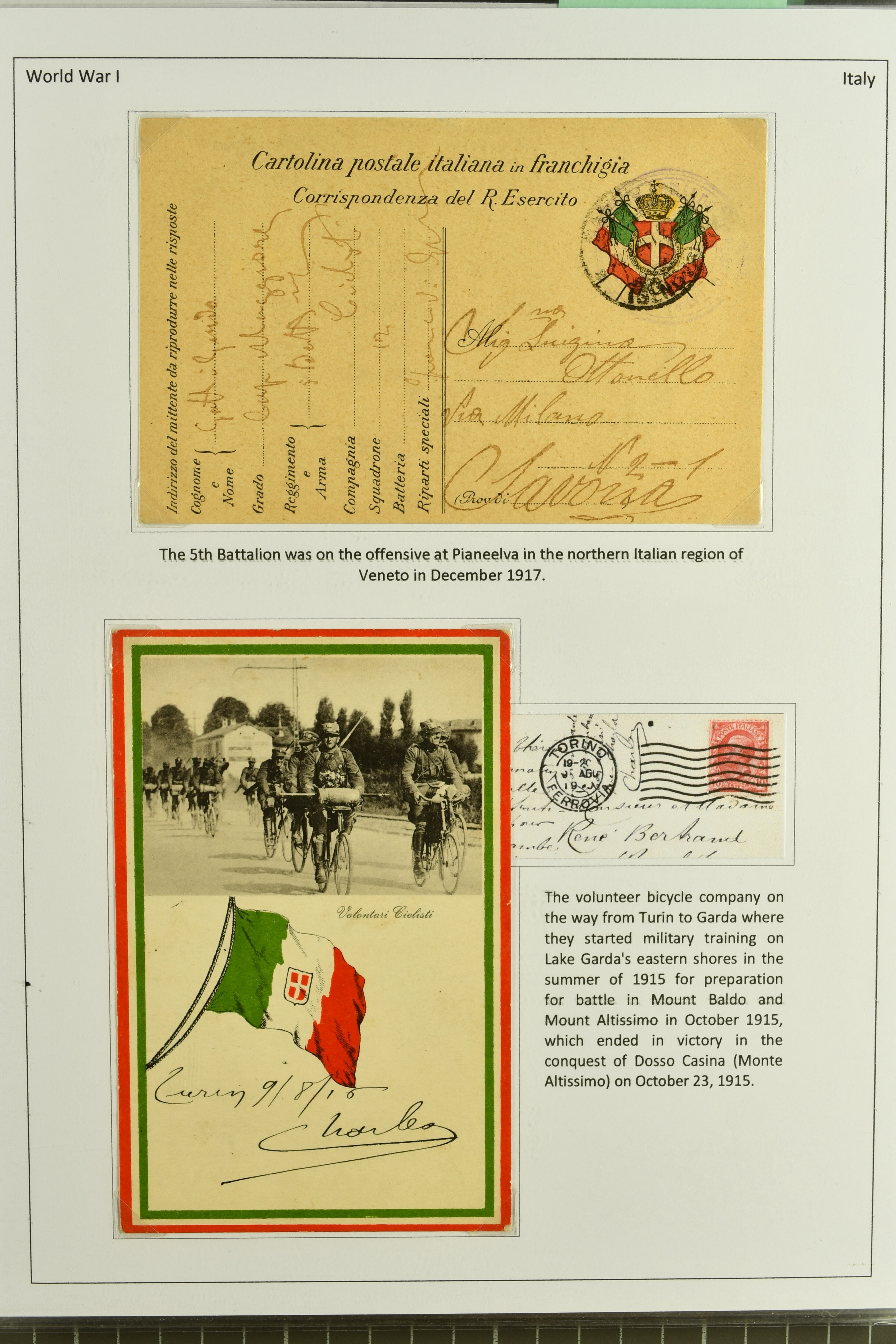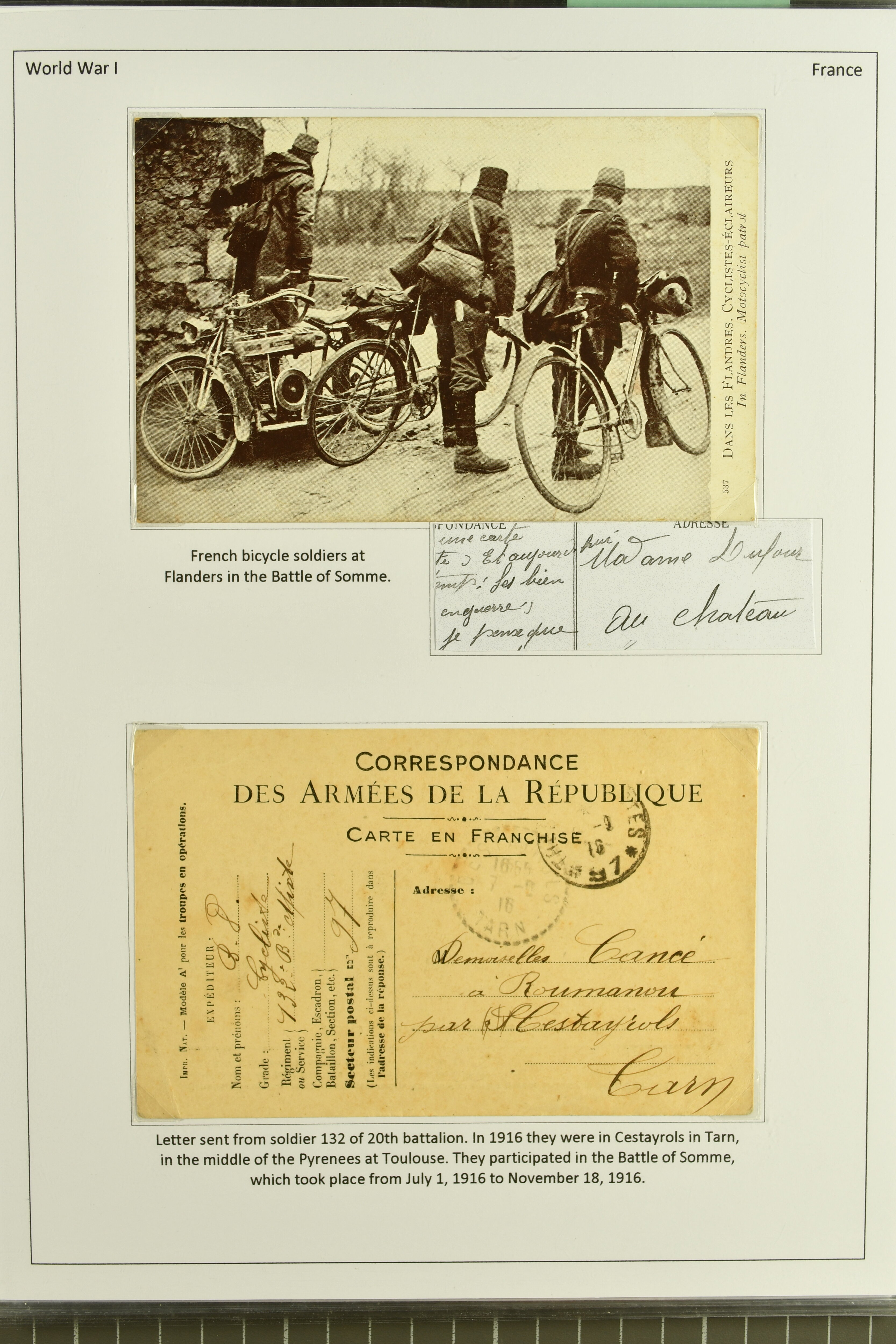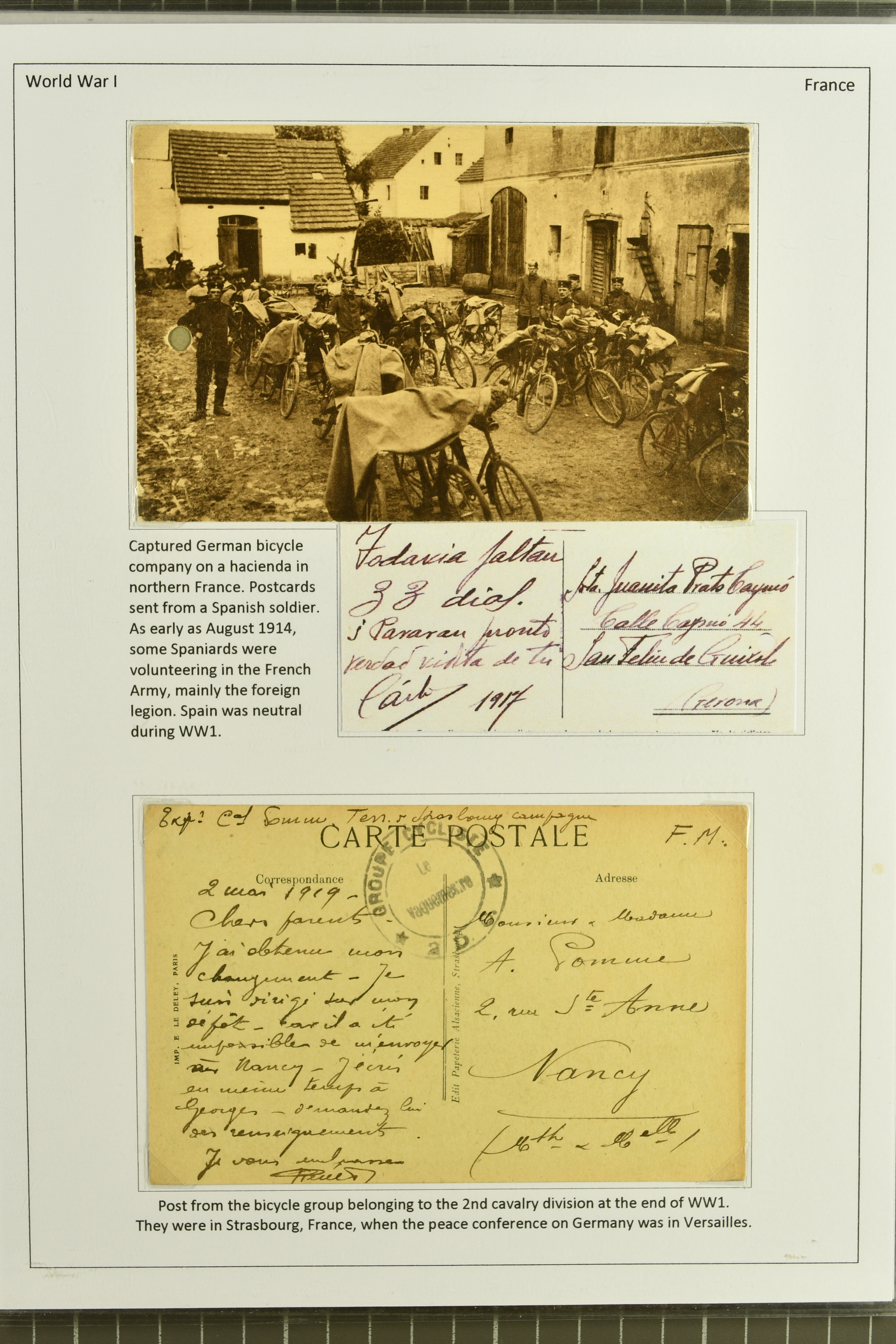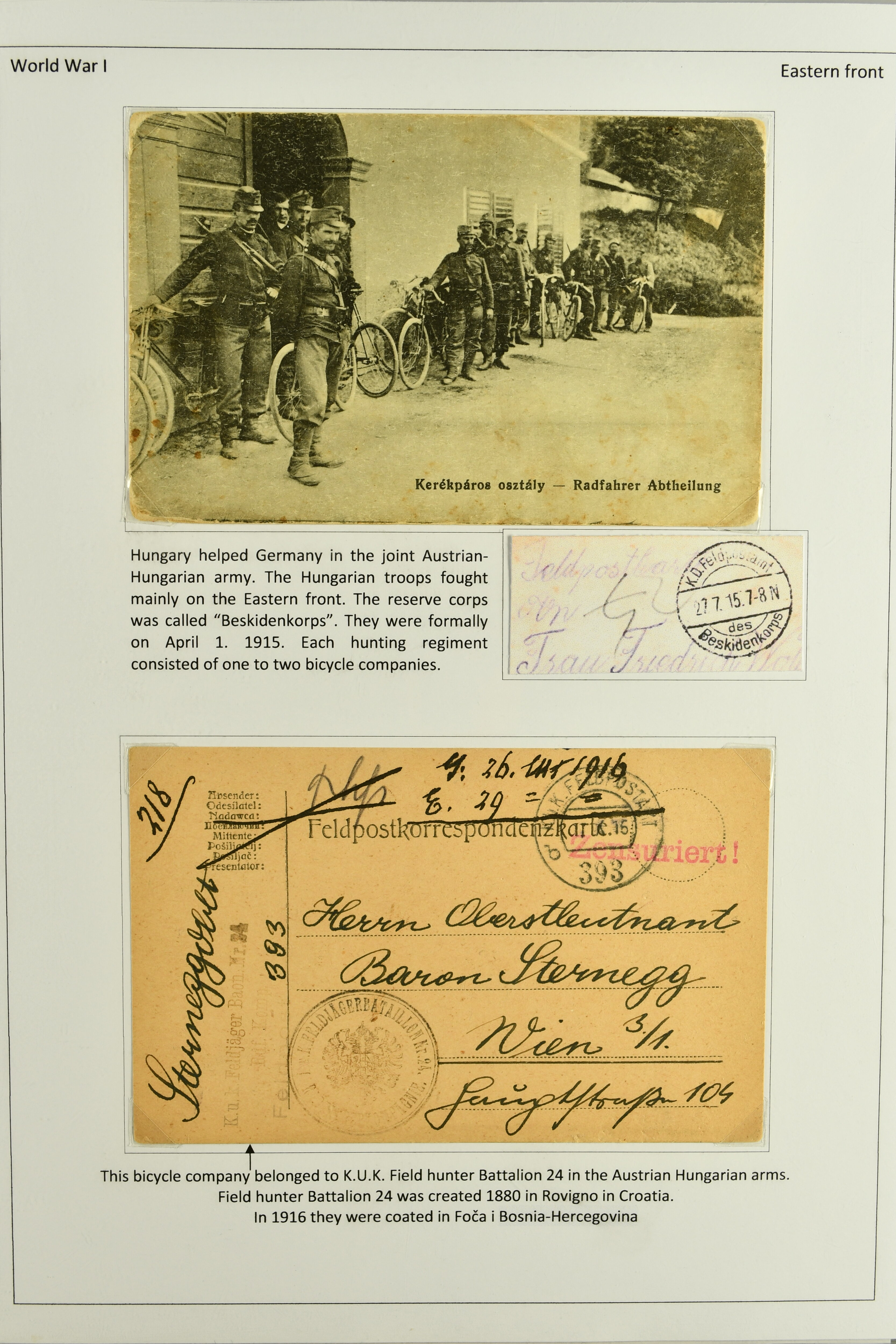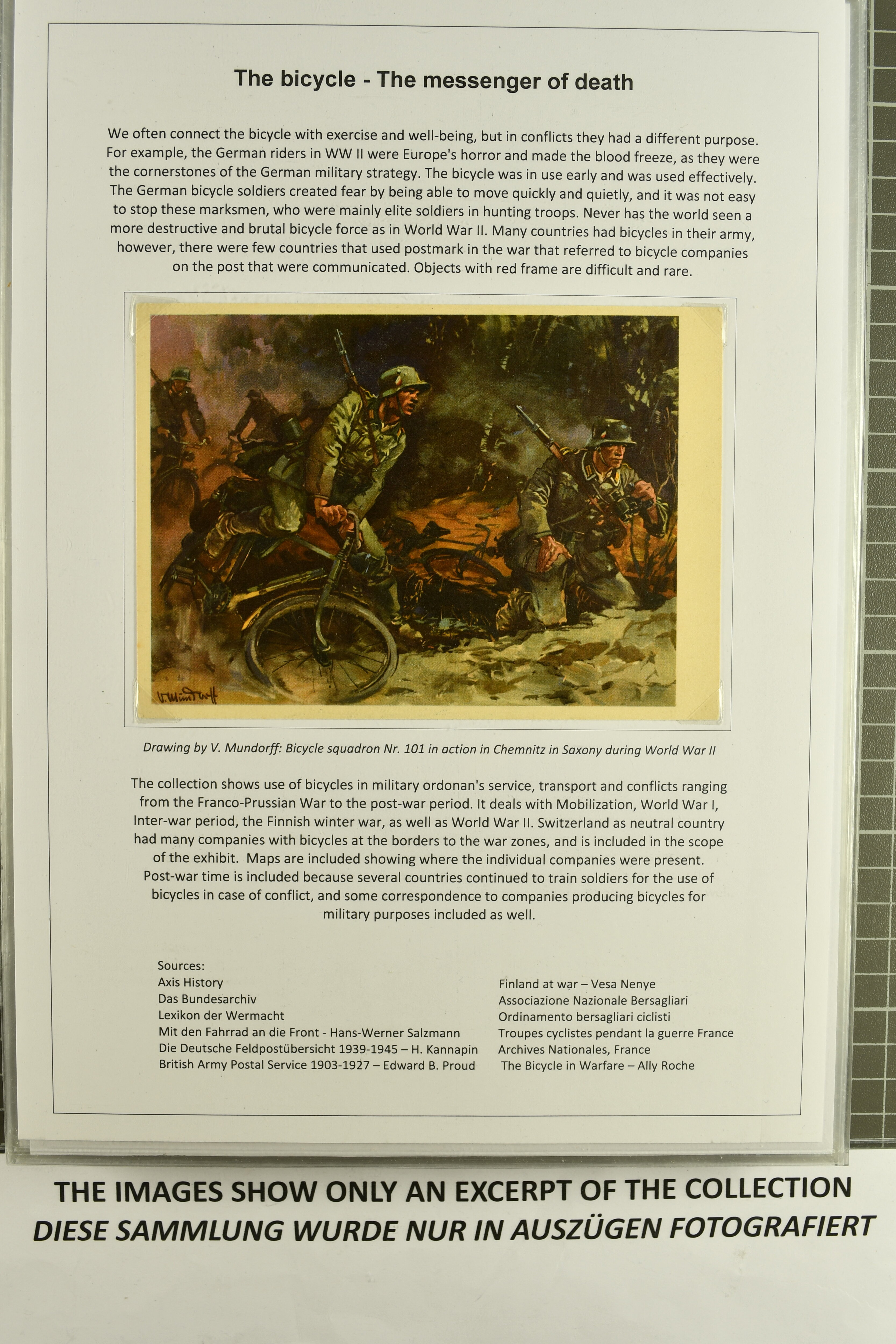 1450 cover image1914/18: Collection 80 covers / postcards with Fieldpost handstamps of cyclist military units during World War I including primarily material from German units on the Western front, also units from Hungary, France, United Kingdom with a bicycle producer postcard, and Canada. The collection includes also five picture postcards depicting these units in action and three covers from the Franco-Prussian war and the Russo-Japanese War. A rarely seen topic well presented on leaves (Image 1) (Image 2) (Image 3) (Image 4) (Image 5) (Image 6) (Image 7)