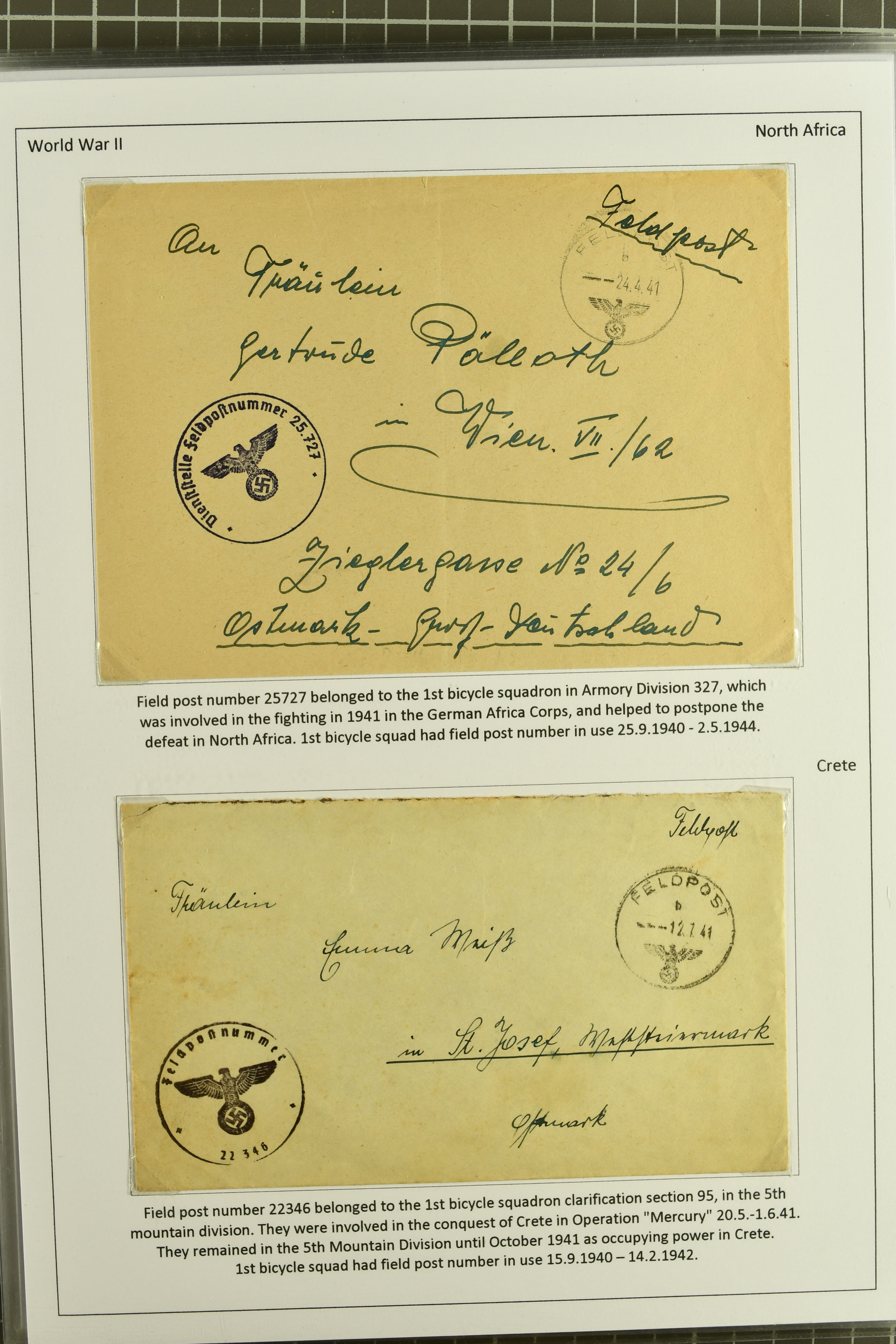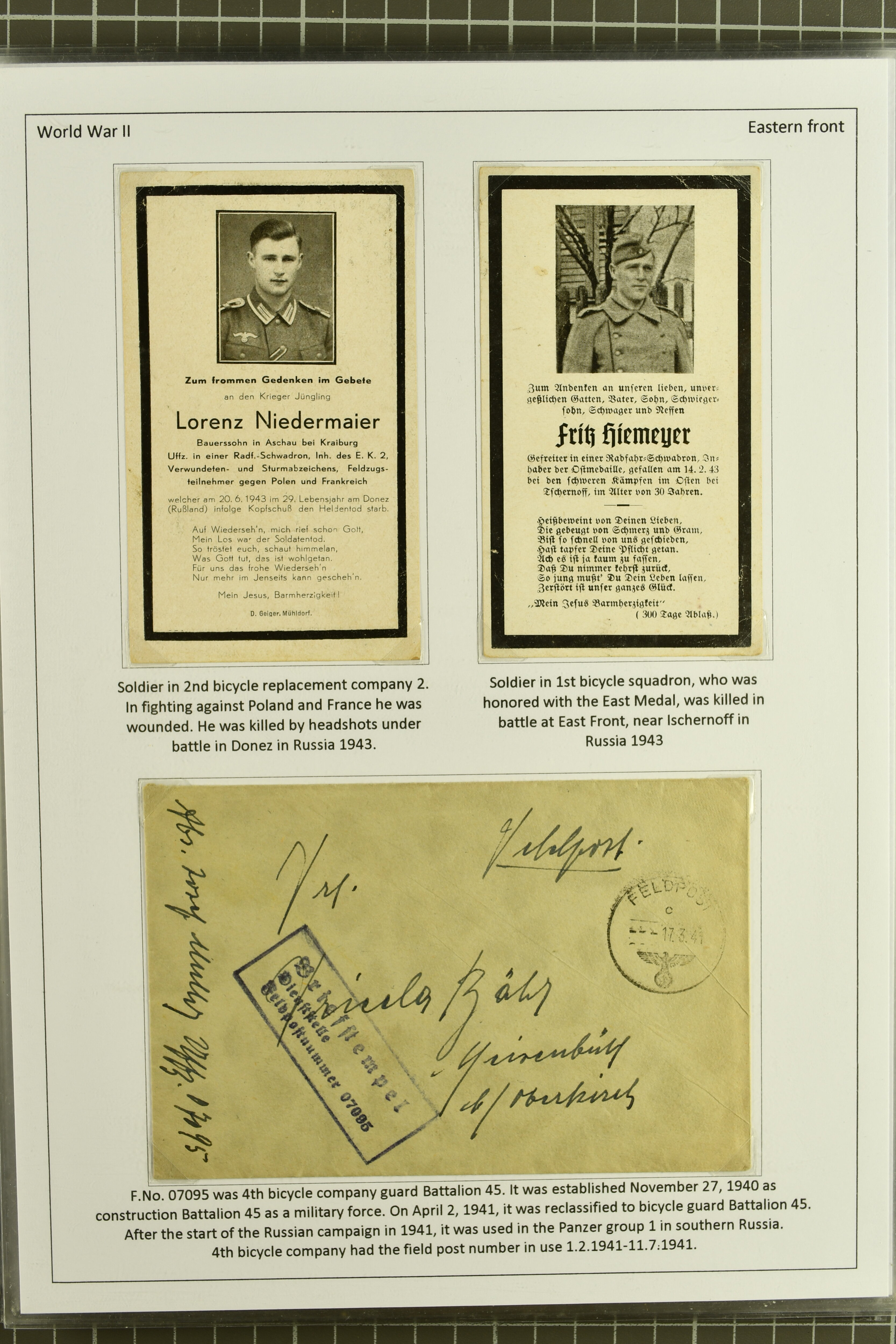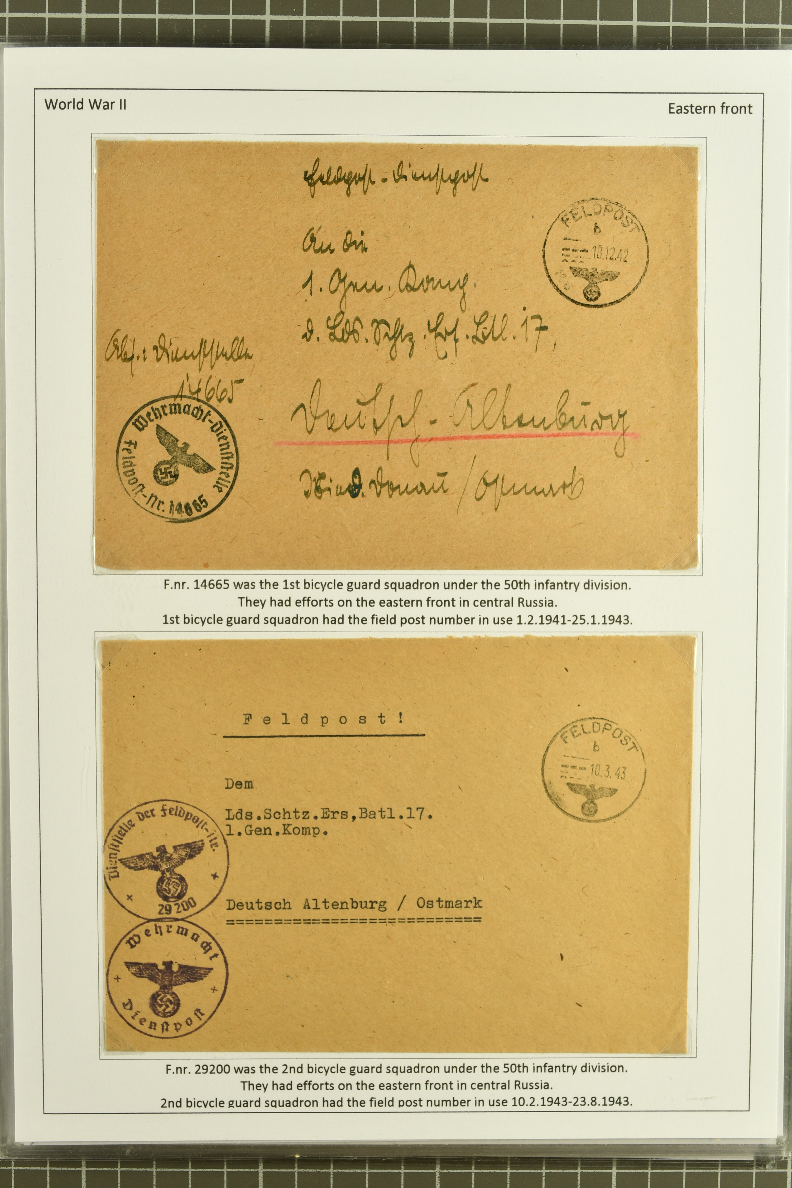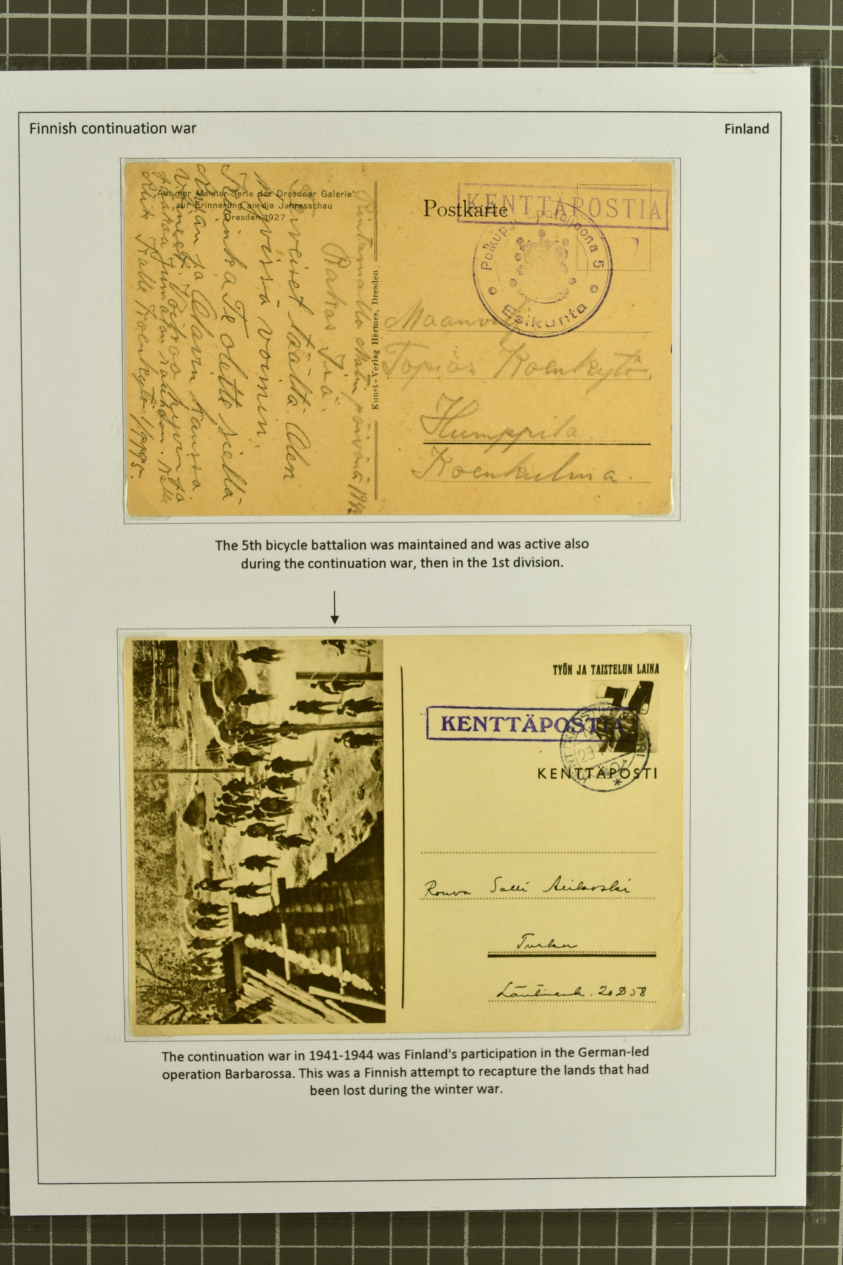 1448 cover image1939/45: Collection 50 covers / postcards with Fieldpost handstamps of cyclist military units during World War II including primarily material from German units with items sent from Norway, the Western Front and Channel Coast, Denmark, North Africa, Crete, Eastern Front, also units from Italy and Belgium. The lot includes also four covers from the Soviet-Finnish Winter War and two Finland covers from the war against the Soviet Union as part of the German occupation of Russia. A rarely seen topic well presented on leaves (Image 1) (Image 2) (Image 3) (Image 4) (Image 5) (Image 6) (Image 7) (Image 8) (Image 9) (Image 10) (Image 11)