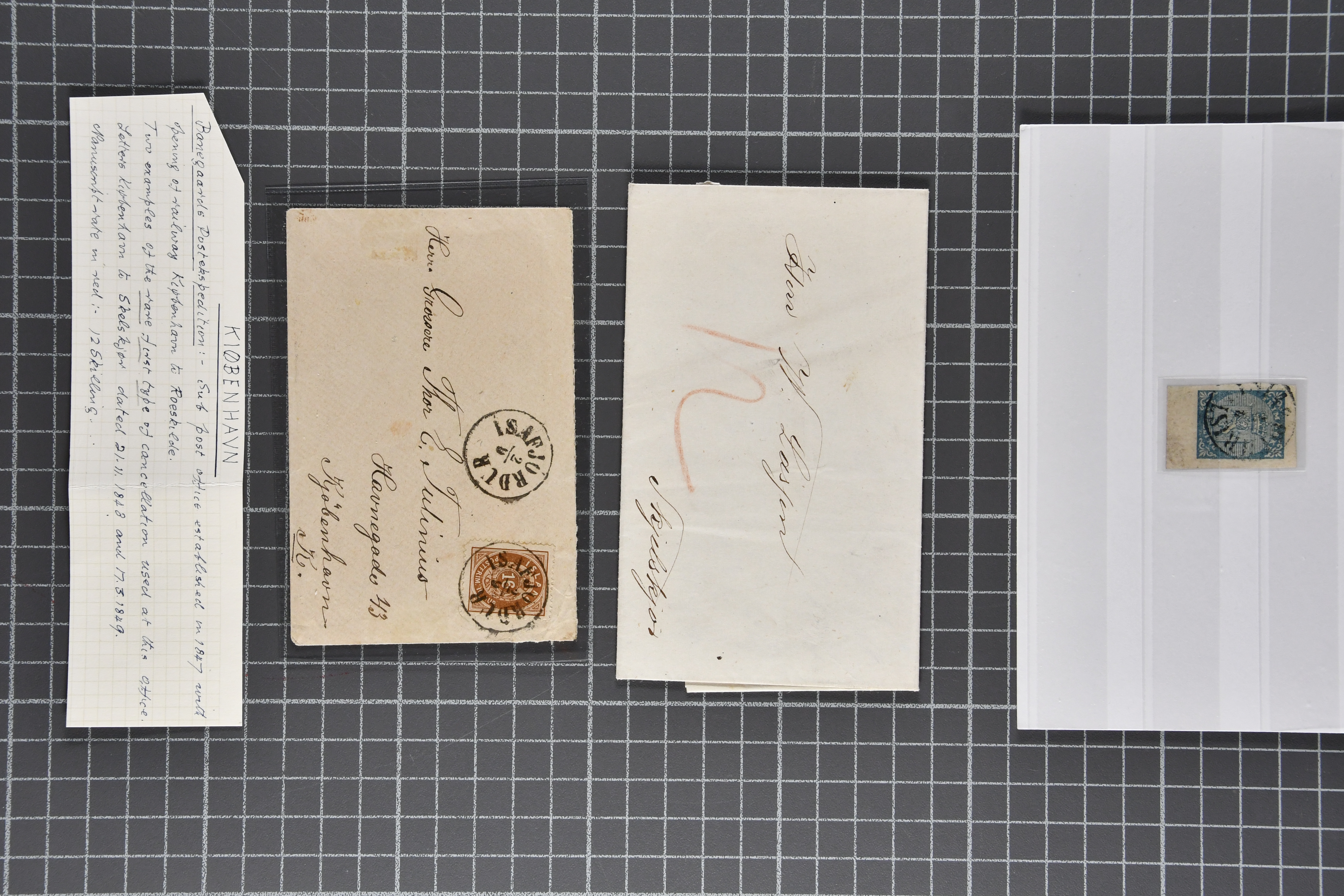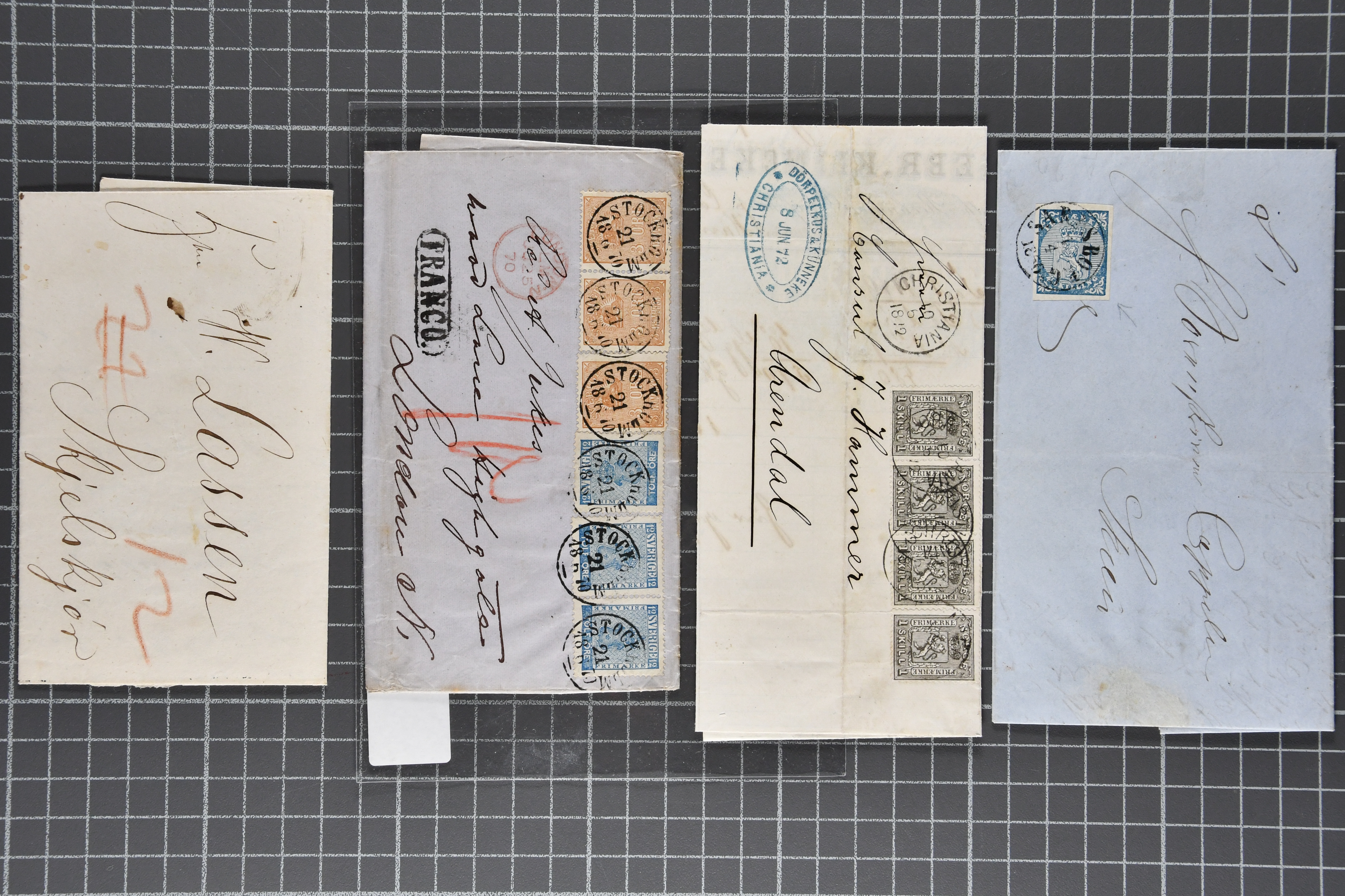 1449 cover image1856/90ca: Interesting Scandinavia lot incl. Norway 1856 entire from SARPSBORG bearing a fine 1856 Vapen 4 sk. blue, a single marginal example cancelled in CHRISTIANIA, 1872 cover CHRSTIANIA to Arendal bearing single and strip of three 1868 Vapen 1 sk. black; Sweden 1870 cover STOCKHOLM to LONDON with an unusual mixed franking of Vapen 12 ø. blue and Lion 3 ø. bistre, single & pair of each (Facit = SEK 8'000) to pay the 45 ø rate to the United Kingdom; Denmark two prephilatelic entires 1848/49 despatched at the Banegaards Postexpedition in Copenhagen and struck with the first rare "JRB. PST. EXP." type of datestamp in blue; and Iceland 1890 cover from ISAFJÖRD to Copenhagen bearing 1876 16 Aur brown (Image 1) (Image 2)