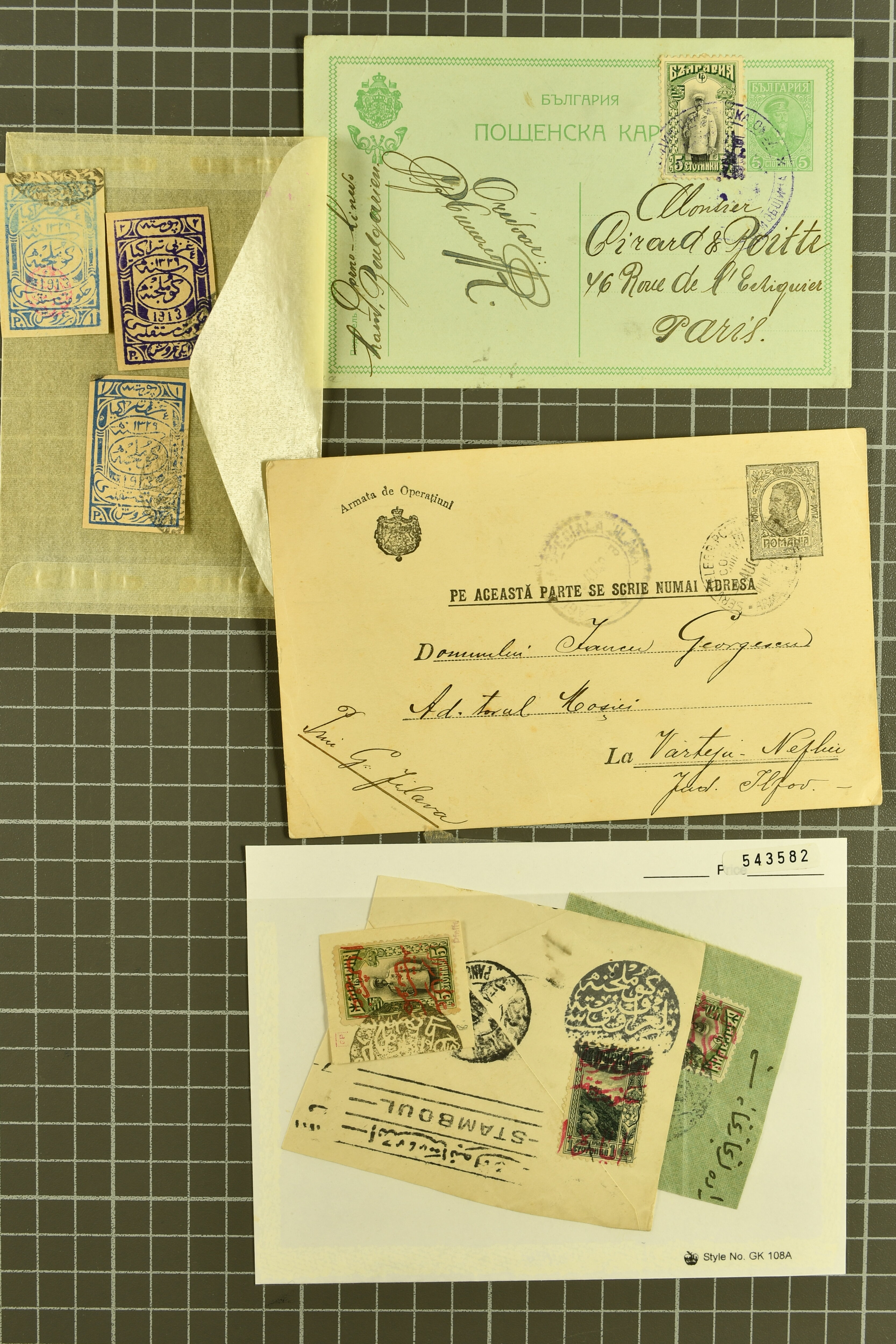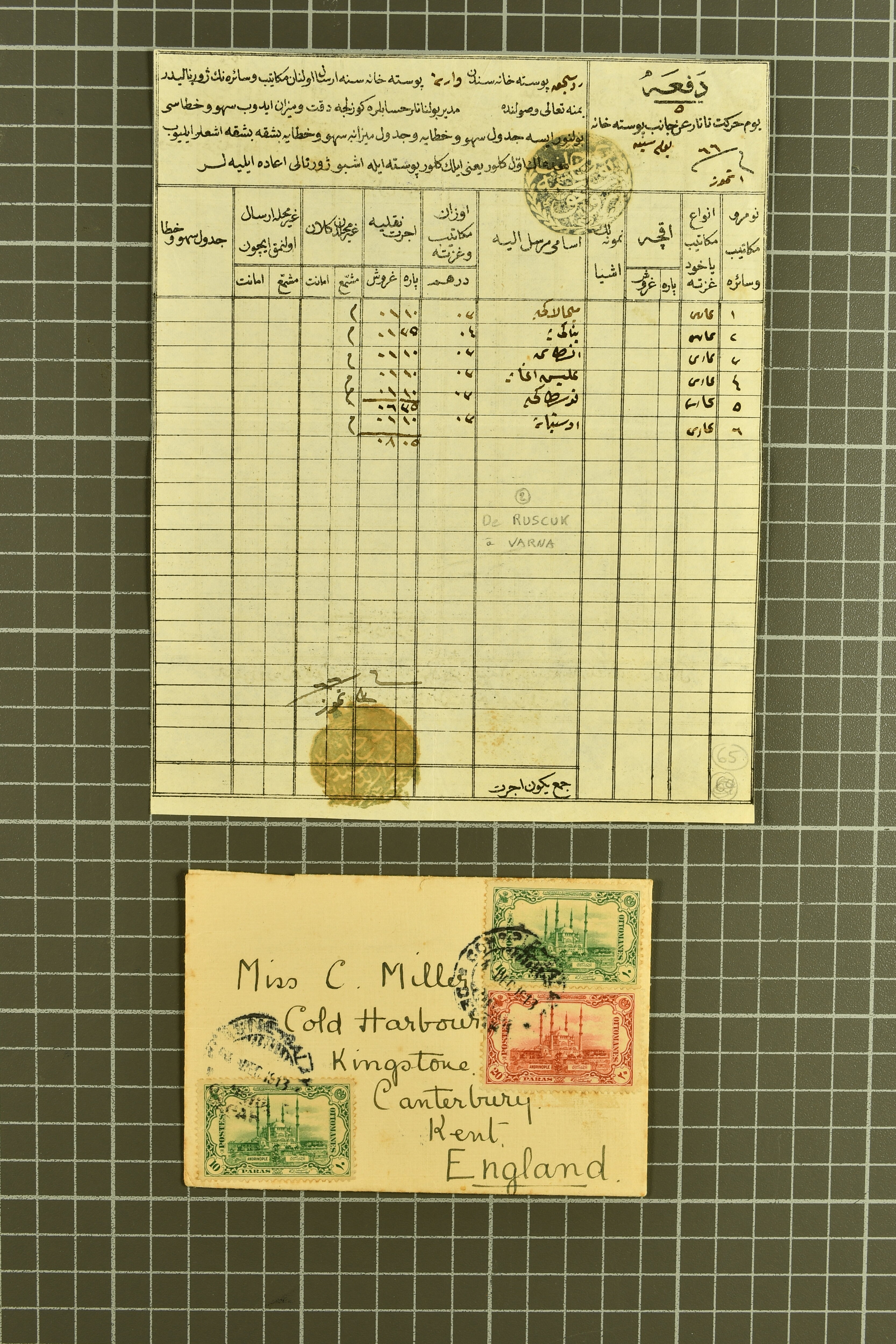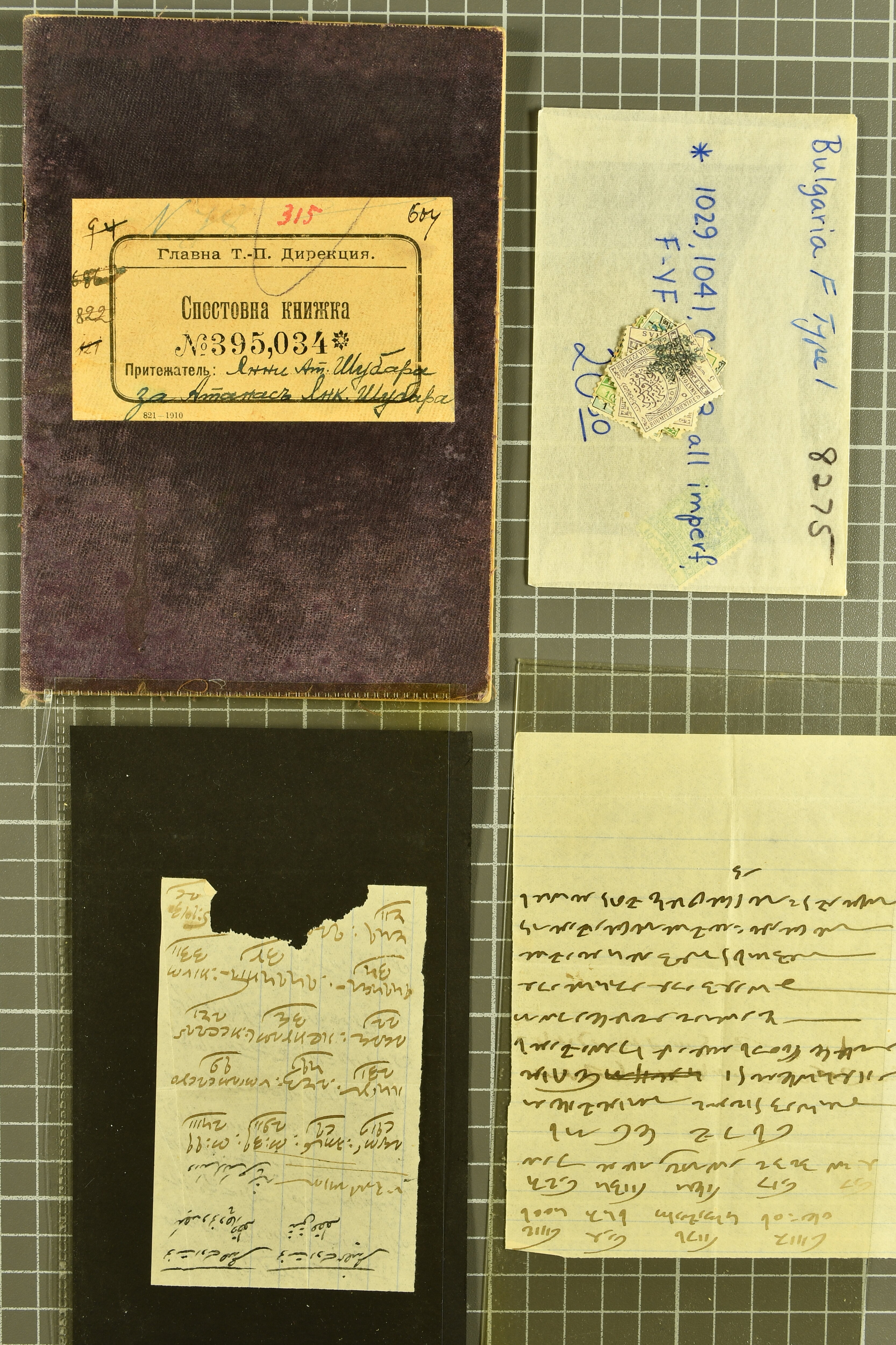 1446 cover image1840/1919: Diverse selection with Tartar Post form with fine strike of negative RUSTCHUK despatch handstamp and Varna arrival at base; Bulgarian 1919 Savings Booklet with range of Fiscals inside, all cancelled by "Stanimaka" datestamps, Thrace 1913 postal stationery envelopes with 1 pi. blue (2, different sizes) cancelled in red and in black, 2 pi. violet envelopes (2) cancelled in black, range of Eastern Roumelia stamps, Dedeagatch 1913 Typset 1 lepta - 50 lepta in a sheet of eight subjects with red Control markings and cancelled by two circular Anchor cachets in black. Unusual and interesting group (Image 1) (Image 2) (Image 3) (Image 4) (Image 5) (Image 6) (Image 7) (Image 8)