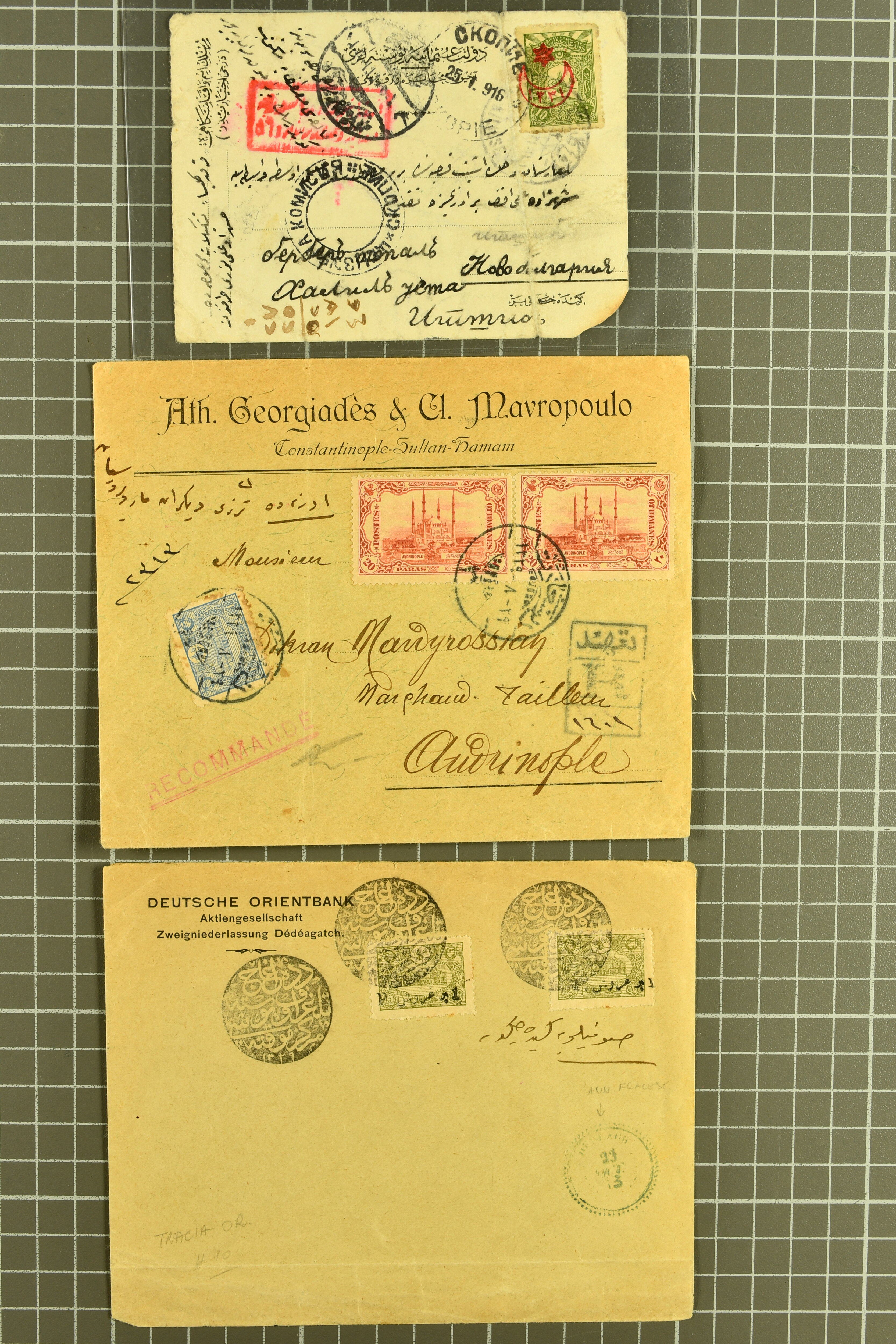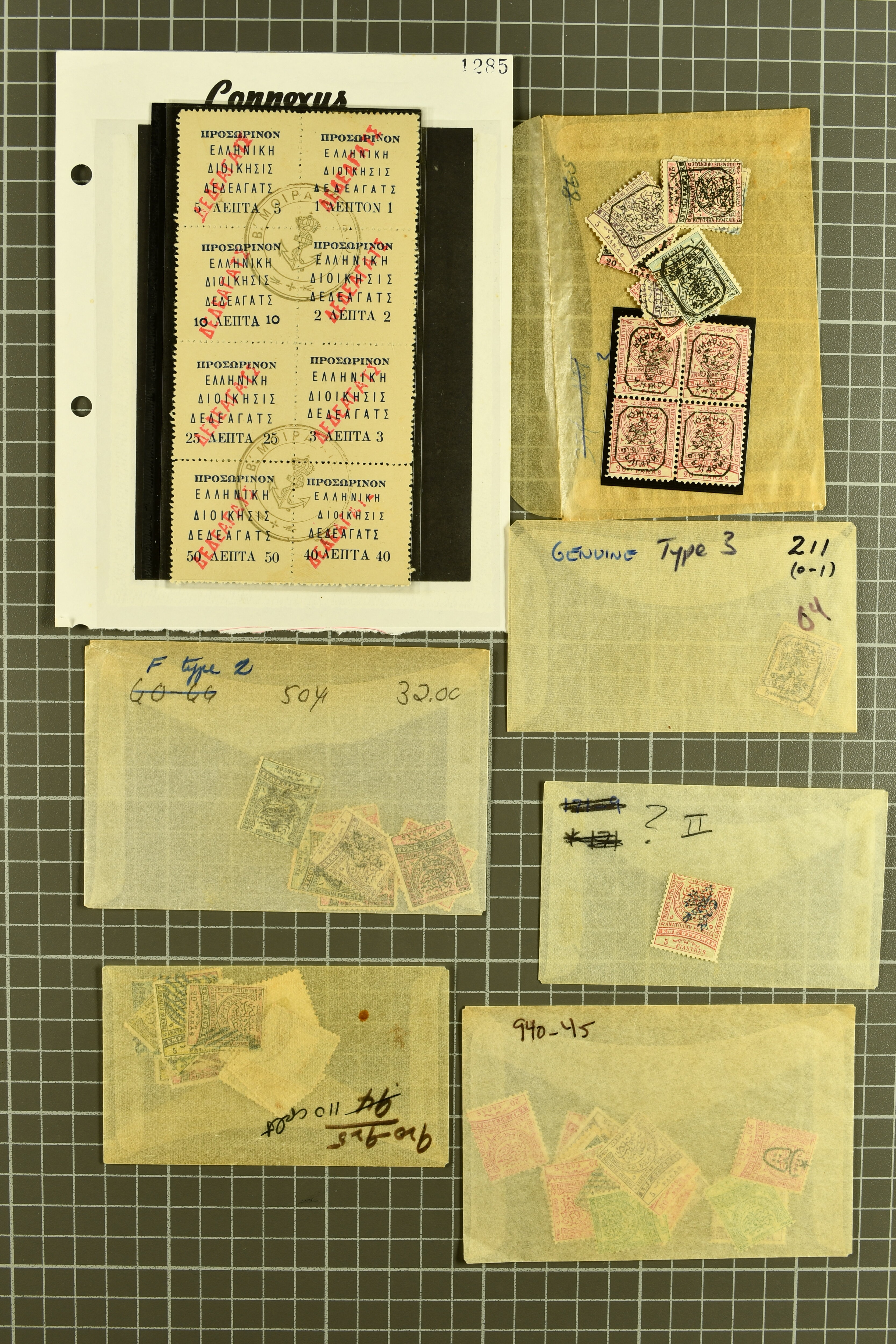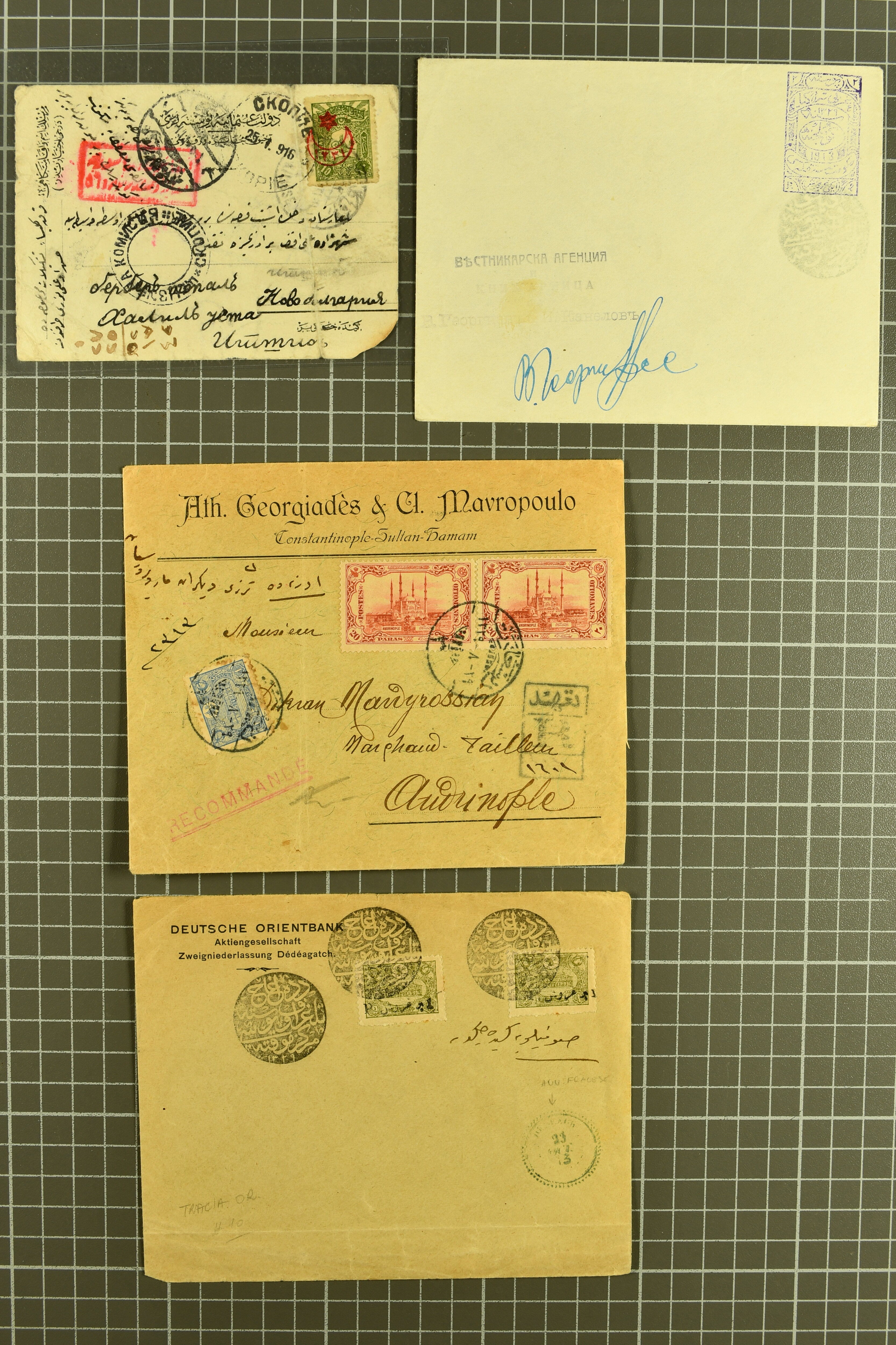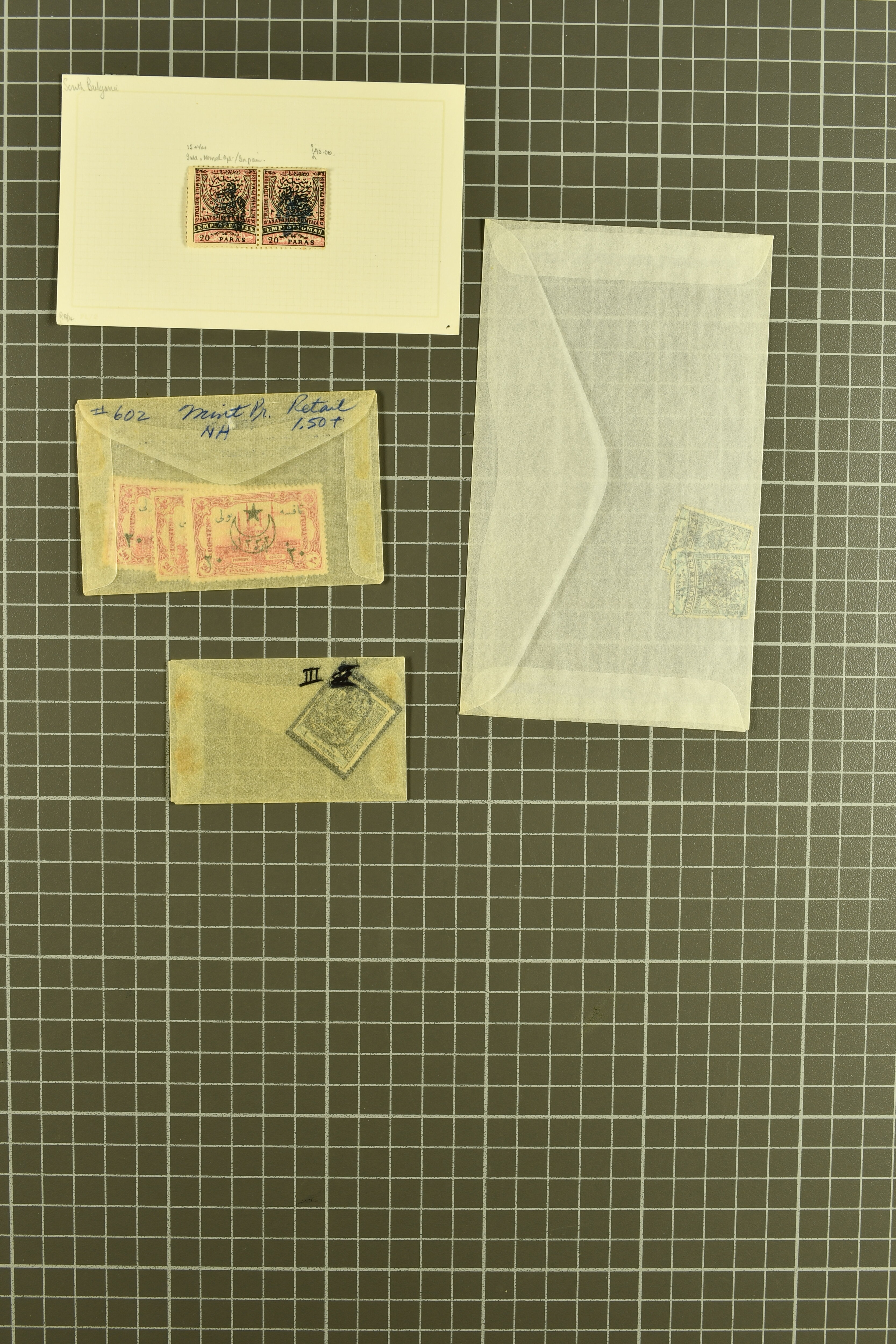 1446 cover image1840/1919: Diverse selection with Tartar Post form with fine strike of negative RUSTCHUK despatch handstamp and Varna arrival at base; Bulgarian 1919 Savings Booklet with range of Fiscals inside, all cancelled by "Stanimaka" datestamps, Thrace 1913 postal stationery envelopes with 1 pi. blue (2, different sizes) cancelled in red and in black, 2 pi. violet envelopes (2) cancelled in black, range of Eastern Roumelia stamps, Dedeagatch 1913 Typset 1 lepta - 50 lepta in a sheet of eight subjects with red Control markings and cancelled by two circular Anchor cachets in black. Unusual and interesting group (Image 1) (Image 2) (Image 3) (Image 4) (Image 5) (Image 6) (Image 7) (Image 8)