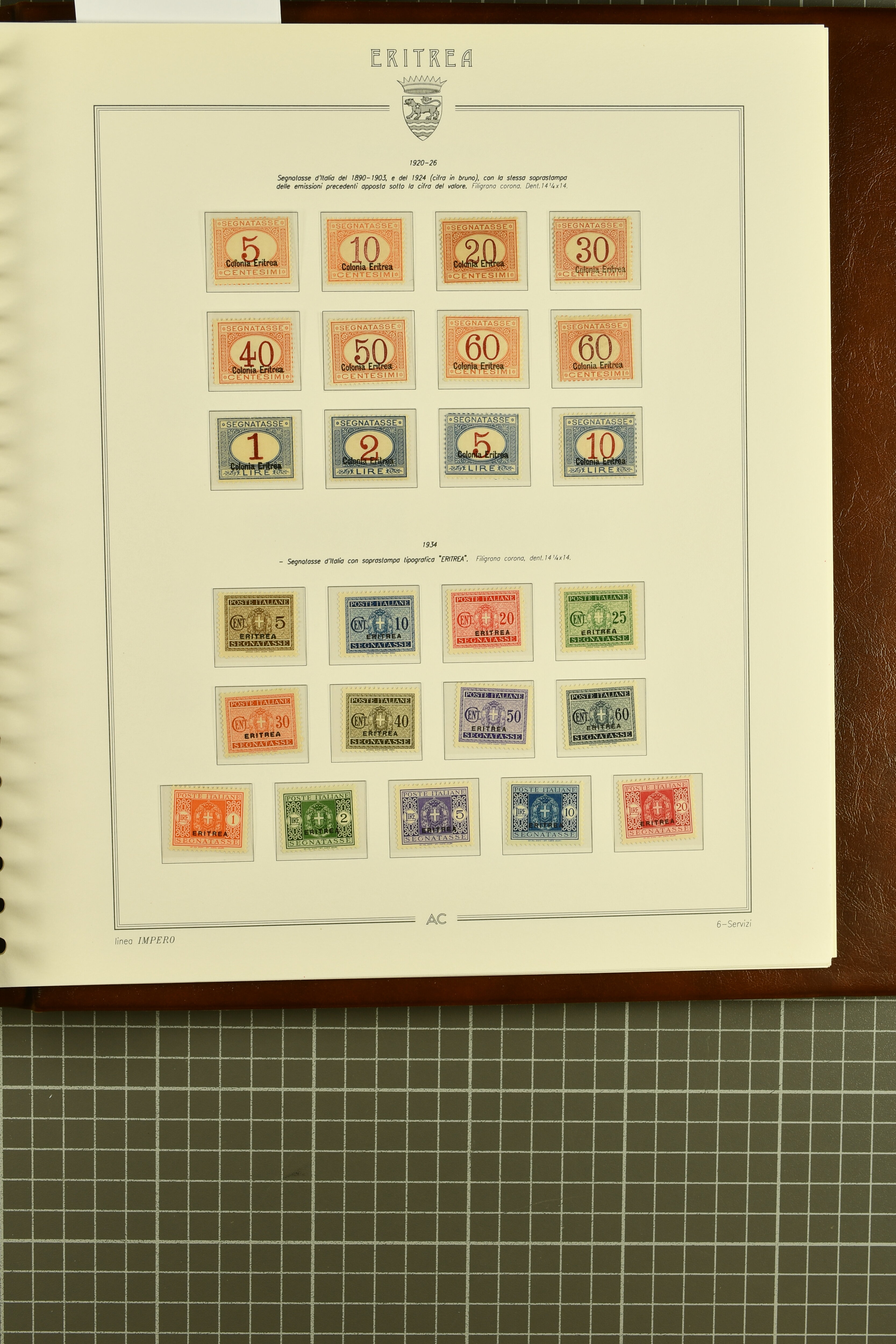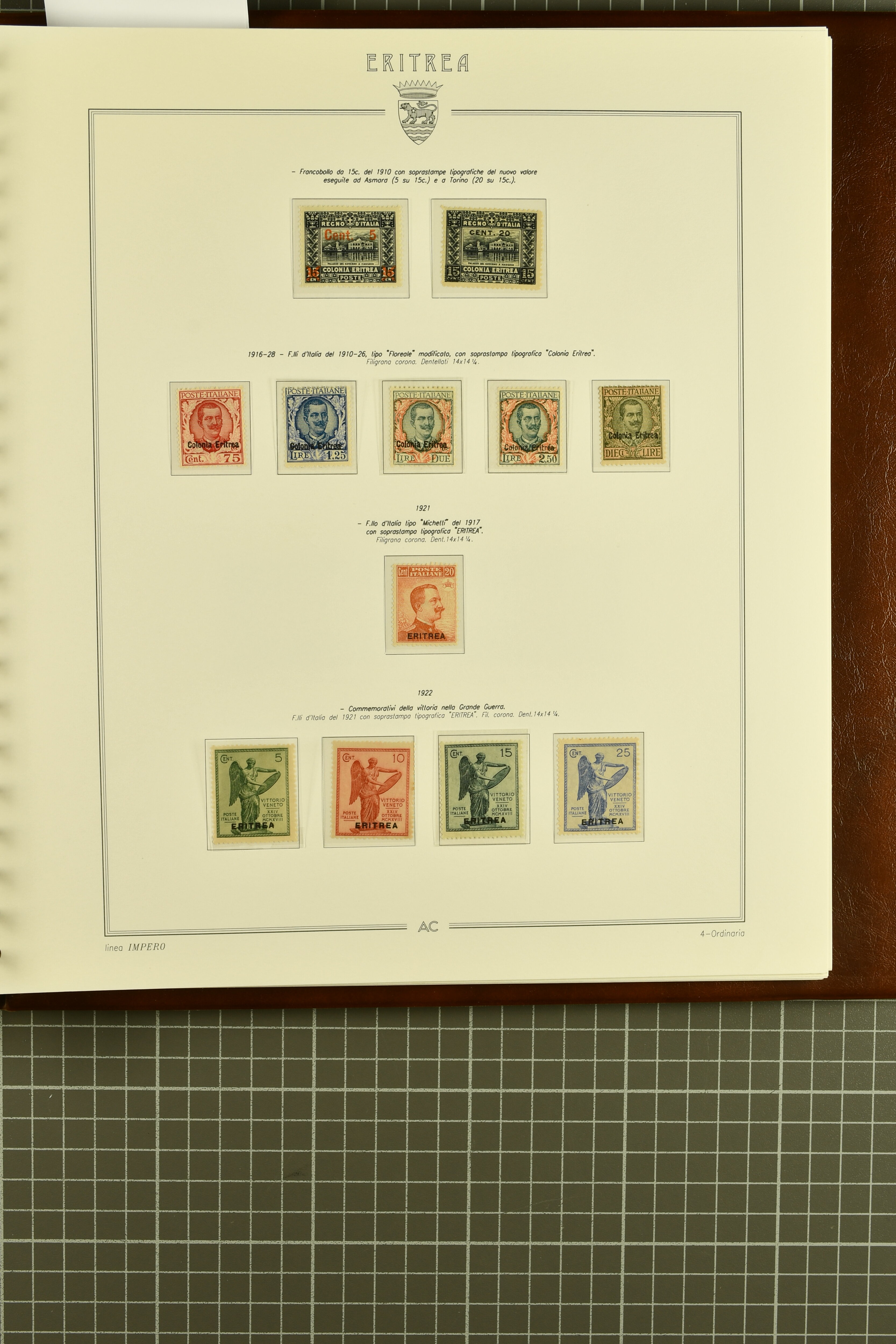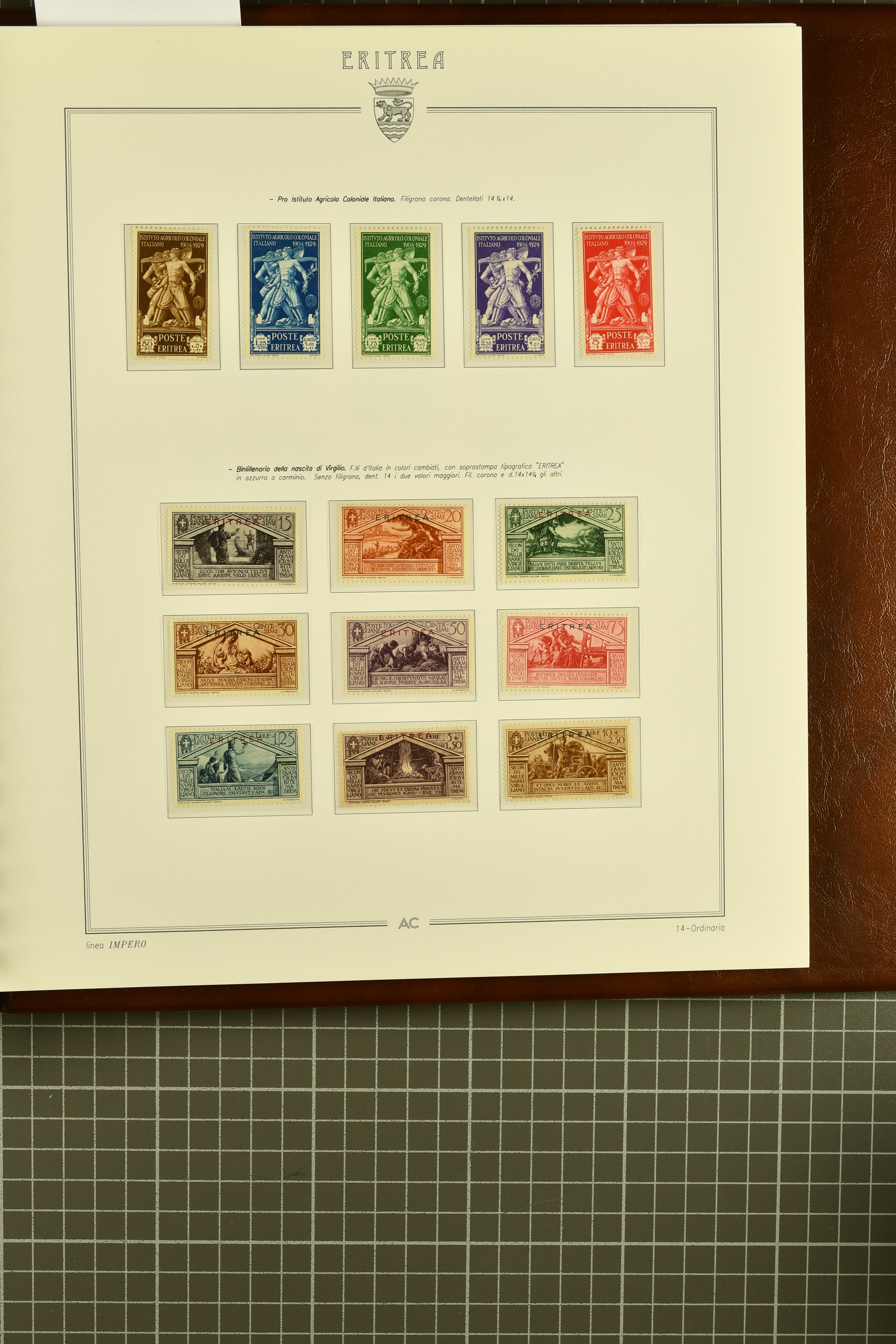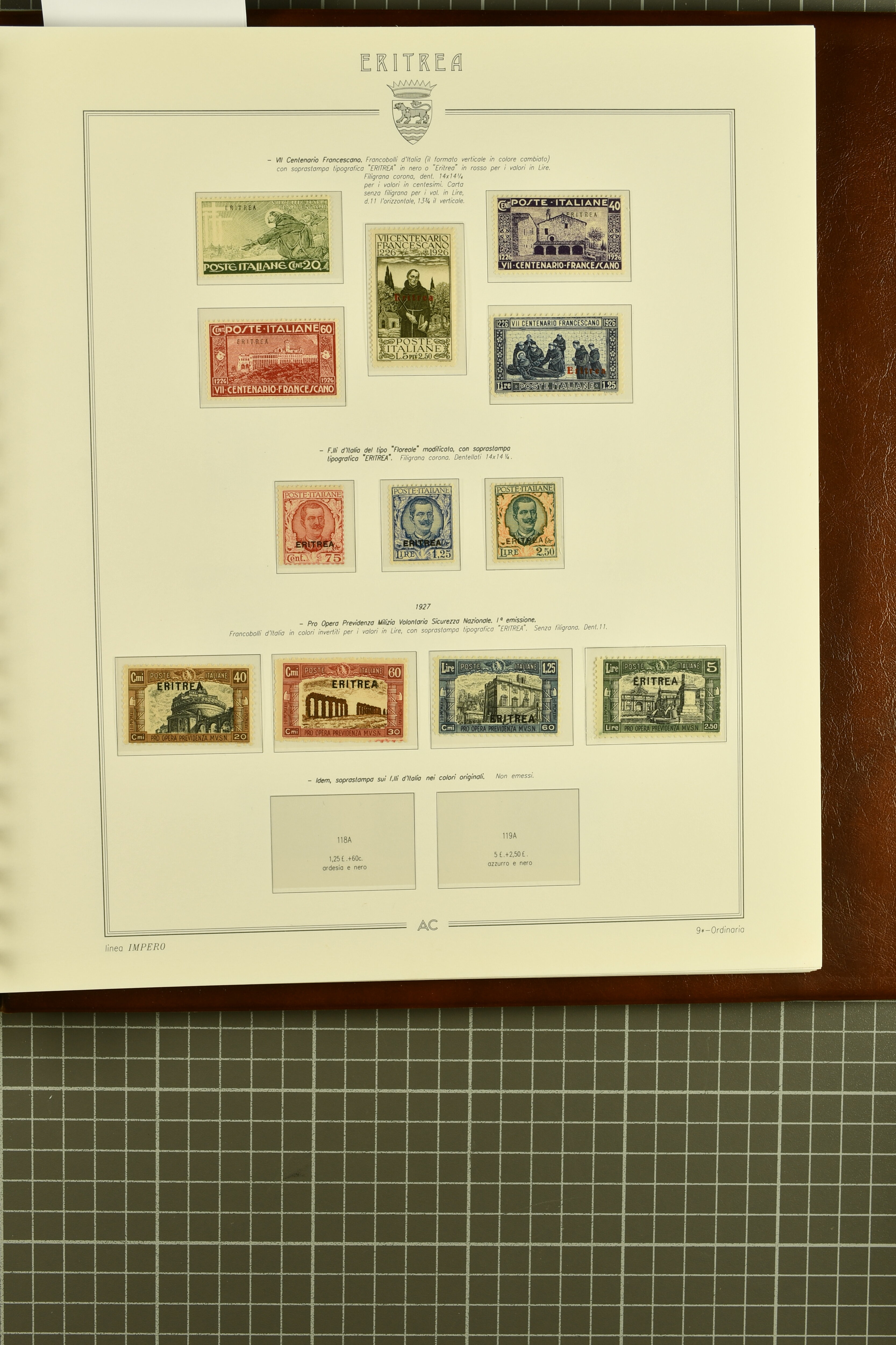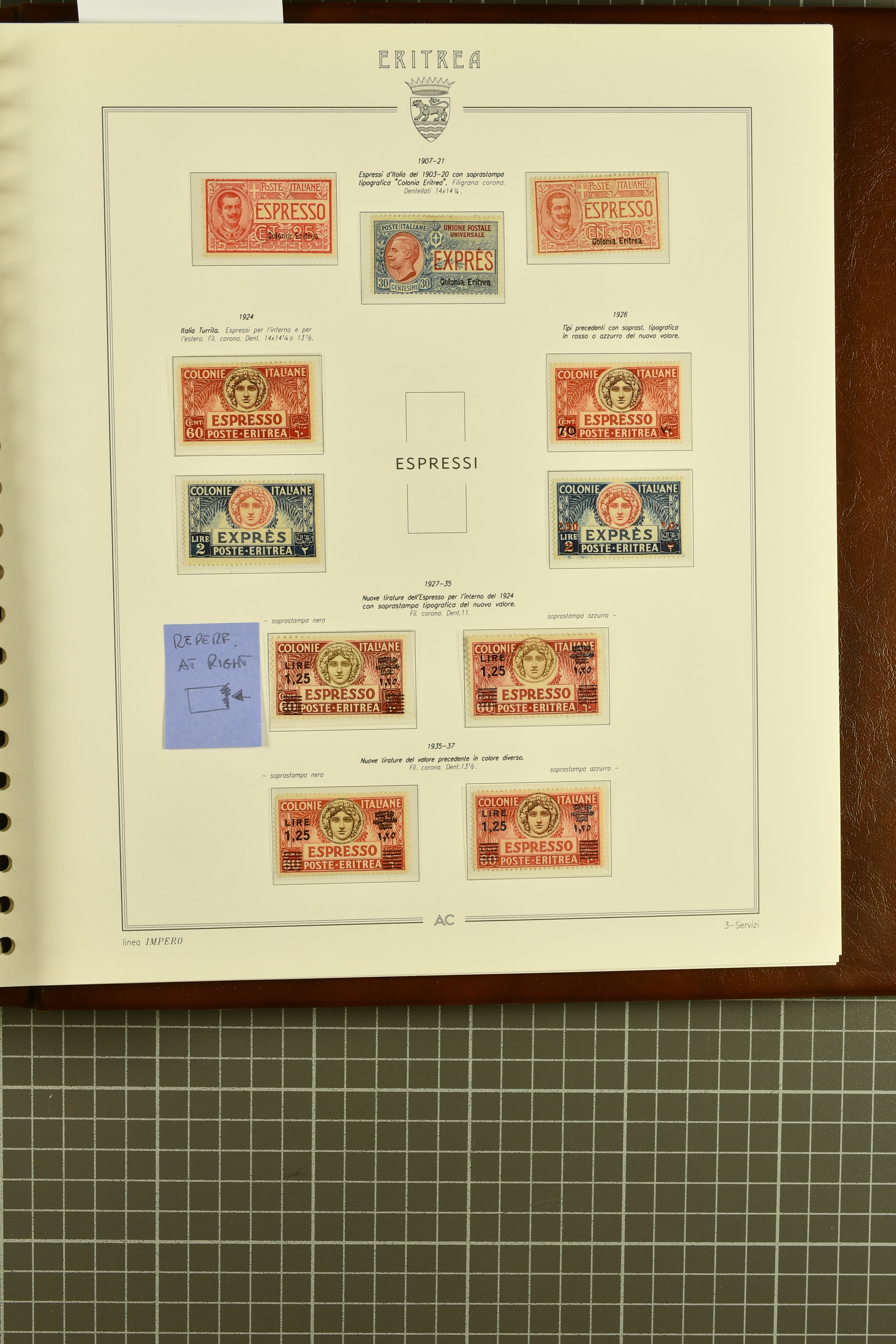 7613 **/*/(*) imageCollection hundreds of unused stamps without duplicates of Eritrea, Ethiopia, Saseno. The 'IMPERO' brown album contains: general issues, postage due stamps, postal parcel stamps, air post stamps, special delivery stamps almost all of them in complete set. General mixed conditions, mostly hinged and some with toned or brownish gum but also some adhesives in good conditions never hinged. Eritrea: the special delivery stamp lire 1,25 on 60 cent carmine perf 11 with the overprint in black reperforated at right. Collections almost completed, viewing is highly recommended. Certificate Diena (1). Sold as it is (Image 1) (Image 2) (Image 3) (Image 4) (Image 5) (Image 6) (Image 7) (Image 8) (Image 9) (Image 10) (Image 11) (Image 12) (Image 13) (Image 14) (Image 15) (Image 16) (Image 17) (Image 18) (Image 19) (Image 20) (Image 21) (Image 22) (Image 23) (Image 24) (Image 25) (Image 26) (Image 27) (Image 28)