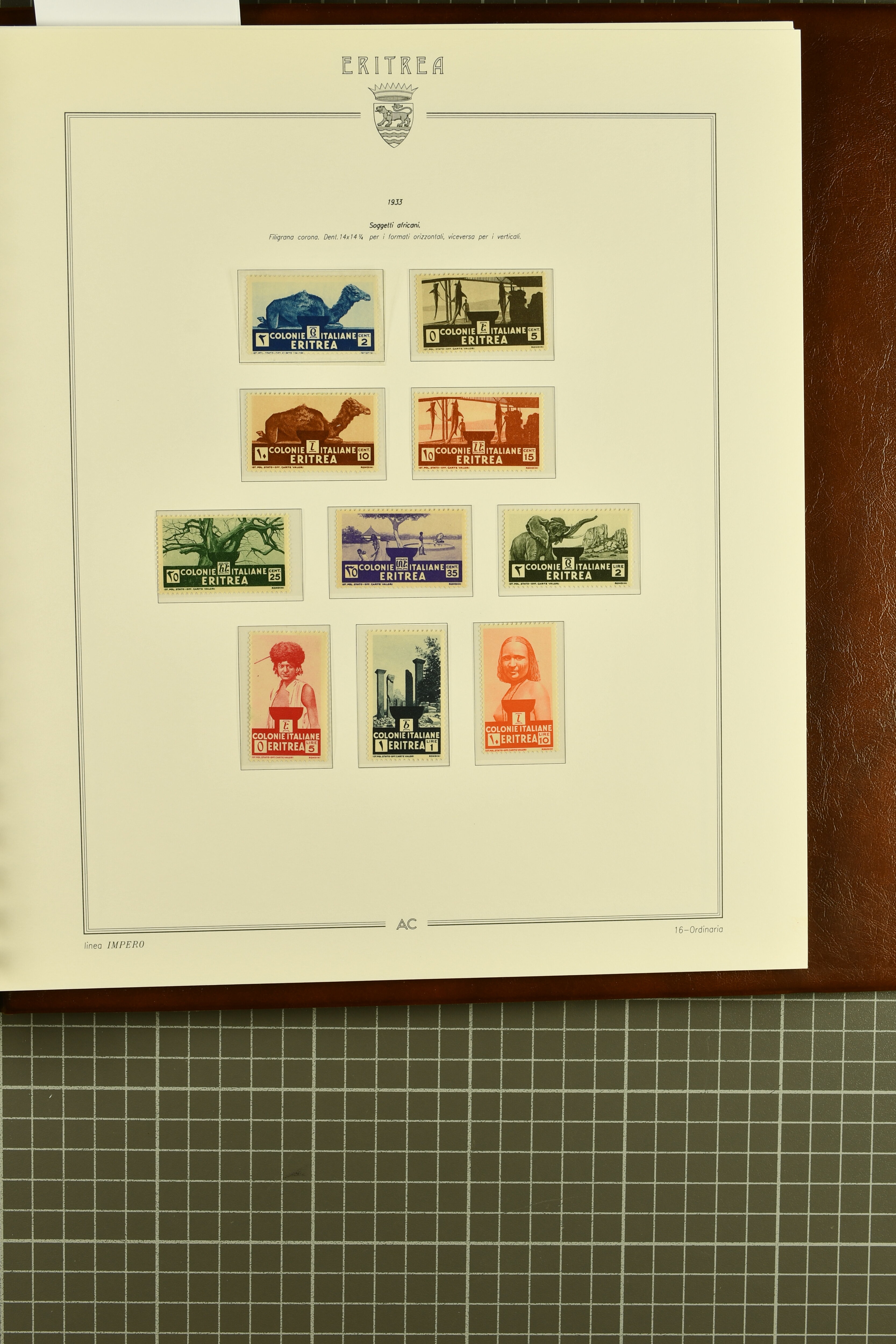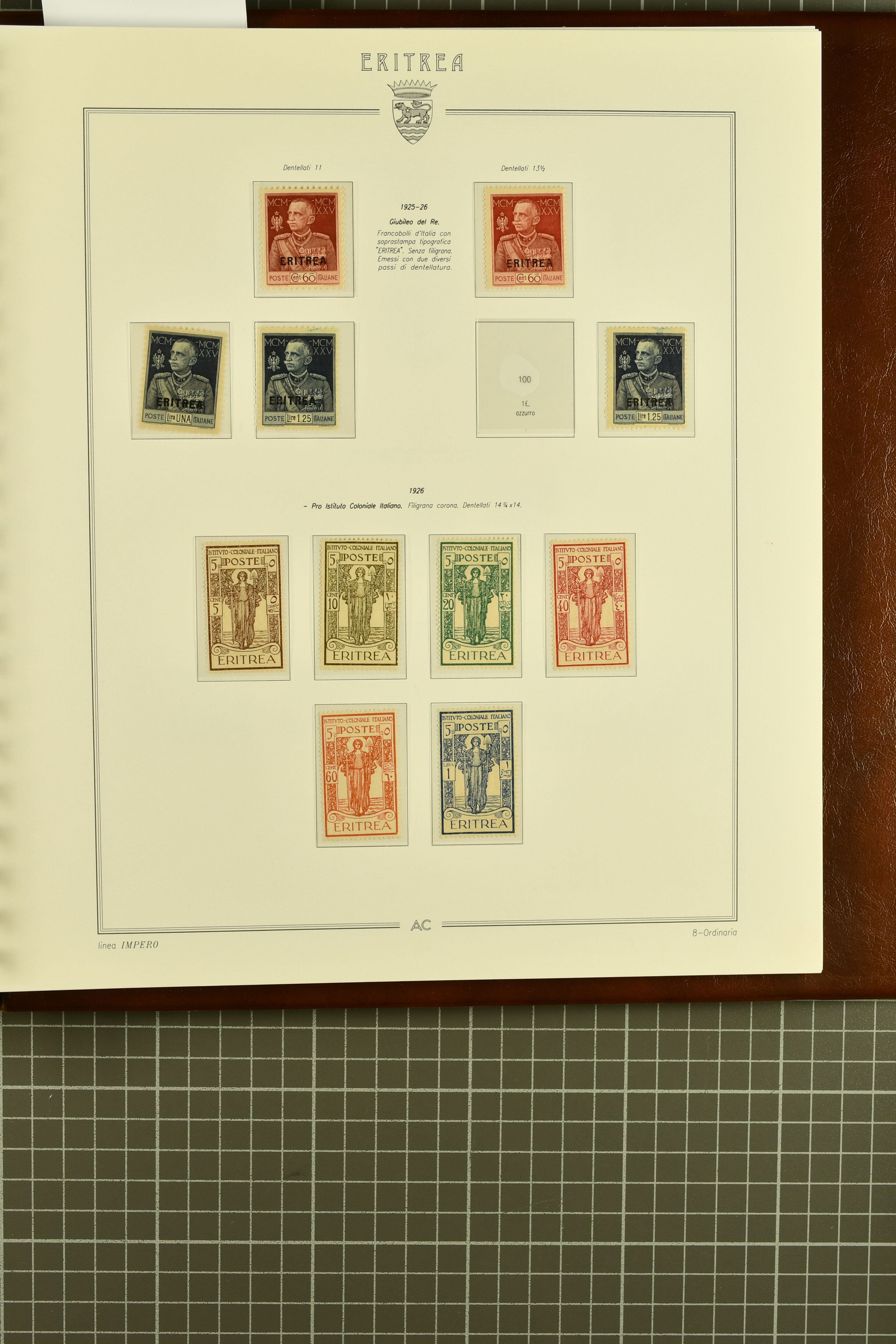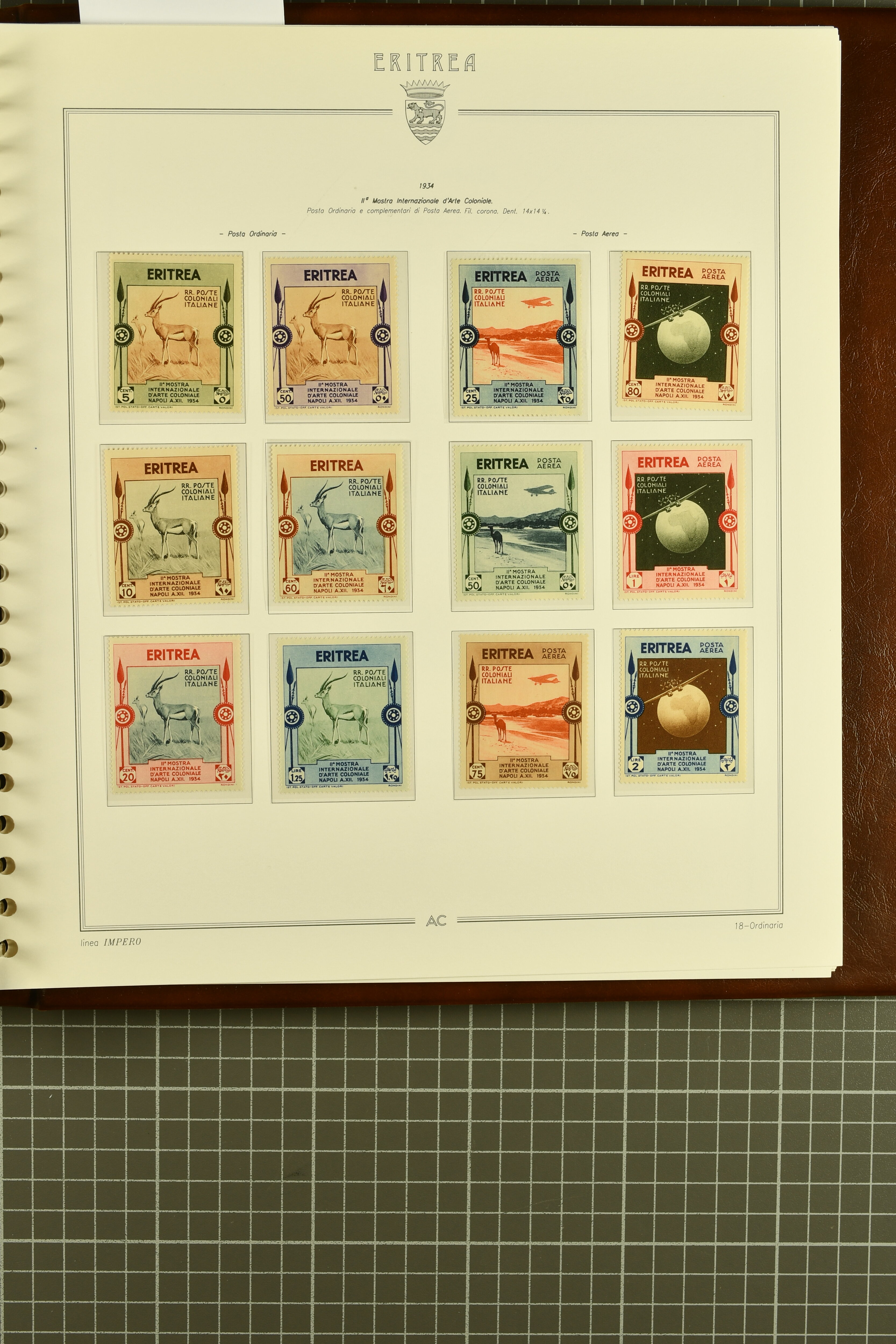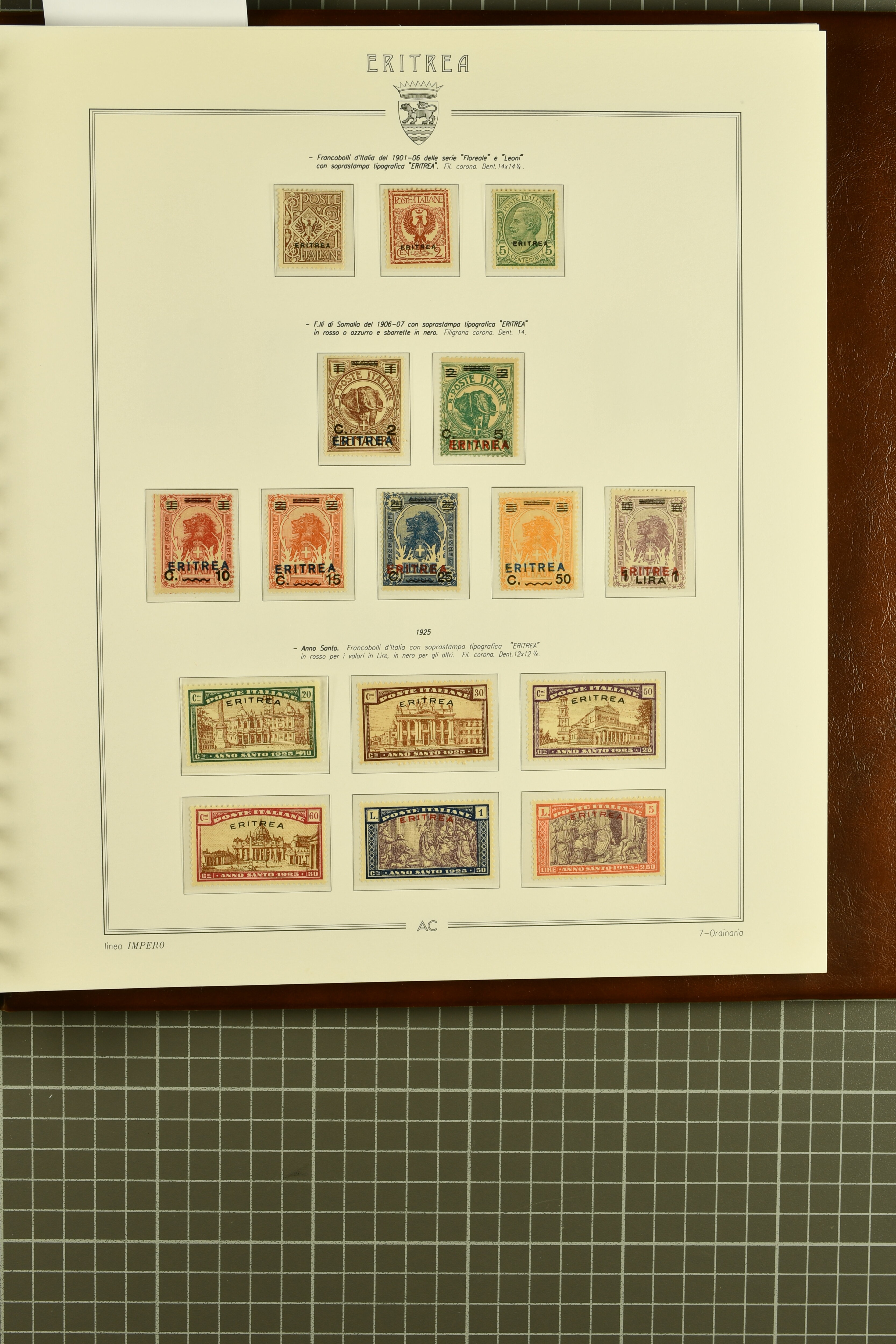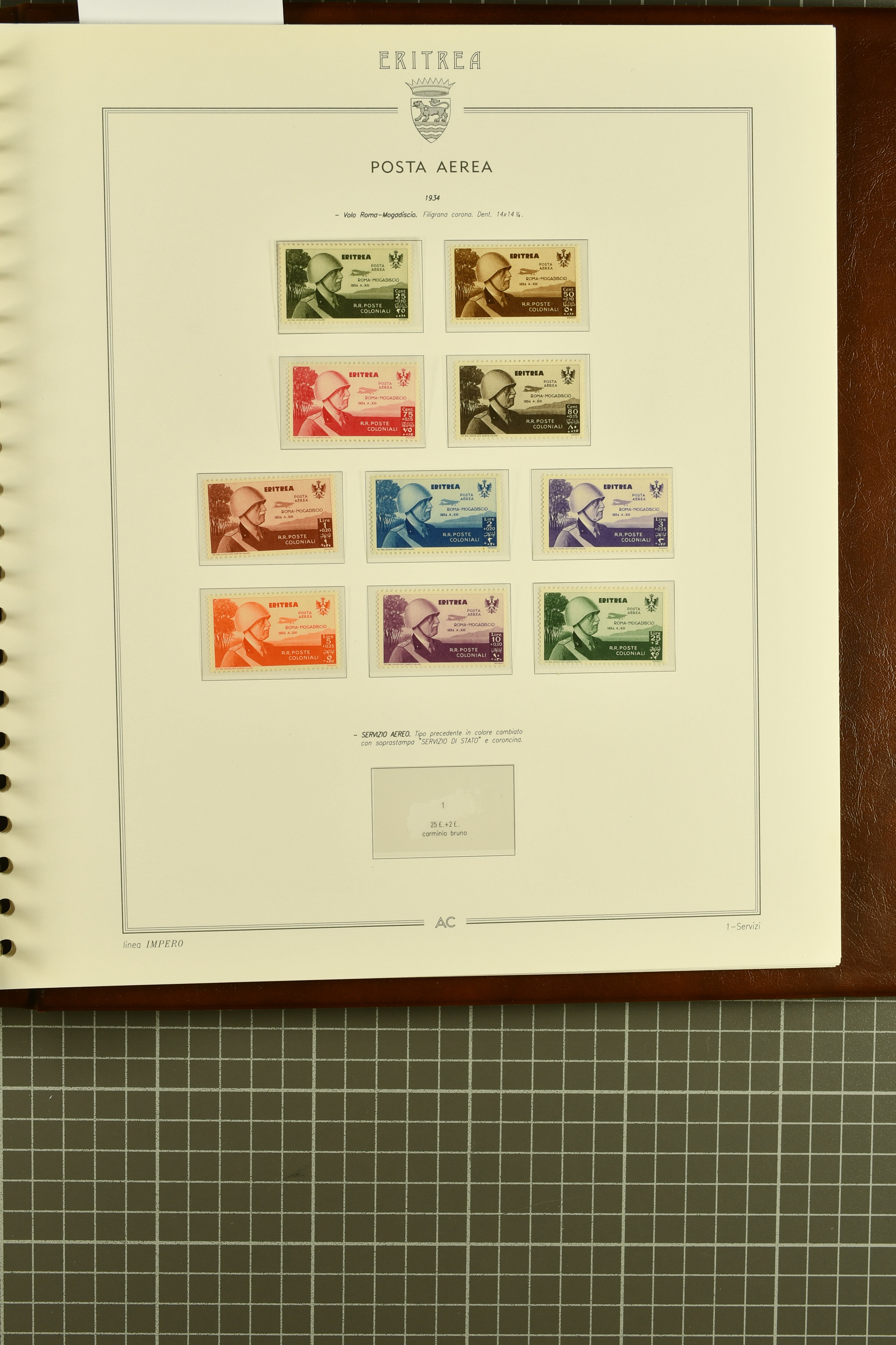 7613 **/*/(*) imageCollection hundreds of unused stamps without duplicates of Eritrea, Ethiopia, Saseno. The 'IMPERO' brown album contains: general issues, postage due stamps, postal parcel stamps, air post stamps, special delivery stamps almost all of them in complete set. General mixed conditions, mostly hinged and some with toned or brownish gum but also some adhesives in good conditions never hinged. Eritrea: the special delivery stamp lire 1,25 on 60 cent carmine perf 11 with the overprint in black reperforated at right. Collections almost completed, viewing is highly recommended. Certificate Diena (1). Sold as it is (Image 1) (Image 2) (Image 3) (Image 4) (Image 5) (Image 6) (Image 7) (Image 8) (Image 9) (Image 10) (Image 11) (Image 12) (Image 13) (Image 14) (Image 15) (Image 16) (Image 17) (Image 18) (Image 19) (Image 20) (Image 21) (Image 22) (Image 23) (Image 24) (Image 25) (Image 26) (Image 27) (Image 28)