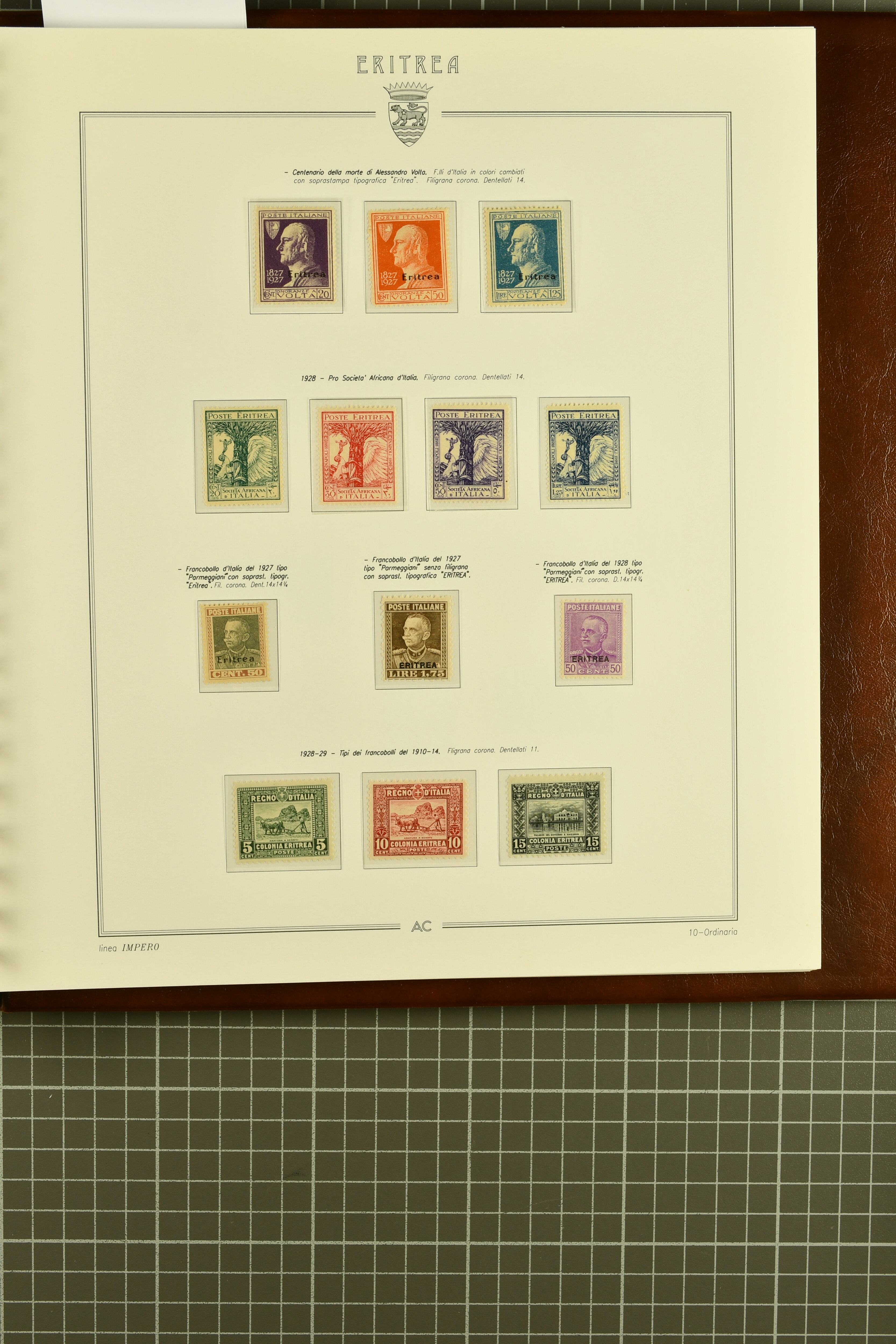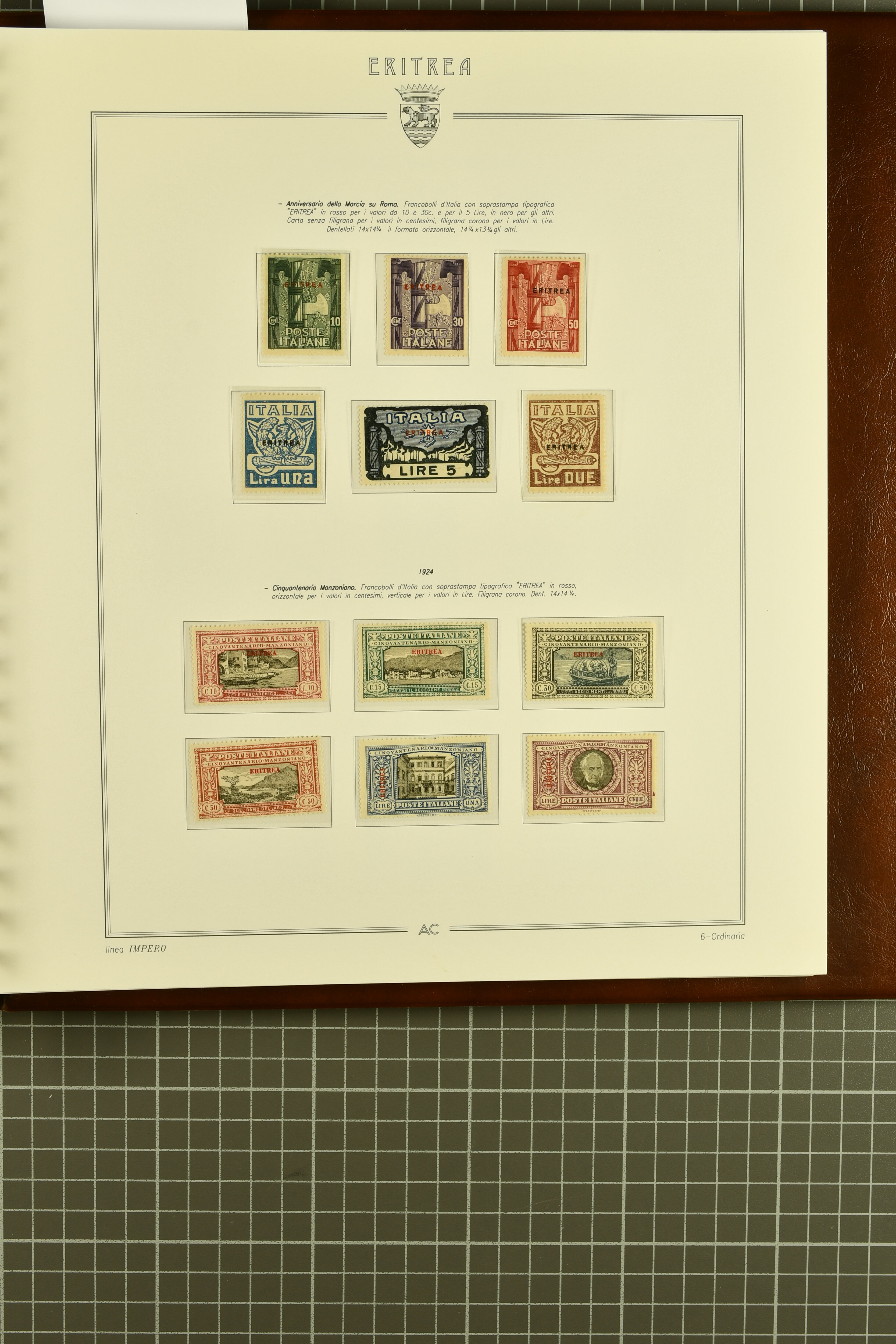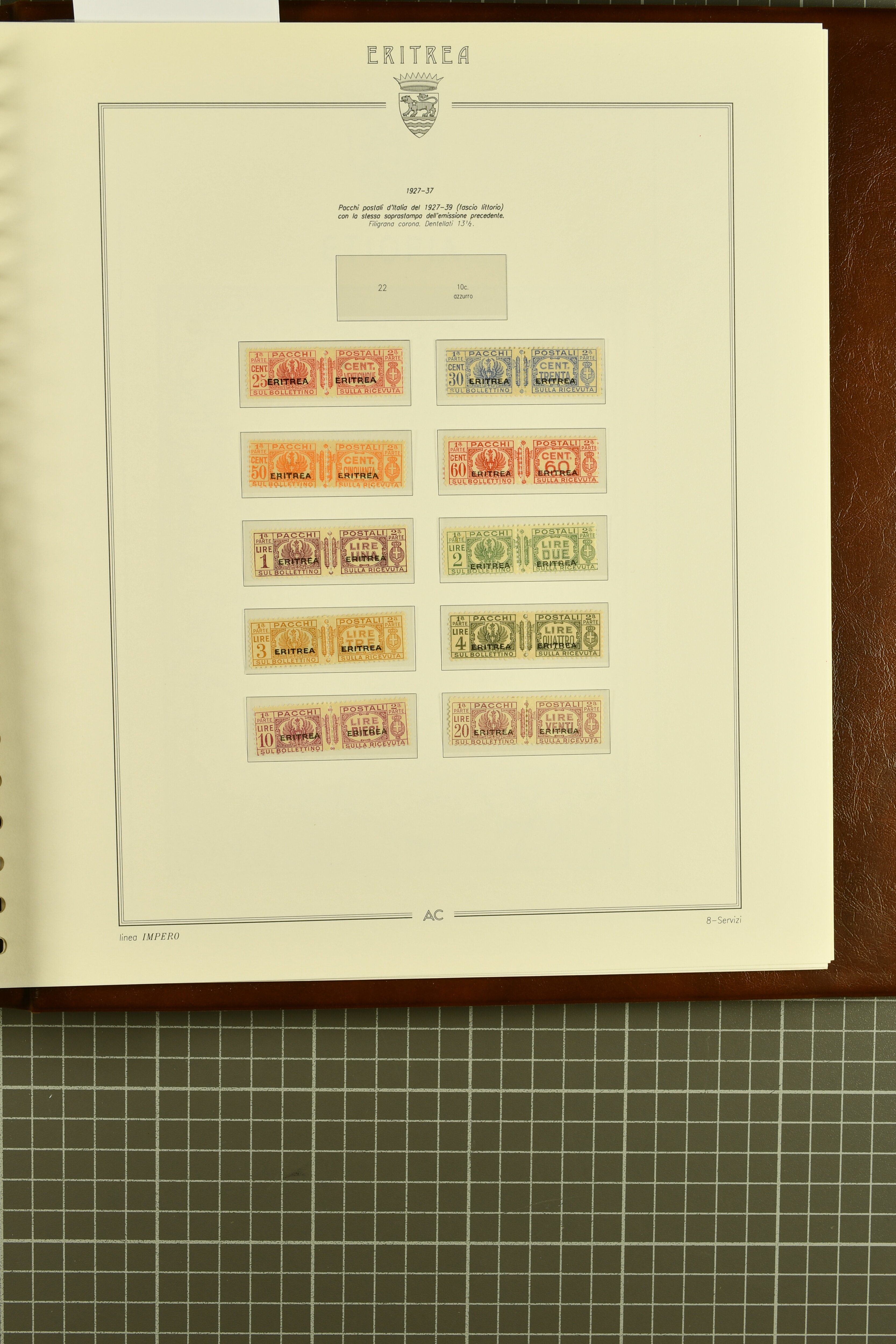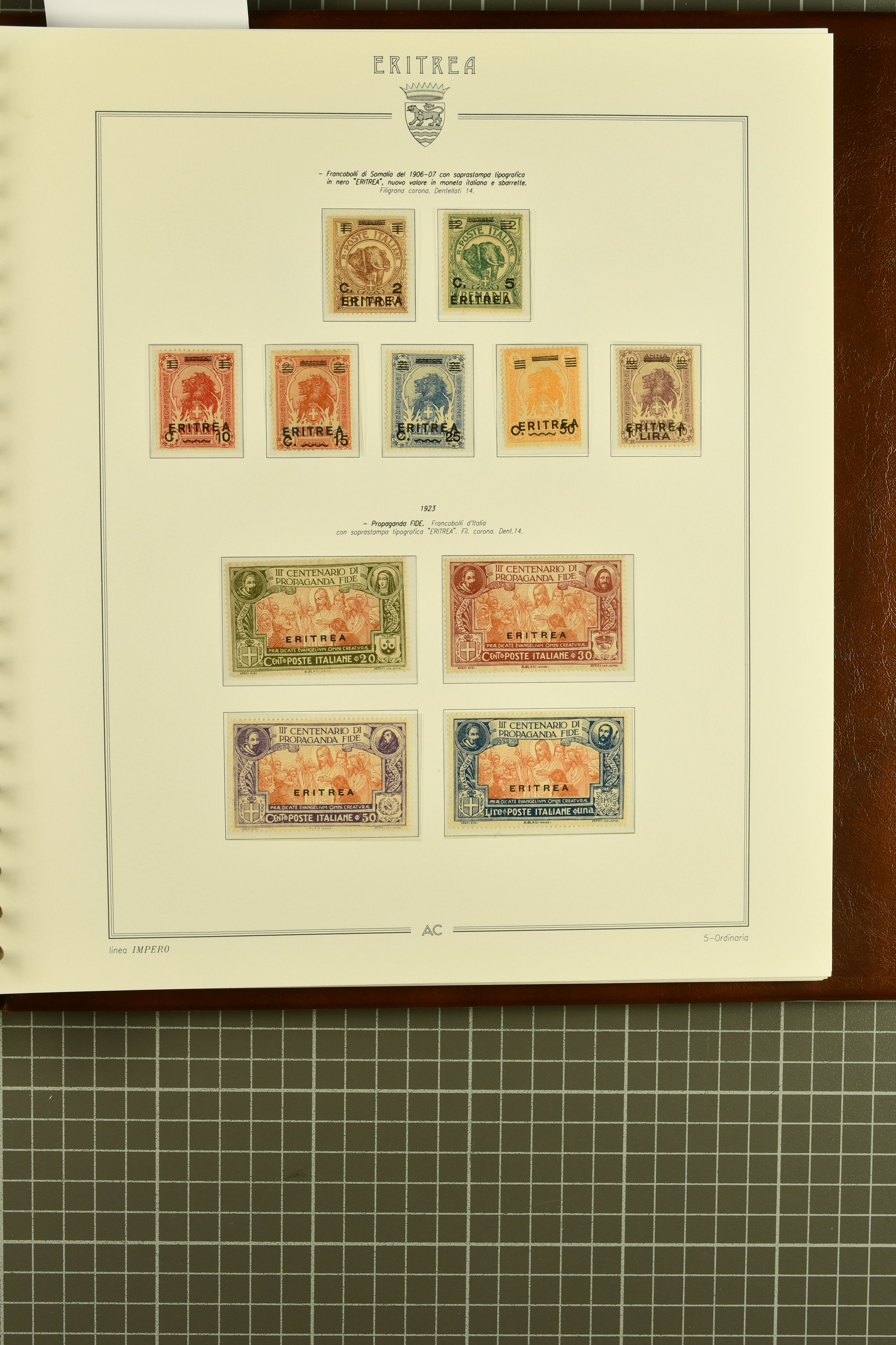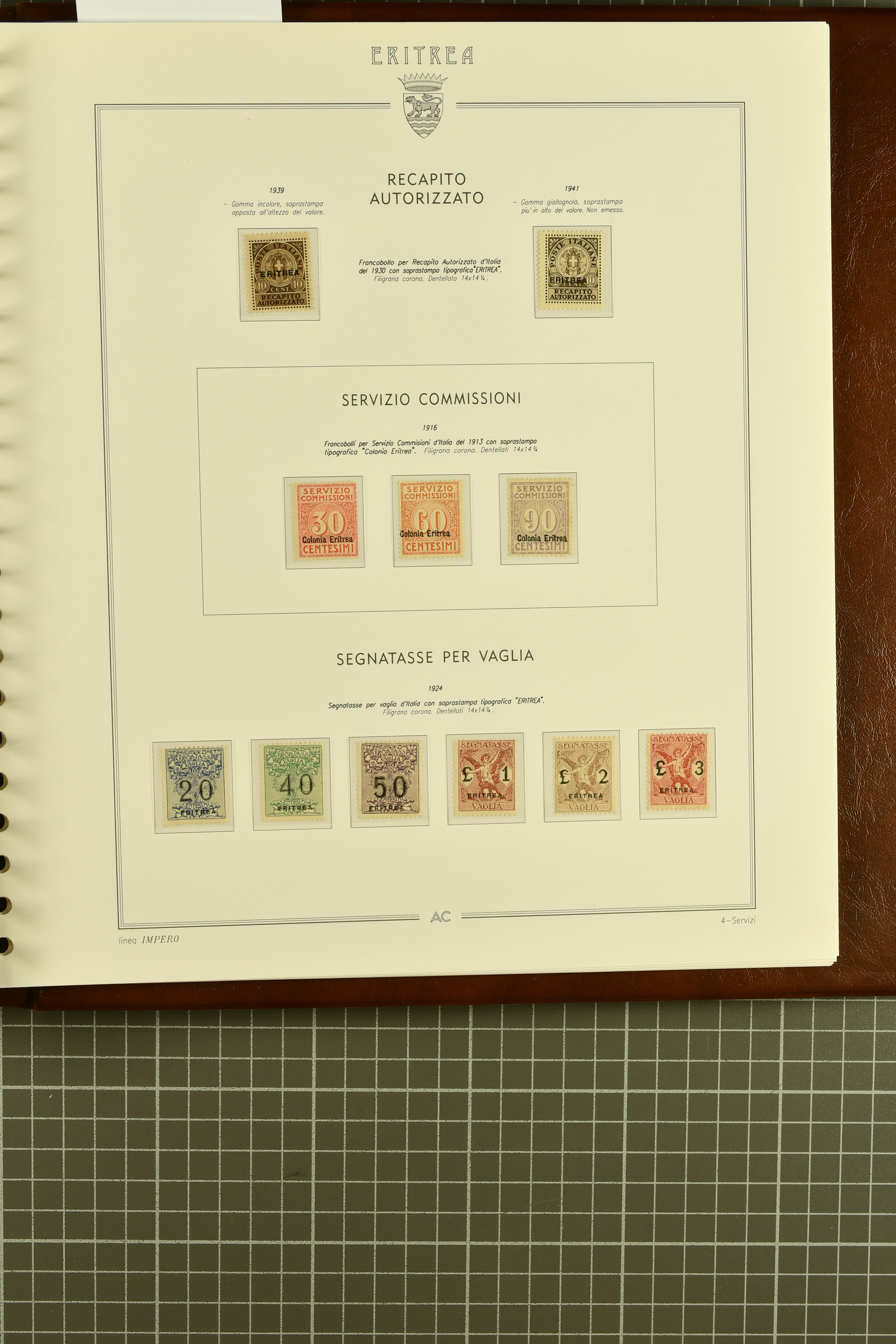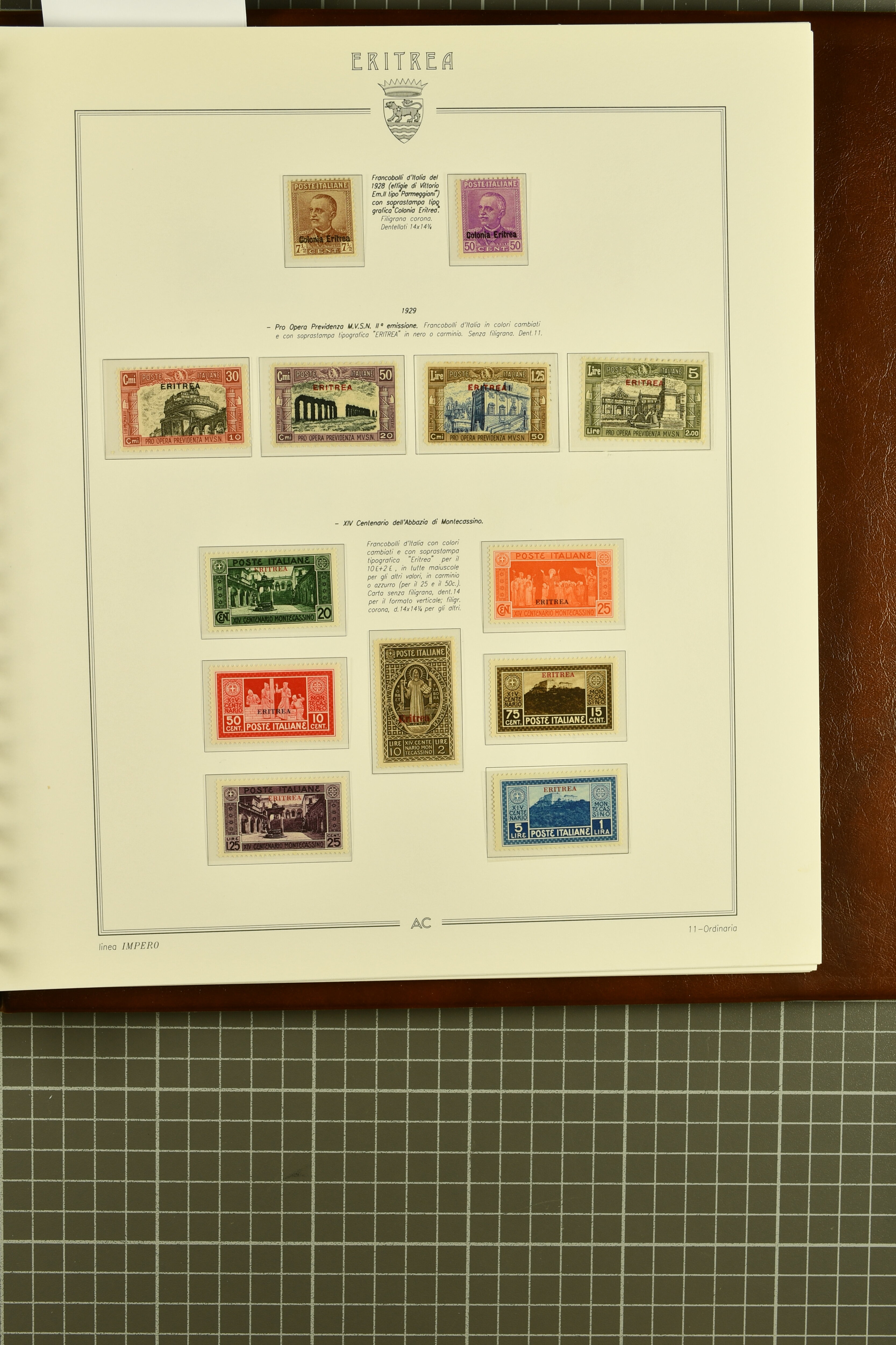 7613 **/*/(*) imageCollection hundreds of unused stamps without duplicates of Eritrea, Ethiopia, Saseno. The 'IMPERO' brown album contains: general issues, postage due stamps, postal parcel stamps, air post stamps, special delivery stamps almost all of them in complete set. General mixed conditions, mostly hinged and some with toned or brownish gum but also some adhesives in good conditions never hinged. Eritrea: the special delivery stamp lire 1,25 on 60 cent carmine perf 11 with the overprint in black reperforated at right. Collections almost completed, viewing is highly recommended. Certificate Diena (1). Sold as it is (Image 1) (Image 2) (Image 3) (Image 4) (Image 5) (Image 6) (Image 7) (Image 8) (Image 9) (Image 10) (Image 11) (Image 12) (Image 13) (Image 14) (Image 15) (Image 16) (Image 17) (Image 18) (Image 19) (Image 20) (Image 21) (Image 22) (Image 23) (Image 24) (Image 25) (Image 26) (Image 27) (Image 28)