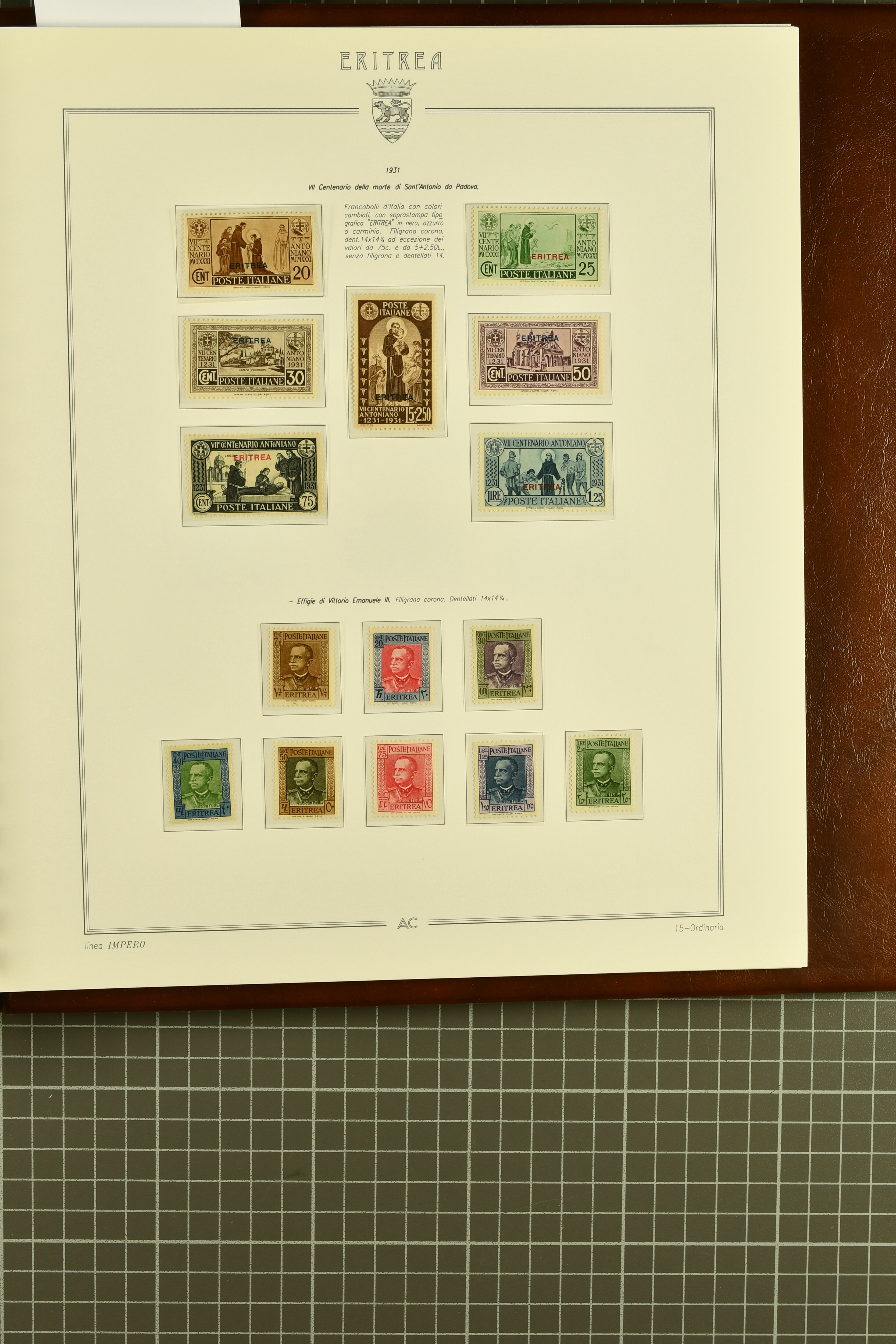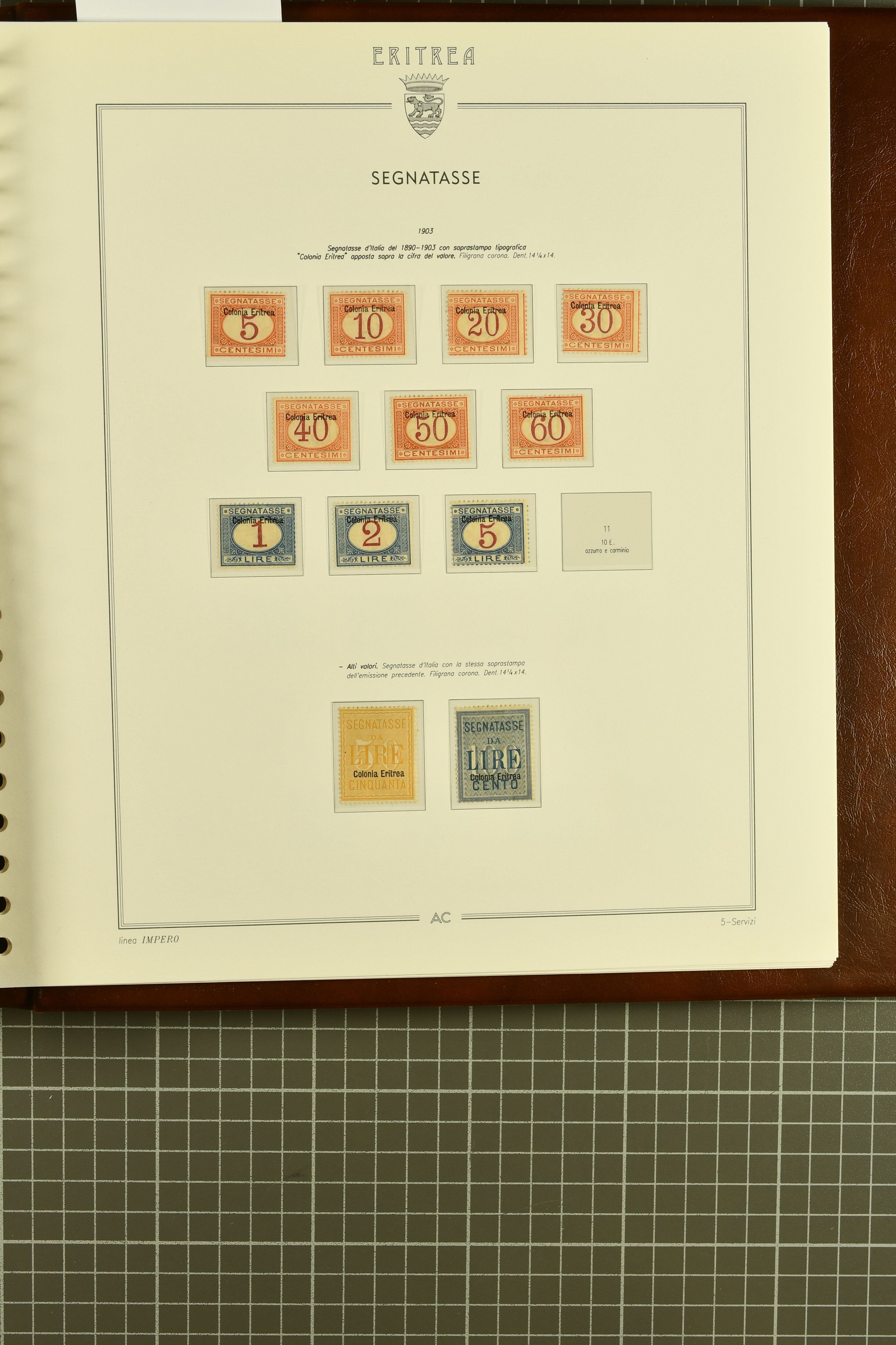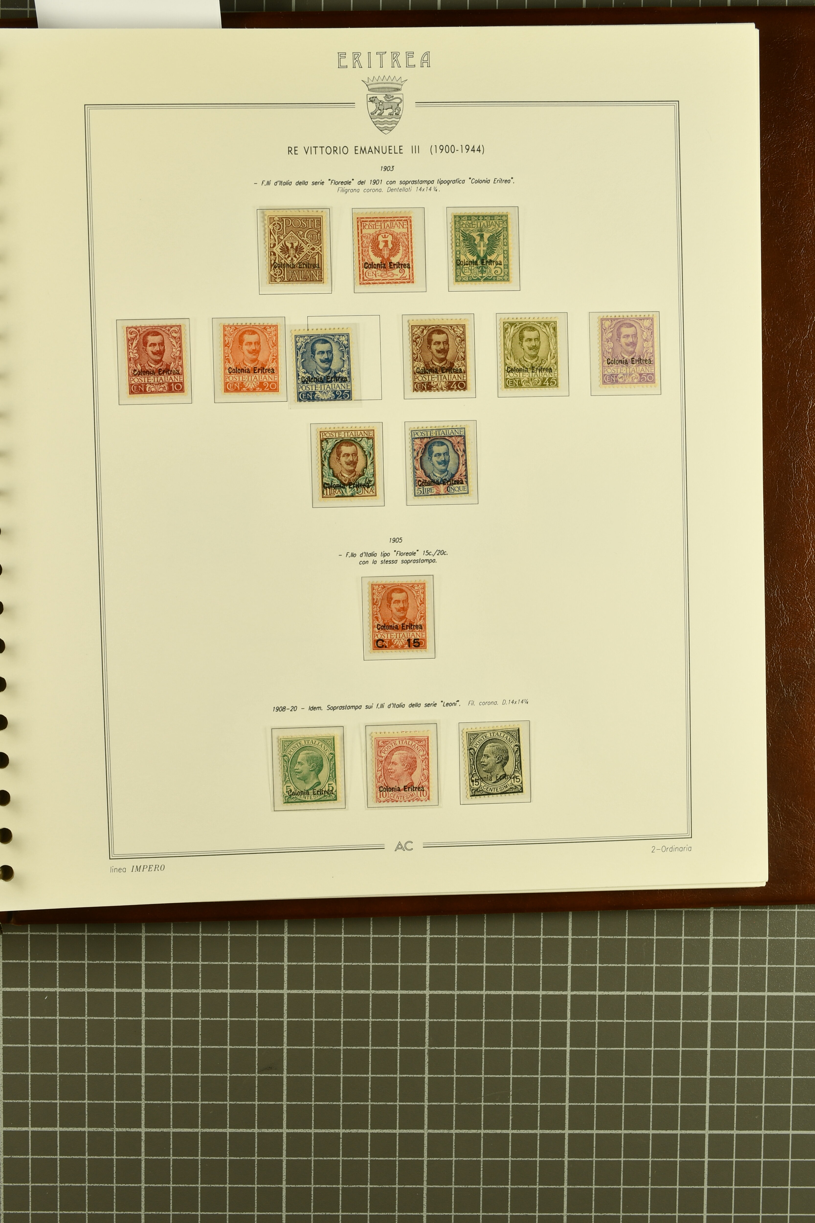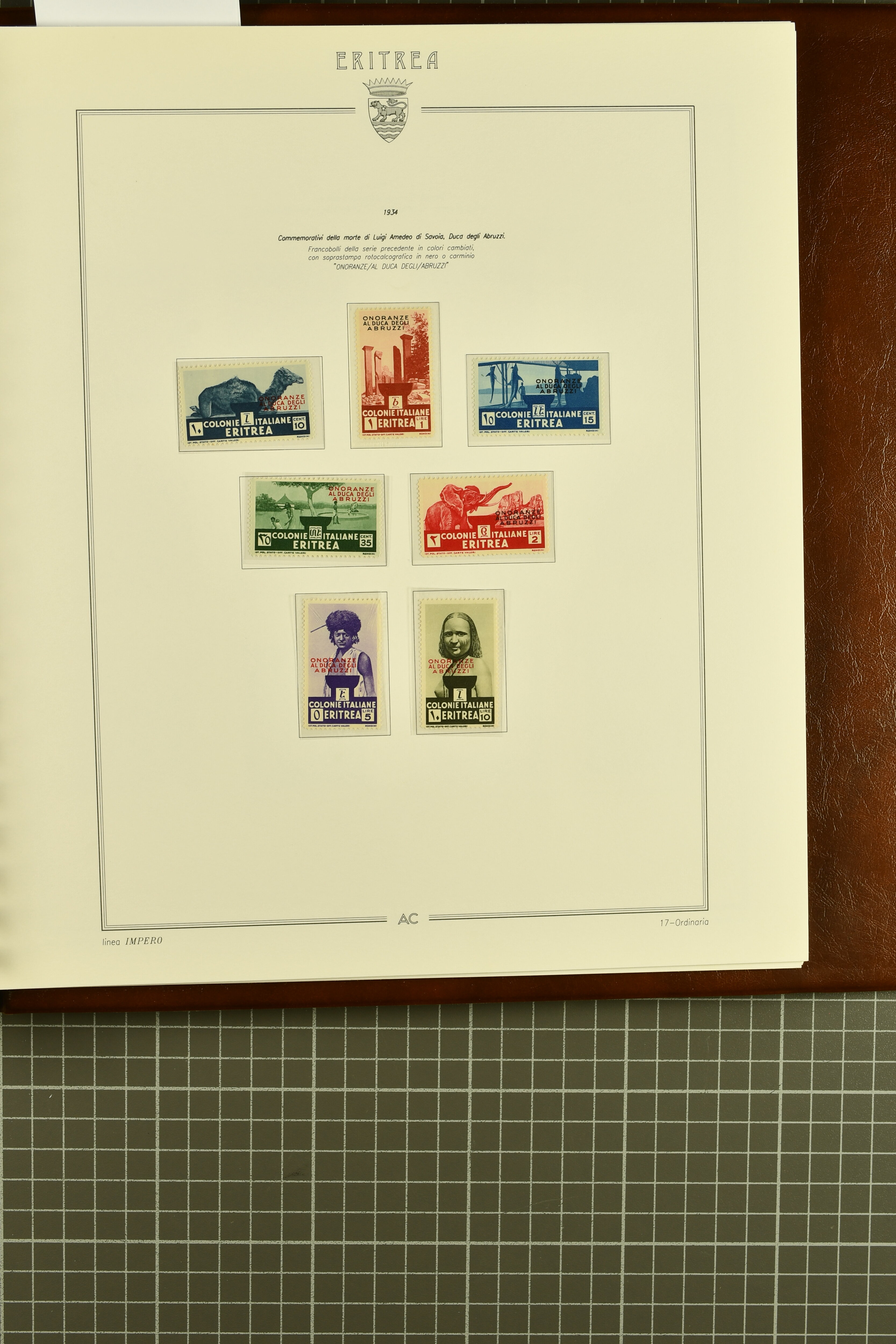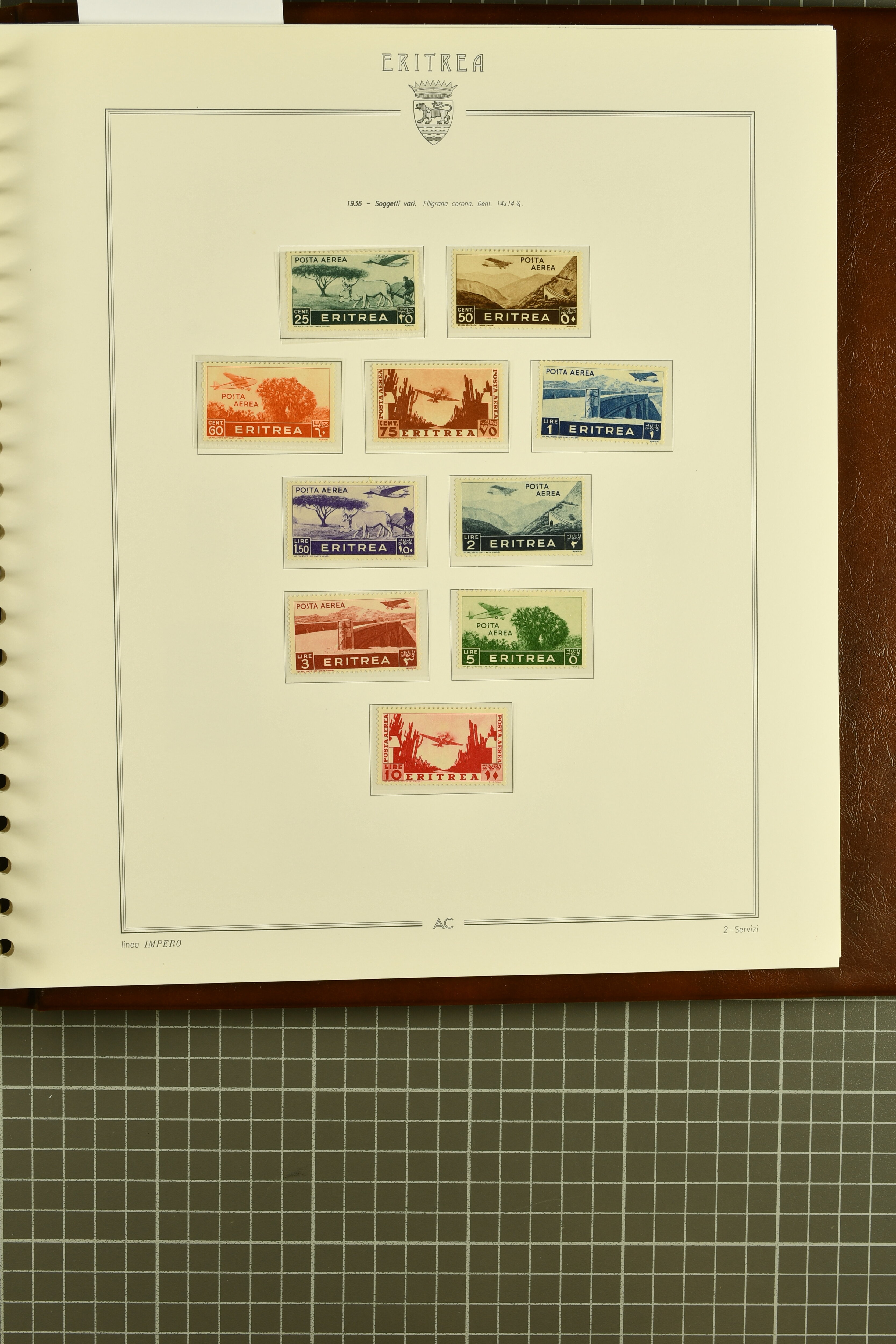 7613 **/*/(*) imageCollection hundreds of unused stamps without duplicates of Eritrea, Ethiopia, Saseno. The 'IMPERO' brown album contains: general issues, postage due stamps, postal parcel stamps, air post stamps, special delivery stamps almost all of them in complete set. General mixed conditions, mostly hinged and some with toned or brownish gum but also some adhesives in good conditions never hinged. Eritrea: the special delivery stamp lire 1,25 on 60 cent carmine perf 11 with the overprint in black reperforated at right. Collections almost completed, viewing is highly recommended. Certificate Diena (1). Sold as it is (Image 1) (Image 2) (Image 3) (Image 4) (Image 5) (Image 6) (Image 7) (Image 8) (Image 9) (Image 10) (Image 11) (Image 12) (Image 13) (Image 14) (Image 15) (Image 16) (Image 17) (Image 18) (Image 19) (Image 20) (Image 21) (Image 22) (Image 23) (Image 24) (Image 25) (Image 26) (Image 27) (Image 28)