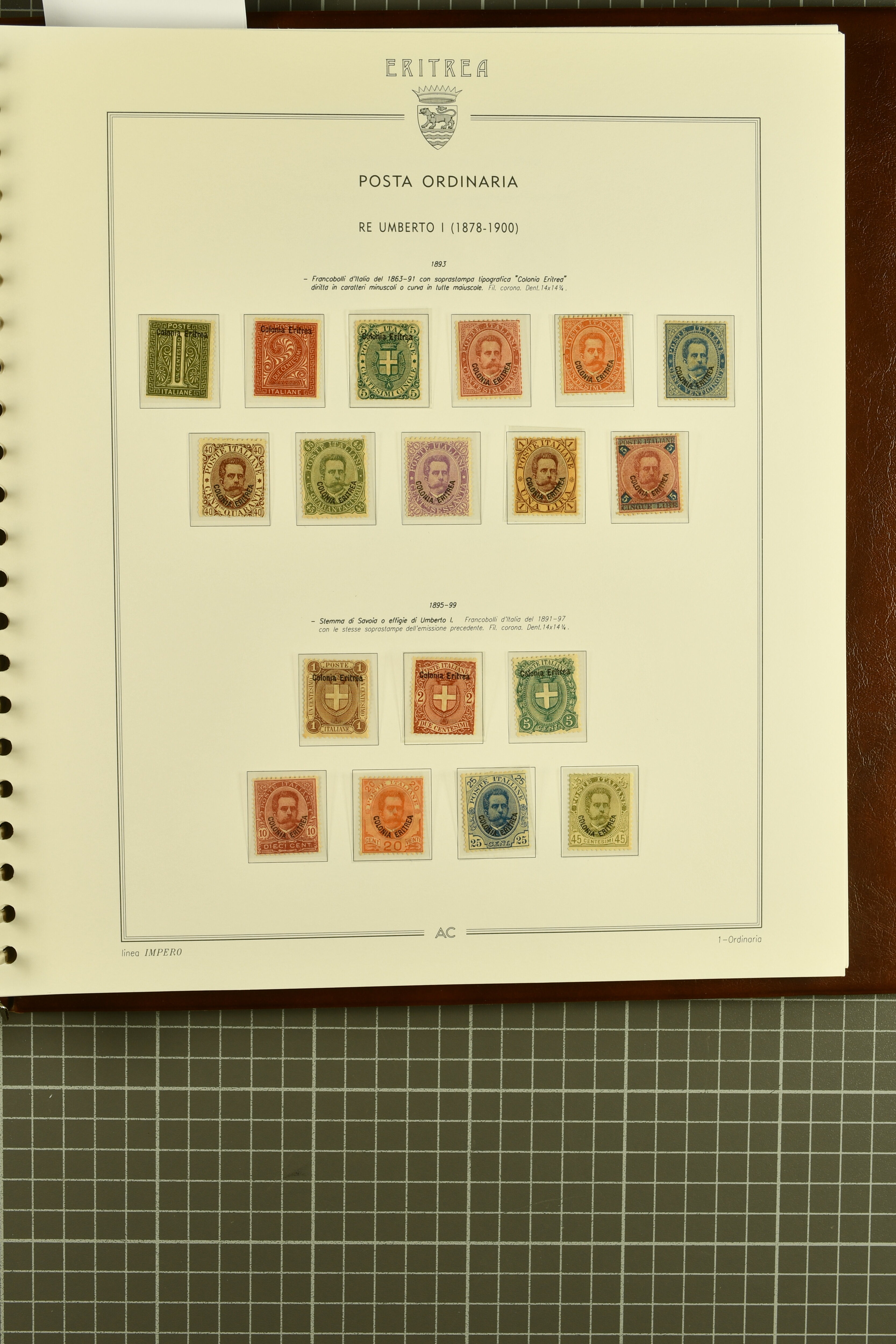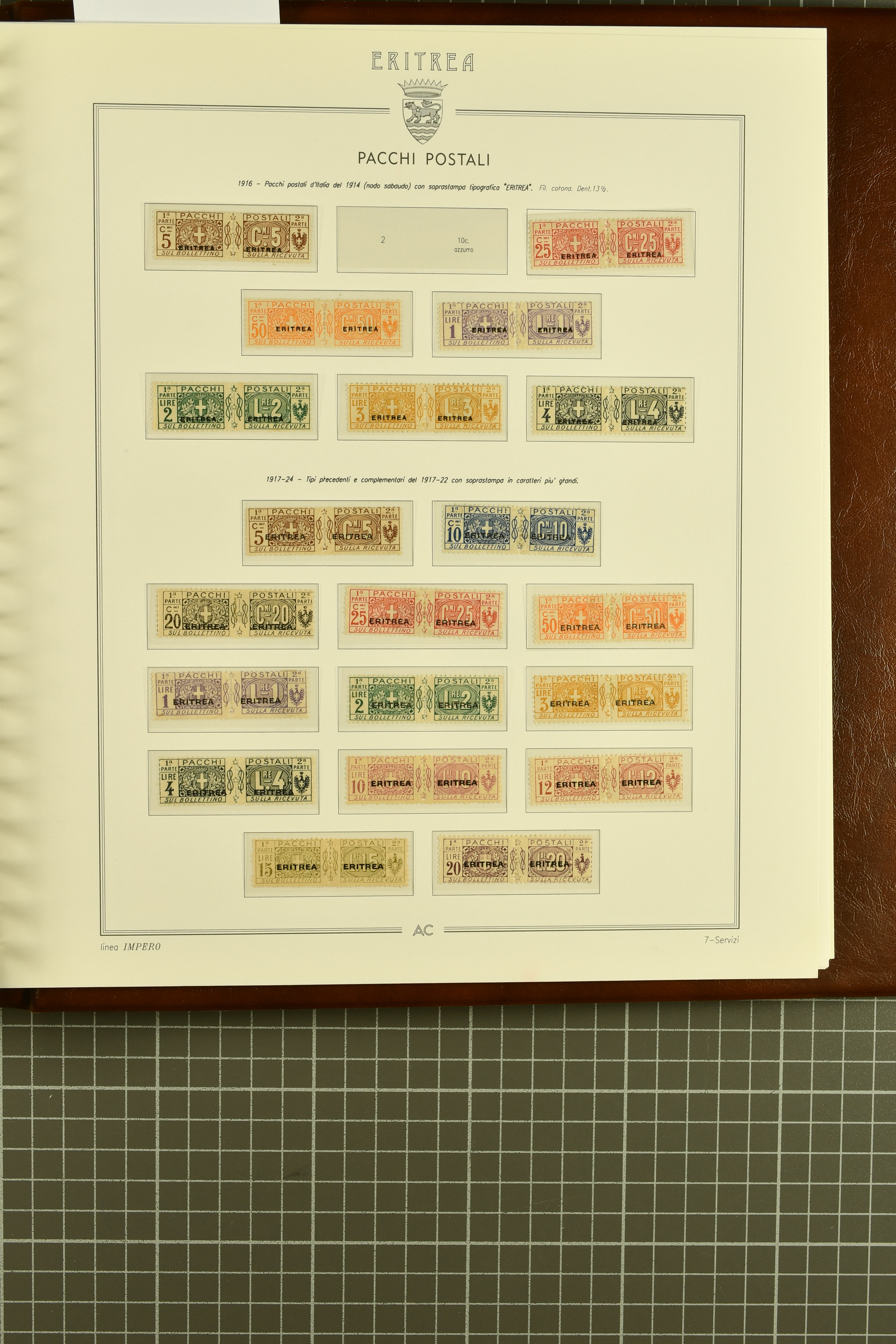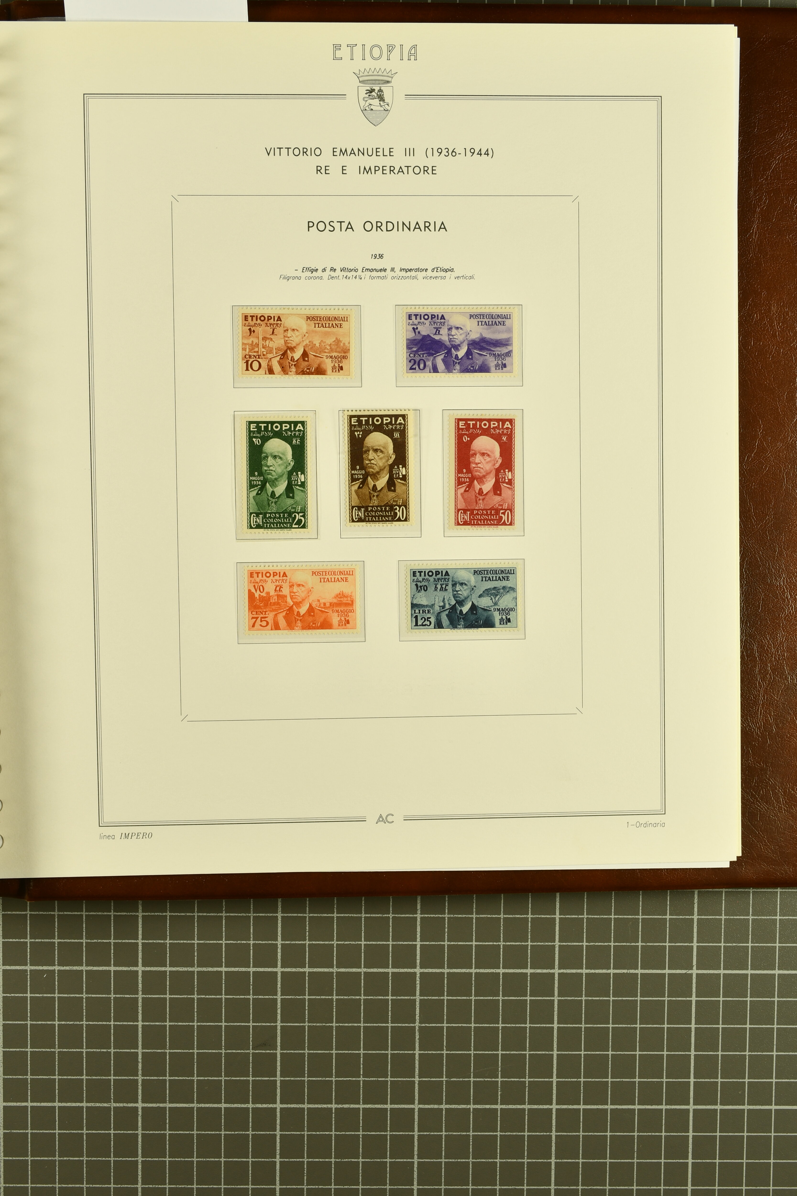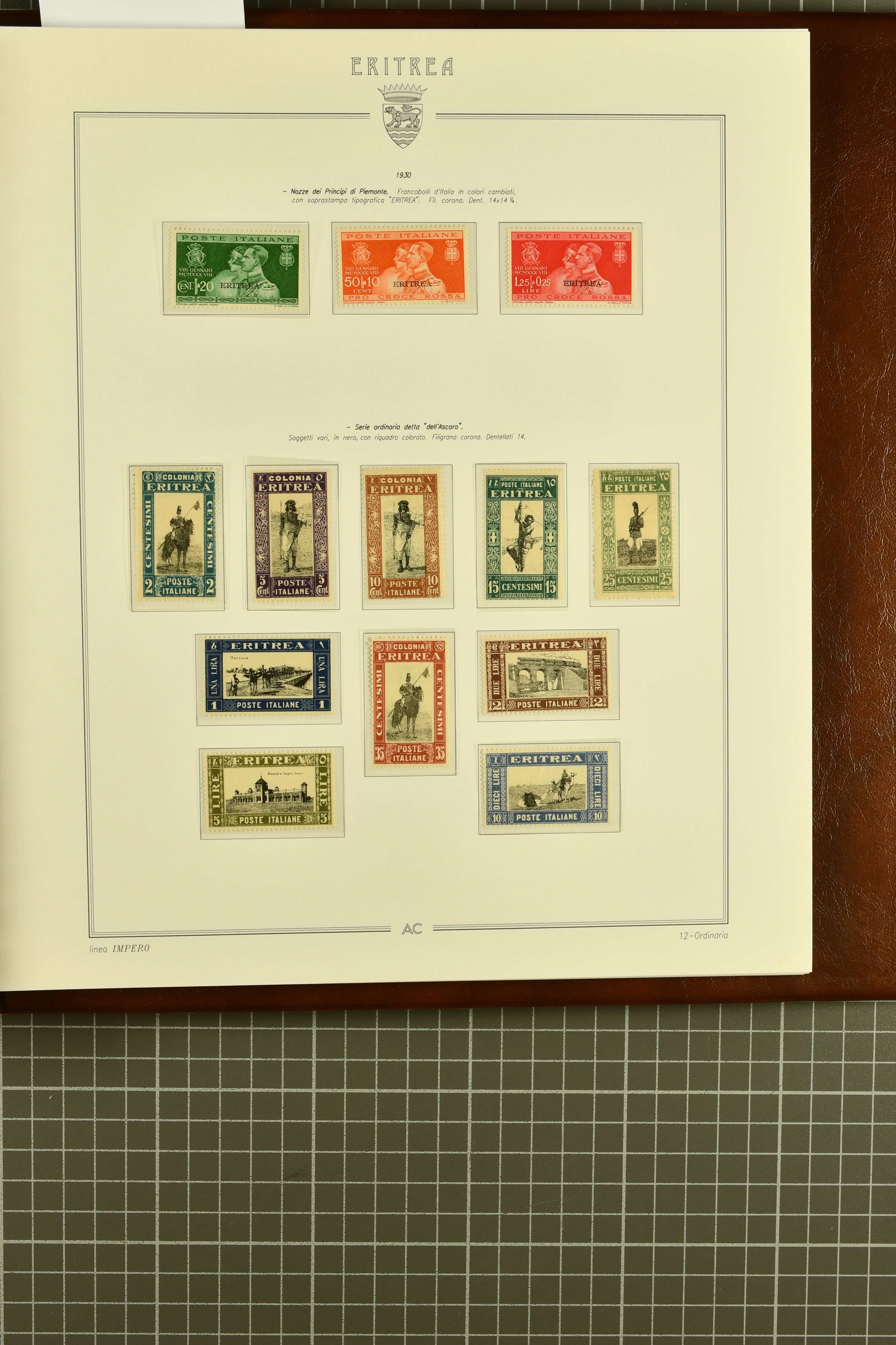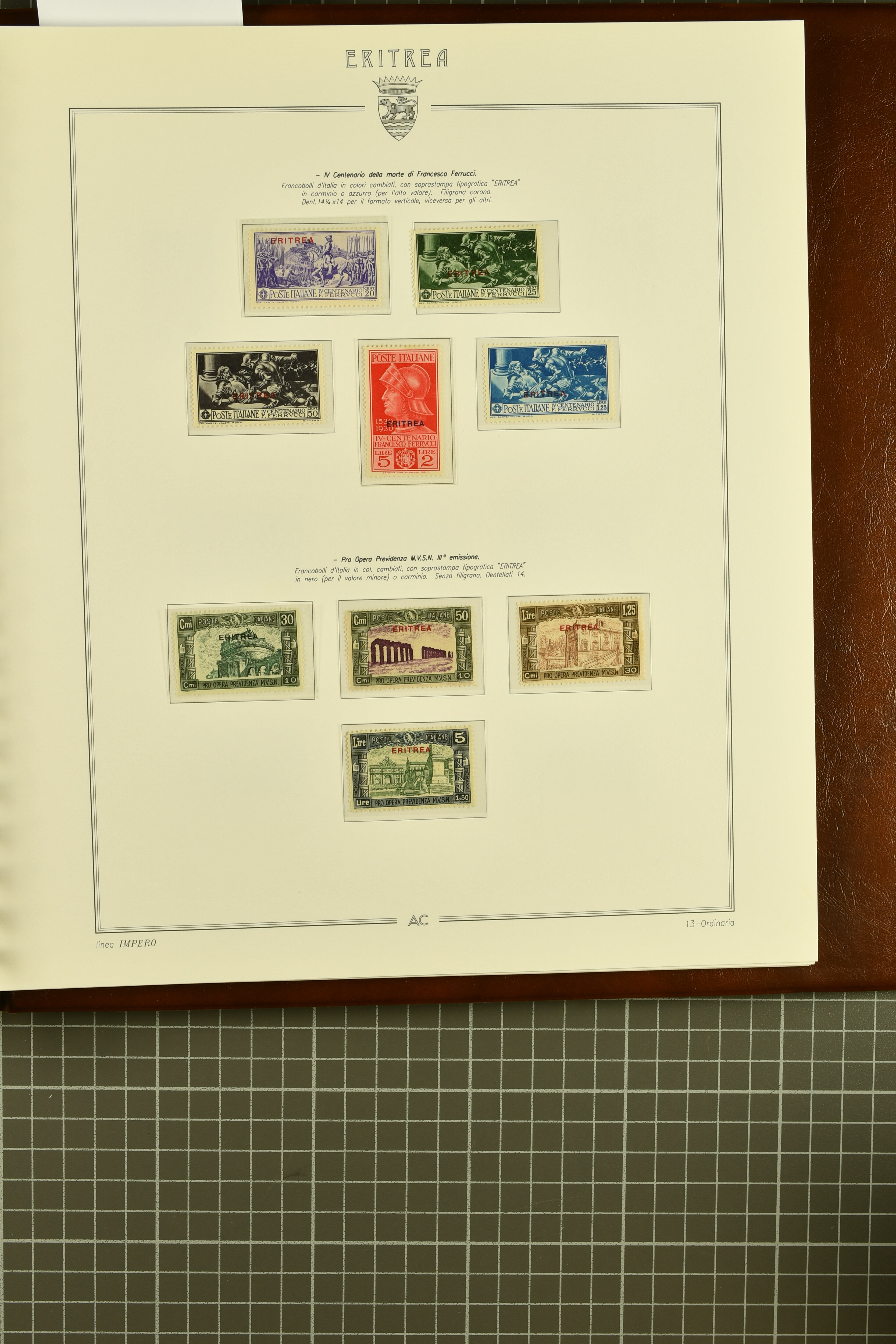 7613 **/*/(*) imageCollection hundreds of unused stamps without duplicates of Eritrea, Ethiopia, Saseno. The 'IMPERO' brown album contains: general issues, postage due stamps, postal parcel stamps, air post stamps, special delivery stamps almost all of them in complete set. General mixed conditions, mostly hinged and some with toned or brownish gum but also some adhesives in good conditions never hinged. Eritrea: the special delivery stamp lire 1,25 on 60 cent carmine perf 11 with the overprint in black reperforated at right. Collections almost completed, viewing is highly recommended. Certificate Diena (1). Sold as it is (Image 1) (Image 2) (Image 3) (Image 4) (Image 5) (Image 6) (Image 7) (Image 8) (Image 9) (Image 10) (Image 11) (Image 12) (Image 13) (Image 14) (Image 15) (Image 16) (Image 17) (Image 18) (Image 19) (Image 20) (Image 21) (Image 22) (Image 23) (Image 24) (Image 25) (Image 26) (Image 27) (Image 28)