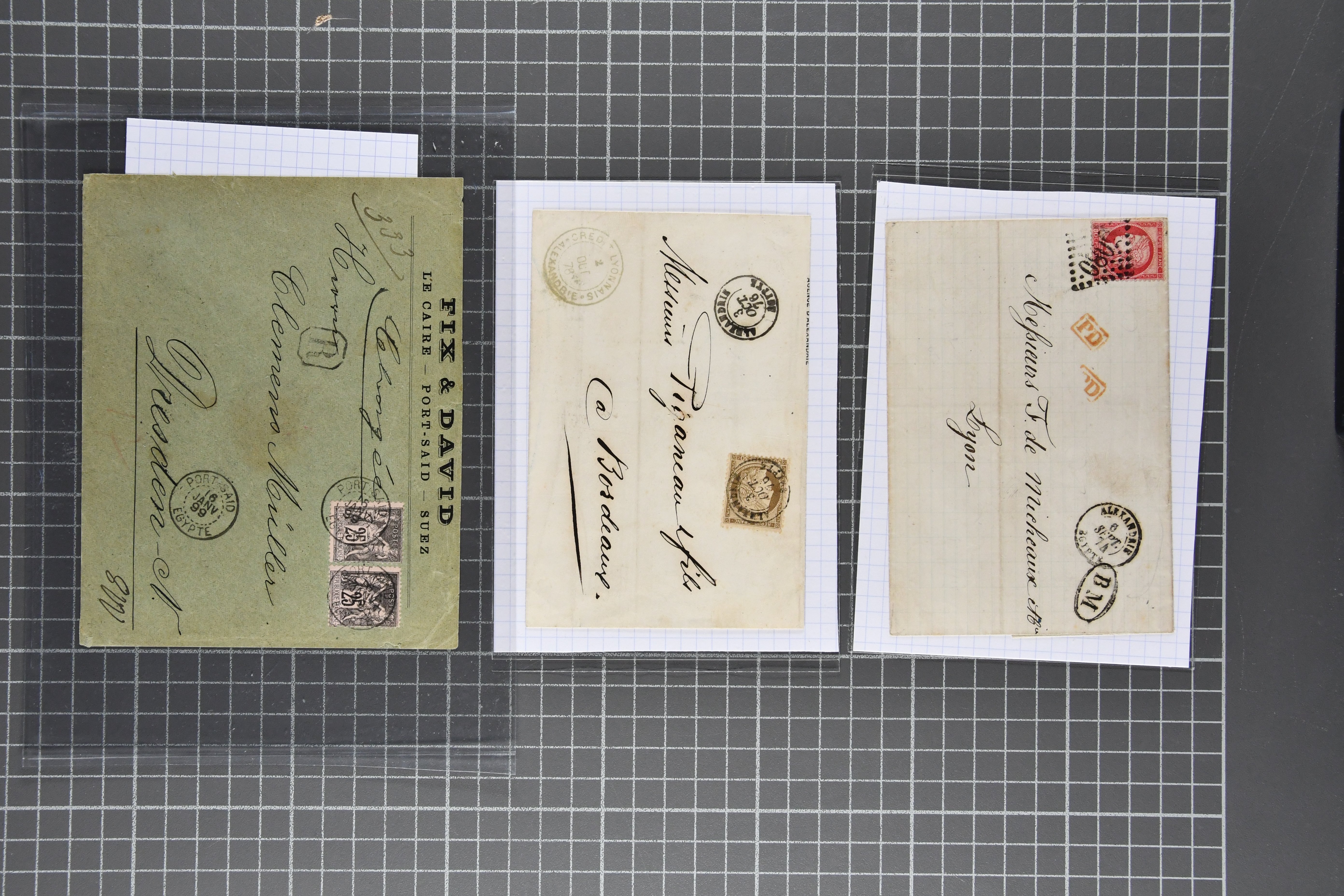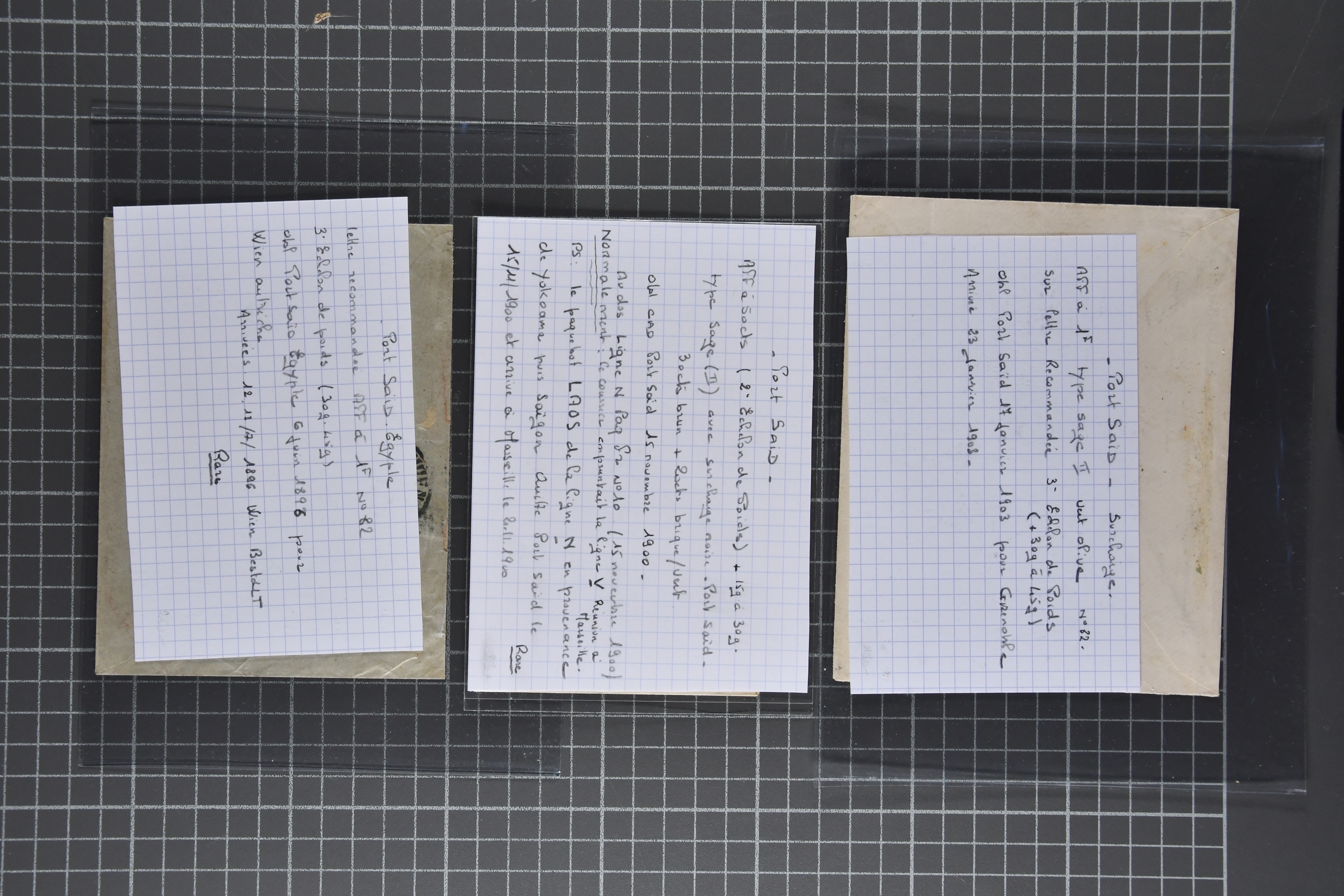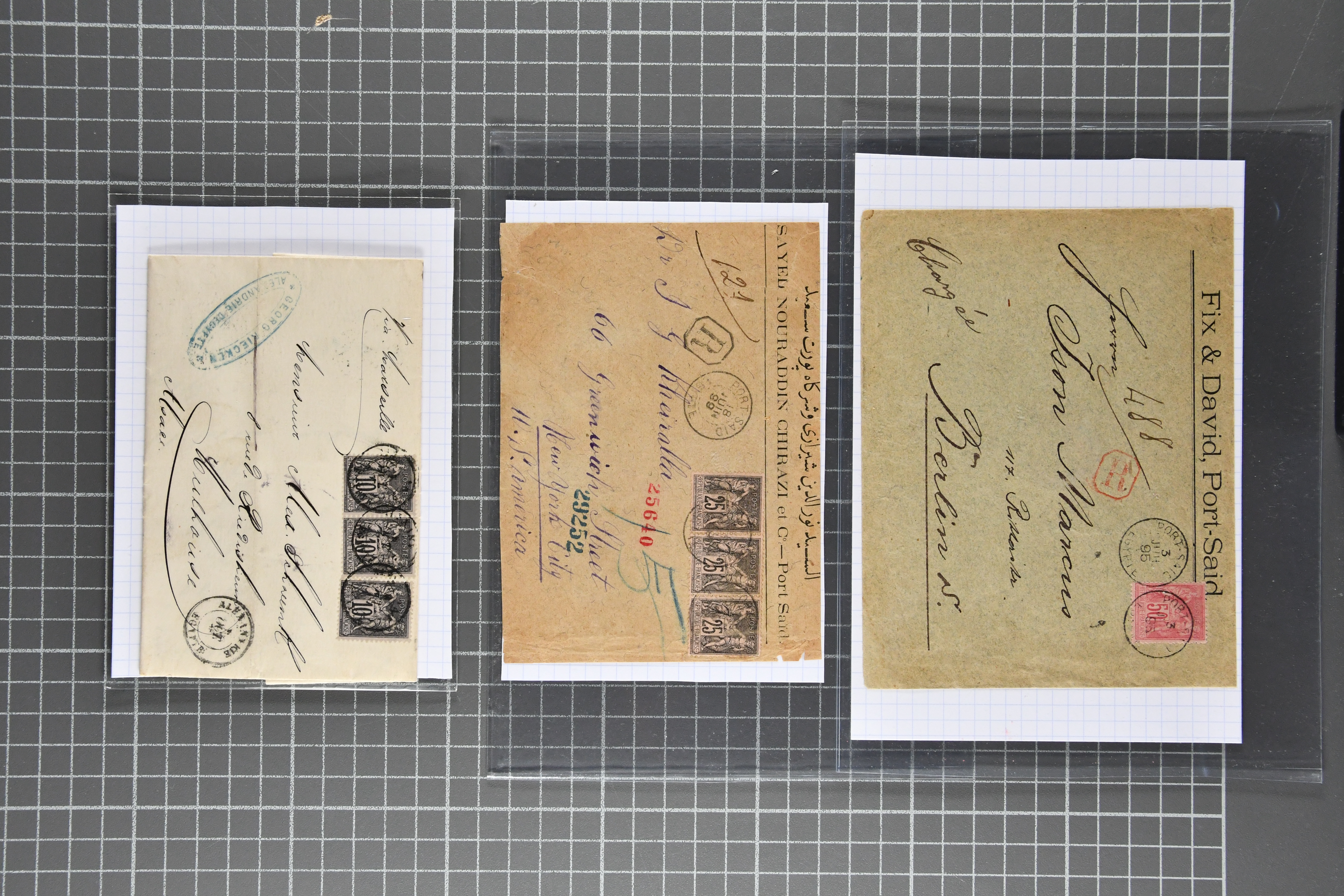 1947 cover imageLots & Collections 1874/1903: Fine lot of 9 covers from ALEXANDRIA and PORT SAÏD with French stamps. Includes three covers from ALEXANDRIA: Cérès type 30 c. single on cover to Bordeaux, 80 c. single on cover to Lyon, and 10 c. Sage type (3) to Mulhouse. From PORT SAÏD: 25 c. Sage (2) on a registered cover to Dresden, a strip of three 25 c. on a registered cover to New York, 50 c. Sage type as a single on cover to Berlin, and 1 Fr. Sage type as a single on a registered cover to Vienna. Also two covers with Port Saïd overprints on Sage type: 30 c. + 20 c. to Marseille, and a registered cover with 1 Fr. to Grenoble (Image 1) (Image 2) (Image 3) (Image 4) (Image 5) (Image 6)