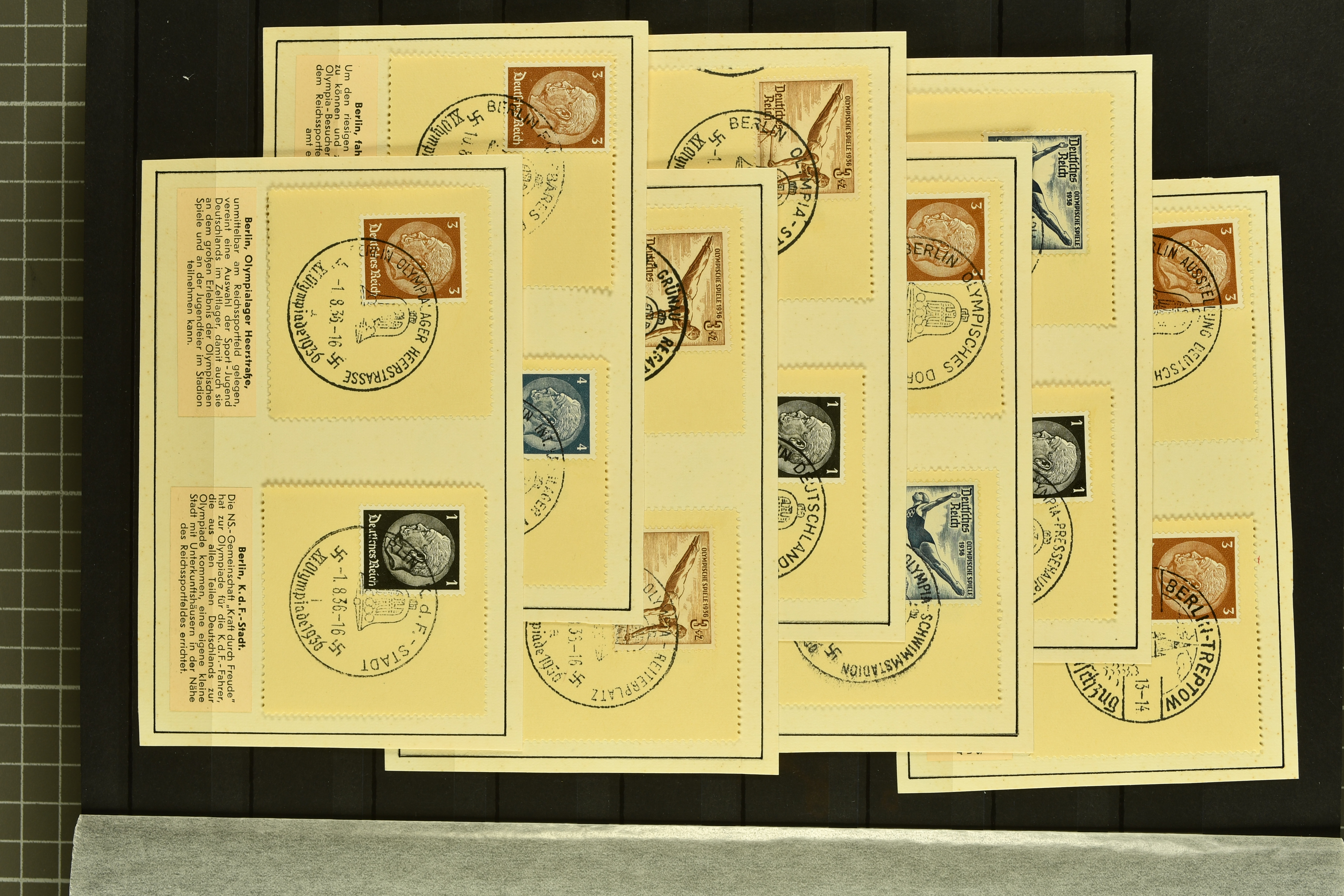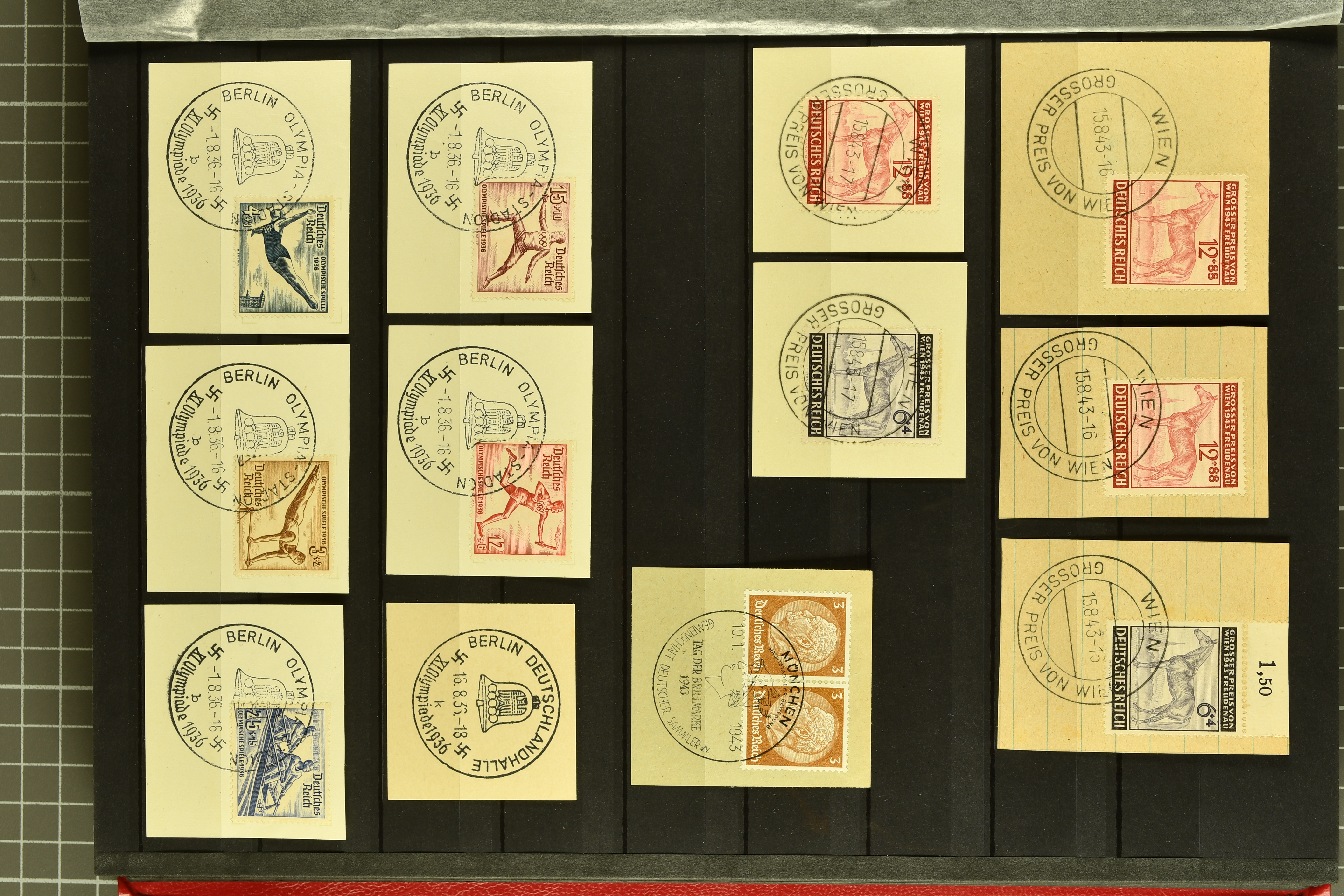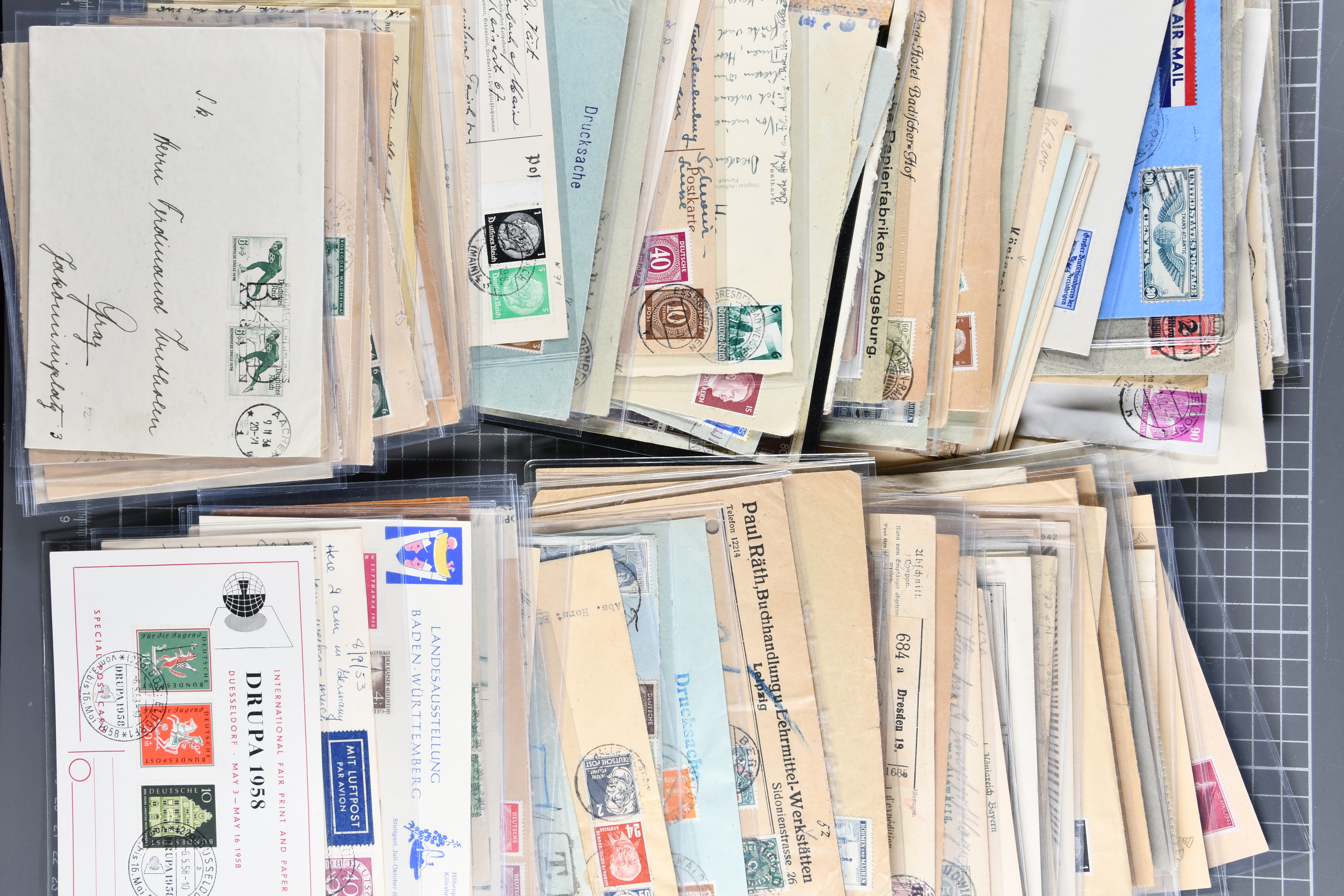 1828 image1890/1990ca.: Konvolut – kleine Schachtel mit vielfältigem Belegmaterial, darunter mehrere interessante Infla-Briefe. Briefalbum mit Karten und Briefen, u. a. mit 'Gebühr bezahlt'-Vermerken, älteren Ansichtskarten, Posthörnchenaufdrucken auf Belegen sowie Satzbriefen. Weiteres Briefalbum mit moderneren Satzbriefen. Sammlung Bundesrepublik 1949–1970, bis auf zwei Werte des Briefmarken-Jubiläumssatzes von 1949 komplett, im Vordruckalbum. Einsteckbuch mit Kehrdrucken und Zwischenstegen des Deutschen Reiches, gestempelt. Jumbo-Album mit überwiegend Briefstücken, meist mit Sonderstempeln des Deutschen Reiches, dazu etwas besetzte Gebiete; vielfältiges Material, oftmals bessere Werte, darunter drei Olympiadeblocks. Schliesslich ein Album mit gemischtem Material aus verschiedenen deutschen Sammelgebieten, teils mit Spezialitäten wie Randstücken oder Abarten; unterschiedlich erhalten. Interessanter originaler Bestand (Image 1) (Image 2) (Image 3) (Image 4) (Image 5) (Image 6) (Image 7) (Image 8) (Image 9) (Image 10) (Image 11) (Image 12) (Image 13) (Image 14) (Image 15) (Image 16) (Image 17) (Image 18) (Image 19) (Image 20) (Image 21) (Image 22) (Image 23) (Image 24) (Image 25) (Image 26) (Image 27) (Image 28) (Image 29) (Image 30) (Image 31) (Image 32) (Image 33) (Image 34) (Image 35) (Image 36) (Image 37) (Image 38) (Image 39) (Image 40) (Image 41) (Image 42) (Image 43) (Image 44) (Image 45) (Image 46) (Image 47) (Image 48) (Image 49) (Image 50)