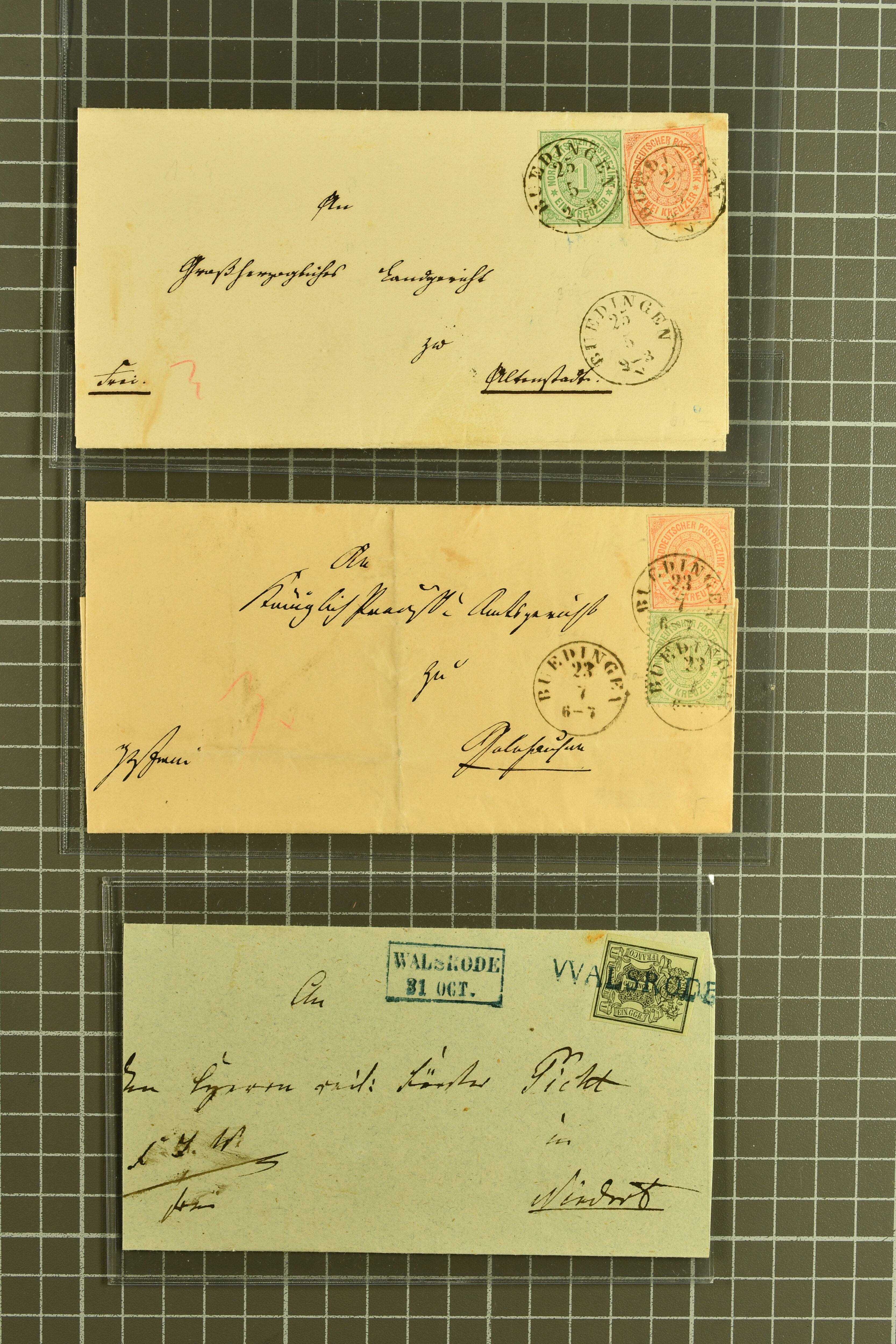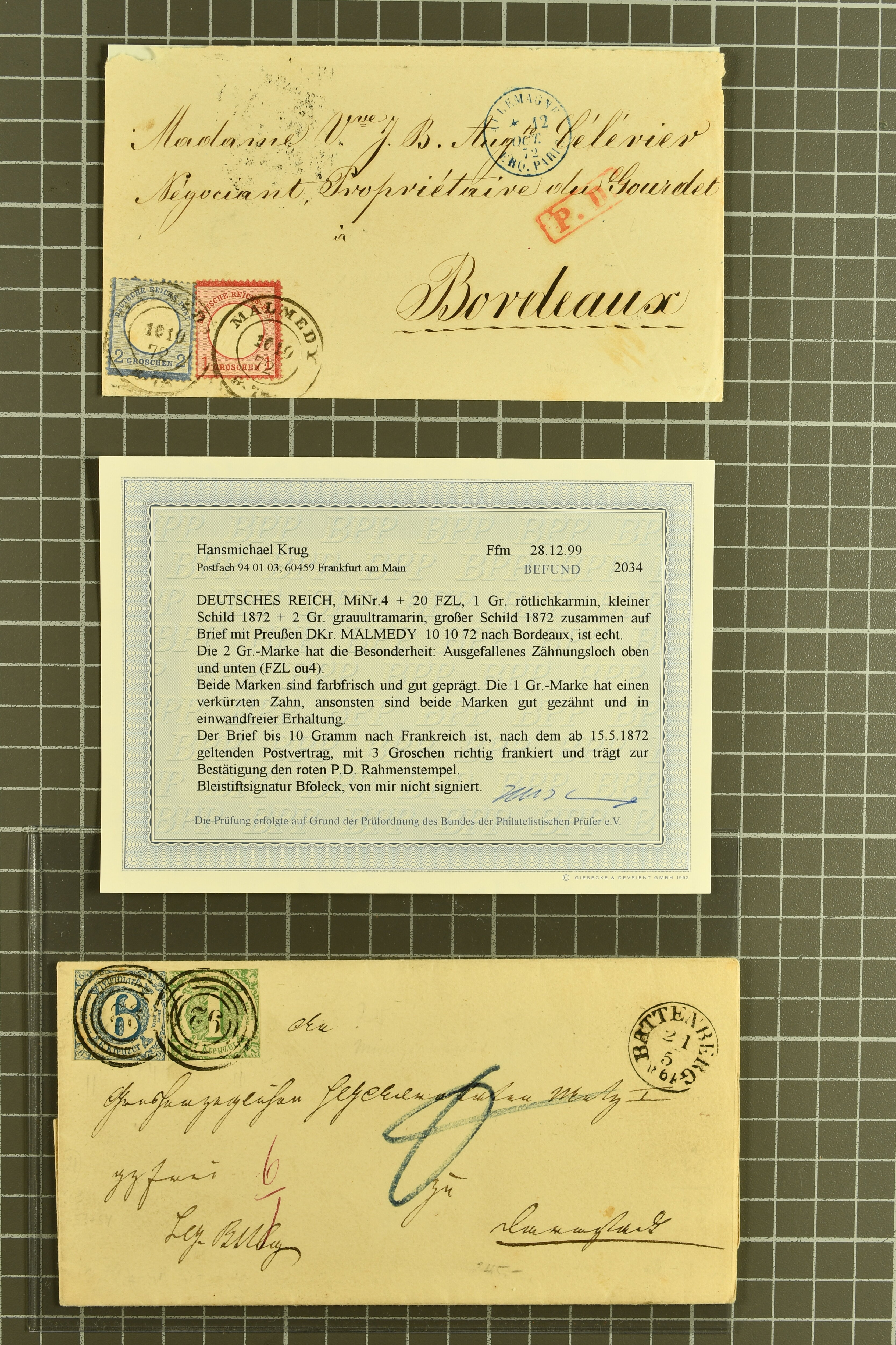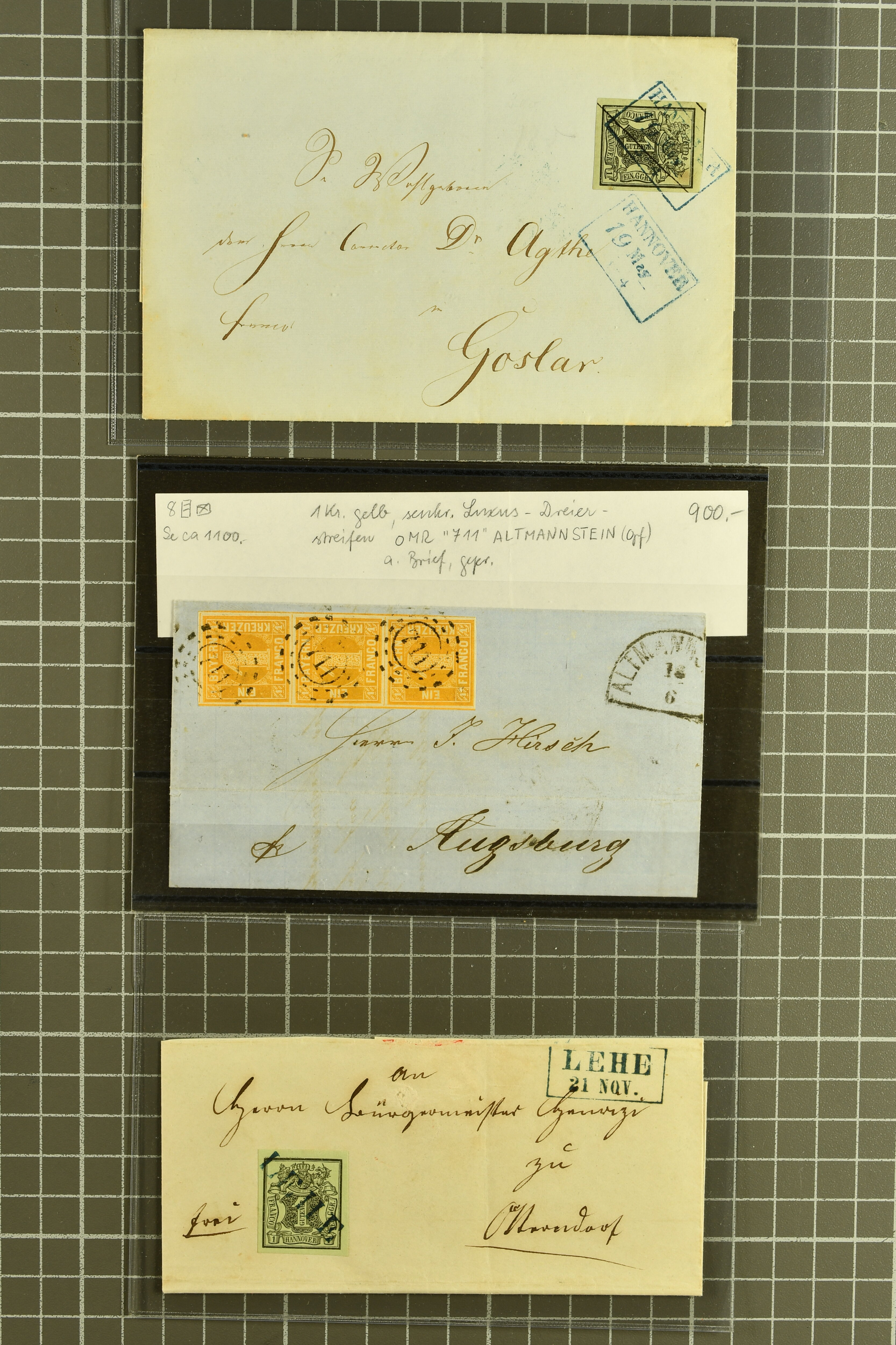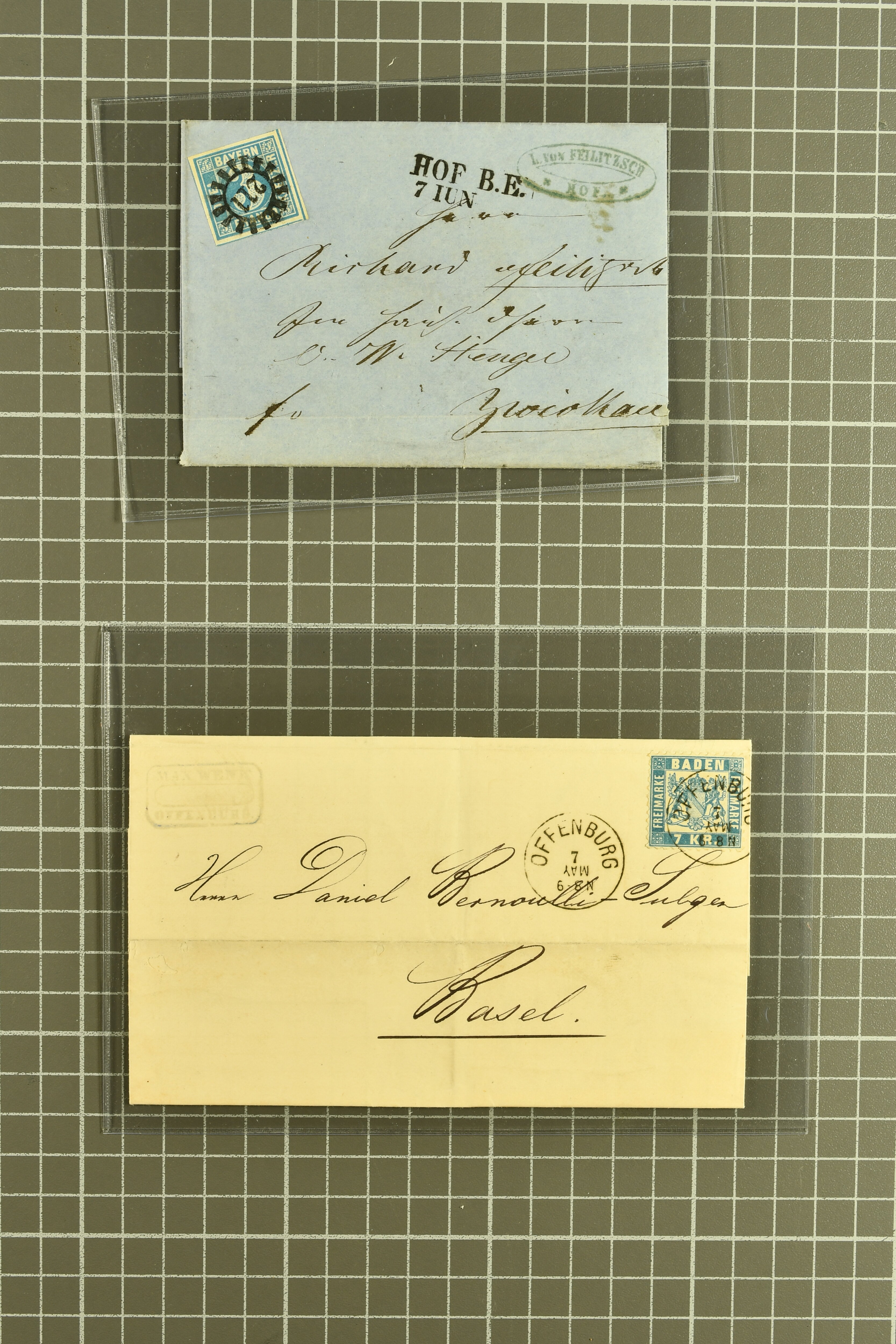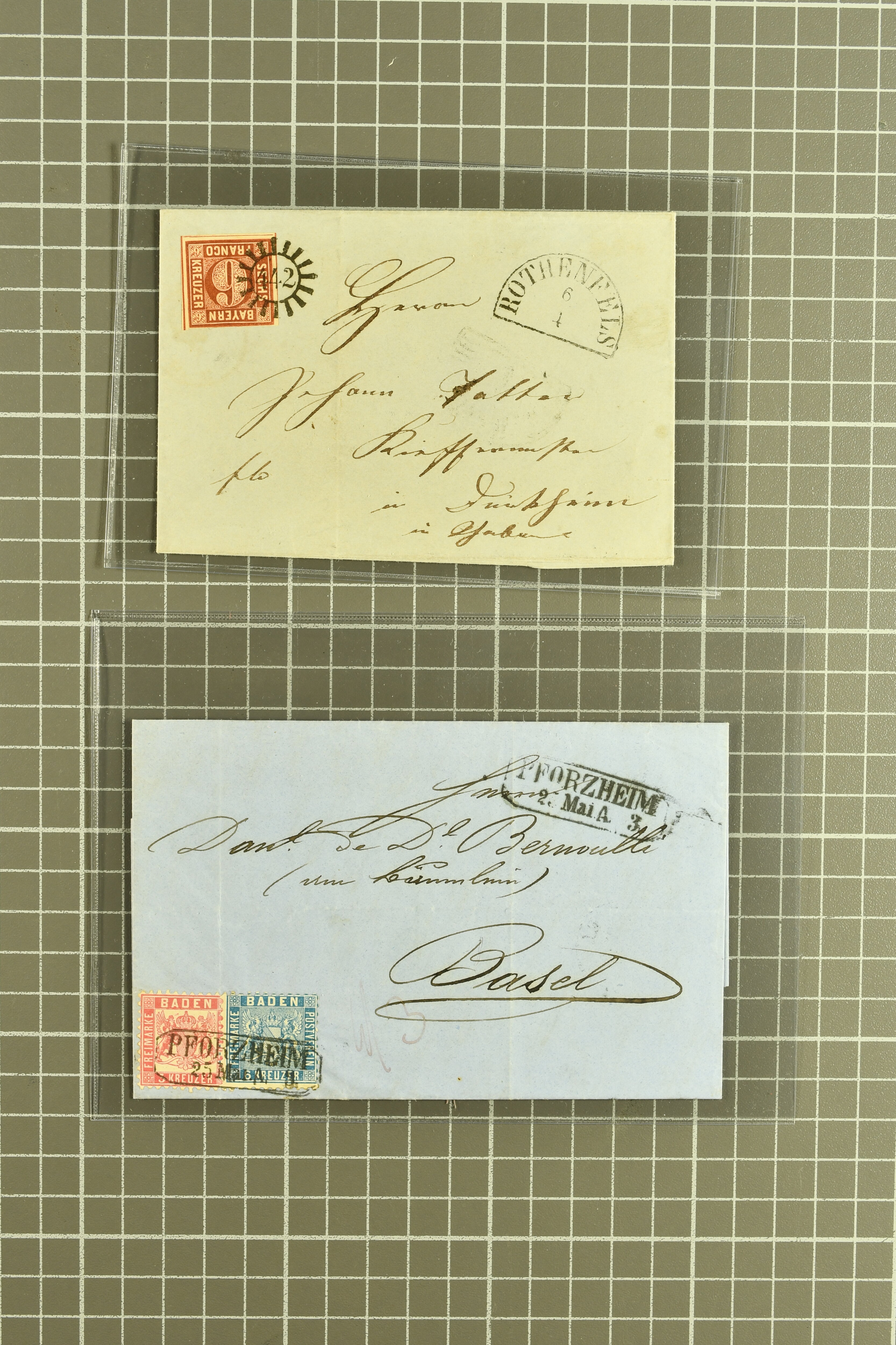 1695 cover image1849: Sauberes Lot Belege aus Altdeutschland. Baden – hübsche Zweifarbenfrankatur 3 Kreuzer + 6 Kreuzer von "PFORZHEM" n. Basel (Mi 14+18); 7 Kr. von "OFFENBURG" n. Basel (Mi 25). Bayern – Brief mit 3 Kr. mit Mühlradstempel "211" n. Zwickau (Mi 2); 6 Kr. mit Nummernstempel "442" ROTHENFELS (Mi 4II); 1 Kr. orangegelb als 3er-Streifen mit offenem Mühlradstempel "711", sign. Brettl BPP (Mi 8I). Drei 1 Gr. je 1× von "LEHE", "HANNOVER" und "WALSRODE" (Mi 2). Norddeutscher Postbezirk – zwei 3-Kreuzer-Frankaturen je aus 1 Kr. + 2 Kr.: 1× durchstochen (Mi 7+8), 1× gezähnt (Mi 19+20). Sauberer Thurn-und-Taxis-Brief 1 Kr. + 6 Kr. von "BATTENBERG" (Mi 20+22). Zuletzt vom Deutschen Reich ein Brief mit 1 Gr. + 2 Gr. von "MALMEDY" n. Bordeaux mit Befund Hansmichael Krug (Mi 4+20) (Image 1) (Image 2) (Image 3) (Image 4) (Image 5)