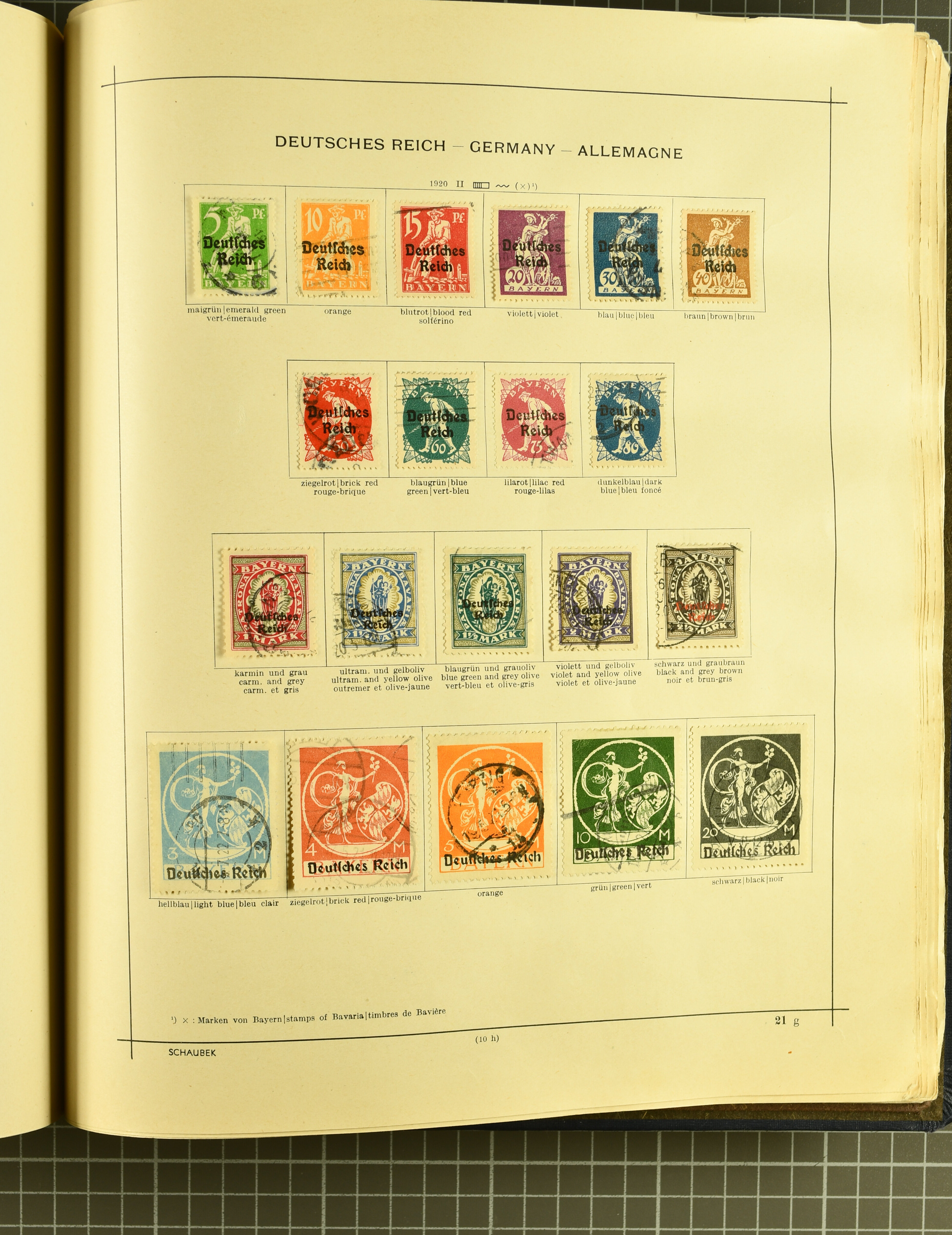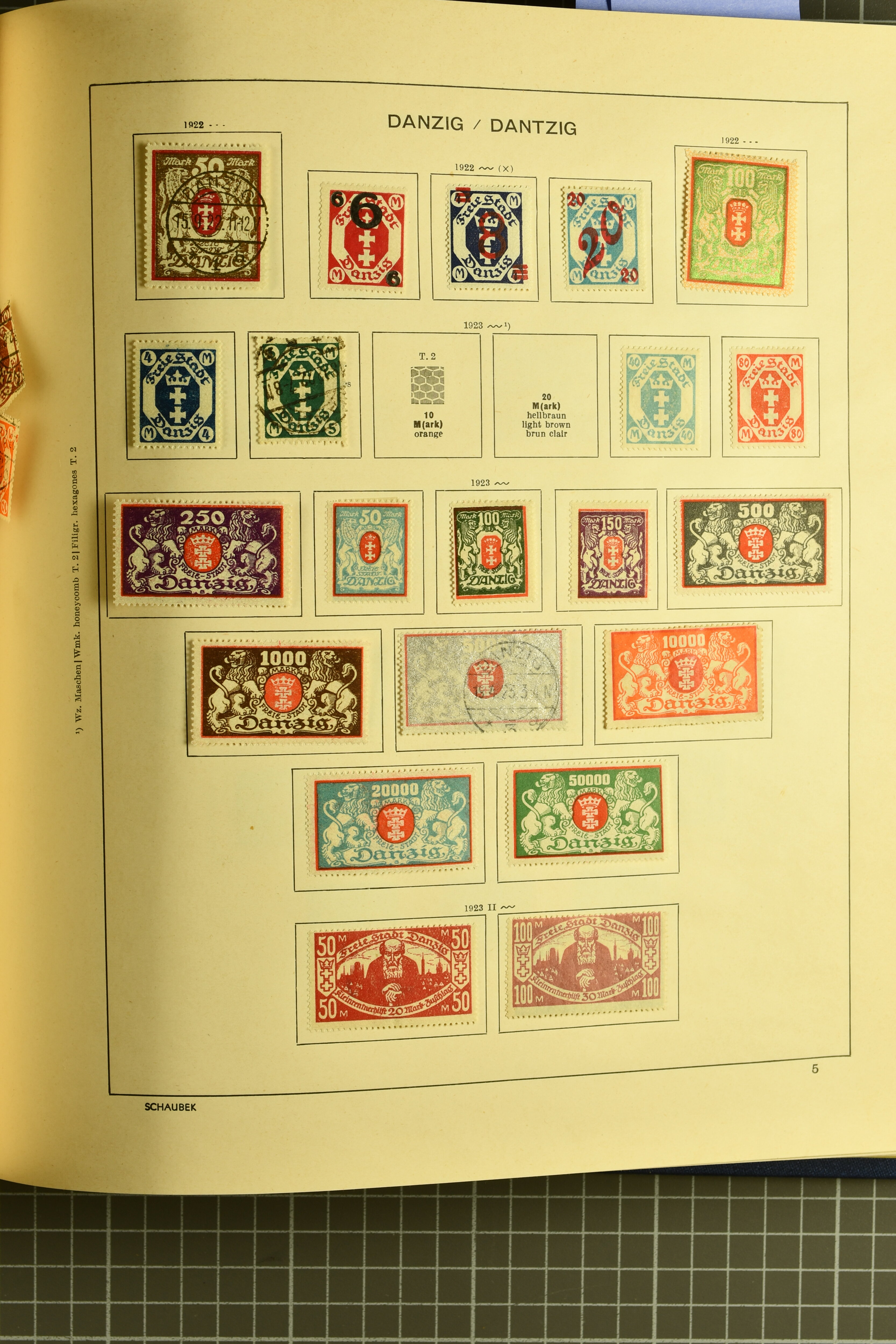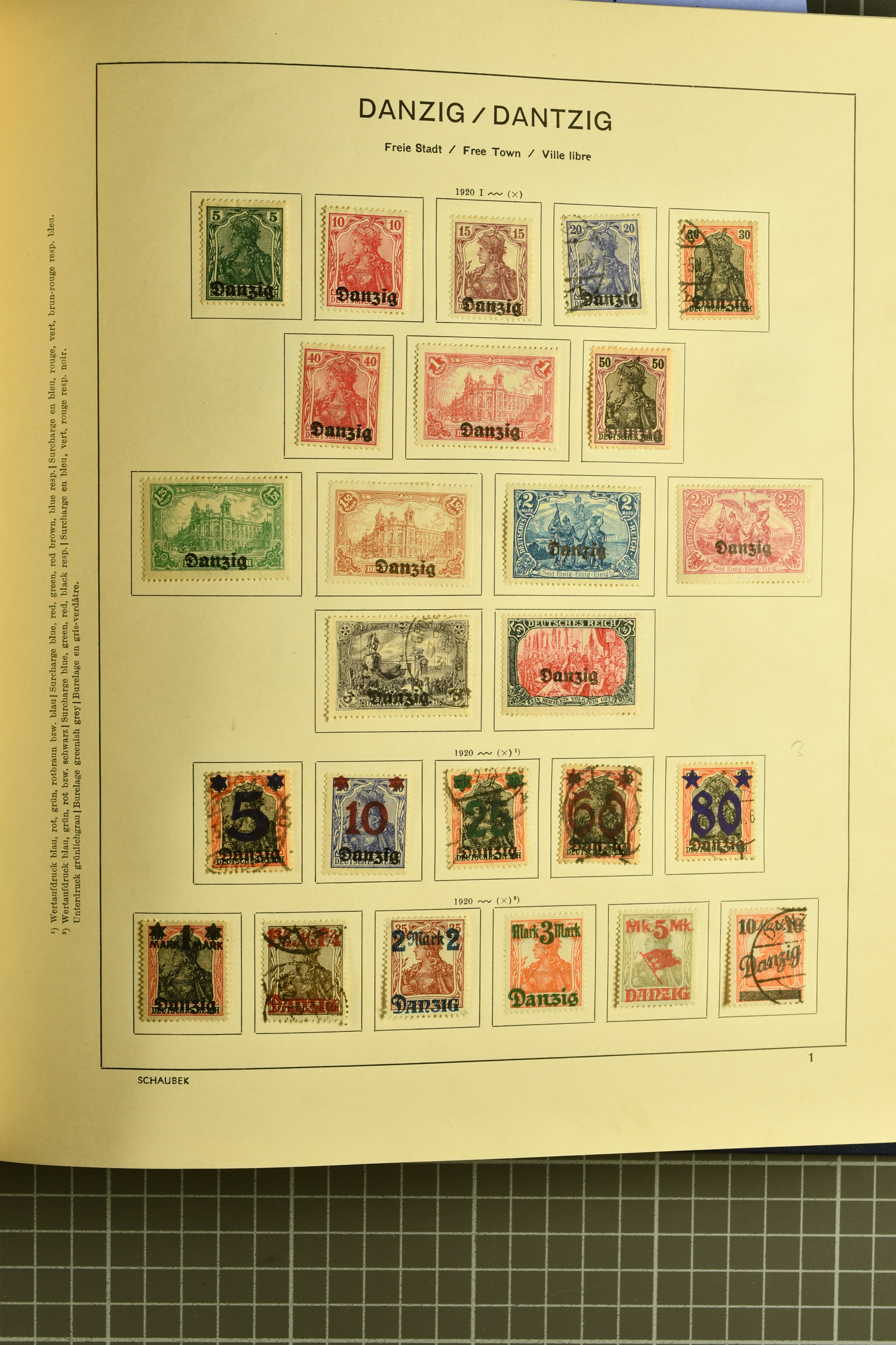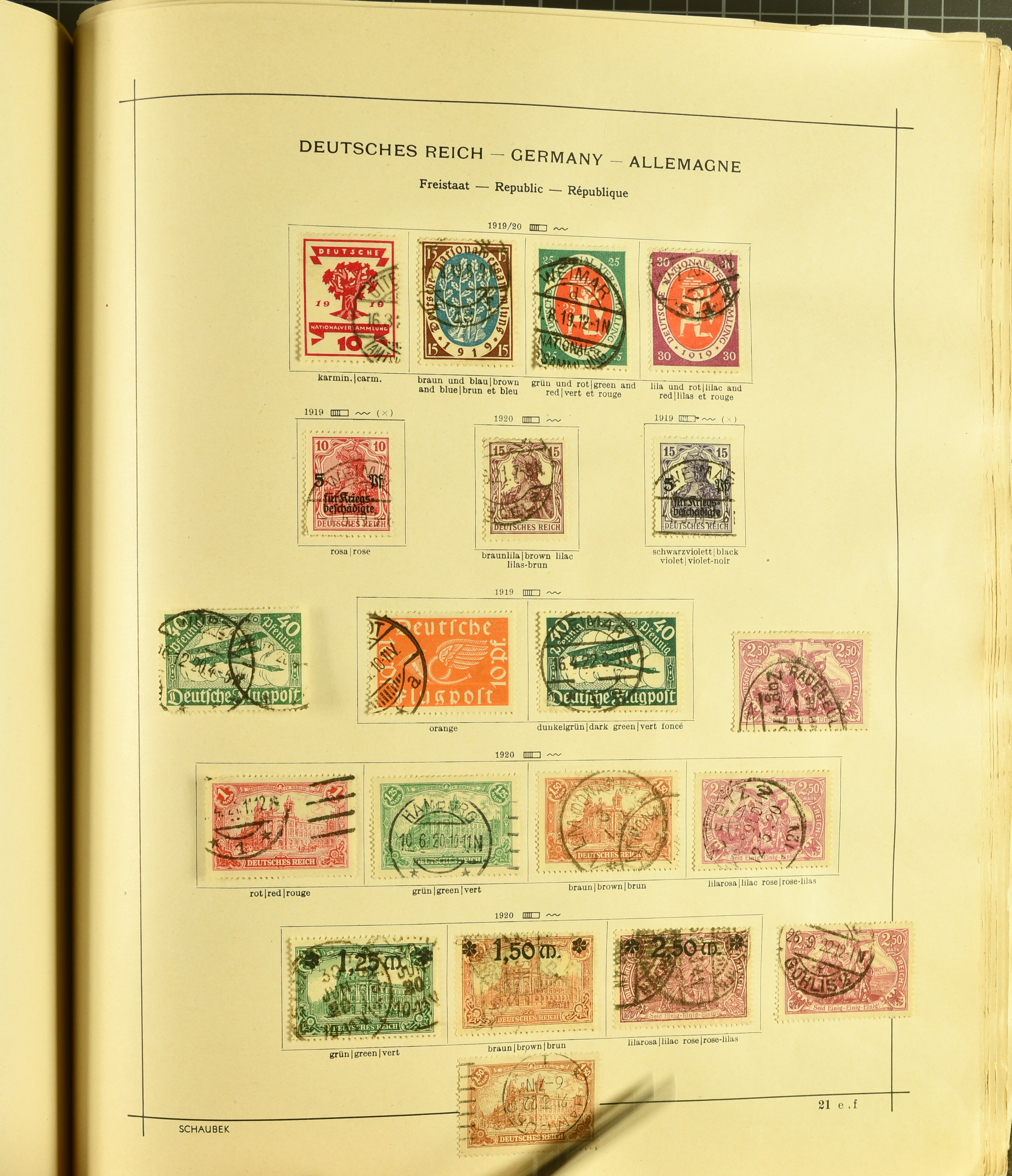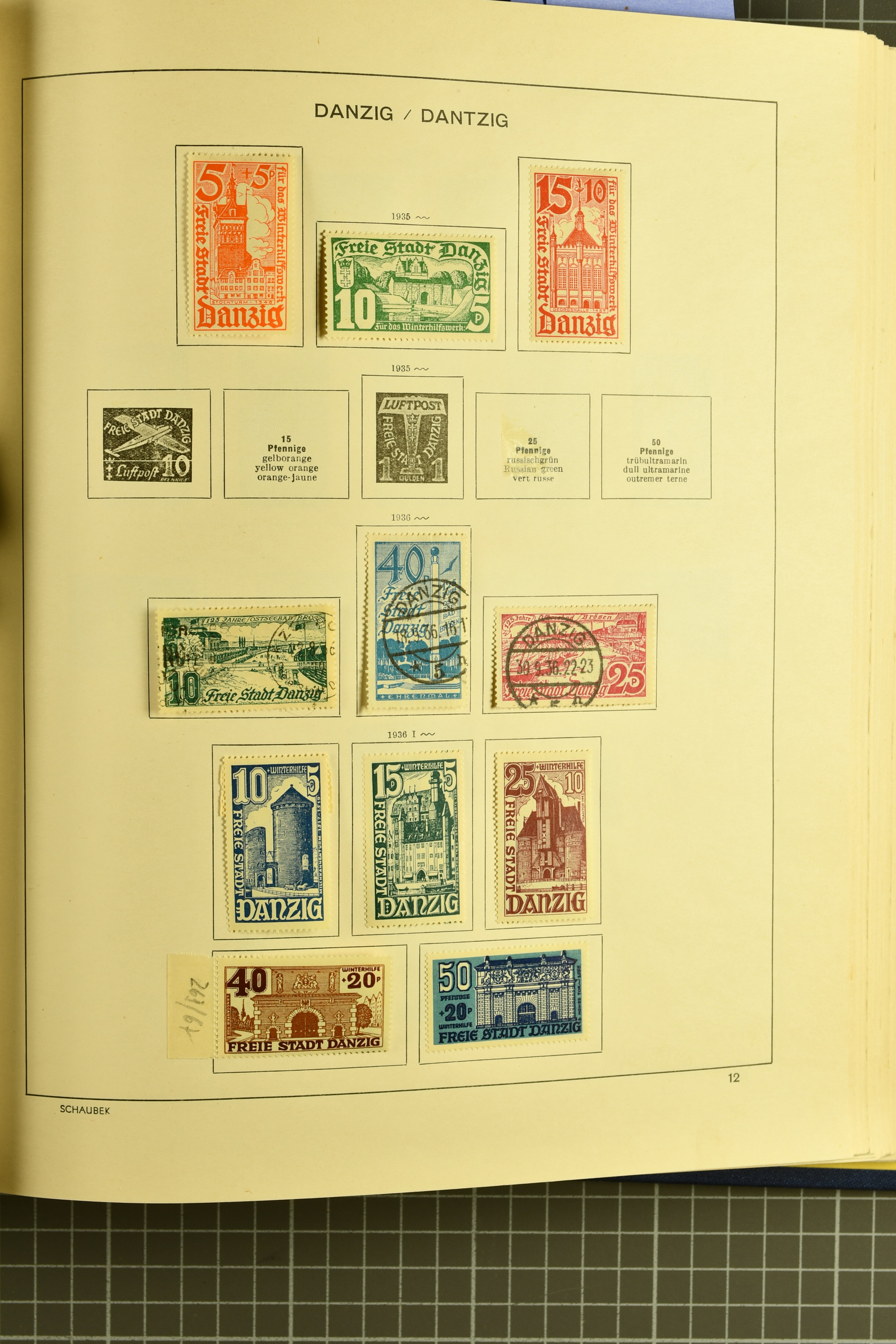 1826 1849/1960ca.: Sammlungskonvolut in insgesamt 9 Vordruckalben, davon 6 Schaubek und 3 mit Vordrucken in Mappen des Noltsch-Verlages, teils mehrfach geführt. Ein Album ab Altdeutschland ist reichhaltig bestückt, wenn auch in sehr unterschiedlicher Qualität. Weitere Bände mit Material in nun zumeist meist besserer Erhaltung vom Deutschen Reich, den Besetzungen und Abstimmungsgebieten, Danzig, Memel sowie den Kolonien. Ein Nachkriegsband mit u. a. mehreren Blättern Bezirkshandstempel (o. Obl.). Jeweils bis zu den mittleren Werte ausgebaut mit vielen Blocks und auch Lokalausgaben. Ungebrauchte Marken zumeist noch in älteren Zellophanhüllen eingepackt; Stichproben ergaben bei Vorkriegsmarken überwiegend Falz, Nachkriegsausgaben, wenn ungebraucht, dann meist postfrisch