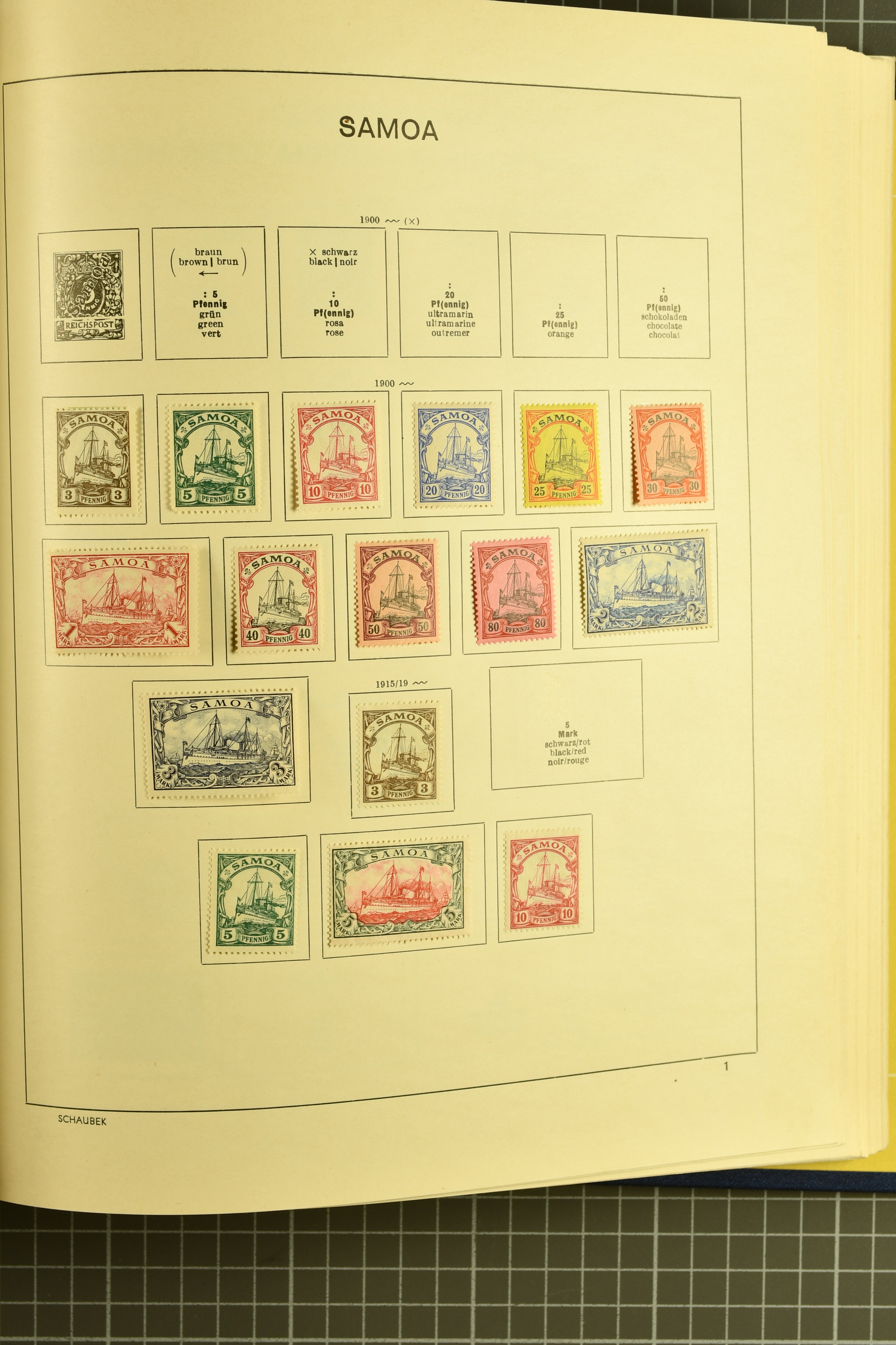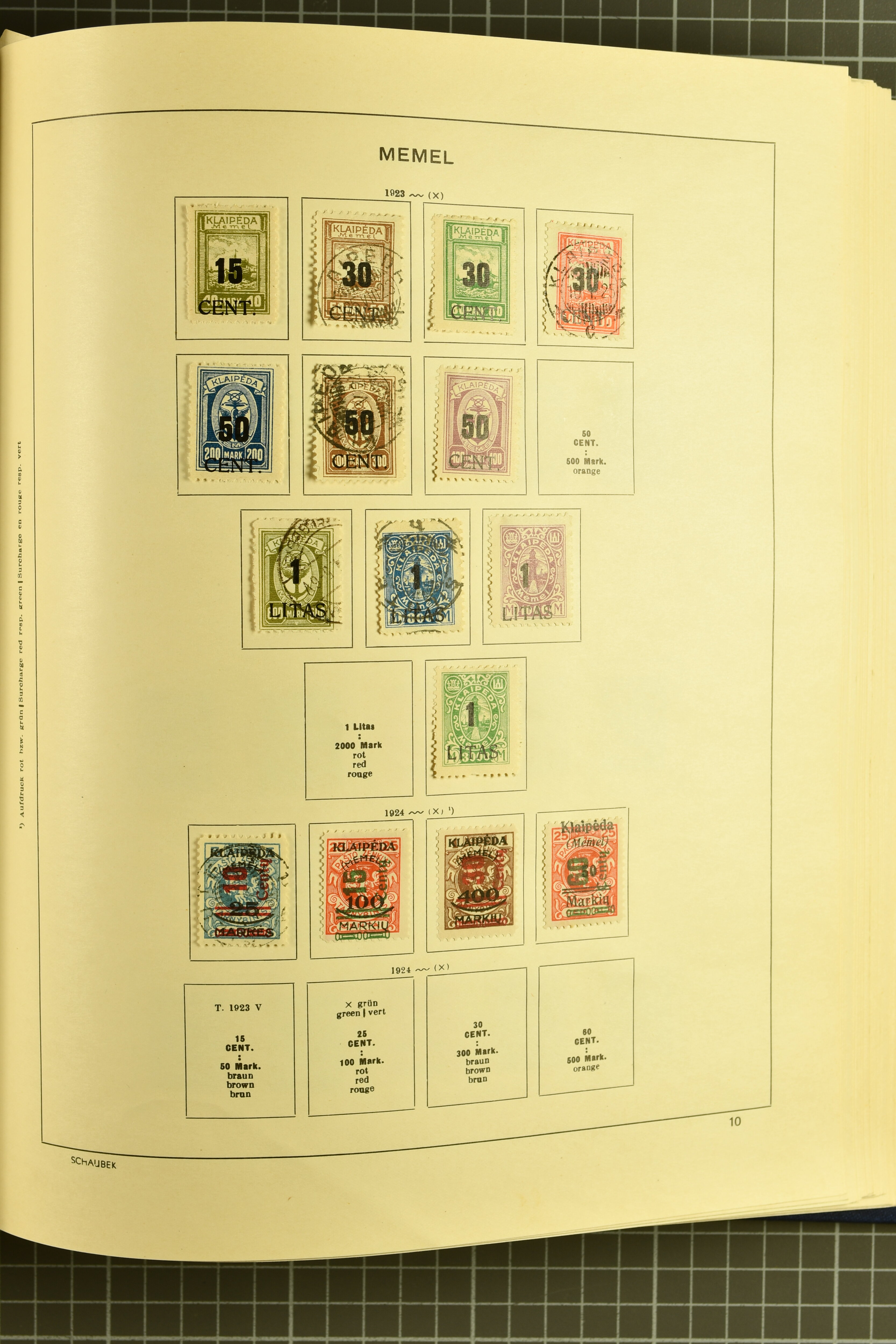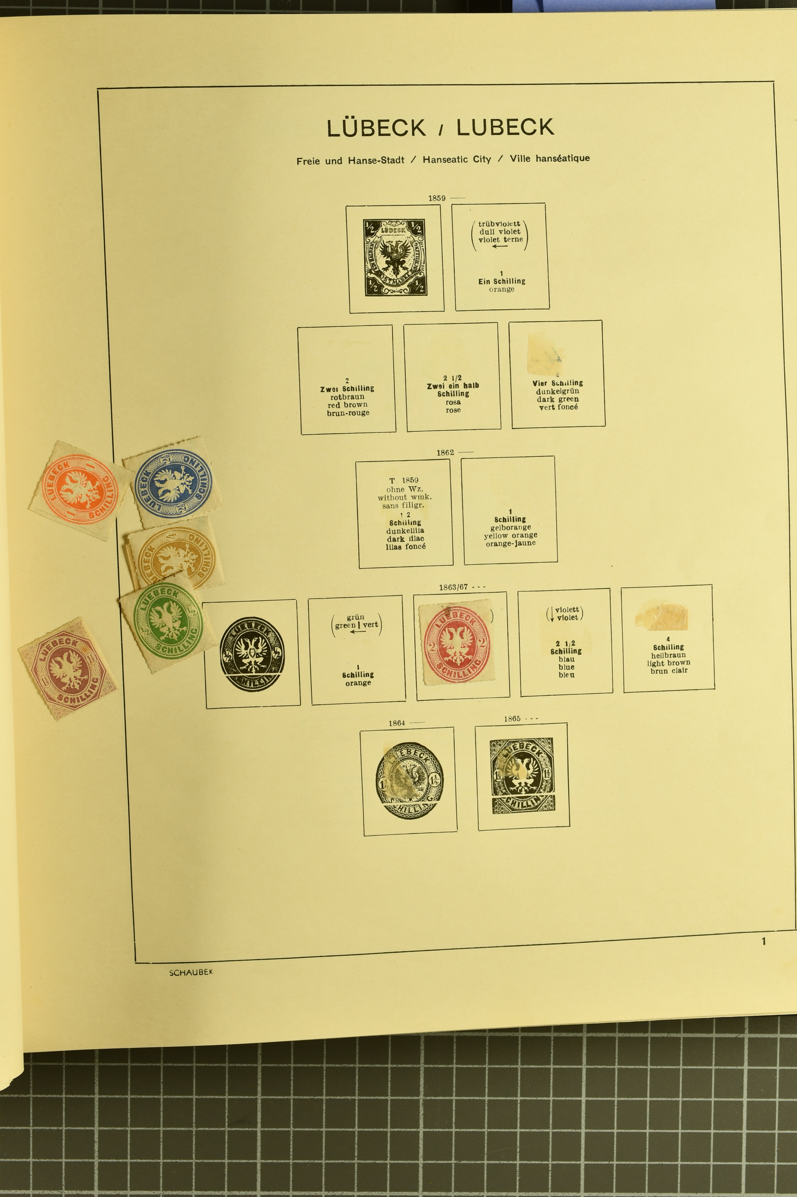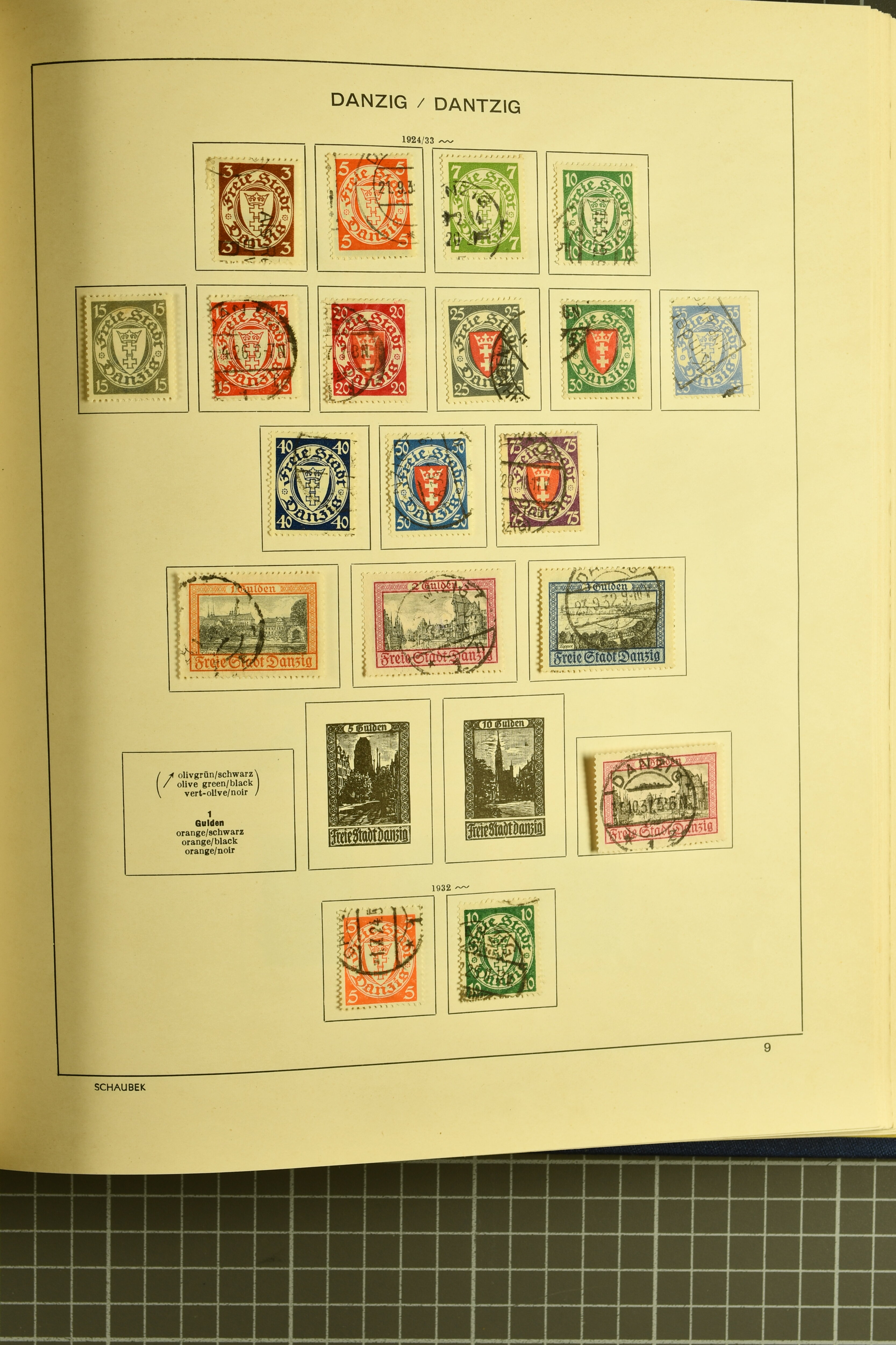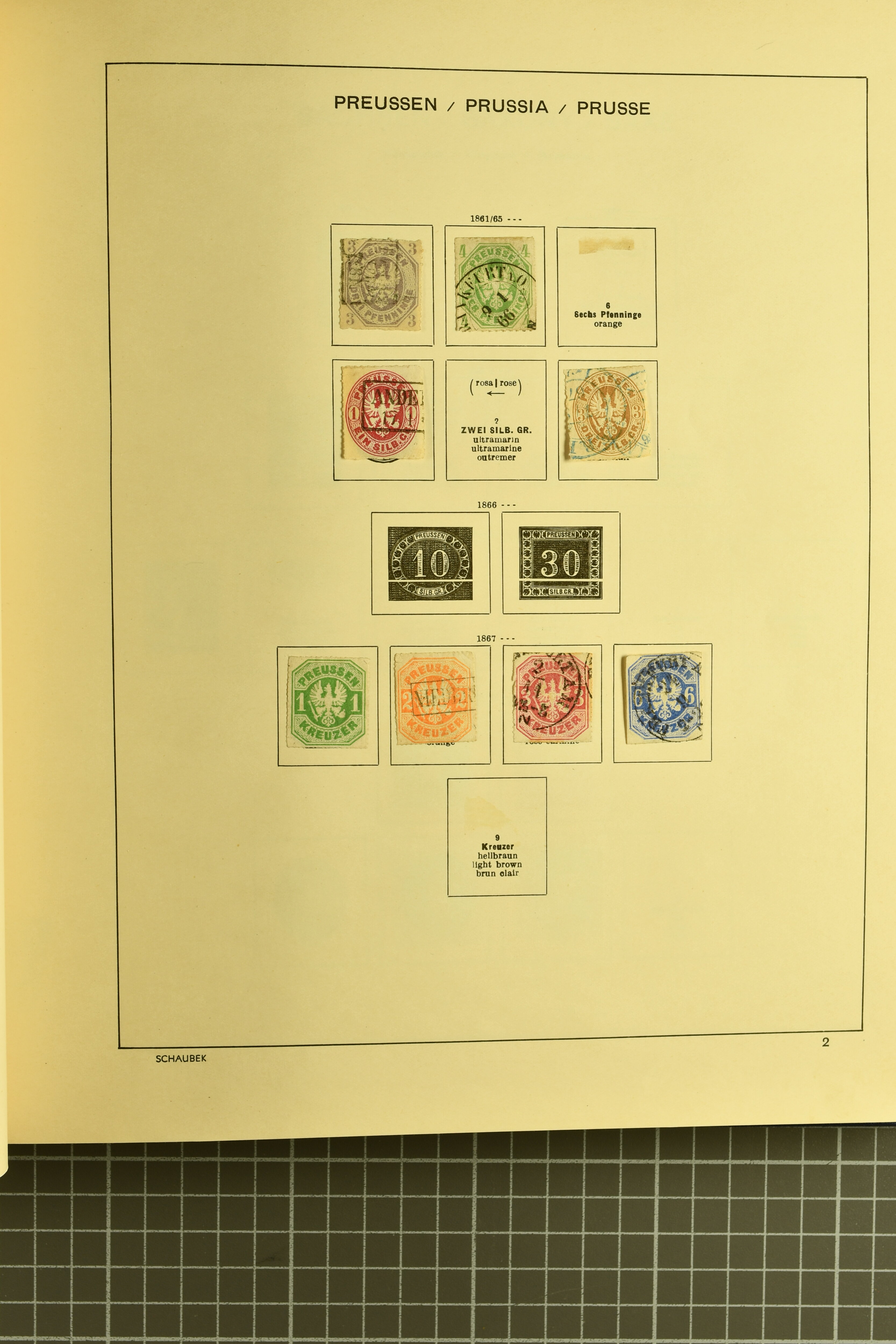 1826 1849/1960ca.: Sammlungskonvolut in insgesamt 9 Vordruckalben, davon 6 Schaubek und 3 mit Vordrucken in Mappen des Noltsch-Verlages, teils mehrfach geführt. Ein Album ab Altdeutschland ist reichhaltig bestückt, wenn auch in sehr unterschiedlicher Qualität. Weitere Bände mit Material in nun zumeist meist besserer Erhaltung vom Deutschen Reich, den Besetzungen und Abstimmungsgebieten, Danzig, Memel sowie den Kolonien. Ein Nachkriegsband mit u. a. mehreren Blättern Bezirkshandstempel (o. Obl.). Jeweils bis zu den mittleren Werte ausgebaut mit vielen Blocks und auch Lokalausgaben. Ungebrauchte Marken zumeist noch in älteren Zellophanhüllen eingepackt; Stichproben ergaben bei Vorkriegsmarken überwiegend Falz, Nachkriegsausgaben, wenn ungebraucht, dann meist postfrisch